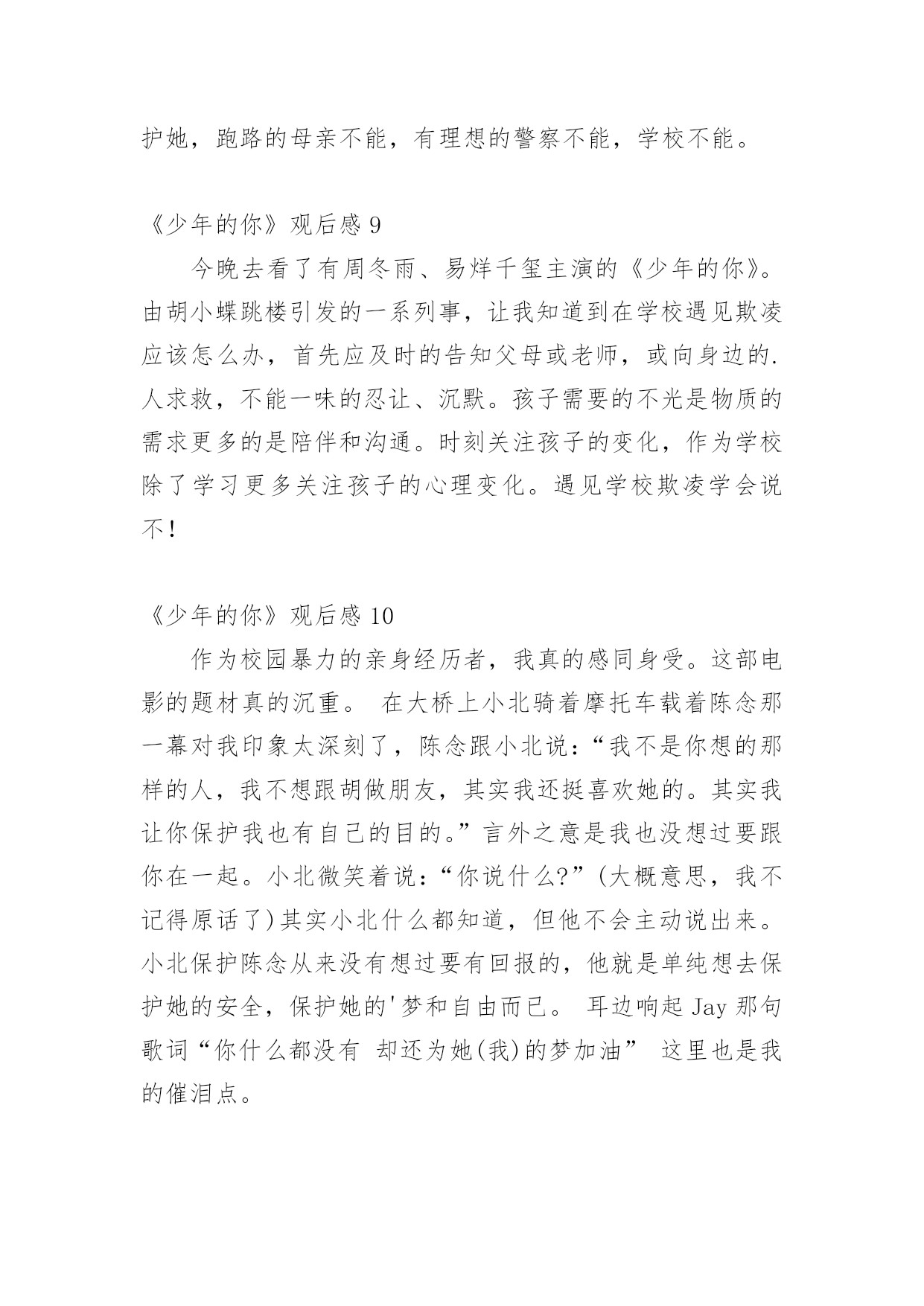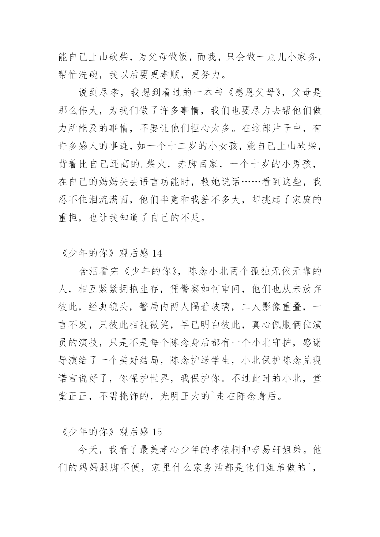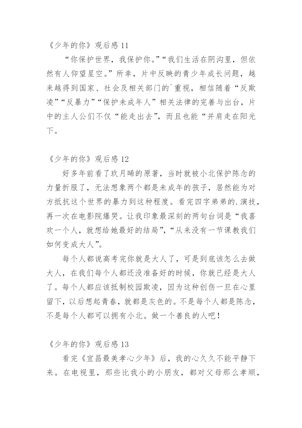 《少年的你》观后感《少年的你》观后感15篇在看完一部作品以后,相信大家一定领会了不少东西,需要好好地对所收获的东西写一篇观后感了。那么你真的懂得怎么写观后感吗?下面是小编精心整理的《少年的你》观后感,供大家参考借鉴,希望可以帮助到有需要的朋友。《少年的你》观后感1“你去保护世界,我来保护你。”因为你就是我的全世界。你站在阳光下,我站在阴处,“你往前走,我一定在你身后”未来随魏莱的`死一同远去,但我与你的未来还在一起,一直都不需要太多言语。格外冷静因为背负太多,无法冷静因为爱的太深,众人欢笑,唯我独沉,喧嚣变得静默,望一切平静,都远离于我。我可不惜生命去爱你,因我年少,但因我年少,我无法把最好的爱给你,望你原谅。“我喜欢一个人,我想给她好结局”愿我们再相见,无言而涕,含泪而笑。《少年的你》观后感2今天,我在学校看了最美孝心少年,让我感触很深。这里面的每个故事都让我很感动!这让我想到了古代人曹操,他不管错杀了多少人,他对他的母亲是那么好,我真应该向他学习学习!在看看我自己,我成天想玩,也不为父母想想,我们都生活在蜜罐里,不向我们一样什么事都是家长们帮忙做,那些最美孝心少年,都是靠自己的.努力支撑着自己的家。这让我想到了一句名言:“百善孝为先”。《少年的你》观后感3“你守护世界,我守护你。”电影《少年的你》中这句台词,让无数观众流下热泪。电影结束,脑海里却还在一幕幕回放着电影里的镜头:陈念绝望的痛苦,北山冷峻的目光,还有魏莱的冷酷,郑易的.无奈......这些孩子都有一个共同的问题:原生家庭缺失的爱。“所有的问题少年一定出自一个问题家庭。”救赎这些少年的路途漫长又悠远,因为它必须来自每一个为人父母者的觉醒!《少年的你》观后感4不出意外,这就是我的年度华语最佳了,无懈可击那种。这绝对是一部命运多舛的电影:电影市场如此动荡的`一年,这片也只是一个稍显可惜的牺牲品罢了。光就自我审查开始,这部电影,就注定是一部残缺品,就算舞姿多么优美,镣铐依旧存在。这就是我战战兢兢地走进电影院的原因,一想到我没法看到创作者所要表达的全部内容,这就会让我极其纠结。但《少年的你》非常特殊,我看得见它的妥协,它的殷勤,它的讨好,它的支离破碎。但在这些不完整背后,我却依旧看见了主创团队想要表达的东西,他们的坚持,以及那种埋藏于影像之间,永不消散的生命力。《少年的你》观后感5修改的部分应该不多,估计就是删除了跳楼尸体和一些霸凌的正面镜头?本来以为会是比较虚化背景的文艺青春片,没想到高考元素竟然占了相当大的比重,简直有点《毛坦厂中学高考杀人事件》的`意思了,GoodChoice!易烊千玺戏份不算特别多,但也没太掉链子,当然其实还是周冬雨主场,这么看来一个周冬雨吊打八个马思纯也没问题啊……我不得不由衷地感叹,国内第一代养成系偶像终于愿意长大了,能演吻戏了,能抽烟了,最重要的是能开黄腔了!我们老姐姐等这一天等了多久啊……《少年的你》观后感6上周看了《少年的你》,是两个少年的故事。一个是品学兼优的高三学生,一个是早早辍学、混迹街头的小混混;一个求学还债,一个被母亲抛弃;一个受同学欺凌,一个时常遍体鳞伤。他们原本自顾自地走在各自的`路上,但命运却悄然将他们交织在了一起。他们都在等待,期待走出去,期待在阳光下光明正大地一起走下去。《少年的你》观后感7演员表现超出预期,导演野心勃勃,又想拍校园暴力揭露片,又想拍刑侦悬疑片,又想拍高考纪实片,要素过多,详略混乱,主题从校园暴力到言情恋爱到悬疑匆匆流过,故事是讲清楚了,但完全抓不住重点。片长过长,冗长赘余镜头太多,剪掉至少二十分钟没问题。学会了一个新词叫融梗,从电影能看出白夜行的影子,台词有不合时宜的指向,但抄袭觉得谈不上。然而看了网友总结的小说情节,我觉得已经可以说是照搬X了,有点疑惑为何照搬作品能风生水起。《少年的`你》观后感8如果这个世界真是这样的话,你放心把你的孩子生出来吗?面对女警官质疑,这是陈念的回复也是反击。被校园霸凌的陈念在求助的时,家长缺席、警察迟到、学校息事宁人,只有一个自身难保的少年挺身而出。反而是在霸凌者死亡后,她成了第一个被怀疑的对象,所有人都来质问她你受到欺负时为什么不报警?为什么不找大人但凡你能多信任大人一些,也不至于出现今天的状况。多么讽刺?!陈念在被魏来一众人等追杀到无处可逃时,求助电话是无人接听的',当她躲垃圾箱里不敢出声时,电话应时想起,若不是那位帮凶的恻隐之心。恐怕陈念早就万劫不复了吧!最危险的时候没人能保护她,跑路的母亲不能,有理想的警察不能,学校不能。《少年的你》观后感9今晚去看了有周冬雨、易烊千玺主演的《少年的你》。由胡小蝶跳楼引发的一系列事,让我知道到在学校遇见欺凌应该怎么办,首先应及时的告知父母或老师,或向身边的.人求救,不能一味的忍让、沉默。孩子需要的不光是物质的需求更多的是陪伴