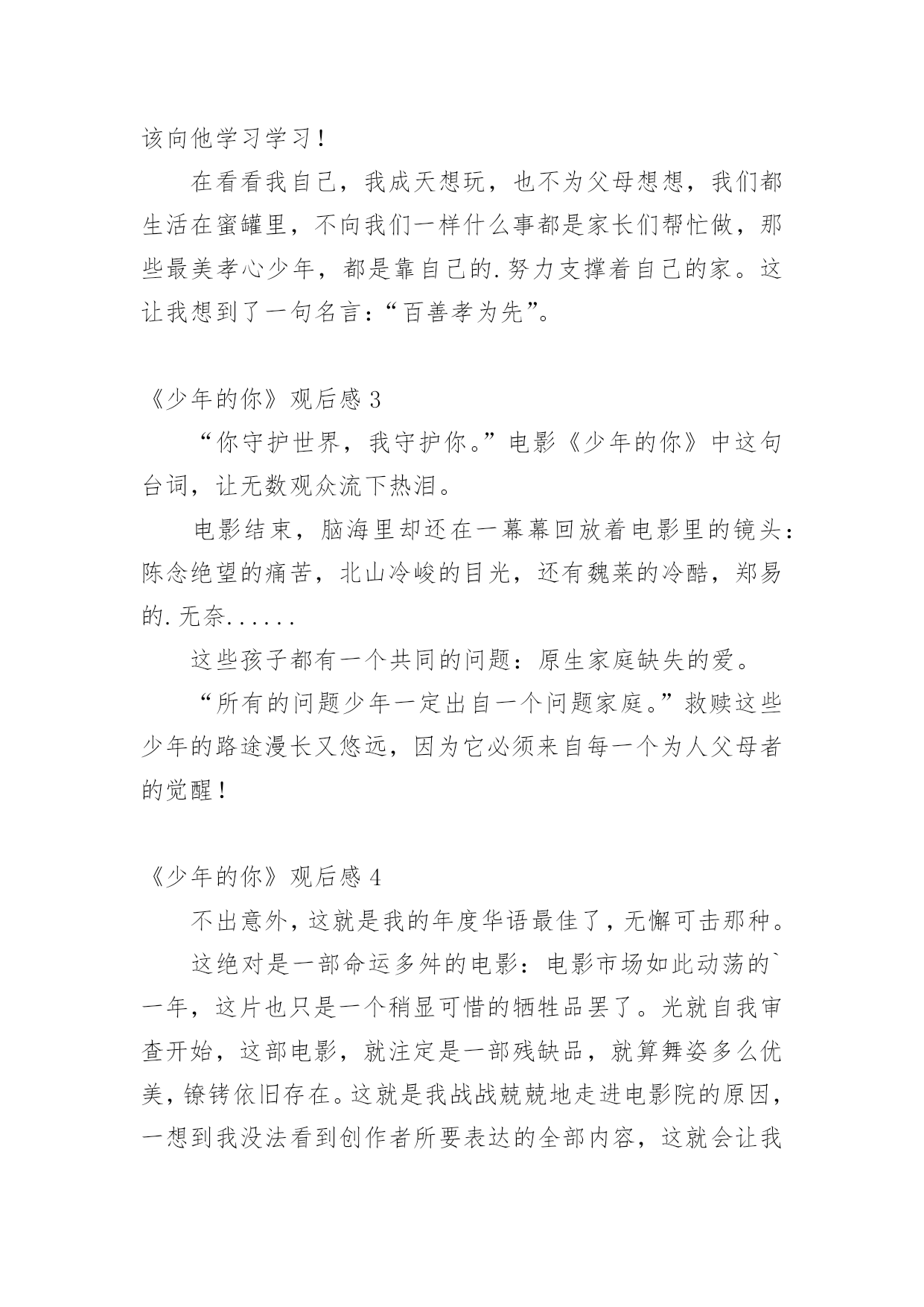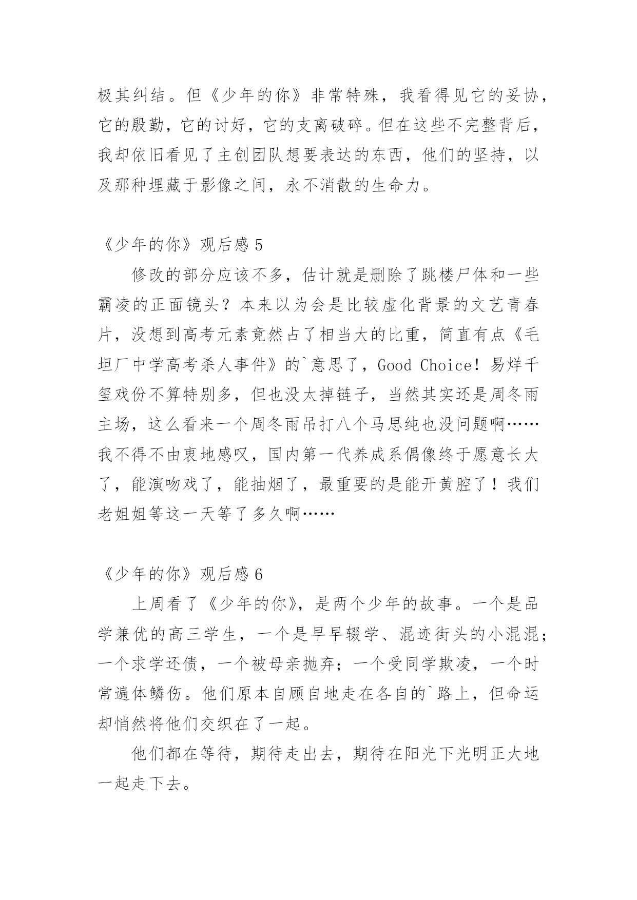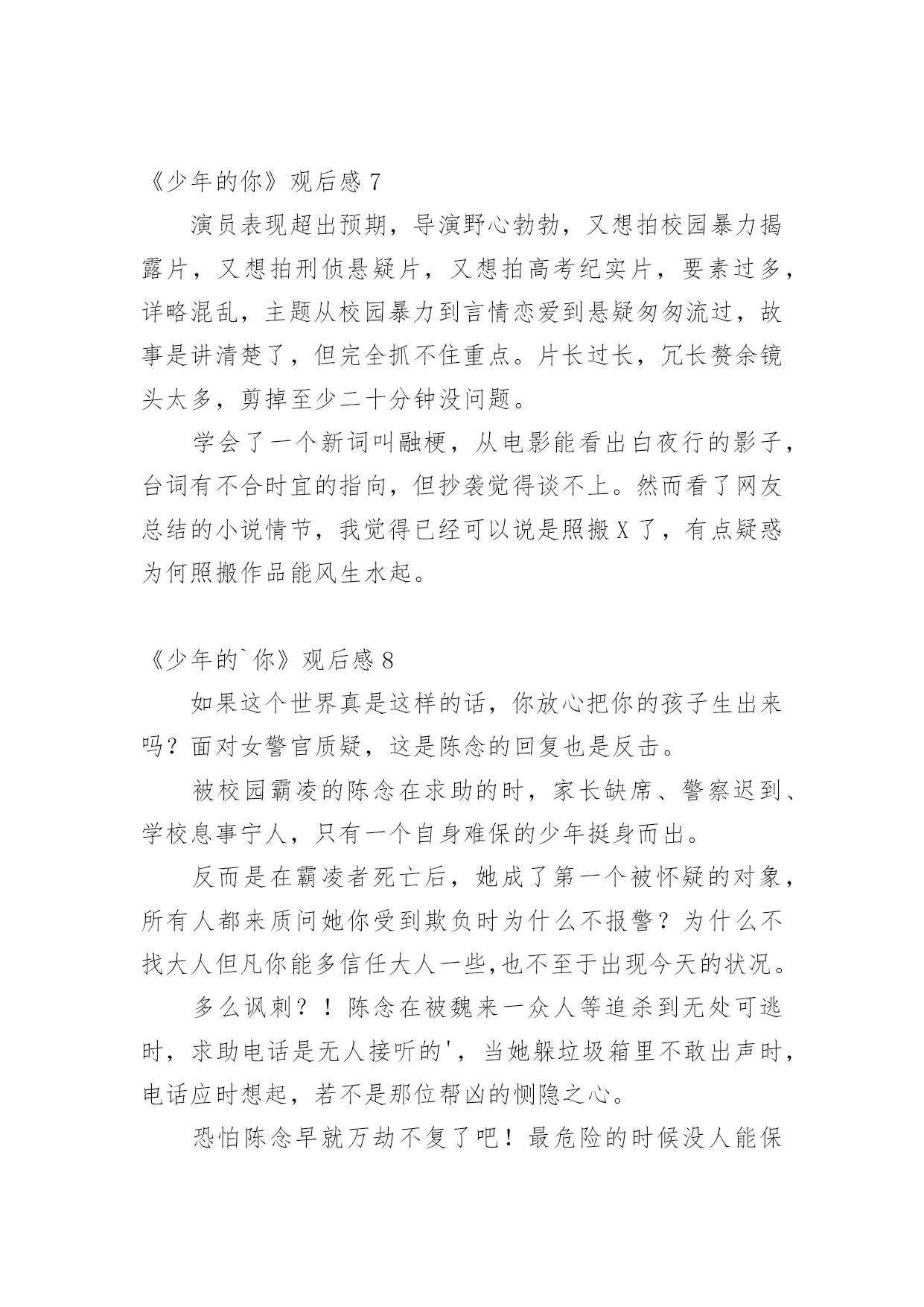 《少年的你》观后感《少年的你》观后感15篇在看完一部作品以后,相信大家一定领会了不少东西,需要好好地对所收获的东西写一篇观后感了。那么你真的懂得怎么写观后感吗?下面是小编精心整理的《少年的你》观后感,供大家参考借鉴,希望可以帮助到有需要的朋友。《少年的你》观后感1“你去保护世界,我来保护你。”因为你就是我的全世界。你站在阳光下,我站在阴处,“你往前走,我一定在你身后”未来随魏莱的`死一同远去,但我与你的未来还在一起,一直都不需要太多言语。格外冷静因为背负太多,无法冷静因为爱的太深,众人欢笑,唯我独沉,喧嚣变得静默,望一切平静,都远离于我。我可不惜生命去爱你,因我年少,但因我年少,我无法把最好的爱给你,望你原谅。“我喜欢一个人,我想给她好结局”愿我们再相见,无言而涕,含泪而笑。《少年的你》观后感2今天,我在学校看了最美孝心少年,让我感触很深。这里面的每个故事都让我很感动!这让我想到了古代人曹操,他不管错杀了多少人,他对他的母亲是那么好,我真应该向他学习学习!在看看我自己,我成天想玩,也不为父母想想,我们都生活在蜜罐里,不向我们一样什么事都是家长们帮忙做,那些最美孝心少年,都是靠自己的.努力支撑着自己的家。这让我想到了一句名言:“百善孝为先”。《少年的你》观后感3“你守护世界,我守护你。”电影《少年的你》中这句台词,让无数观众流下热泪。电影结束,脑海里却还在一幕幕回放着电影里的镜头:陈念绝望的痛苦,北山冷峻的目光,还有魏莱的冷酷,郑易的.无奈......这些孩子都有一个共同的问题:原生家庭缺失的爱。“所有的问题少年一定出自一个问题家庭。”救赎这些少年的路途漫长又悠远,因为它必须来自每一个为人父母者的觉醒!《少年的你》观后感4不出意外,这就是我的年度华语最佳了,无懈可击那种。这绝对是一部命运多舛的电影:电影市场如此动荡的`一年,这片也只是一个稍显可惜的牺牲品罢了。光就自我审查开始,这部电影,就注定是一部残缺品,就算舞姿多么优美,镣铐依旧存在。这就是我战战兢兢地走进电影院的原因,一想到我没法看到创作者所要表达的全部内容,这就会让我极其纠结。但《少年的你》非常特殊,我看得见它的妥协,它的殷勤,它的讨好,它的支离破碎。但在这些不完整背后,我却依旧看见了主创团队想要表达的东西,他们的坚持,以及那种埋藏于影像之间,永不消散的生命力。《少年的你》观后感5修改的部分应该不多,估计就是删除了跳楼尸体和一些霸凌的正面镜头?本来以为会是比较虚化背景的文艺青春片,没想到高考元素竟然占了相当大的比重,简直有点《毛坦厂中学高考杀人事件》的`意思了,GoodChoice!易烊千玺戏份不算特别多,但也没太掉链子,当然其实还是周冬雨主场,这么看来一个周冬雨吊打八个马思纯也没问题啊……我不得不由衷地感叹,国内第一代养成系偶像终于愿意长大了,能演吻戏了,能抽烟了,最重要的是能开黄腔了!我们老姐姐等这一天等了多久啊……《少年的你》观后感6上周看了《少年的你》,是两个少年的故事。一个是品学兼优的高三学生,一个是早早辍学、混迹街头的小混混;一个求学还债,一个被母亲抛弃;一个受同学欺凌,一个时常遍体鳞伤。他们原本自顾自地走在各自的`路上,但命运却悄然将他们交织在了一起。他们都在等待,期待走出去,期待在阳光下光明正大地一起走下去。《少年的你》观后感7演员表现超出预期,导演野心勃勃,又想拍校园暴力揭露片,又想拍刑侦悬疑片,又想拍高考纪实片,要素过多,详略混乱,主题从校园暴力到言情恋爱到悬疑匆匆流过,故事是讲清楚了,但完全抓不住重点。片长过长,冗长赘余镜头太多,剪掉至少二十分钟没问题。学会了一个新词叫融梗,从电影能看出白夜行的影子,台词有不合时宜的指向,但抄袭觉得谈不上。然而看了网友总结的小说情节,我觉得已经可以说是照搬X了,有点疑惑为何照搬作品能风生水起。《少年的`你》观后感8如果这个世界真是这样的话,你放心把你的孩子生出来吗?面对女警官质疑,这是陈念的回复也是反击。被校园霸凌的陈念在求助的时,家长缺席、警察迟到、学校息事宁人,只有一个自身难保的少年挺身而出。反而是在霸凌者死亡后,她成了第一个被怀疑的对象,所有人都来质问她你受到欺负时为什么不报警?为什么不找大人但凡你能多信任大人一些,也不至于出现今天的状况。多么讽刺?!陈念在被魏来一众人等追杀到无处可逃时,求助电话是无人接听的',当她躲垃圾箱里不敢出声时,电话应时想起,若不是那位帮凶的恻隐之心。恐怕陈念早就万劫不复了吧!最危险的时候没人能保护她,跑路的母亲不能,有理想的警察不能,学校不能。《少年的你》观后感9今晚去看了有周冬雨、易烊千玺主演的《少年的你》。由胡小蝶跳楼引发的一系列事,让我知道到在学校遇见欺凌应该怎么办,首先应及时的告知父母或老师,或向身边的.人求救,不能一味的忍让、沉默。孩子需要的不光是物质的需求更多的是陪伴