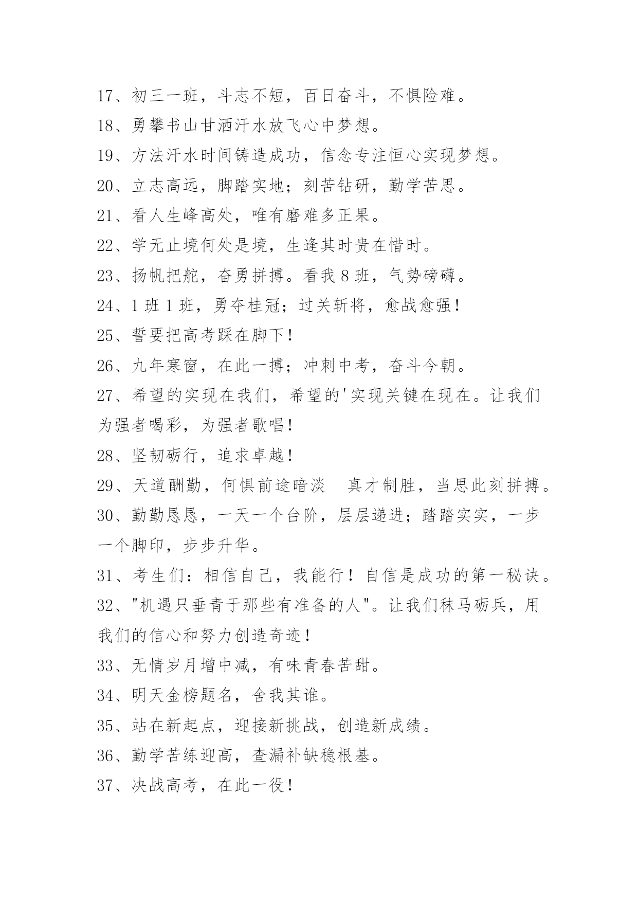 激励士气的考试口号2021年激励士气的考试口号锦集40条祝你成功,成功之路始于脚下。下面是关于激励士气的考试口号40条,欢迎阅读,希望能够对大家有所帮助。1、努力是帆,理想是船,冲向彼岸,定能夺冠。2、热血青春,壮志凌云,奋起拼搏,无愧自我。3、我决不为失败找借口,我只为成功找方法。4、调适心态,把握高考,放飞青春梦想!5、高考,高考,强者必胜。6、有自信,命就好!7、困难和挫折是人生的考场。8、努力考上大学,当上校长。9、初三八班,斗志不短,百日奋斗,不惧险难。10、汗水的挥洒,换来硕果的芬芳,拼搏,只为明天。11、破釜沉舟,万千学子争咫尺,卧虎尝胆,龙门阵里苦熬头。12、立振兴中华之志,树报效祖国之心。13、春播秋收十二载,一朝收获终有成。14、明朝独占熬头,舍我其谁?15、今日寒窗苦读必定有我,明朝独占鳌头舍我其谁?16、十年磨剑争分夺秒攀人生绝顶,百日竞渡尽心竭力展同升雄风。17、初三一班,斗志不短,百日奋斗,不惧险难。18、勇攀书山甘洒汗水放飞心中梦想。19、方法汗水时间铸造成功,信念专注恒心实现梦想。20、立志高远,脚踏实地;刻苦钻研,勤学苦思。21、看人生峰高处,唯有磨难多正果。22、学无止境何处是境,生逢其时贵在惜时。23、扬帆把舵,奋勇拼搏。看我8班,气势磅礴。24、1班1班,勇夺桂冠;过关斩将,愈战愈强!25、誓要把高考踩在脚下!26、九年寒窗,在此一搏;冲刺中考,奋斗今朝。27、希望的实现在我们,希望的'实现关键在现在。让我们为强者喝彩,为强者歌唱!28、坚韧砺行,追求卓越!29、天道酬勤,何惧前途暗淡真才制胜,当思此刻拼搏。30、勤勤恳恳,一天一个台阶,层层递进;踏踏实实,一步一个脚印,步步升华。31、考生们:相信自己,我能行!自信是成功的第一秘诀。32、"机遇只垂青于那些有准备的人"。让我们秣马砺兵,用我们的信心和努力创造奇迹!33、无情岁月增中减,有味青春苦甜。34、明天金榜题名,舍我其谁。35、站在新起点,迎接新挑战,创造新成绩。36、勤学苦练迎高,查漏补缺稳根基。37、决战高考,在此一役!38、为了年少的梦想,为了高考的成功,此时不奋斗,更待何时!39、再露矛头,宜将剩勇追穷寇;一展鸿图,不可沽名学霸王。40、激流勇进,乘风踏浪我欲搏击沧海横流;傲视群雄,飞鞭催马吾将痛饮黄龙。