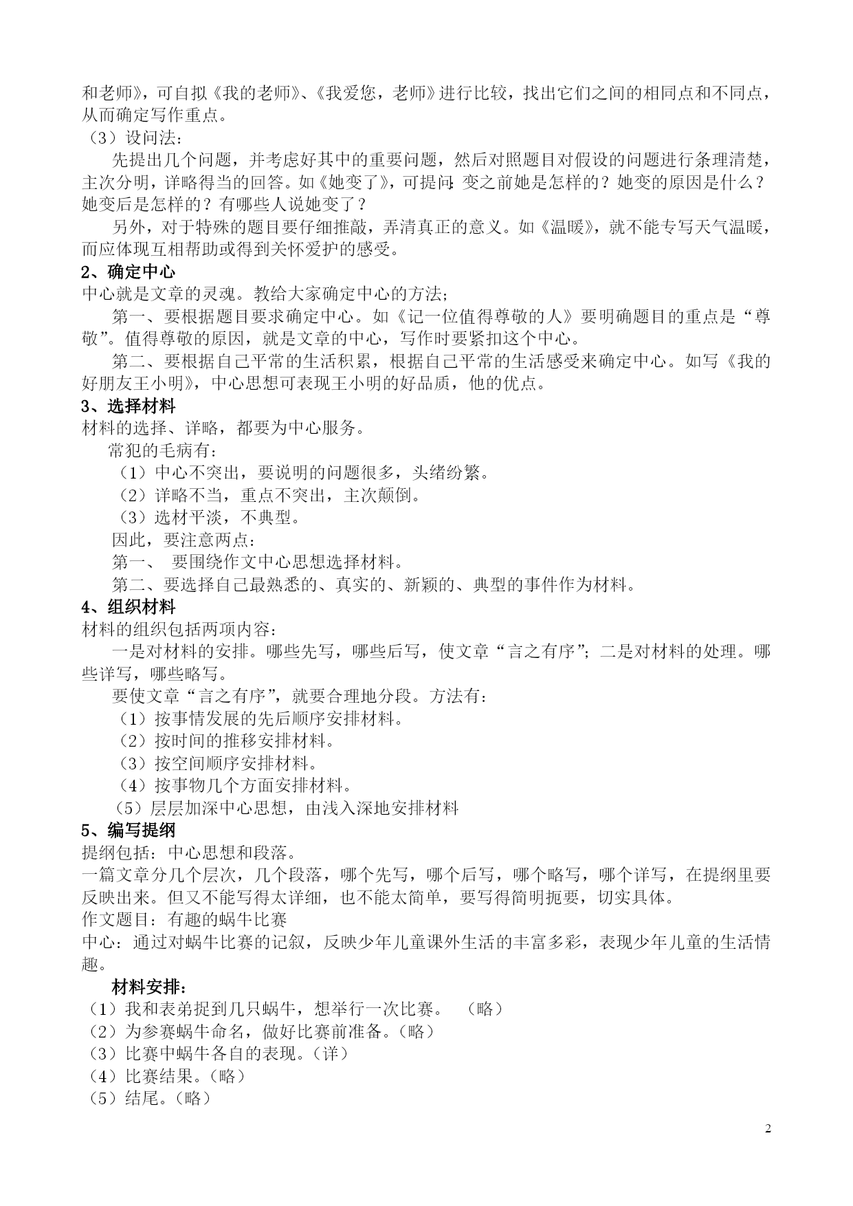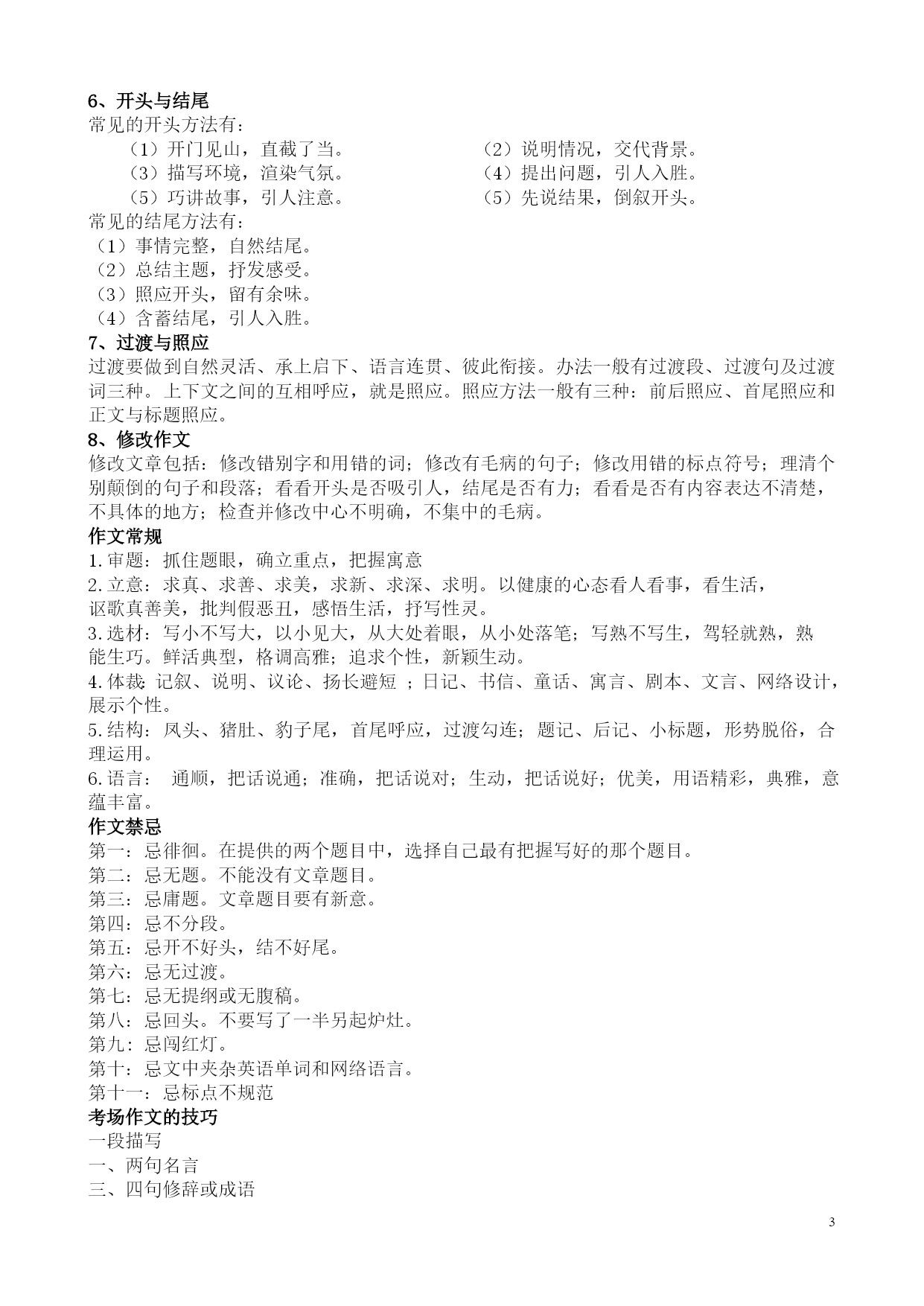 PAGEPAGE4小学语文毕业作文总复习亮点一:亮出题目题目是文章的眉毛亮点二:亮出开头开头是文章的脸面亮点三:亮出语言语言是文章的材料亮点四:亮出层次层次是作者的思路亮点五:亮出材料材料是文章的血肉亮点六:亮出结尾结尾是文章的帷幕亮点七:亮出标点标点是文章的呼吸亮点八:亮出书写书写是文章的服饰1、审题要仔细2、开头要夺目3、行文要扣题4、模仿范文和使用“多用文”5、提醒学生作文容易丢冤枉分的情况文不对题选材太俗分段太多或太少字数过多或过少书写潦草涂改命题作文半命题作文自拟文题看图作文给材料作文需要填写题首需要填写题尾需要填写题首和题尾需要填写题目中间部分一、基础知识作文是字、词、句、段篇的综合训练,它体现出每位同学的认识水平和文字表达能力。那么,怎样才能写好作文呢?一般说来应做到:一、思想健康,中心明确。二、内容具体,条理清楚。三、语句通顺,意思连贯。四、详略得当,主次分明。五、善于观察,想象丰富。六、书写工整,格式正确。除了平时留心观察事物,认识和抓住事物特点,自觉积极地积累写作素材外,还必须具备审题、确定中心、选择材料、谋篇布局、编写作文提纲和修改文章等方面的基础知识。1、审题只有准确地审清题意,透彻理解题目的意思,解决好“写什么”的问题,写起来才能保证不偏题,不致于“下笔千言,离题万里”。这里教给同学们三种审题方法:(1)分析法:先把题目按词拆开,然后一个词一个词琢磨,理解每个词的意思,弄清它们之间的关系。如《校园新事多》可分解为“校园”、“新”、“事”、“多”四个词,我们就能写发生在校园里的新鲜的事,至少要写出两件或两件以上的事。(2)比较法:根据所给题目,自已拟几个相似的题目进行比较,弄清它们的写作范围和要求。如写《我和老师》,可自拟《我的老师》、《我爱您,老师》进行比较,找出它们之间的相同点和不同点,从而确定写作重点。(3)设问法:先提出几个问题,并考虑好其中的重要问题,然后对照题目对假设的问题进行条理清楚,主次分明,详略得当的回答。如《她变了》,可提问:变之前她是怎样的?她变的原因是什么?她变后是怎样的?有哪些人说她变了?另外,对于特殊的题目要仔细推敲,弄清真正的意义。如《温暖》,就不能专写天气温暖,而应体现互相帮助或得到关怀爱护的感受。2、确定中心中心就是文章的灵魂。教给大家确定中心的方法;第一、要根据题目要求确定中心。如《记一位值得尊敬的人》要明确题目的重点是“尊敬”。值得尊敬的原因,就是文章的中心,写作时要紧扣这个中心。第二、要根据自己平常的生活积累,根据自己平常的生活感受来确定中心。如写《我的好朋友王小明》,中心思想可表现王小明的好品质,他的优点。3、选择材料材料的选择、详略,都要为中心服务。常犯的毛病有:(1)中心不突出,要说明的问题很多,头绪纷繁。(2)详略不当,重点不突出,主次颠倒。(3)选材平淡,不典型。因此,要注意两点:第一、要围绕作文中心思想选择材料。第二、要选择自己最熟悉的、真实的、新颖的、典型的事件作为材料。4、组织材料材料的组织包括两项内容:一是对材料的安排。哪些先写,哪些后写,使文章“言之有序”;二是对材料的处理。哪些详写,哪些略写。要使文章“言之有序”,就要合理地分段。方法有:(1)按事情发展的先后顺序安排材料。(2)按时间的推移安排材料。(3)按空间顺序安排材料。(4)按事物几个方面安排材料。(5)层层加深中心思想,由浅入深地安排材料5、编写提纲提纲包括:中心思想和段落。一篇文章分几个层次,几个段落,哪个先写,哪个后写,哪个略写,哪个详写,在提纲里要反映出来。但又不能写得太详细,也不能太简单,要写得简明扼要,切实具体。作文题目:有趣的蜗牛比赛中心:通过对蜗牛比赛的记叙,反映少年儿童课外生活的丰富多彩,表现少年儿童的生活情趣。材料安排:(1)我和表弟捉到几只蜗牛,想举行一次比赛。(略)(2)为参赛蜗牛命名,做好比赛前准备。(略)(3)比赛中蜗牛各自的表现。(详)(4)比赛结果。(略)(5)结尾。(略)6、开头与结尾常见的开头方法有:(1)开门见山,直截了当。(2)说明情况,交代背景。(3)描写环境,渲染气氛。(4)提出问题,引人入胜。(5)巧讲故事,引人注意。(5)先说结果,倒叙开头。常见的结尾方法有:(1)事情完整,自然结尾。(2)总结主题,抒发感受。(3)照应开头,留有余味。(4)含蓄结尾,引人入胜。7、过渡与照应过渡要做到自然灵活、承上启下、语言连贯、彼此衔接。办法一般有过渡段、过渡句及过渡词三种。上下文之间的互相呼应,就是照应。照应方法一般