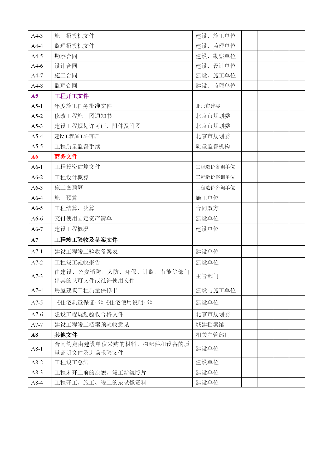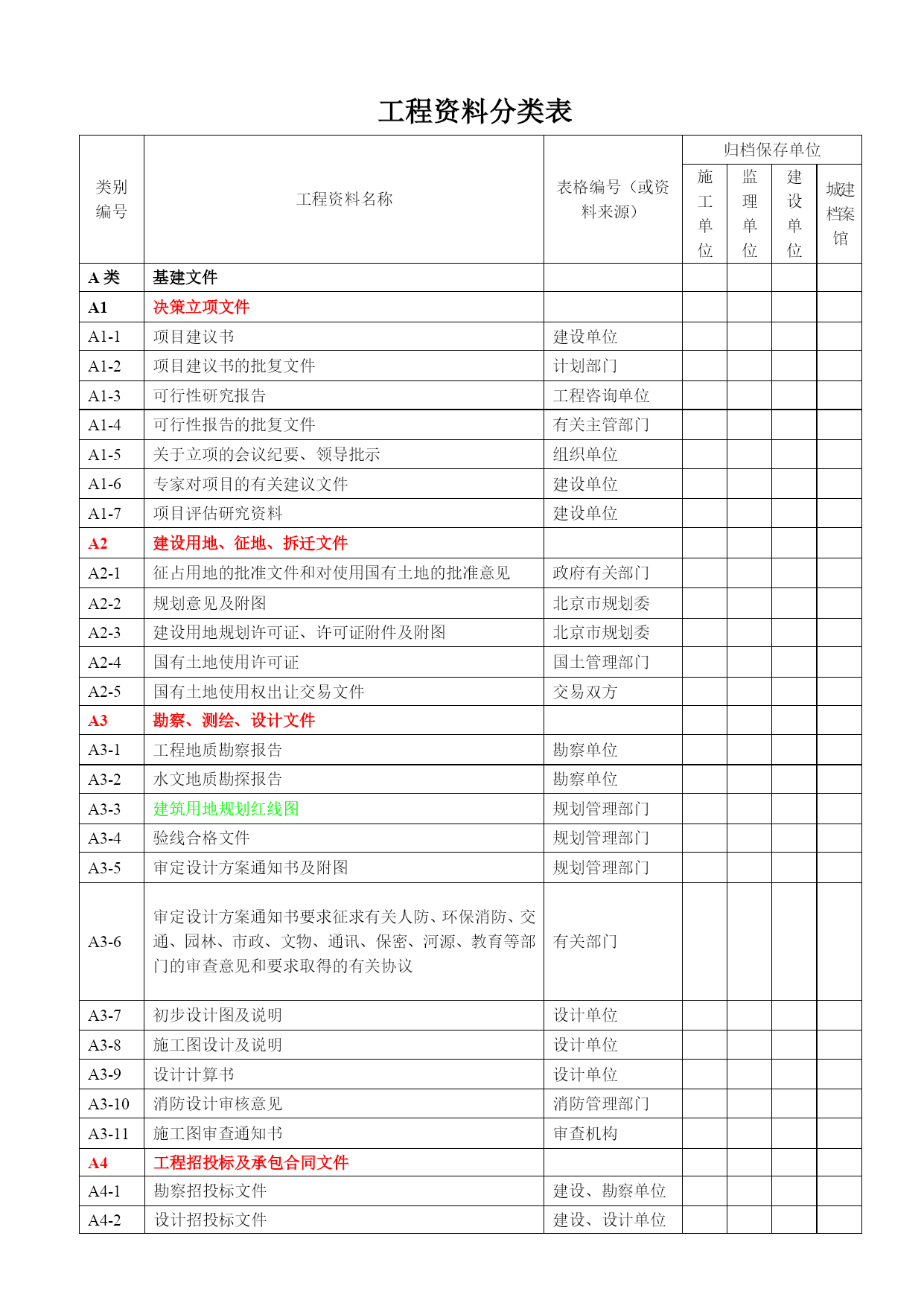 工程资料分类表-优质资料(可以直接使用,可编辑优质资料,欢迎下载)工程资料分类表类别编号工程资料名称表格编号(或资料来源)归档保存单位施工单位监理单位建设单位城建档案馆A类基建文件A1决策立项文件A1-1项目建议书建设单位A1-2项目建议书的批复文件计划部门A1-3可行性研究报告工程咨询单位A1-4可行性报告的批复文件有关主管部门A1-5关于立项的会议纪要、领导批示组织单位A1-6专家对项目的有关建议文件建设单位A1-7项目评估研究资料建设单位A2建设用地、征地、拆迁文件A2-1征占用地的批准文件和对使用国有土地的批准意见政府有关部门A2-2规划意见及附图北京市规划委A2-3建设用地规划许可证、许可证附件及附图北京市规划委A2-4国有土地使用许可证国土管理部门A2-5国有土地使用权出让交易文件交易双方A3勘察、测绘、设计文件A3-1工程地质勘察报告勘察单位A3-2水文地质勘探报告勘察单位A3-3建筑用地规划红线图规划管理部门A3-4验线合格文件规划管理部门A3-5审定设计方案通知书及附图规划管理部门A3-6审定设计方案通知书要求征求有关人防、环保消防、交通、园林、市政、文物、通讯、保密、河源、教育等部门的审查意见和要求取得的有关协议有关部门A3-7初步设计图及说明设计单位A3-8施工图设计及说明设计单位A3-9设计计算书设计单位A3-10消防设计审核意见消防管理部门A3-11施工图审查通知书审查机构A4工程招投标及承包合同文件A4-1勘察招投标文件建设、勘察单位A4-2设计招投标文件建设、设计单位A4-3施工招投标文件建设、施工单位A4-4监理招投标文件建设、监理单位A4-5勘察合同建设、勘察单位A4-6设计合同建设、设计单位A4-7施工合同建设、施工单位A4-8监理合同建设、监理单位A5工程开工文件A5-1年度施工任务批准文件北京市建委A5-2修改工程施工图通知书北京市规划委A5-3建设工程规划许可证、附件及附图北京市规划委A5-4建设工程施工许可证北京市规划委A5-5工程质量监督手续质量监督机构A6商务文件A6-1工程投资估算文件工程造价咨询单位A6-2工程设计概算工程造价咨询单位A6-3施工图预算工程造价咨询单位A6-4施工预算施工单位A6-5工程结算、决算合同双方A6-6交付使用固定资产清单建设单位A6-7建设工程概况建设单位A7工程竣工验收及备案文件A7-1建设工程竣工验收备案表建设单位A7-2工程竣工验收报告建设单位A7-3由建设、公安消防、人防、环保、计监、节能等部门出具的认可文件或准许使用文件主管部门A7-4房屋建筑工程质量保修书建设与施工单位A7-5《住宅质量保证书》《住宅使用说明书》建设单位A7-6建设工程规划验收合格文件北京市规划委A7-7建设工程竣工档案预验收意见城建档案馆A8其他文件相关主管部门A8-1合同约定由建设单位采购的材料、构配件和设备的质量证明文件及进场报验文件建设单位A8-2工程竣工总结建设单位A8-3工程未开工前的原貌、竣工新貌照片建设单位A8-4工程开工、施工、竣工的录录像资料建设单位