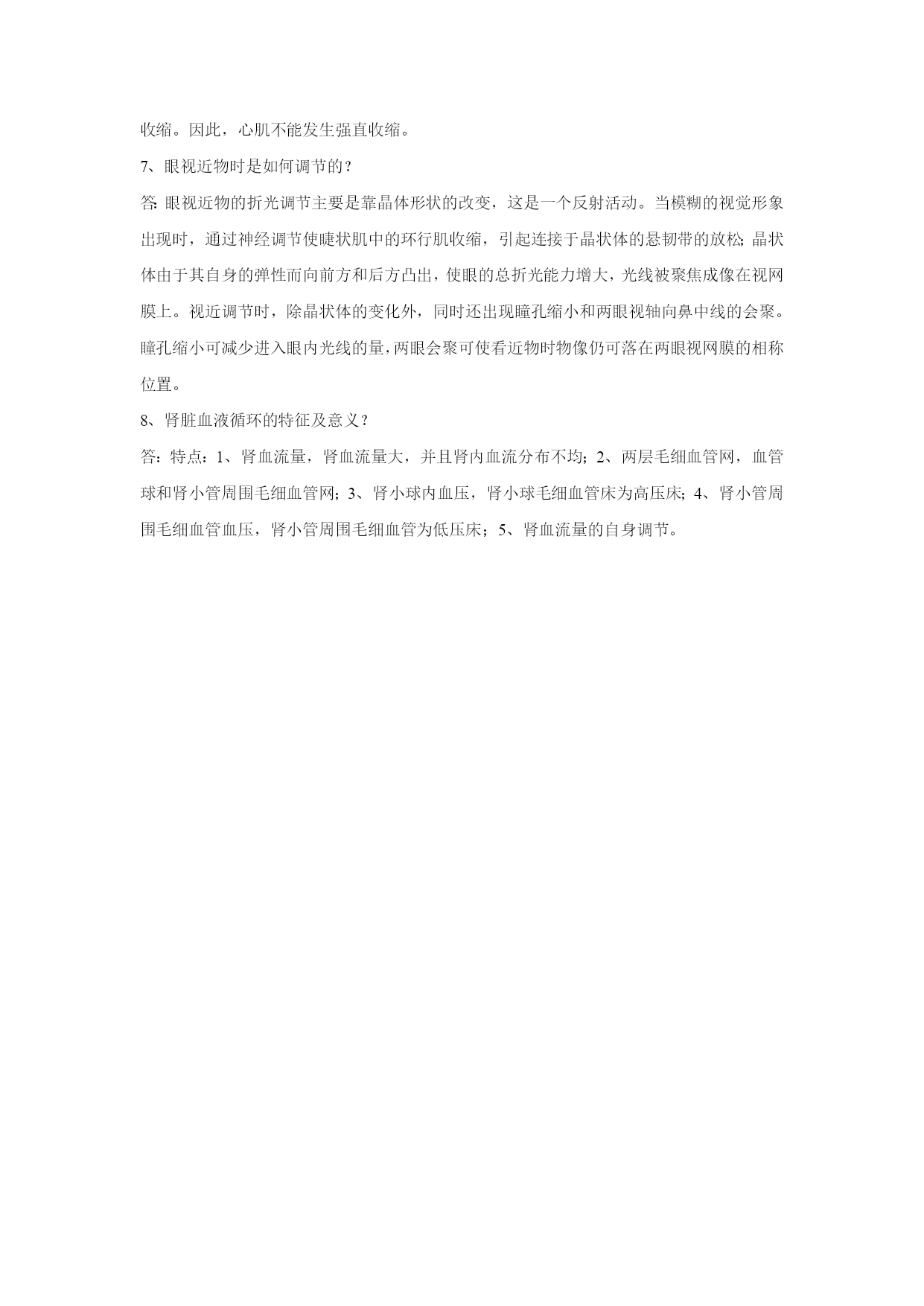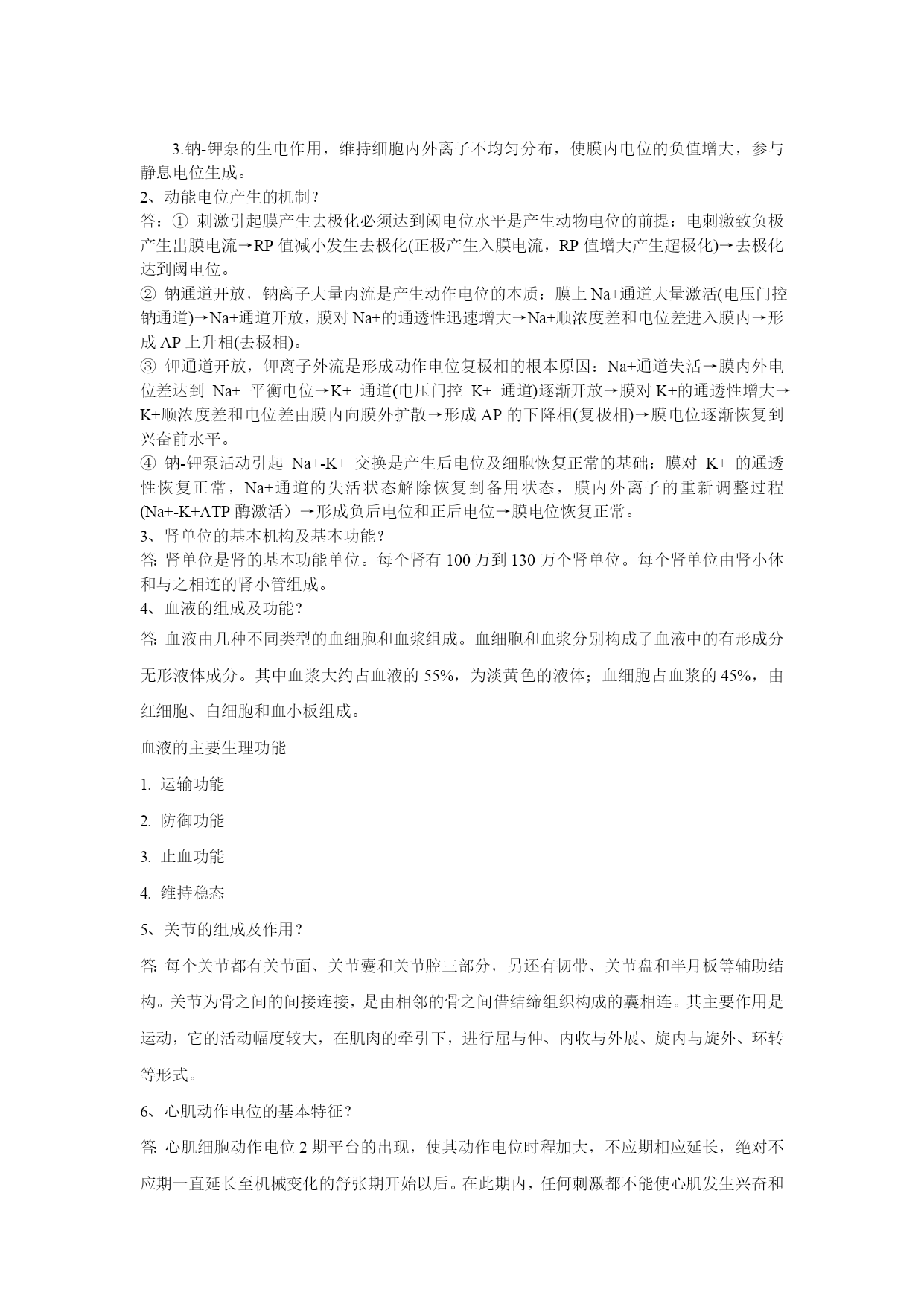 人体解剖学考点复习名词解释1、软骨内成骨:幼稚的结缔组织先形成软骨雏形,再由软骨改建成骨,如躯干骨和四肢骨主要以此方式成骨。膜内成骨:幼稚的结缔组织先增殖成结缔组织膜,膜再形成骨,如颅盖各骨都是以此方式成骨。2、主动转运:细胞在特殊的蛋白质介导下消耗能量,将物质从低浓度一侧转运到高浓度一侧的过程。被动转运:指物质或离子顺着浓度梯度或电位梯度通过细胞膜的扩散过程,其特点是不需要细胞提供能量。3、基础代谢率(BMR):在基础状态下单位时间、单位体表面积的产热量。基础代谢(BM):基础状态下的能量代谢,是人在清醒而极度安静状态下维持生命最低活动所需要的能量。4、暗适应:指从明处进入暗处,最初看不清,经过一定时间恢复暗视觉的过程(约25~30min)。明适应:从暗处到强光下时,最初感到一片耀眼的光亮,不能视物,只能稍等片刻,才能恢复视觉,(约1min)。5、心动周期:心脏一次收缩和舒张,称为一个心动周期。每博输出量:一侧心室每搏动一次所射出的血液量。6、条件反射:后天获得的经学习才会的反射,是后天学习、积累“经验”的反射活动。非条件反射:人生来就有的先天性反射。是一种比较低级的神经活动,由大脑皮层以下的神经中枢(如脑干、脊髓)参与即可完成。7、兴奋性突触后电位:发生在突触后膜上的局部电位变化,它引起细胞膜电位朝着去极化方向发展。抑制性突触后电位:同样是发生在突触后膜上的电位,但它引起细胞膜电位向着超极化方向发展的局部电位。8、食物的氧热价:某种食物氧化时消耗1升氧所产生的热量。呼吸熵(RQ):一定时间内呼出CO2的量与吸入O2量的比值。9、深感觉:指感受肌肉、肌腱、关节和韧带等深部结构的本体感觉和精细触觉。浅感觉:指皮肤与粘膜的痛、温、触、压等感觉而言,它们的感受器位置较浅。10、内环境:指细胞外液,既是细胞的直接生存环境,又是细胞与外界进行物质能量交换的媒介,是细胞赖以生存的体内环境。稳态:机体内环境相对稳定的功能状态。11、等张收缩:又称动力性收缩,是指肌肉收缩时仅表现为肌肉长度缩短,而肌肉的张力不变。等长收缩:又称为静力性收缩、表现为肌肉长度不变,而张力发生变化。12、脊休克:指脊髓与高位中枢离断(脊动物)时,横断面以下脊髓的反射功能暂时消失的现象。大脑僵直:在动物中脑上下丘之间切断脑干,动物出现伸肌过度紧张现象,表现为四肢伸直、头尾昂起、脊柱挺硬的现象。13、远距离分泌:激素进入毛细血管或毛细淋巴管,随血液或淋巴液运送至远距离的靶组织而发挥作用。旁分泌:某些激素可以不经血液运输,仅由组织液扩散而作用于邻近细胞。二、简答题1、静息电位形成的离子机制?静息电位主要由K+外流形成,接近于K+的电-化学平衡电位。1.细胞内外Na+和K+的分布不均匀,细胞外高Na+而细胞内高K+.2.安静时膜对K+的通透性远大于Na+,K+顺浓度梯度外流,并达到电-化学平衡。3.钠-钾泵的生电作用,维持细胞内外离子不均匀分布,使膜内电位的负值增大,参与静息电位生成。2、动能电位产生的机制?答:①刺激引起膜产生去极化必须达到阈电位水平是产生动物电位的前提:电刺激致负极产生出膜电流→RP值减小发生去极化(正极产生入膜电流,RP值增大产生超极化)→去极化达到阈电位。②钠通道开放,钠离子大量内流是产生动作电位的本质:膜上Na+通道大量激活(电压门控钠通道)→Na+通道开放,膜对Na+的通透性迅速增大→Na+顺浓度差和电位差进入膜内→形成AP上升相(去极相)。③钾通道开放,钾离子外流是形成动作电位复极相的根本原因:Na+通道失活→膜内外电位差达到Na+平衡电位→K+通道(电压门控K+通道)逐渐开放→膜对K+的通透性增大→K+顺浓度差和电位差由膜内向膜外扩散→形成AP的下降相(复极相)→膜电位逐渐恢复到兴奋前水平。④钠-钾泵活动引起Na+-K+交换是产生后电位及细胞恢复正常的基础:膜对K+的通透性恢复正常,Na+通道的失活状态解除恢复到备用状态,膜内外离子的重新调整过程(Na+-K+ATP酶激活)→形成负后电位和正后电位→膜电位恢复正常。3、肾单位的基本机构及基本功能?答:肾单位是肾的基本功能单位。每个肾有100万到130万个肾单位。每个肾单位由肾小体和与之相连的肾小管组成。4、血液的组成及功能?答:血液由几种不同类型的血细胞和血浆组成。血细胞和血浆分别构成了血液中的有形成分无形液体成分。其中血浆大约占血液的55%,为淡黄色的液体;血细胞占血浆的45%,由红细胞、白细胞和血小板组成。血液的主要生理功能1.运输功能2.防御功能3.止血功能4.维持稳态5、关节的组成及作用?答:每个关节都有关节面、关节囊和关节腔三部分,另还有韧带、关节盘和半月板等辅助结构。关节为骨之间的间接连接,是
