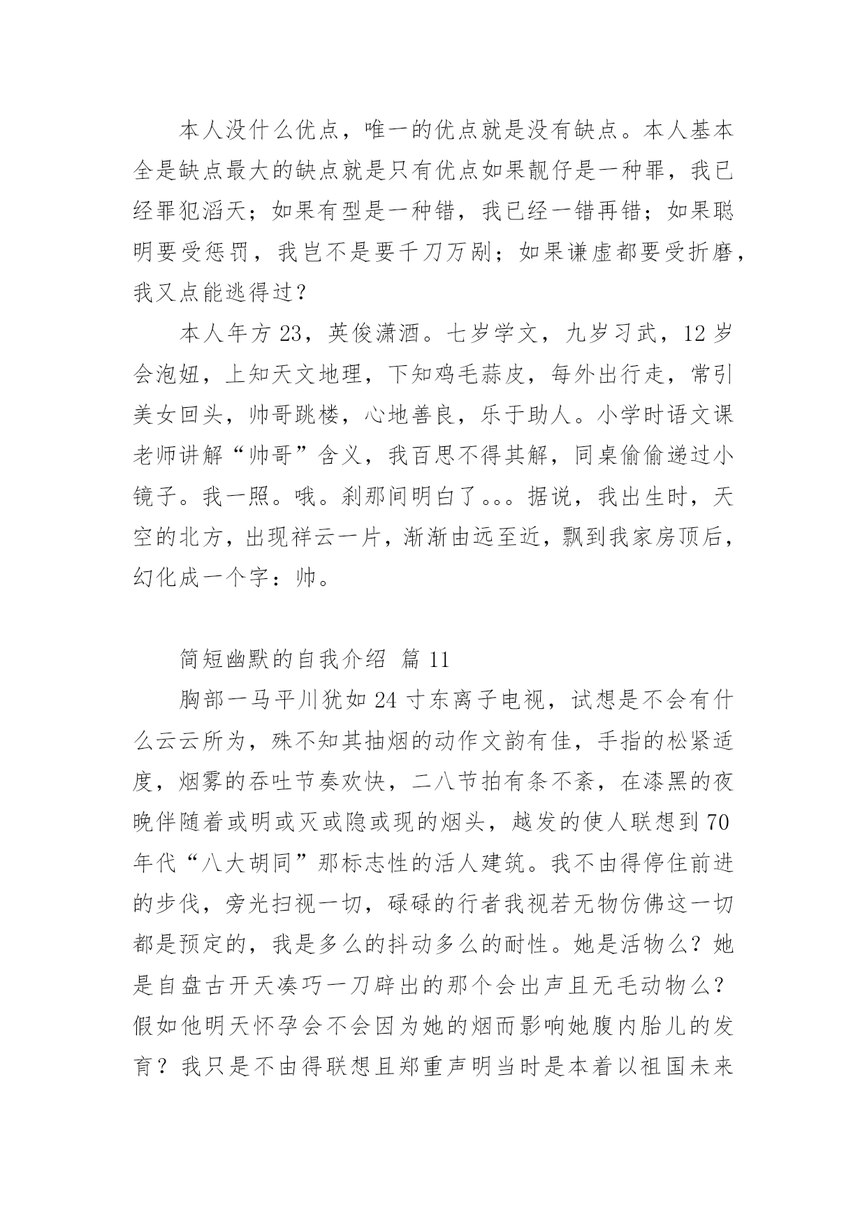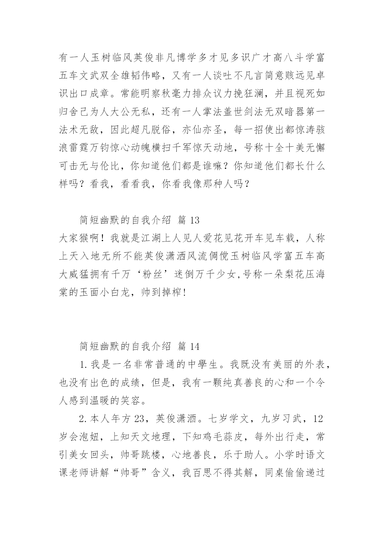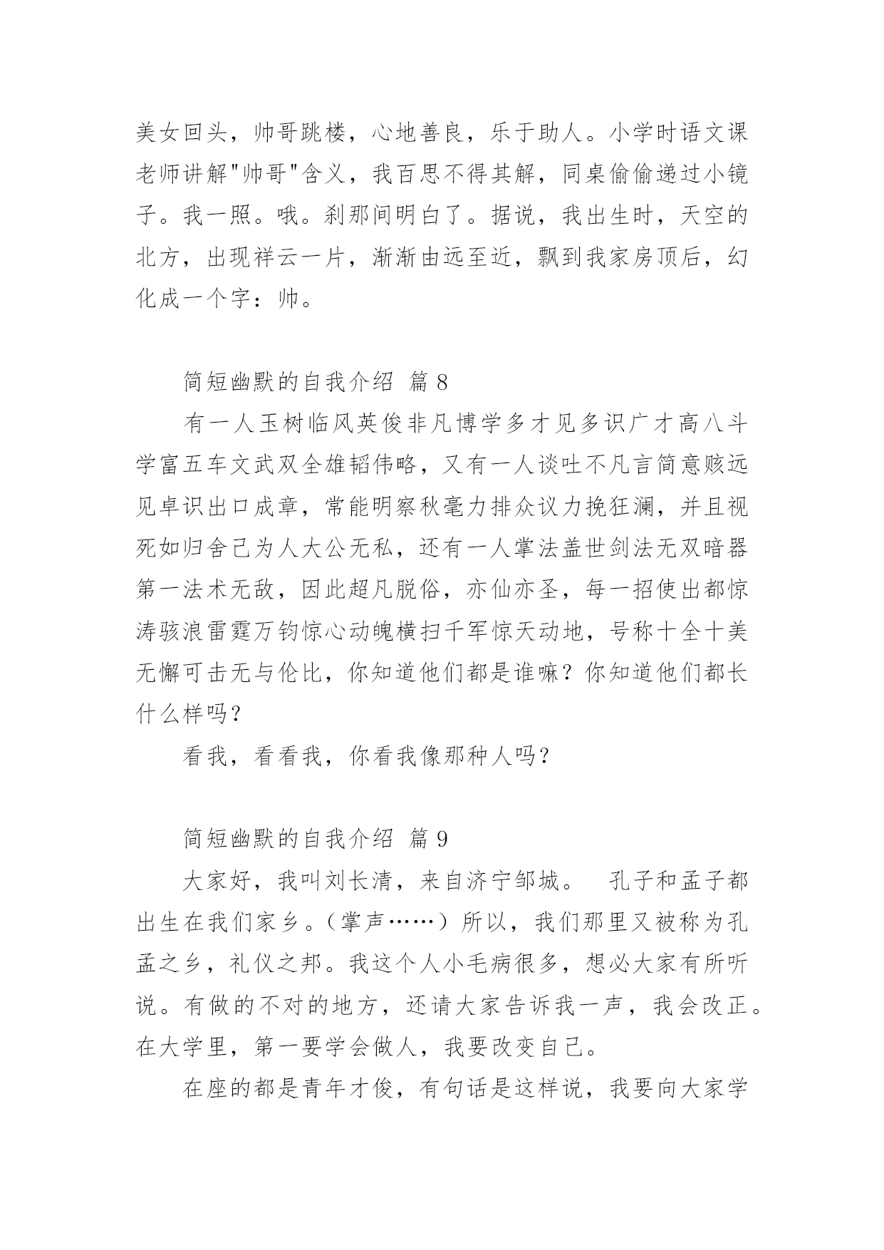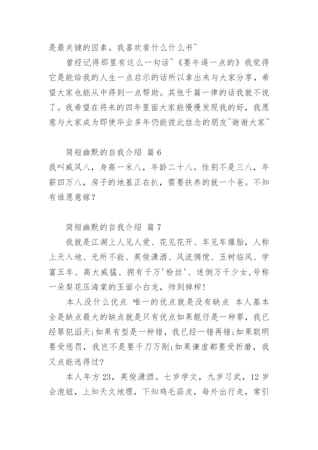 简短幽默的自我介绍处在一个陌生场合时,需要我们进行自我介绍,通过自我介绍可以让别人认识自己。写自我介绍可不能随随便便哦,下面是小编帮大家整理的简短幽默的自我介绍,欢迎阅读,希望大家能够喜欢。简短幽默的自我介绍篇1大家好,我是xxx,来到这里,我非常的兴奋,因为我又能在新的环境中,找到新的朋友了大学新生自我介绍幽默自我介绍。我是一名学习一般,相貌一般,体格一般的内向学生。我沉着冷静,比较和善,也比较好相处,大家可以和我多交朋友我喜欢看书,特别是喜欢xxx的书,希望在大学能够交到一些志同道合的书友。我和在座的同学们一样,渴望展翅高飞,渴望将来有更大的发展空间,有施展才华的更广阔的天地。我想,有耕耘就会有收获。未来的四年里,由各位老师的倾情传授,我们一定会有一个更加无限美好的未来。谢谢大家。简短幽默的自我介绍篇2我貌赛潘安,义超关羽,智胜孔明,上知天文,下晓地理,出口成章,提笔成文,懂阴阳,测八卦,知奇门,晓遁甲的,大豪杰,大英雄,大剑客,大宗师,人称山崩地裂水倒流,赶浪无丝鬼见愁,前无古人,后无来者的,天下第一——“帅”呀~~是这段吧!自己的主持人观点:电视是一扇窗,当你打开着扇窗时,你我之间就开始了真诚的交流,主持对我来说是一个无限广阔的魅力空间,我心甘愿为他付出,为他去奉献赛前宣言:这次挑战主持人真可是对手如云,不管我今天的胜负如何,我都要把的一面展现给观众朋友选手心语:我喜欢挑战自我,喜欢在强手之中找到自己的位置,如果胜利我会嫣然一笑,如果失败我会得到更大的动力,争取更大的成功.简短幽默的自我介绍篇3大家好,我叫xxx,今年8岁,是xxx外国语学校小学部二(1)班男生,爸爸、妈妈给我取这个名字,希望我在学习上有所成就。我的爱好是体育,比如说跑步等,我的特长是画画。我的缺点是有时写作业不够细心,有时会发一点小脾气,但今后我一定会改正这些缺点。我是一个活泼可爱的小男孩,我的家里有爷爷、奶奶、爸爸、妈妈、姐姐和我,我拥有一个幸福和谐的大家庭,我介绍完了,你们愿意和我交朋友吗?简短幽默的自我介绍篇4各位下午好!下面我将通过简单的面试自我介绍让您来了解我。我叫___________,来自______________,年龄__________岁。于今年6月份毕业于______________大学______________,专业为市场营销,我以前做过______________,所以对销售有一定的经验。此外,我在新华书店门市工作过,对服务好顾客有一定的心得。在读书期间,我已经做过暑期工,是向用餐的客人推销啤酒。那时我认为,营销是一种服务。既然是一种服务,就应该做到让大家满意,用热情和真心去做。激情,工作中不可或缺的要素,是推动我们在工作中不断创新,全身心投入工作的动力。激情加上挑战自我的意识,我相信我能胜任这份工作。我非常欣赏贵公司企业文化:“诚信是我们合作的基础,双赢是我们共同的目标!”我愿与___________文化一起发展,一起创造辉煌的明天!请给我一个试岗的机会,我有信心做好该岗位工作,愿服从贵公司的安排,随时可以就任岗位,并在贵公司做长期发展的准备,因为是贵公司给了我这样一个机会。简短幽默的自我介绍篇5大家好我叫XXX我是一个超级活泼的人噢~不要被我看似文静或者内敛的外面给欺骗了噢~我的胜任座右铭是:态度决定一切。因为我觉得一个人到底会不会成功,态度才是最关键的因素。我喜欢看什么什么书~曾经记得那里有这么一句话~《要牛逼一点的》我觉得它是能给我的人生一点启示的话所以拿出来与大家分享,希望大家也能从中得到一点帮助。其他千篇一律的话我就不说了。我希望在将来的四年里面大家能慢慢发现我的好,我愿意与大家成为即使毕业多年仍能彼此挂念的朋友~谢谢大家~简短幽默的自我介绍篇6我叫威风八,身高一米八,年龄二十八。性别不是三八,年薪四万八,房子的地基正在扒,需要扶养的就一个爸。不知有谁愿意嫁?简短幽默的自我介绍篇7我就是江湖上人见人爱、花见花开、车见车爆胎,人称上天入地、无所不能、英俊潇洒、风流倜傥、玉树临风、学富五车、高大威猛、拥有千万'粉丝'、迷倒万千少女,号称一朵梨花压海棠的玉面小白龙,帅到掉榨!本人没什么优点唯一的优点就是没有缺点本人基本全是缺点最大的缺点就是只有优点如果靓仔是一种罪,我已经罪犯滔天;如果有型是一种错,我已经一错再错;如果聪明要受惩罚,我岂不是要千刀万剐;如果谦虚都要受折磨,我又点能逃得过?本人年方23,英俊潇酒。七岁学文,九岁习武,12岁会泡妞,上知天文地理,下知鸡毛蒜皮,每外出行走,常引美女回头,帅哥跳楼,心地善良,乐于助人。小学时语文课老师讲解"帅哥"含义,我百思不得其解,同桌偷偷递过小镜子。我一照。哦。刹那间明白了。据说,我出生时,天空的北方,出现祥云一片,渐渐由远至近,飘到我家房顶后,幻化成一个字:帅。简短
