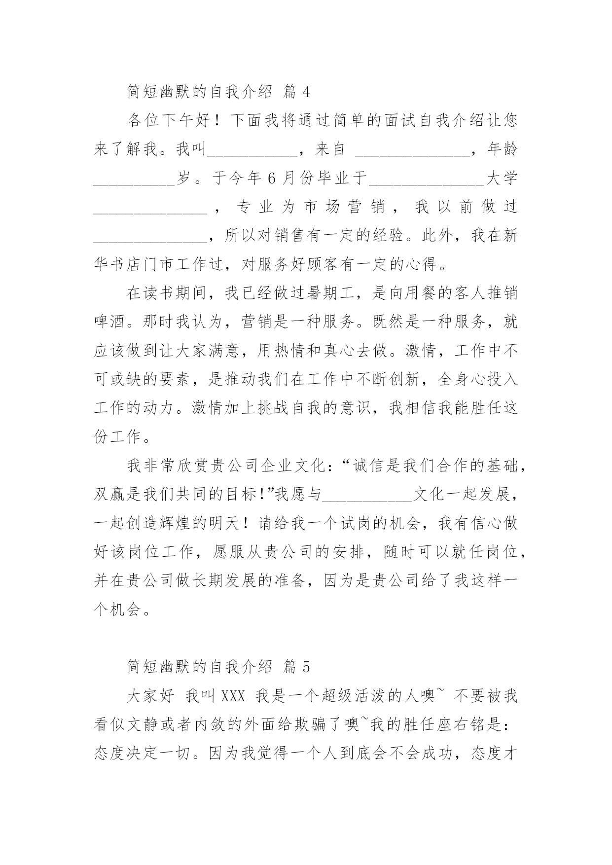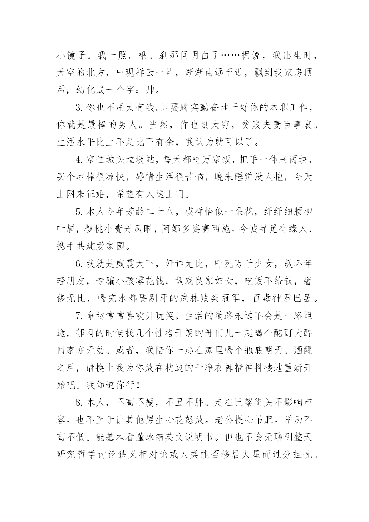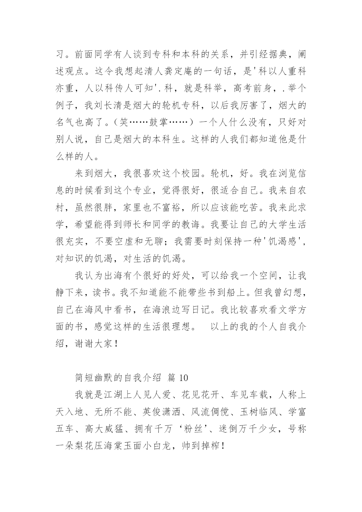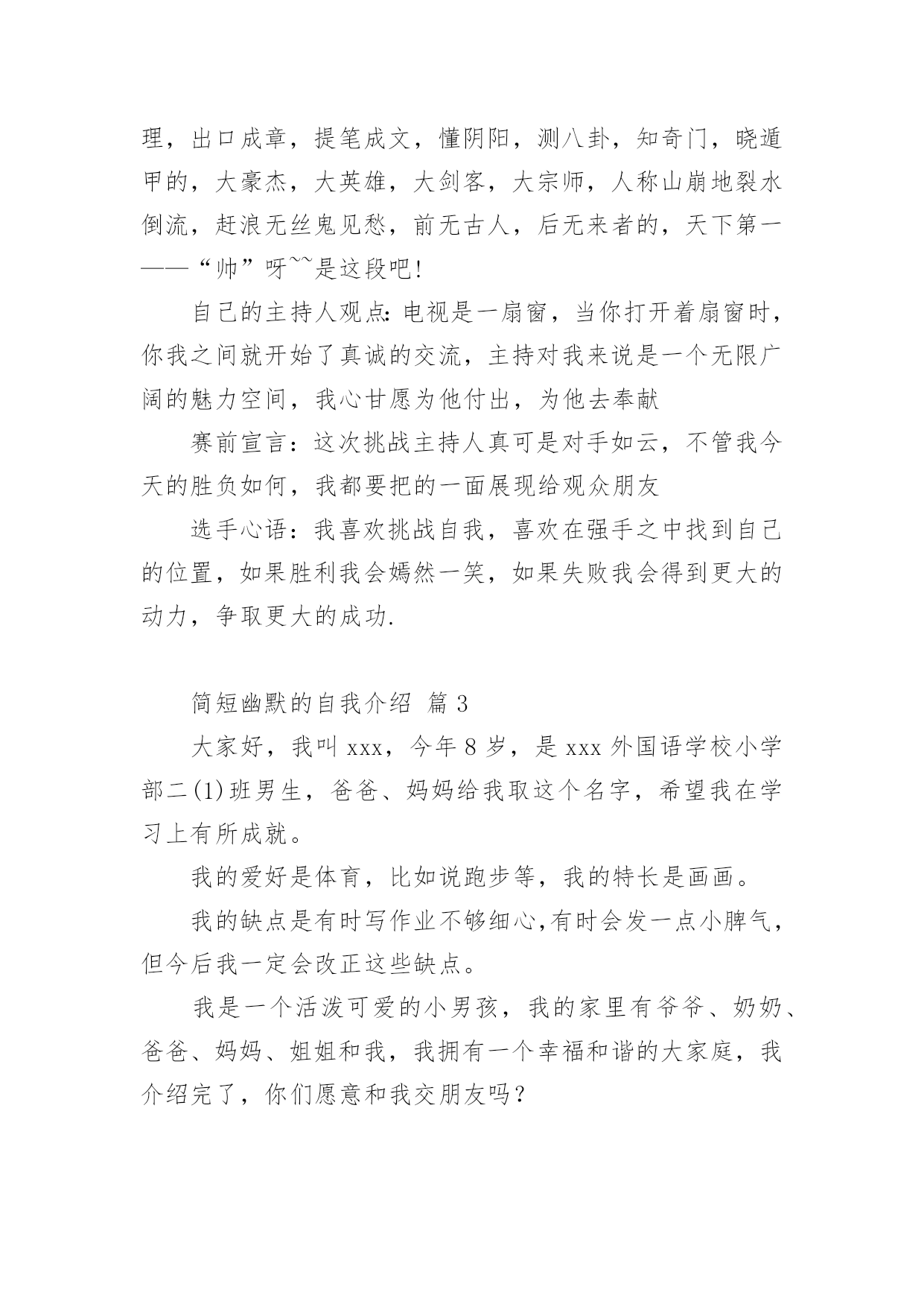 简短幽默的自我介绍处在一个陌生场合时,需要我们进行自我介绍,通过自我介绍可以让别人认识自己。写自我介绍可不能随随便便哦,下面是小编帮大家整理的简短幽默的自我介绍,欢迎阅读,希望大家能够喜欢。简短幽默的自我介绍篇1大家好,我是xxx,来到这里,我非常的兴奋,因为我又能在新的环境中,找到新的朋友了大学新生自我介绍幽默自我介绍。我是一名学习一般,相貌一般,体格一般的内向学生。我沉着冷静,比较和善,也比较好相处,大家可以和我多交朋友我喜欢看书,特别是喜欢xxx的书,希望在大学能够交到一些志同道合的书友。我和在座的同学们一样,渴望展翅高飞,渴望将来有更大的发展空间,有施展才华的更广阔的天地。我想,有耕耘就会有收获。未来的四年里,由各位老师的倾情传授,我们一定会有一个更加无限美好的未来。谢谢大家。简短幽默的自我介绍篇2我貌赛潘安,义超关羽,智胜孔明,上知天文,下晓地理,出口成章,提笔成文,懂阴阳,测八卦,知奇门,晓遁甲的,大豪杰,大英雄,大剑客,大宗师,人称山崩地裂水倒流,赶浪无丝鬼见愁,前无古人,后无来者的,天下第一——“帅”呀~~是这段吧!自己的主持人观点:电视是一扇窗,当你打开着扇窗时,你我之间就开始了真诚的交流,主持对我来说是一个无限广阔的魅力空间,我心甘愿为他付出,为他去奉献赛前宣言:这次挑战主持人真可是对手如云,不管我今天的胜负如何,我都要把的一面展现给观众朋友选手心语:我喜欢挑战自我,喜欢在强手之中找到自己的位置,如果胜利我会嫣然一笑,如果失败我会得到更大的动力,争取更大的成功.简短幽默的自我介绍篇3大家好,我叫xxx,今年8岁,是xxx外国语学校小学部二(1)班男生,爸爸、妈妈给我取这个名字,希望我在学习上有所成就。我的爱好是体育,比如说跑步等,我的特长是画画。我的缺点是有时写作业不够细心,有时会发一点小脾气,但今后我一定会改正这些缺点。我是一个活泼可爱的小男孩,我的家里有爷爷、奶奶、爸爸、妈妈、姐姐和我,我拥有一个幸福和谐的大家庭,我介绍完了,你们愿意和我交朋友吗?简短幽默的自我介绍篇4各位下午好!下面我将通过简单的面试自我介绍让您来了解我。我叫___________,来自______________,年龄__________岁。于今年6月份毕业于______________大学______________,专业为市场营销,我以前做过______________,所以对销售有一定的经验。此外,我在新华书店门市工作过,对服务好顾客有一定的心得。在读书期间,我已经做过暑期工,是向用餐的客人推销啤酒。那时我认为,营销是一种服务。既然是一种服务,就应该做到让大家满意,用热情和真心去做。激情,工作中不可或缺的要素,是推动我们在工作中不断创新,全身心投入工作的动力。激情加上挑战自我的意识,我相信我能胜任这份工作。我非常欣赏贵公司企业文化:“诚信是我们合作的基础,双赢是我们共同的目标!”我愿与___________文化一起发展,一起创造辉煌的明天!请给我一个试岗的机会,我有信心做好该岗位工作,愿服从贵公司的安排,随时可以就任岗位,并在贵公司做长期发展的准备,因为是贵公司给了我这样一个机会。简短幽默的自我介绍篇5大家好我叫XXX我是一个超级活泼的人噢~不要被我看似文静或者内敛的外面给欺骗了噢~我的胜任座右铭是:态度决定一切。因为我觉得一个人到底会不会成功,态度才是最关键的因素。我喜欢看什么什么书~曾经记得那里有这么一句话~《要牛逼一点的》我觉得它是能给我的人生一点启示的话所以拿出来与大家分享,希望大家也能从中得到一点帮助。其他千篇一律的话我就不说了。我希望在将来的四年里面大家能慢慢发现我的好,我愿意与大家成为即使毕业多年仍能彼此挂念的朋友~谢谢大家~简短幽默的自我介绍篇6我叫威风八,身高一米八,年龄二十八。性别不是三八,年薪四万八,房子的地基正在扒,需要扶养的就一个爸。不知有谁愿意嫁?简短幽默的自我介绍篇7我就是江湖上人见人爱、花见花开、车见车爆胎,人称上天入地、无所不能、英俊潇洒、风流倜傥、玉树临风、学富五车、高大威猛、拥有千万'粉丝'、迷倒万千少女,号称一朵梨花压海棠的玉面小白龙,帅到掉榨!本人没什么优点唯一的优点就是没有缺点本人基本全是缺点最大的缺点就是只有优点如果靓仔是一种罪,我已经罪犯滔天;如果有型是一种错,我已经一错再错;如果聪明要受惩罚,我岂不是要千刀万剐;如果谦虚都要受折磨,我又点能逃得过?本人年方23,英俊潇酒。七岁学文,九岁习武,12岁会泡妞,上知天文地理,下知鸡毛蒜皮,每外出行走,常引美女回头,帅哥跳楼,心地善良,乐于助人。小学时语文课老师讲解"帅哥"含义,我百思不得其解,同桌偷偷递过小镜子。我一照。哦。刹那间明白了。据说,我出生时,天空的北方,出现祥云一片,渐渐由远至近,飘到我家房顶后,幻化成一个字:帅。简短