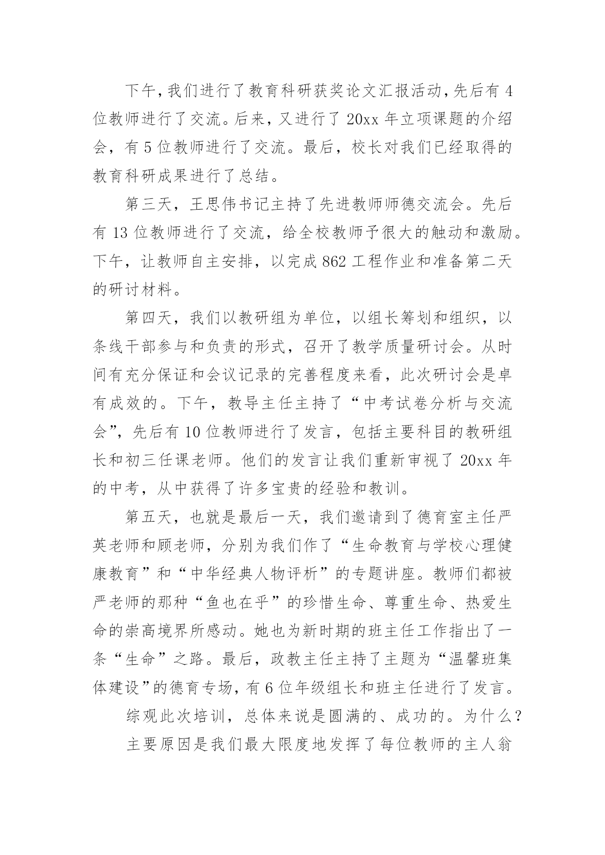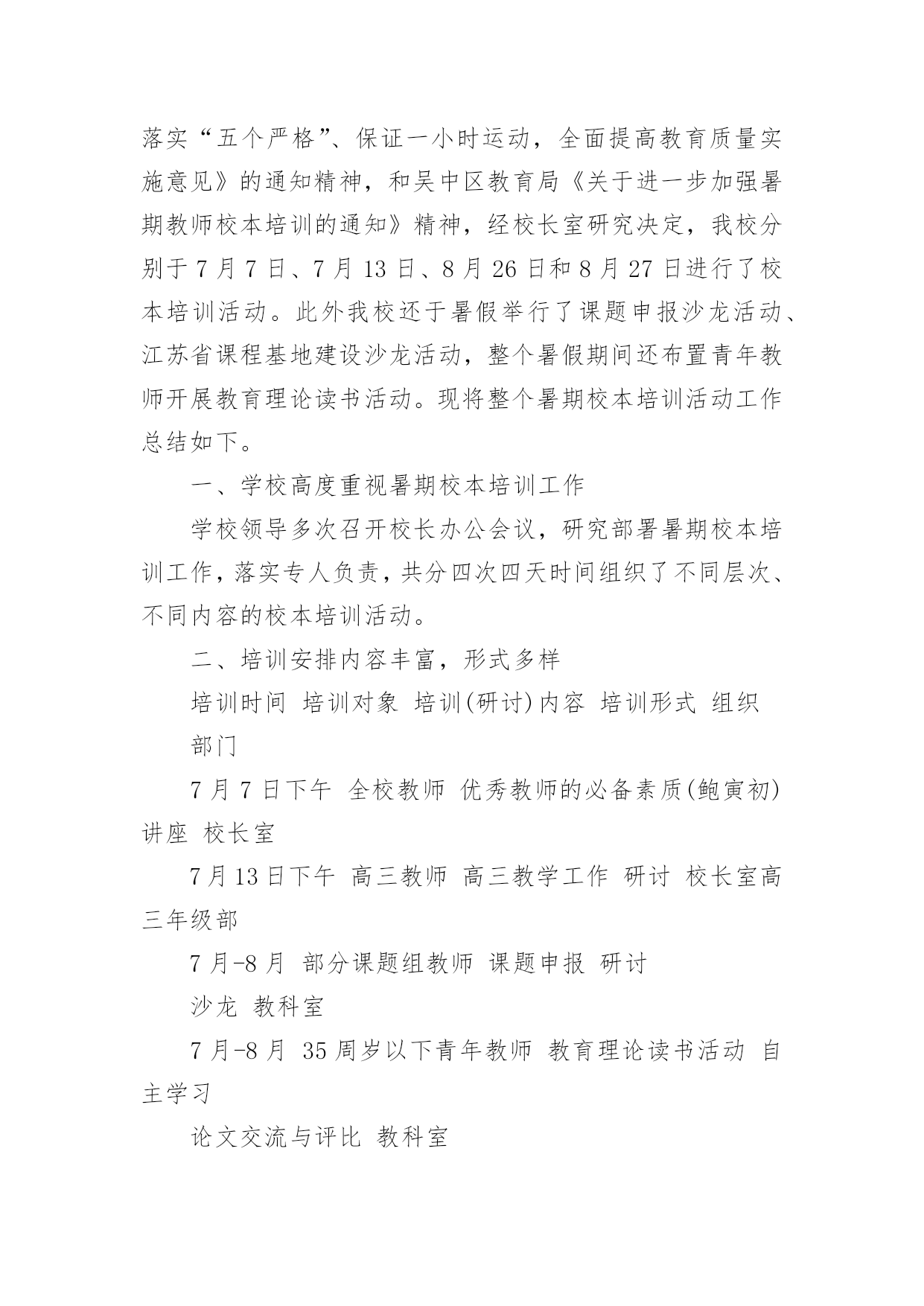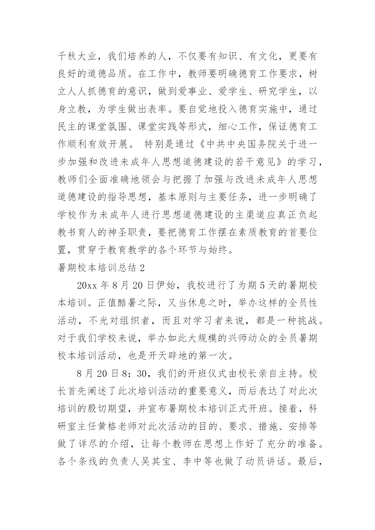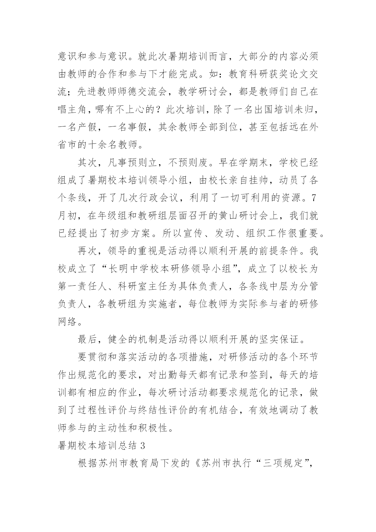 暑期校本培训总结暑期校本培训总结总结是把一定阶段内的有关情况分析研究,做出有指导性结论的书面材料,写总结有利于我们学习和工作能力的提高,不如立即行动起来写一份总结吧。总结怎么写才不会流于形式呢?下面是小编帮大家整理的暑期校本培训总结,希望对大家有所帮助。暑期校本培训总结1德育处于学校教育工作的首要地位,是实施素质教育的重要一环,对促进学生全面发展,起着主导和决定作用。我校在各级教育行政部门的正确领导下,自觉地强化学校德育工作,优化育人环境,着力营造和谐向上的育人氛围。今年x月x日至26日,我校根据上级文件精神,组织了教师暑期师德培训。一、领导认识到位学校建立了师德专题培训领导小组,由校长任组长,副校长任副组长,成员由教务主任、政教主任和各年级组长组成。领导小组充分认识到师德培训要以党的十六大精神为指针,以贯彻落实十六大提出的加强教师队伍建设,提高教师师德和业务水平为总要求,要通过暑期师德教育培训进一步提高每位教师的师德修养,进一步提升教育理念,努力增强教师的自豪感和使命感,学习和弘扬身边的优秀教师先进事迹,促使教师成为师德高尚、业务精湛、以人为本、为人民服务的优秀群体。二、培训内容务实师德培训不能走过场,需扎扎实实、实实在在地进行。我校在今年的师德培训中先后组织教师学习了《中共中央国务院关于进一步加强和改进未成年人思想道德建设的若干意见》、《20xx~20xx年教育振兴行动计划》、《中小学生伤害事故处理条例》、禁止有偿家教、教师心理健康知识材料、新课程改革的理念与方法等,充分体现了师德培训的务实化思想。三、培训要求明确1、明确学习重点,注重联系实际。本次培训以更新教育理念,全面提高教师敬业爱岗、无私奉献、求真务实的精神为重点。要求教师在学习中对照先进寻找差距,提高思想认识,切实解决存在的师德问题。2、采取理论学习与交流研讨相结合、集中学习与分散自学相结合等形式进行培训。要求全校教职工围绕主题讨论深入进行自我剖析,并撰写一篇以“加强和改进未成年人思想道德建设”为主题的学习心得。3、开展社会实践。组织教师开展走访家庭活动,了解学生暑期学习生活情况,以便开学后有针对性地进行教育。四、培训效果良好通过培训,广大教师深刻认识到:提高教育是培养人的千秋大业,我们培养的人,不仅要有知识、有文化,更要有良好的道德品质。在工作中,教师要明确德育工作要求,树立人人抓德育的意识,做到爱事业、爱学生、研究学生,以身立教,为学生做出表率。要自觉地投入德育实施中,通过民主的课堂氛围、课堂实践等形式,细心工作,保证德育工作顺利有效开展。特别是通过《中共中央国务院关于进一步加强和改进未成年人思想道德建设的若干意见》的学习,教师们全面准确地领会与把握了加强与改进未成年人思想道德建设的指导思想,基本原则与主要任务,进一步明确了学校作为未成年人进行思想道德建设的主渠道应真正负起教书育人的神圣职责,要把德育工作摆在素质教育的首要位置,贯穿于教育教学的各个环节与始终。暑期校本培训总结220xx年8月20日伊始,我校进行了为期5天的暑期校本培训。正值酷暑之际,又当休息之时,举办这样的全员性活动,不光对组织者,而且对学习者来说,都是一种挑战。对于我们学校来说,举办如此大规模的兴师动众的全员暑期校本培训活动,也是开天辟地的第一次。8月20日8:30,我们的开班仪式由校长亲自主持。校长首先阐述了此次培训活动的重要意义,而后表达了对此次培训的殷切期望,并宣布暑期校本培训正式开班。接着,科研室主任黄格老师对此次活动的目的、要求、措施、安排等做了详尽的介绍,让每个教师在思想上作好了充分的准备。各个条线的负责人吴其宝、李中等也做了动员讲话。最后,书记作了高屋建瓴的概括:1、此次活动是“二期课改”推进的必然要求。2、此次活动是学校内涵发展的重要举措。3、此次活动是我校教师专业发展的有效途径。4、此次活动是“十一五”校本研修的一个缩影。随后,我们又观看了862工程的录象,包括语文、数学、英语各一堂课。下午,我们邀请了县进修学校副校长原研训部主任龚耀昌老师,为我们作了“二期课改背景下,教师的备课、上课及教学评价”的主题报告。报告不但清晰地讲述了新形势下,教师如何发展自己的课堂教学能力,而且给我们学校提出了中肯的、符合我们学校实际的建设性意见。他的报告不但给老师们予教育,也给了学校领导予启迪和新的思路,得到了一致的好评。第二天,我们邀请了县科研室主任刘伟超老师作了“教育科研课题的选择与方案设计”的主题报告。刘主任介绍了课题选择的一般思路和方案设计的一般方法,还一针见血地指出了此次培训的关键性问题,并作了充分肯定。听他的报告,给人的感受是:1、深入浅出。校长、科研室主任之流听了意犹未尽,对科研事不甚了了的新、老教师也所获颇丰。2、联系实际。他总能找到与本校教师的契合点,总能时不时地抓住老师