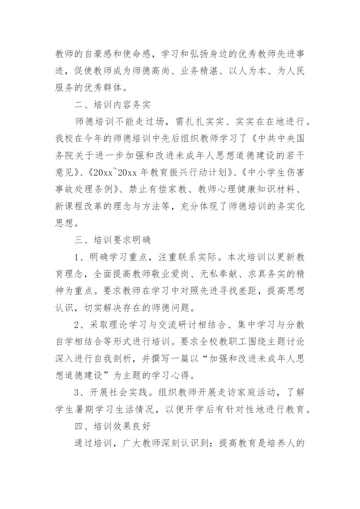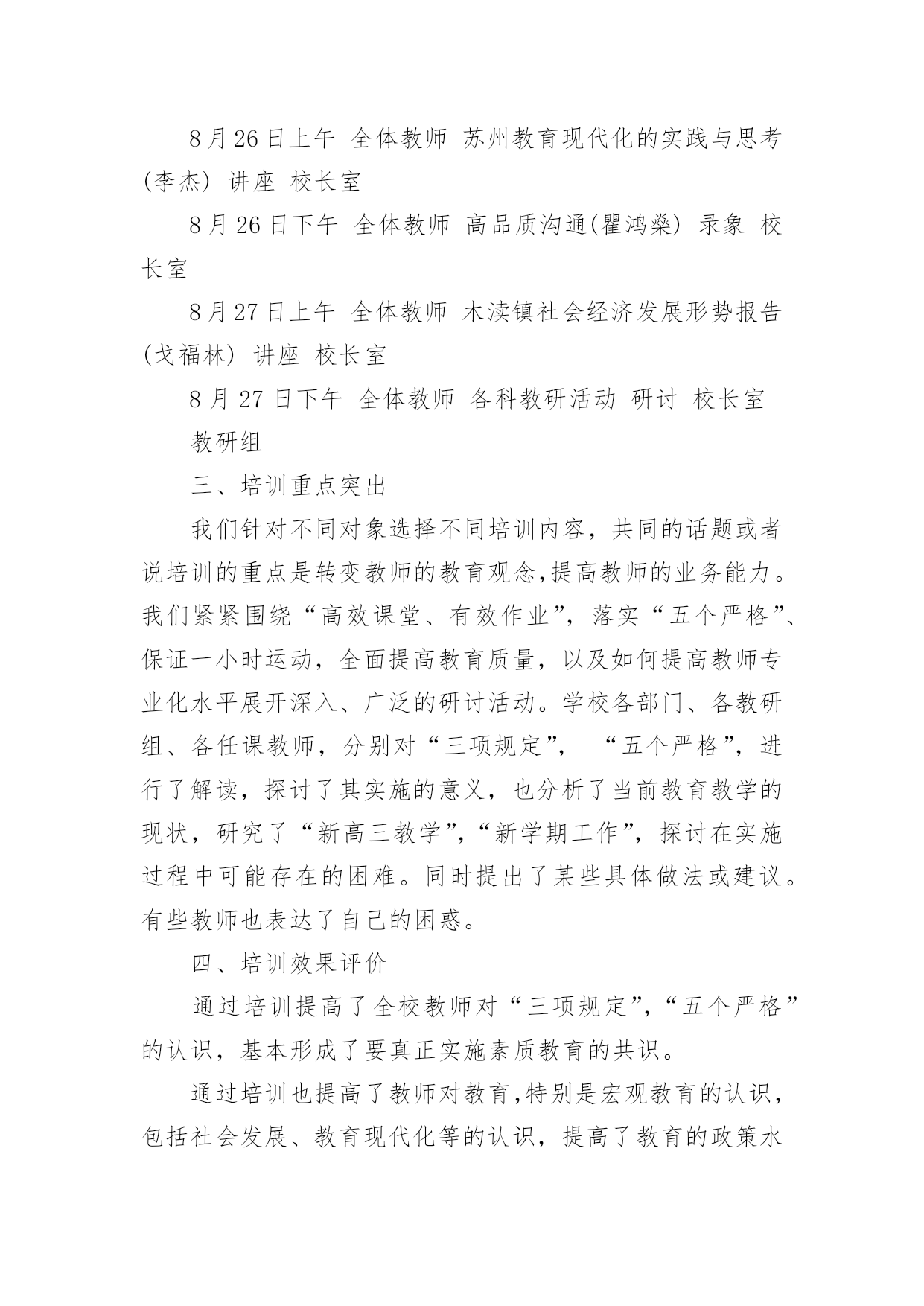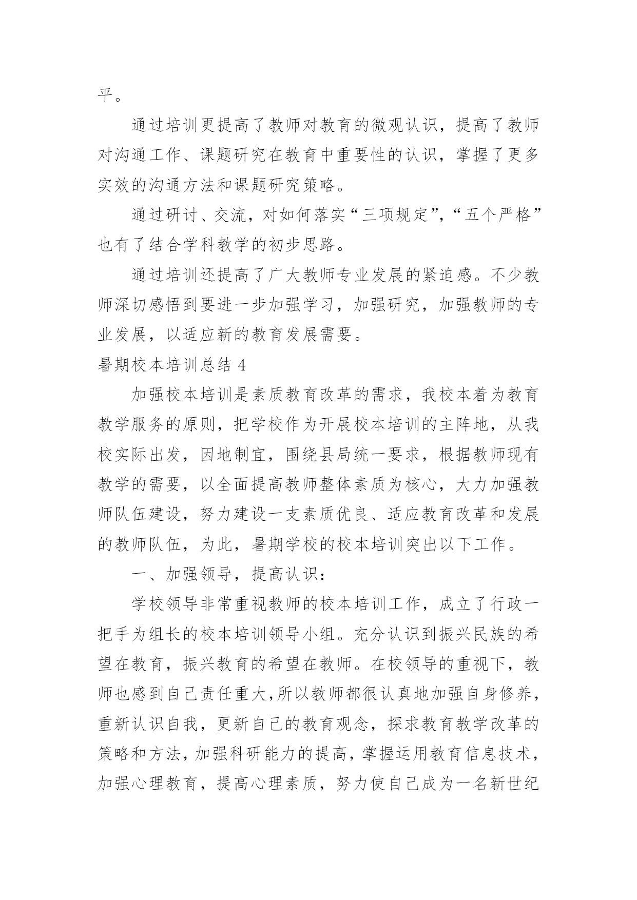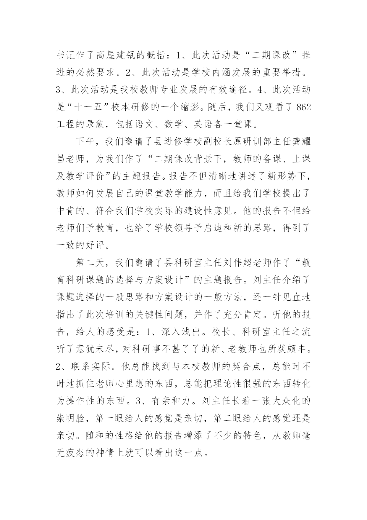 暑期校本培训总结暑期校本培训总结总结是把一定阶段内的有关情况分析研究,做出有指导性结论的书面材料,写总结有利于我们学习和工作能力的提高,不如立即行动起来写一份总结吧。总结怎么写才不会流于形式呢?下面是小编帮大家整理的暑期校本培训总结,希望对大家有所帮助。暑期校本培训总结1德育处于学校教育工作的首要地位,是实施素质教育的重要一环,对促进学生全面发展,起着主导和决定作用。我校在各级教育行政部门的正确领导下,自觉地强化学校德育工作,优化育人环境,着力营造和谐向上的育人氛围。今年x月x日至26日,我校根据上级文件精神,组织了教师暑期师德培训。一、领导认识到位学校建立了师德专题培训领导小组,由校长任组长,副校长任副组长,成员由教务主任、政教主任和各年级组长组成。领导小组充分认识到师德培训要以党的十六大精神为指针,以贯彻落实十六大提出的加强教师队伍建设,提高教师师德和业务水平为总要求,要通过暑期师德教育培训进一步提高每位教师的师德修养,进一步提升教育理念,努力增强教师的自豪感和使命感,学习和弘扬身边的优秀教师先进事迹,促使教师成为师德高尚、业务精湛、以人为本、为人民服务的优秀群体。二、培训内容务实师德培训不能走过场,需扎扎实实、实实在在地进行。我校在今年的师德培训中先后组织教师学习了《中共中央国务院关于进一步加强和改进未成年人思想道德建设的若干意见》、《20xx~20xx年教育振兴行动计划》、《中小学生伤害事故处理条例》、禁止有偿家教、教师心理健康知识材料、新课程改革的理念与方法等,充分体现了师德培训的务实化思想。三、培训要求明确1、明确学习重点,注重联系实际。本次培训以更新教育理念,全面提高教师敬业爱岗、无私奉献、求真务实的精神为重点。要求教师在学习中对照先进寻找差距,提高思想认识,切实解决存在的师德问题。2、采取理论学习与交流研讨相结合、集中学习与分散自学相结合等形式进行培训。要求全校教职工围绕主题讨论深入进行自我剖析,并撰写一篇以“加强和改进未成年人思想道德建设”为主题的学习心得。3、开展社会实践。组织教师开展走访家庭活动,了解学生暑期学习生活情况,以便开学后有针对性地进行教育。四、培训效果良好通过培训,广大教师深刻认识到:提高教育是培养人的千秋大业,我们培养的人,不仅要有知识、有文化,更要有良好的道德品质。在工作中,教师要明确德育工作要求,树立人人抓德育的意识,做到爱事业、爱学生、研究学生,以身立教,为学生做出表率。要自觉地投入德育实施中,通过民主的课堂氛围、课堂实践等形式,细心工作,保证德育工作顺利有效开展。特别是通过《中共中央国务院关于进一步加强和改进未成年人思想道德建设的若干意见》的学习,教师们全面准确地领会与把握了加强与改进未成年人思想道德建设的指导思想,基本原则与主要任务,进一步明确了学校作为未成年人进行思想道德建设的主渠道应真正负起教书育人的神圣职责,要把德育工作摆在素质教育的首要位置,贯穿于教育教学的各个环节与始终。暑期校本培训总结220xx年8月20日伊始,我校进行了为期5天的暑期校本培训。正值酷暑之际,又当休息之时,举办这样的全员性活动,不光对组织者,而且对学习者来说,都是一种挑战。对于我们学校来说,举办如此大规模的兴师动众的全员暑期校本培训活动,也是开天辟地的第一次。8月20日8:30,我们的开班仪式由校长亲自主持。校长首先阐述了此次培训活动的重要意义,而后表达了对此次培训的殷切期望,并宣布暑期校本培训正式开班。接着,科研室主任黄格老师对此次活动的目的、要求、措施、安排等做了详尽的介绍,让每个教师在思想上作好了充分的准备。各个条线的负责人吴其宝、李中等也做了动员讲话。最后,书记作了高屋建瓴的概括:1、此次活动是“二期课改”推进的必然要求。2、此次活动是学校内涵发展的重要举措。3、此次活动是我校教师专业发展的有效途径。4、此次活动是“十一五”校本研修的一个缩影。随后,我们又观看了862工程的录象,包括语文、数学、英语各一堂课。下午,我们邀请了县进修学校副校长原研训部主任龚耀昌老师,为我们作了“二期课改背景下,教师的备课、上课及教学评价”的主题报告。报告不但清晰地讲述了新形势下,教师如何发展自己的课堂教学能力,而且给我们学校提出了中肯的、符合我们学校实际的建设性意见。他的报告不但给老师们予教育,也给了学校领导予启迪和新的思路,得到了一致的好评。第二天,我们邀请了县科研室主任刘伟超老师作了“教育科研课题的选择与方案设计”的主题报告。刘主任介绍了课题选择的一般思路和方案设计的一般方法,还一针见血地指出了此次培训的关键性问题,并作了充分肯定。听他的报告,给人的感受是:1、深入浅出。校长、科研室主任之流听了意犹未尽,对科研事不甚了了的新、老教师也所获颇丰。2、联系实际。他总能找到与本校教师的契合点,总能时不时地抓住老师