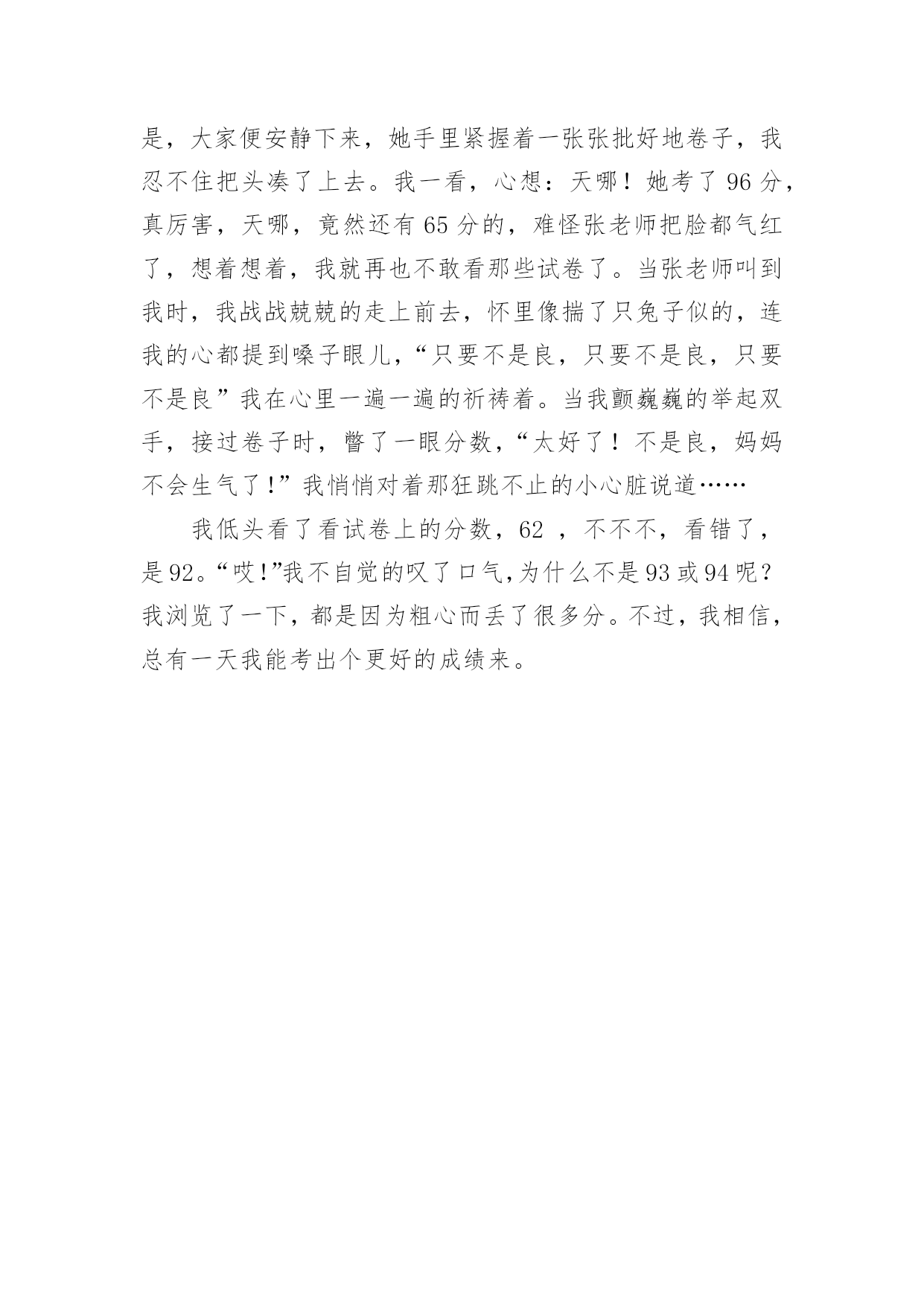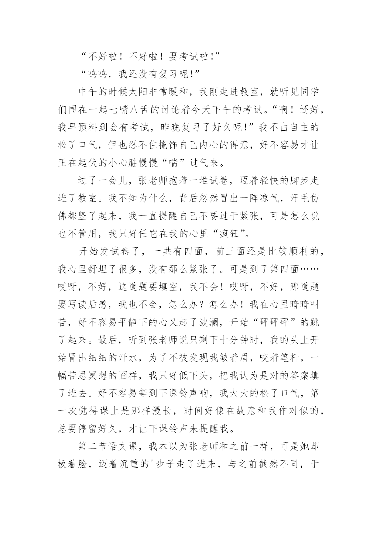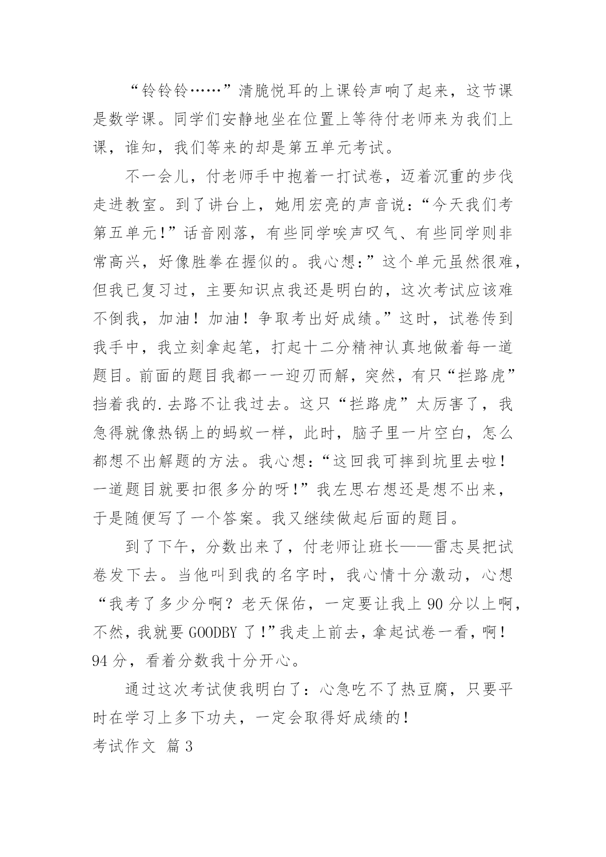 考试作文考试作文(经典3篇)无论在学习、工作或是生活中,大家总少不了接触作文吧,作文可分为小学作文、中学作文、大学作文(论文)。那么一般作文是怎么写的呢?下面是小编为大家整理的考试作文3篇,仅供参考,欢迎大家阅读。考试作文篇1时间过得可真快啊,又到了令小孩心惊肉跳的期中考试了。以前的作业就已经很多了,现在就更多了。期中考试的前一晚,各位老师都来告诉我们考试要仔细、写完后要检查什么的。还把桌椅重新排了一下。终于到了令人期盼已久的期中考试就是今天了,一张张试卷被监考老师发到了我们的手上。所有的同学都仔细地看着试卷,我一看,眉毛都缩紧了,这么难。我只能拿起笔一题一题的'仔细地写。放假了,我都没有下去玩,而是在家里想着我会开几分。可算是等到了发试卷。听着老师马上就要读出我的名字了,我的心像马上就要跳出来似的。我的分数终于知道了,原来两个都是八十多分。我想回去肯定要挨爸爸妈妈骂了,果然,爸爸妈妈一看到我就开始骂我了。虽然这一次考得不好,但我想下一次也许就能考好,觉对不能放弃,要继续努力。考试作文篇2“铃铃铃……”清脆悦耳的上课铃声响了起来,这节课是数学课。同学们安静地坐在位置上等待付老师来为我们上课,谁知,我们等来的却是第五单元考试。不一会儿,付老师手中抱着一打试卷,迈着沉重的步伐走进教室。到了讲台上,她用宏亮的声音说:“今天我们考第五单元!”话音刚落,有些同学唉声叹气、有些同学则非常高兴,好像胜拳在握似的。我心想:”这个单元虽然很难,但我已复习过,主要知识点我还是明白的,这次考试应该难不倒我,加油!加油!争取考出好成绩。”这时,试卷传到我手中,我立刻拿起笔,打起十二分精神认真地做着每一道题目。前面的题目我都一一迎刃而解,突然,有只“拦路虎”挡着我的.去路不让我过去。这只“拦路虎”太厉害了,我急得就像热锅上的蚂蚁一样,此时,脑子里一片空白,怎么都想不出解题的方法。我心想:“这回我可摔到坑里去啦!一道题目就要扣很多分的呀!”我左思右想还是想不出来,于是随便写了一个答案。我又继续做起后面的题目。到了下午,分数出来了,付老师让班长——雷志昊把试卷发下去。当他叫到我的名字时,我心情十分激动,心想“我考了多少分啊?老天保佑,一定要让我上90分以上啊,不然,我就要GOODBY了!”我走上前去,拿起试卷一看,啊!94分,看着分数我十分开心。通过这次考试使我明白了:心急吃不了热豆腐,只要平时在学习上多下功夫,一定会取得好成绩的!考试作文篇3“不好啦!不好啦!要考试啦!”“呜呜,我还没有复习呢!”中午的时候太阳非常暖和,我刚走进教室,就听见同学们围在一起七嘴八舌的讨论着今天下午的考试。“啊!还好,我早预料到会有考试,昨晚复习了好久呢!”我不由自主的松了口气,但也忍不住掩饰自己内心的得意,好不容易才让正在起伏的小心脏慢慢“喘”过气来。过了一会儿,张老师抱着一堆试卷,迈着轻快的脚步走进了教室。我不知为什么,背后忽然冒出一阵凉气,汗毛仿佛都竖了起来,我一直提醒自己不要过于紧张,可是怎么说也不管用,我只好任它在我的心里“疯狂”。开始发试卷了,一共有四面,前三面还是比较顺利的,我心里舒坦了很多,没有那么紧张了。可是到了第四面……哎呀,不好,这道题要填空,我不会!哎呀,不好,那道题要写读后感,我也不会,怎么办?怎么办!我在心里暗暗叫苦,好不容易平静下的心又起了波澜,开始“砰砰砰”的跳了起来。最后,听到张老师说只剩下十分钟时,我的头上开始冒出细细的汗水,为了不被发现我皱着眉,咬着笔杆,一幅苦思冥想的囧样,我只好低下头,把我认为是对的答案填了进去。好不容易等到下课铃声响,我大大的松了口气,第一次觉得课上是那样漫长,时间好像在故意和我作对似的,总要停留好久,才让下课铃声来提醒我。第二节语文课,我本以为张老师和之前一样,可是她却板着脸,迈着沉重的'步子走了进来,与之前截然不同,于是,大家便安静下来,她手里紧握着一张张批好地卷子,我忍不住把头凑了上去。我一看,心想:天哪!她考了96分,真厉害,天哪,竟然还有65分的,难怪张老师把脸都气红了,想着想着,我就再也不敢看那些试卷了。当张老师叫到我时,我战战兢兢的走上前去,怀里像揣了只兔子似的,连我的心都提到嗓子眼儿,“只要不是良,只要不是良,只要不是良”我在心里一遍一遍的祈祷着。当我颤巍巍的举起双手,接过卷子时,瞥了一眼分数,“太好了!不是良,妈妈不会生气了!”我悄悄对着那狂跳不止的小心脏说道……我低头看了看试卷上的分数,62,不不不,看错了,是92。“哎!”我不自觉的叹了口气,为什么不是93或94呢?我浏览了一下,都是因为粗心而丢了很多分。不过,我相信,总有一天我能考出个更好的成绩来。