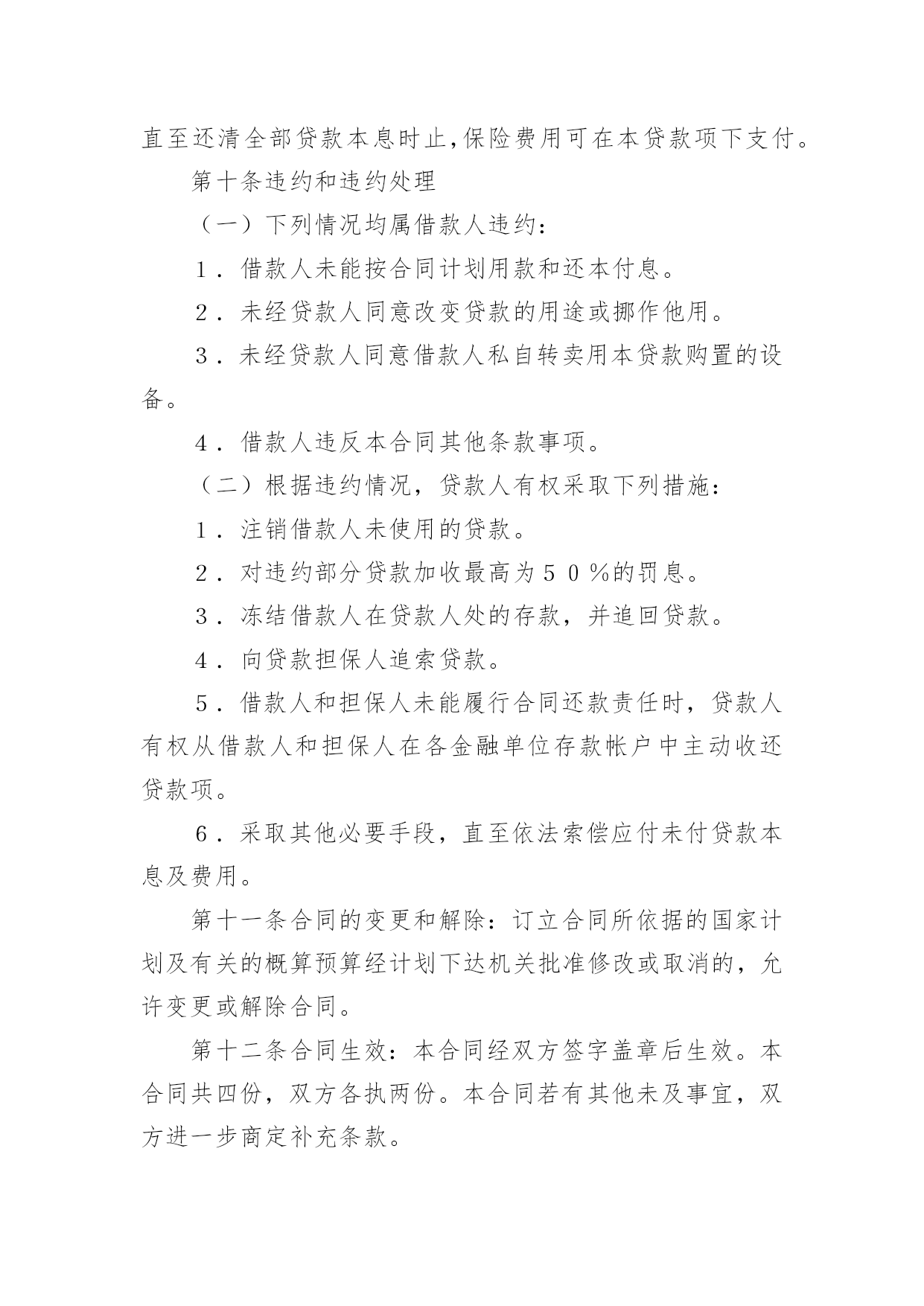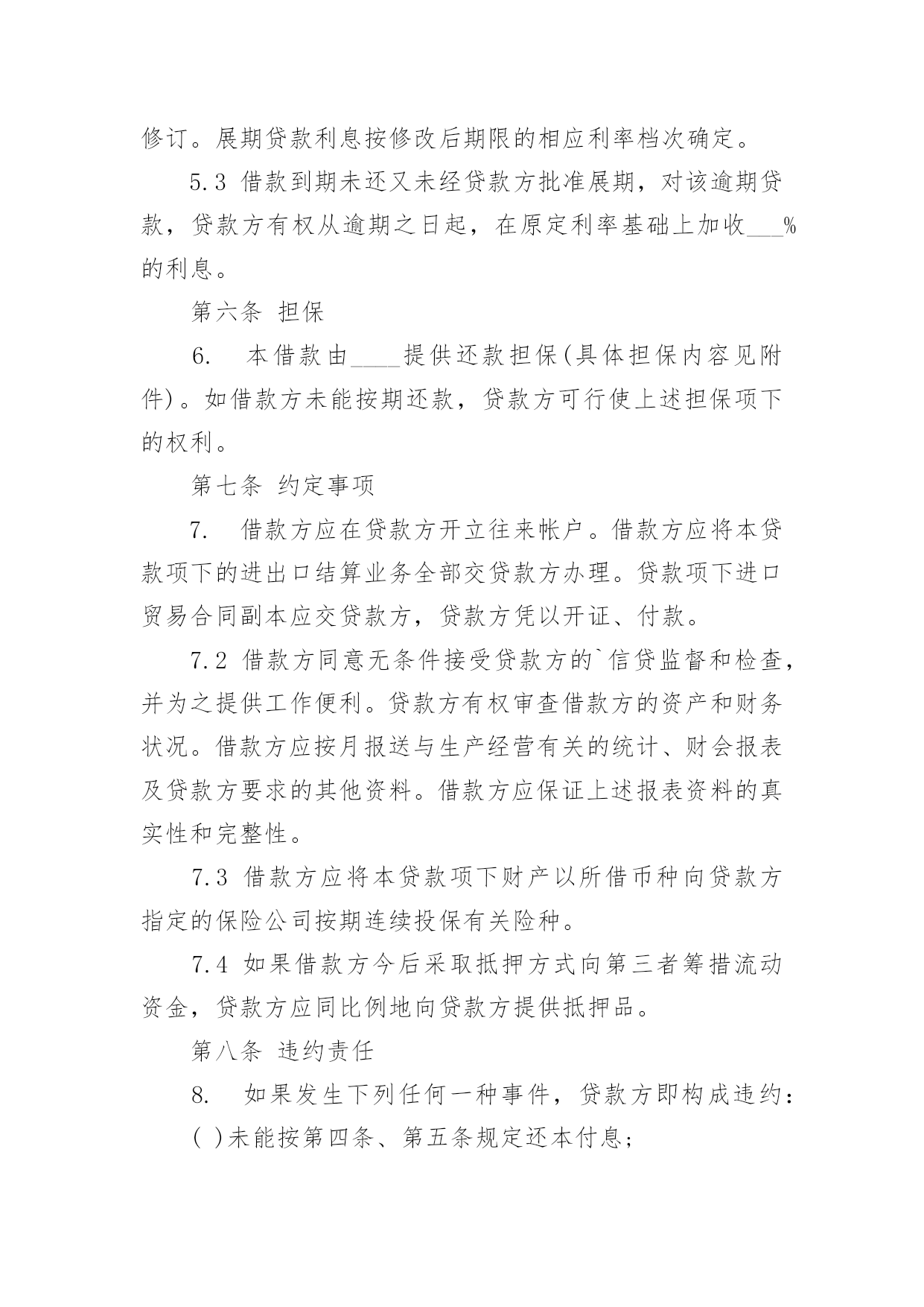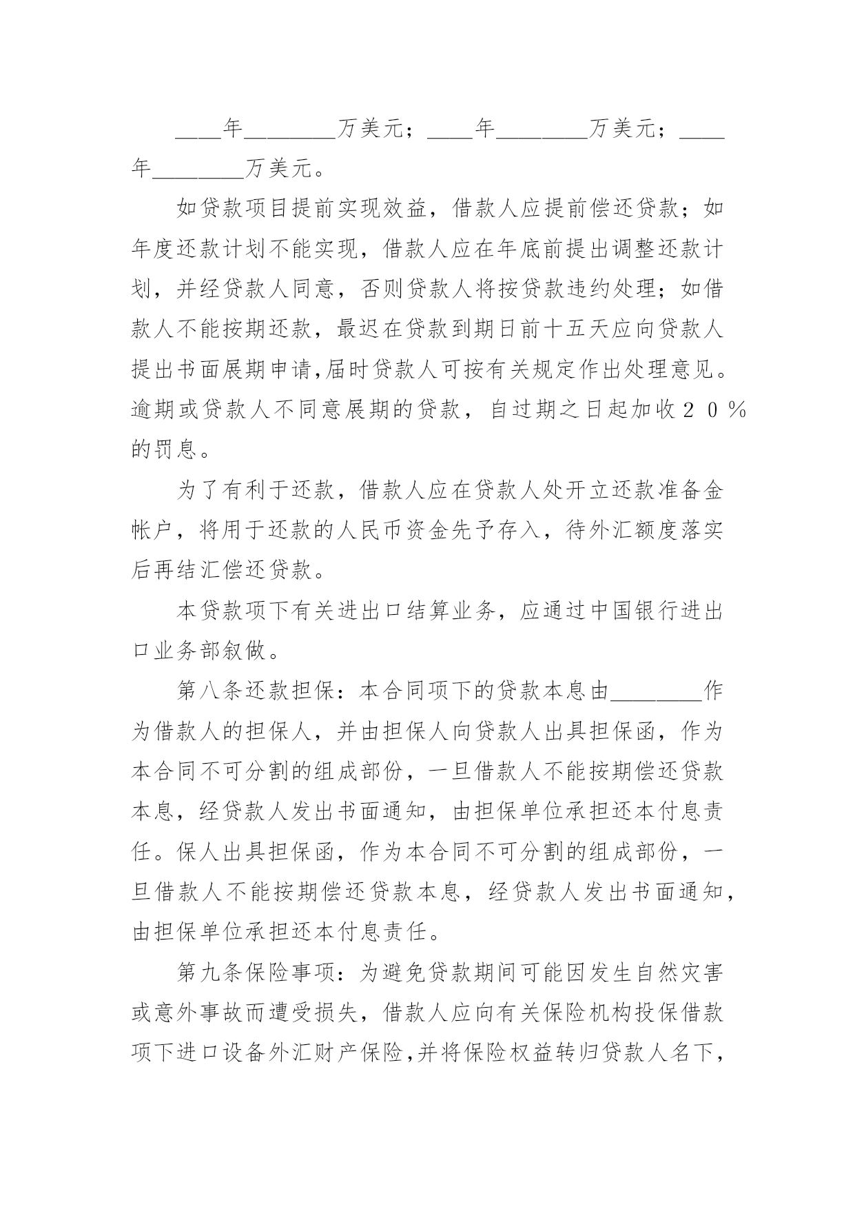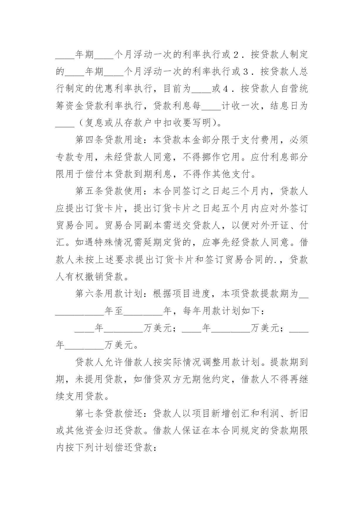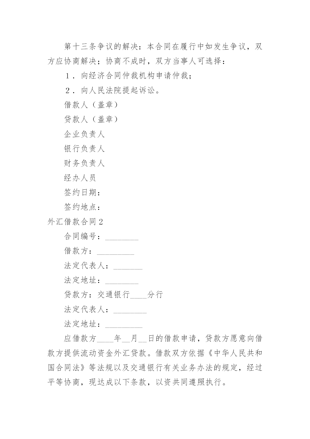 外汇借款合同(热)外汇借款合同随着法律法规不断完善,人们越发重视合同,合同的地位越来越不容忽视,合同是对双方的保障又是一种约束。那么合同要怎么拟定?想必这让大家都很苦恼吧,以下是小编为大家收集的外汇借款合同,仅供参考,希望能够帮助到大家。外汇借款合同1贷款帐号:借款人:贷款人:根据号文批准的引进项目,所需资金经借款人申请,贷款人审查同意发放外汇贷款。双方同意遵照国务院颁发的《借款合同条例》的规定签订本合同,并共同遵守。第一条贷款金额:万美元(或其他等值外币),包括应付利息万美元。第二条贷款期限:年,自第一笔用汇之日起还清全部贷款本息日止。第三条贷款利率及计收方法:1.按贷款人总行制定的__年期__个月浮动一次的利率执行或2.按贷款人制定的__年期__个月浮动一次的利率执行或3.按贷款人总行制定的优惠利率执行,目前为__或4.按贷款人自营统筹资金贷款利率执行,贷款利息每__计收一次,结息日为__(复息或从存款户中扣收要写明)。第四条贷款用途:本贷款本金部分限于支付费用,必须专款专用,未经贷款人同意,不得挪作它用。应付利息部分限用于偿付本贷款到期利息,不得作其他支付。第五条贷款使用:本合同签订之日起三个月内,贷款人应提出订货卡片,提出订货卡片之日起五个月内应对外签订贸易合同。贸易合同副本需送交贷款人,以便对外开证、付汇。如遇特殊情况需延期定货的,应事先经贷款人同意。借款人未按上述要求提出订货卡片和签订贸易合同的.,贷款人有权撤销贷款。第六条用款计划:根据项目进度,本项贷款提款期为______年至____年,每年用款计划如下:__年____万美元;__年____万美元;__年____万美元。贷款人允许借款人按实际情况调整用款计划。提款期到期,未提用贷款,如借贷双方无期他约定,借款人不得再继续支用贷款。第七条贷款偿还:贷款人以项目新增创汇和利润、折旧或其他资金归还贷款。借款人保证在本合同规定的贷款期限内按下列计划偿还贷款:__年____万美元;__年____万美元;__年____万美元。如贷款项目提前实现效益,借款人应提前偿还贷款;如年度还款计划不能实现,借款人应在年底前提出调整还款计划,并经贷款人同意,否则贷款人将按贷款违约处理;如借款人不能按期还款,最迟在贷款到期日前十五天应向贷款人提出书面展期申请,届时贷款人可按有关规定作出处理意见。逾期或贷款人不同意展期的贷款,自过期之日起加收20%的罚息。为了有利于还款,借款人应在贷款人处开立还款准备金帐户,将用于还款的人民币资金先予存入,待外汇额度落实后再结汇偿还贷款。本贷款项下有关进出口结算业务,应通过中国银行进出口业务部叙做。第八条还款担保:本合同项下的贷款本息由____作为借款人的担保人,并由担保人向贷款人出具担保函,作为本合同不可分割的组成部份,一旦借款人不能按期偿还贷款本息,经贷款人发出书面通知,由担保单位承担还本付息责任。保人出具担保函,作为本合同不可分割的组成部份,一旦借款人不能按期偿还贷款本息,经贷款人发出书面通知,由担保单位承担还本付息责任。第九条保险事项:为避免贷款期间可能因发生自然灾害或意外事故而遭受损失,借款人应向有关保险机构投保借款项下进口设备外汇财产保险,并将保险权益转归贷款人名下,直至还清全部贷款本息时止,保险费用可在本贷款项下支付。第十条违约和违约处理(一)下列情况均属借款人违约:1.借款人未能按合同计划用款和还本付息。2.未经贷款人同意改变贷款的用途或挪作他用。3.未经贷款人同意借款人私自转卖用本贷款购置的设备。4.借款人违反本合同其他条款事项。(二)根据违约情况,贷款人有权采取下列措施:1.注销借款人未使用的贷款。2.对违约部分贷款加收最高为50%的罚息。3.冻结借款人在贷款人处的存款,并追回贷款。4.向贷款担保人追索贷款。5.借款人和担保人未能履行合同还款责任时,贷款人有权从借款人和担保人在各金融单位存款帐户中主动收还贷款项。6.采取其他必要手段,直至依法索偿应付未付贷款本息及费用。第十一条合同的变更和解除:订立合同所依据的国家计划及有关的概算预算经计划下达机关批准修改或取消的,允许变更或解除合同。第十二条合同生效:本合同经双方签字盖章后生效。本合同共四份,双方各执两份。本合同若有其他未及事宜,双方进一步商定补充条款。第十三条争议的解决:本合同在履行中如发生争议,双方应协商解决;协商不成时,双方当事人可选择:1.向经济合同仲裁机构申请仲裁;2.向人民法院提起诉讼。借款人(盖章)贷款人(盖章)企业负责人银行负责人财务负责人经办人员签约日期:签约地点:外汇借款合同2合同编号:________借款方:_________法定代表人:_______法定地址:________贷款方:交通银行____分行法定代表人:________法定地址:_________应