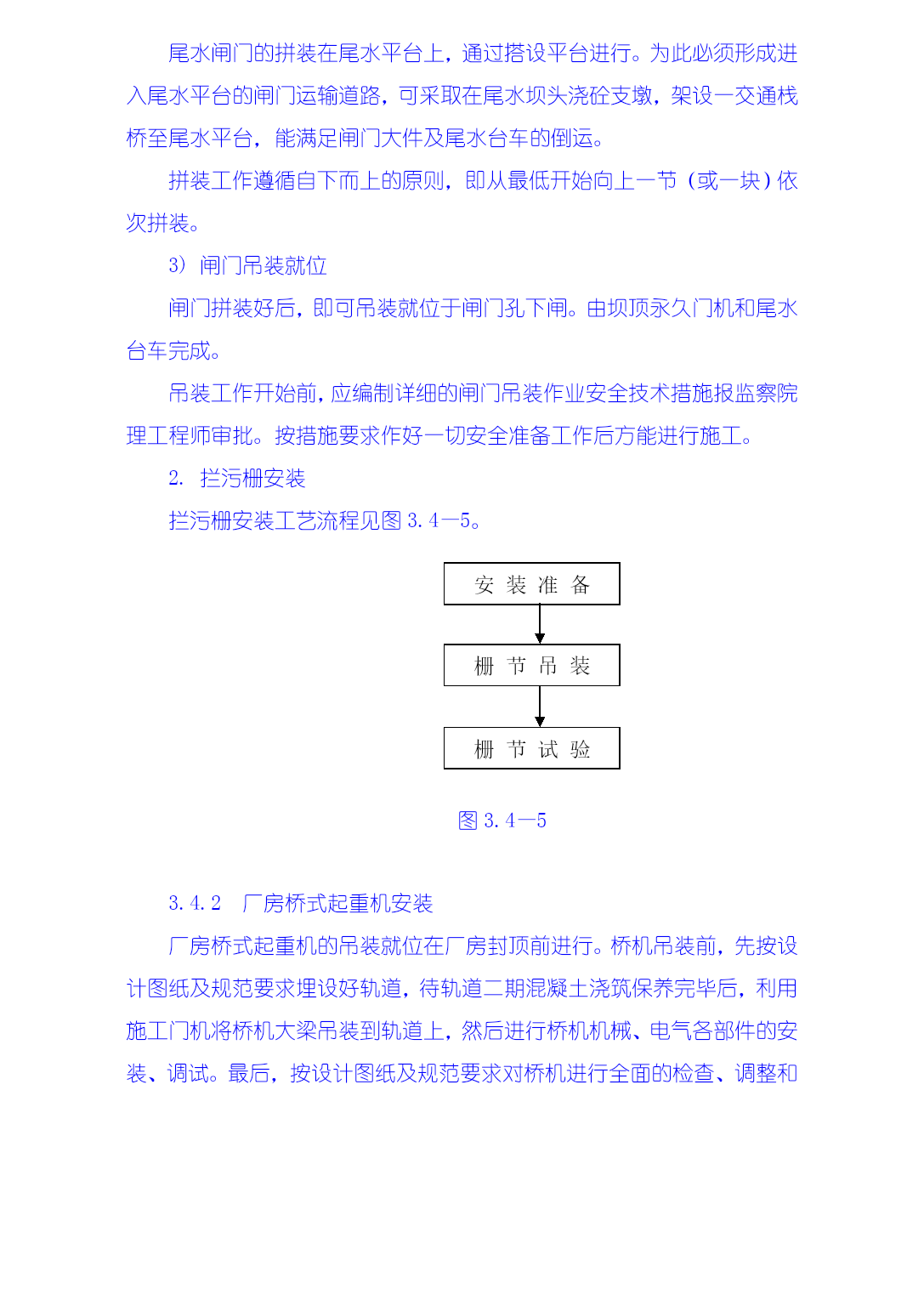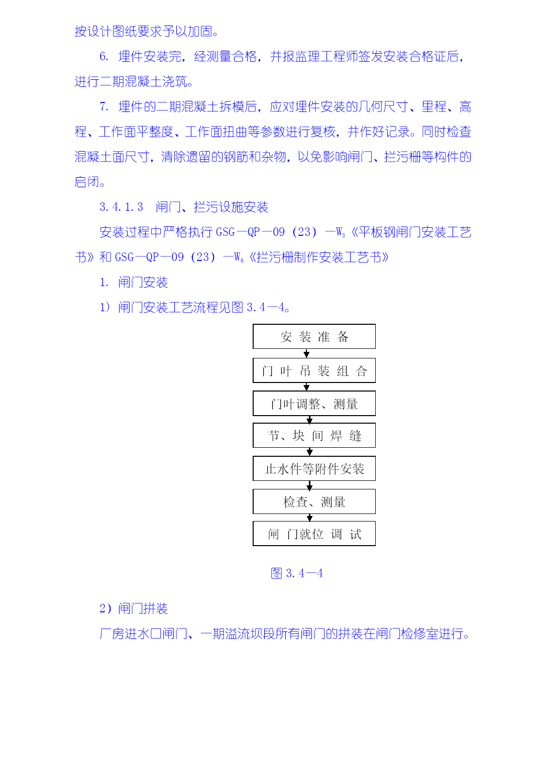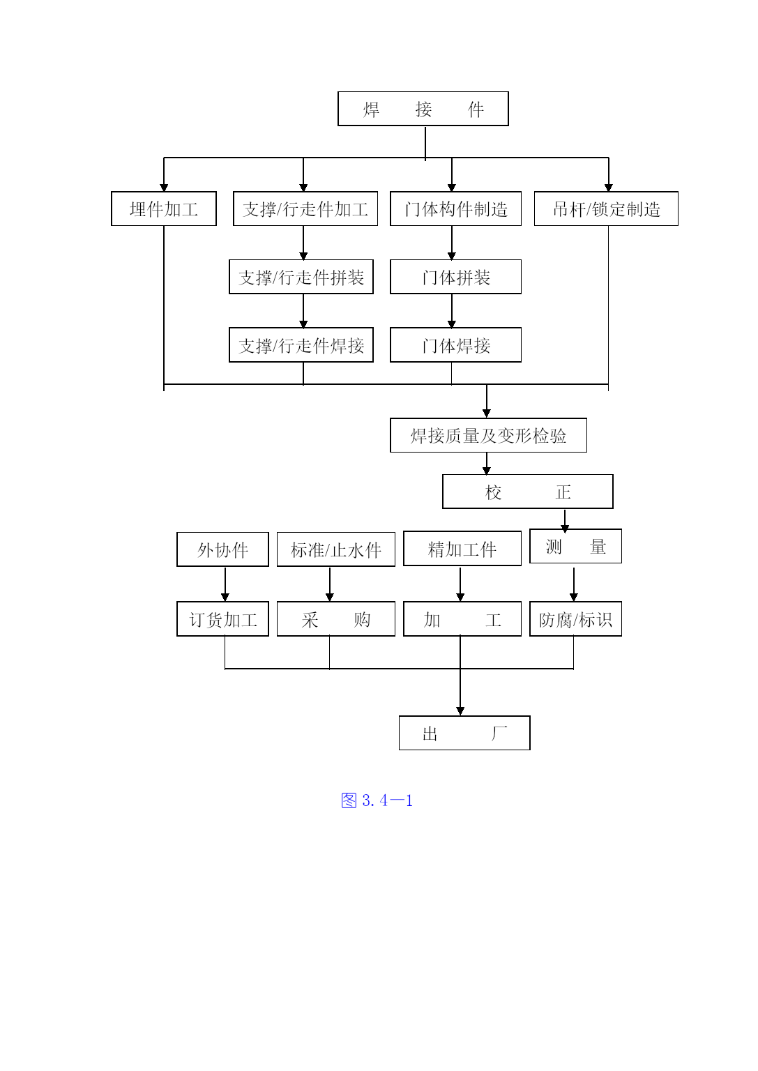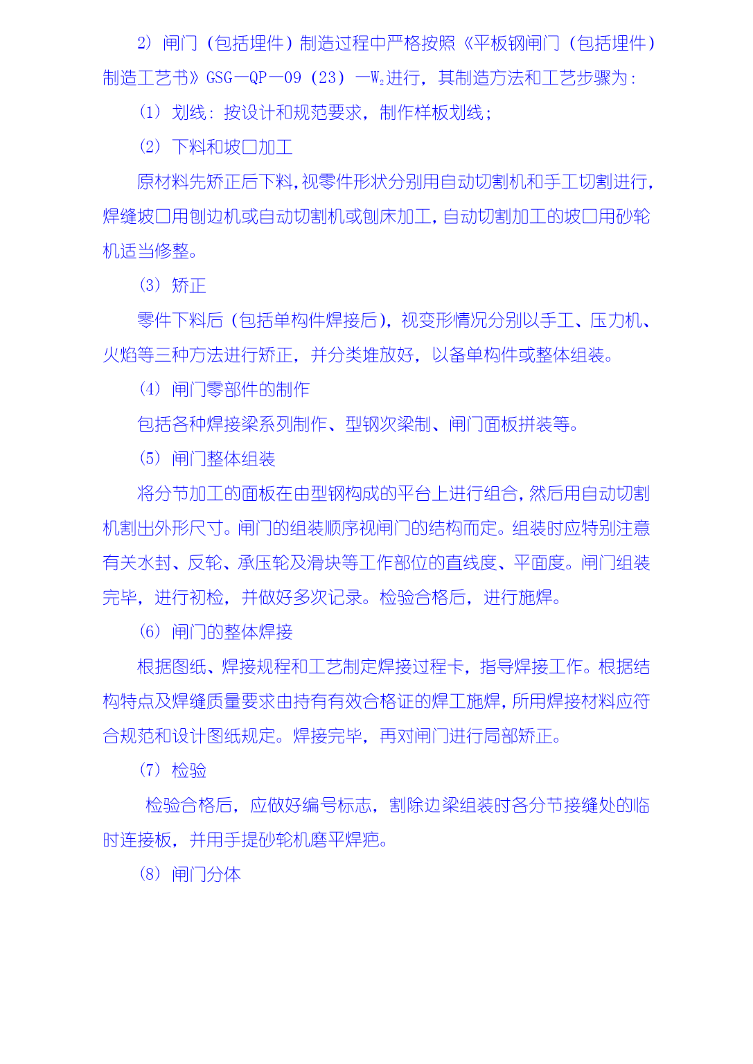3.4金属结构制安及机组安装工程技术措施本工程施工项目包括厂房桥式起重机安装,厂房拦污栅、进、尾水闸门及轨道制安,排漂孔、1#~5#溢流孔闸门及轨道制安,厂房机组安装、调试等。3.4.1金属结构工程施工技术措施大埔水电站金属结构包括溢流坝、厂房两部分的闸门和拦污栅。金属结构制造安装由我局拥有大型金属结构制造许可证的水工机械修造厂承担,制造场地位于电站枢纽右岸上游约3Km处的广西水电工程局水工机械修造厂大埔基地。闸门及拦污栅等大型构件应分块设计制造,单块最重不超过30t、最大运输尺寸符合交通部门的有关规定,工地装卸车主要以50t汽车吊为起吊手段,运输则主要为平板货车。现场安装时主要以30/10t施工门机、坝顶永久门机、尾水台车等为吊装手段。本工程金属结构施工严格遵照GB50205-95《钢结构工程施工及验收规范》、DL/T5018-94《水利水电工程钢闸门制造安装及验收规范》等相关技术标准和设计图纸要求进行,执行我局质量体系程序文件:《金属结构制作安装过程控制程序》GSG—QP—09(23)和《钢结构制安焊接工艺书》GSG—QP—09(23)—W1。3.4.1.1金属结构制造1生产前准备1)焊接工艺评定试验(1)焊接工艺评定试验在监理工程师现场监督下进行。(2)所用的试板及焊接材料应是经检验合格的母材及焊接材料。(3)作如下工艺试验。①对拦污排的钢管杆件式栅和拦污排的浮筒制造作如下四种工艺试验。a.纵缝平接焊缝。b.环向平接焊缝。c.环向贴角焊缝、焊接垫板及防渗圈。d.自动焊接工艺的手工补焊,焊接纵、横、平接焊缝。②对其他构件的制造作如下三种工艺试验:a.板状对接焊缝。b.角形焊缝及板材组合焊缝。c.自动焊接工艺的手工补焊,焊接对接焊缝、角焊缝。(4)试板尺寸按规范或设计要求。(5)按已制定好的焊接工艺对试板进行焊接。(6)按设计要求及规范要求裁切试板,做好标记,送试验所进行机械性能试验。(7)将试验结果报请监理工程师审批。(8)据试验制定焊接规程和焊接工艺。2)对图纸的尺寸及结构工艺性进行审查,制作冷作工艺过程卡、焊接工艺过程卡、机加工工艺品过程卡,作为施工的指导文件。3)确定各部件和组装的模具工装设计、审查。4)确定外协加工及其检查验收方法。5)备料。2.闸门制造闸门制造工艺流程见下图3.4—1。焊接件埋件加工吊杆/锁定制造门体构件制造支撑/行走件加工门体拼装支撑/行走件拼装门体焊接支撑/行走件焊接焊接质量及变形检验校正测量外协件标准/止水件精加工件防腐/标识加工采购订货加工出厂图3.4—12)闸门(包括埋件)制造过程中严格按照《平板钢闸门(包括埋件)制造工艺书》GSG—QP—09(23)—W2进行,其制造方法和工艺步骤为:(1)划线:按设计和规范要求,制作样板划线;(2)下料和坡口加工原材料先矫正后下料,视零件形状分别用自动切割机和手工切割进行,焊缝坡口用刨边机或自动切割机或刨床加工,自动切割加工的坡口用砂轮机适当修整。(3)矫正零件下料后(包括单构件焊接后),视变形情况分别以手工、压力机、火焰等三种方法进行矫正,并分类堆放好,以备单构件或整体组装。(4)闸门零部件的制作包括各种焊接梁系列制作、型钢次梁制、闸门面板拼装等。(5)闸门整体组装将分节加工的面板在由型钢构成的平台上进行组合,然后用自动切割机割出外形尺寸。闸门的组装顺序视闸门的结构而定。组装时应特别注意有关水封、反轮、承压轮及滑块等工作部位的直线度、平面度。闸门组装完毕,进行初检,并做好多次记录。检验合格后,进行施焊。(6)闸门的整体焊接根据图纸、焊接规程和工艺制定焊接过程卡,指导焊接工作。根据结构特点及焊缝质量要求由持有有效合格证的焊工施焊,所用焊接材料应符合规范和设计图纸规定。焊接完毕,再对闸门进行局部矫正。(7)检验检验合格后,应做好编号标志,割除边梁组装时各分节接缝处的临时连接板,并用手提砂轮机磨平焊疤。(8)闸门分体按图纸要求和具体结构进行分节分块,以便运输和现场组装。(9)水封座制作定位不需分块的闸门在闸门整体焊接完成并经检验合格后即可进行水封座的制作定位,而需分块的闸门须在闸门分块、整体预组装并经检验合格后才能进行水封座的制作定位。(10)闸门的防腐处理采用喷砂除锈和热喷锌加封闭漆。(11)闸门的铸钢件和锻件制造。(12)机加工件(水封座、反轮架、承压轮、滑块等)加工工艺:按图纸、规范及常规要求进行施工。(13)闸门埋件的制造:冷作工艺按常规进行。即:划线—下料—矫正—组装—焊接—检验。3.拦污栅制造1)拦污栅制造工艺流程见图3.4—2。
