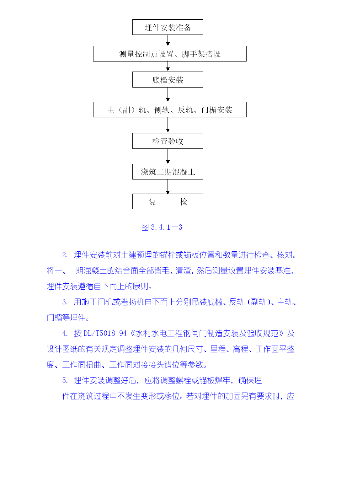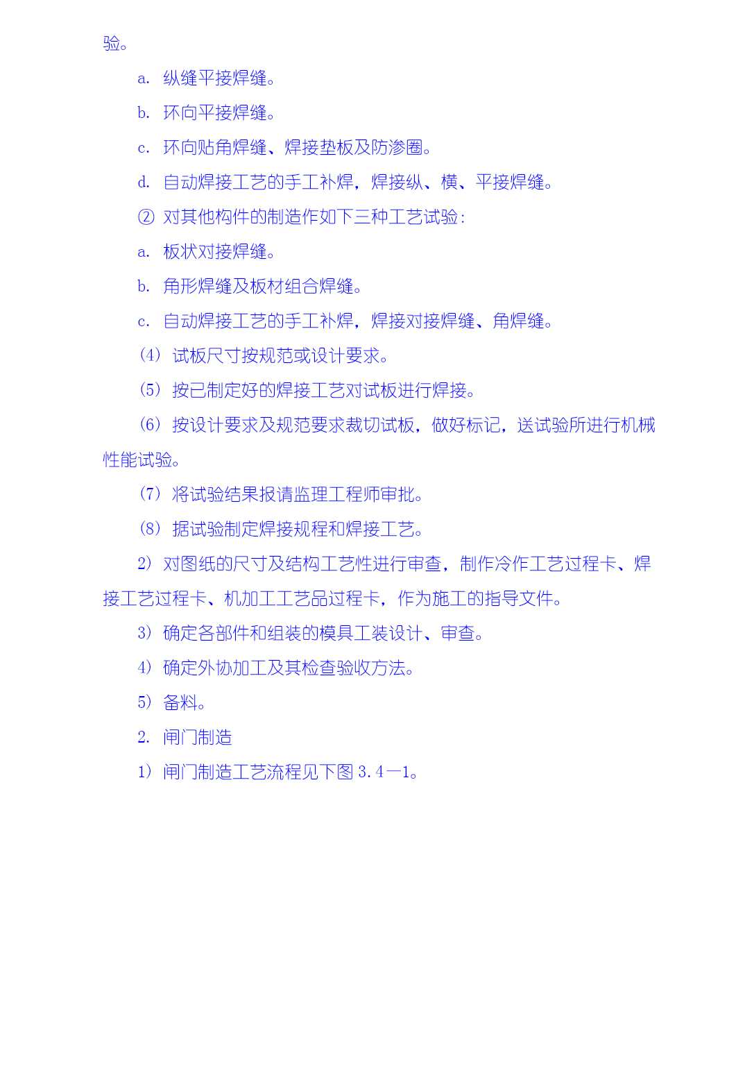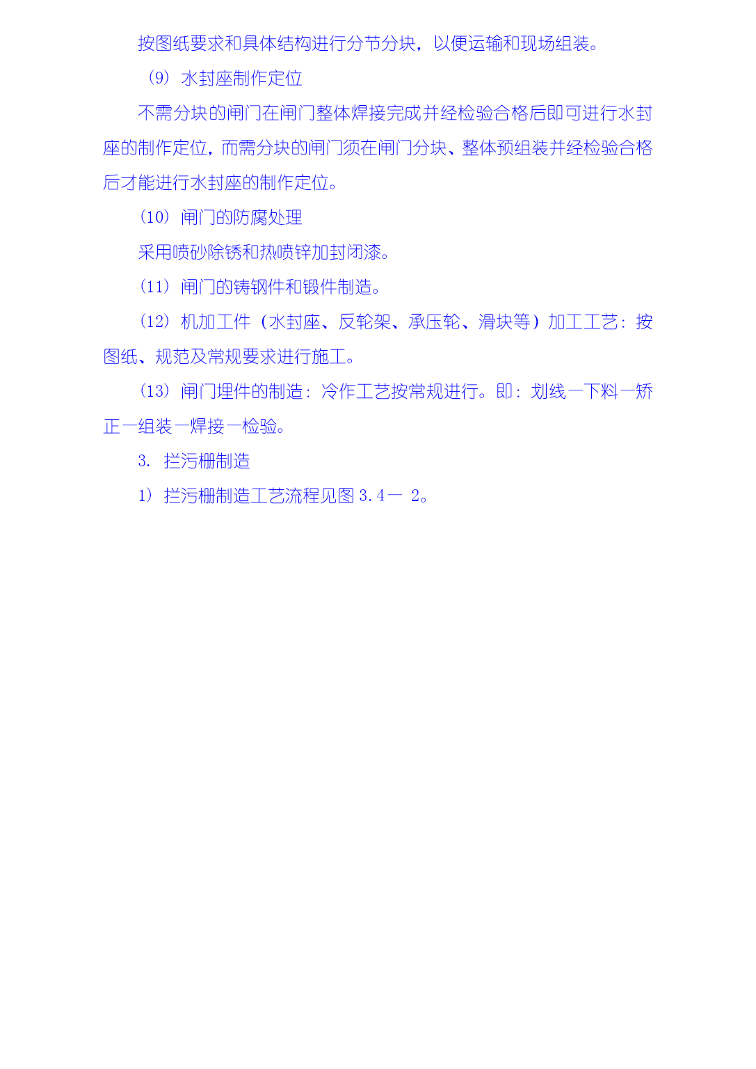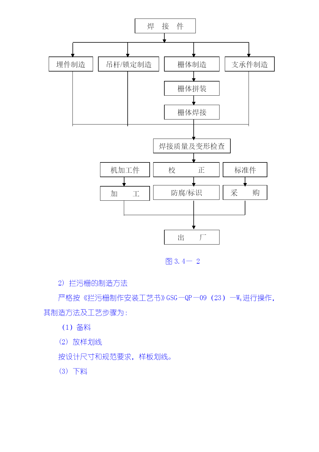 3.4金属结构制安及机组安装工程技术措施本工程施工项目包括厂房桥式起重机安装,厂房拦污栅、进、尾水闸门及轨道制安,排漂孔、1#~5#溢流孔闸门及轨道制安,厂房机组安装、调试等。3.4.1金属结构工程施工技术措施大埔水电站金属结构包括溢流坝、厂房两部分的闸门和拦污栅。金属结构制造安装由我局拥有大型金属结构制造许可证的水工机械修造厂承担,制造场地位于电站枢纽右岸上游约3Km处的广西水电工程局水工机械修造厂大埔基地。闸门及拦污栅等大型构件应分块设计制造,单块最重不超过30t、最大运输尺寸符合交通部门的有关规定,工地装卸车主要以50t汽车吊为起吊手段,运输则主要为平板货车。现场安装时主要以30/10t施工门机、坝顶永久门机、尾水台车等为吊装手段。本工程金属结构施工严格遵照GB50205-95《钢结构工程施工及验收规范》、DL/T5018-94《水利水电工程钢闸门制造安装及验收规范》等相关技术标准和设计图纸要求进行,执行我局质量体系程序文件:《金属结构制作安装过程控制程序》GSG—QP—09(23)和《钢结构制安焊接工艺书》GSG—QP—09(23)—W1。3.4.1.1金属结构制造1生产前准备1)焊接工艺评定试验(1)焊接工艺评定试验在监理工程师现场监督下进行。(2)所用的试板及焊接材料应是经检验合格的母材及焊接材料。(3)作如下工艺试验。①对拦污排的钢管杆件式栅和拦污排的浮筒制造作如下四种工艺试验。a.纵缝平接焊缝。b.环向平接焊缝。c.环向贴角焊缝、焊接垫板及防渗圈。d.自动焊接工艺的手工补焊,焊接纵、横、平接焊缝。②对其他构件的制造作如下三种工艺试验:a.板状对接焊缝。b.角形焊缝及板材组合焊缝。c.自动焊接工艺的手工补焊,焊接对接焊缝、角焊缝。(4)试板尺寸按规范或设计要求。(5)按已制定好的焊接工艺对试板进行焊接。(6)按设计要求及规范要求裁切试板,做好标记,送试验所进行机械性能试验。(7)将试验结果报请监理工程师审批。(8)据试验制定焊接规程和焊接工艺。2)对图纸的尺寸及结构工艺性进行审查,制作冷作工艺过程卡、焊接工艺过程卡、机加工工艺品过程卡,作为施工的指导文件。3)确定各部件和组装的模具工装设计、审查。4)确定外协加工及其检查验收方法。5)备料。2.闸门制造闸门制造工艺流程见下图3.4—1。焊接件埋件加工吊杆/锁定制造门体构件制造支撑/行走件加工门体拼装支撑/行走件拼装门体焊接支撑/行走件焊接焊接质量及变形检验校正测量外协件标准/止水件精加工件防腐/标识加工采购订货加工出厂图3.4—12)闸门(包括埋件)制造过程中严格按照《平板钢闸门(包括埋件)制造工艺书》GSG—QP—09(23)—W2进行,其制造方法和工艺步骤为:(1)划线:按设计和规范要求,制作样板划线;(2)下料和坡口加工原材料先矫正后下料,视零件形状分别用自动切割机和手工切割进行,焊缝坡口用刨边机或自动切割机或刨床加工,自动切割加工的坡口用砂轮机适当修整。(3)矫正零件下料后(包括单构件焊接后),视变形情况分别以手工、压力机、火焰等三种方法进行矫正,并分类堆放好,以备单构件或整体组装。(4)闸门零部件的制作包括各种焊接梁系列制作、型钢次梁制、闸门面板拼装等。(5)闸门整体组装将分节加工的面板在由型钢构成的平台上进行组合,然后用自动切割机割出外形尺寸。闸门的组装顺序视闸门的结构而定。组装时应特别注意有关水封、反轮、承压轮及滑块等工作部位的直线度、平面度。闸门组装完毕,进行初检,并做好多次记录。检验合格后,进行施焊。(6)闸门的整体焊接根据图纸、焊接规程和工艺制定焊接过程卡,指导焊接工作。根据结构特点及焊缝质量要求由持有有效合格证的焊工施焊,所用焊接材料应符合规范和设计图纸规定。焊接完毕,再对闸门进行局部矫正。(7)检验检验合格后,应做好编号标志,割除边梁组装时各分节接缝处的临时连接板,并用手提砂轮机磨平焊疤。(8)闸门分体按图纸要求和具体结构进行分节分块,以便运输和现场组装。(9)水封座制作定位不需分块的闸门在闸门整体焊接完成并经检验合格后即可进行水封座的制作定位,而需分块的闸门须在闸门分块、整体预组装并经检验合格后才能进行水封座的制作定位。(10)闸门的防腐处理采用喷砂除锈和热喷锌加封闭漆。(11)闸门的铸钢件和锻件制造。(12)机加工件(水封座、反轮架、承压轮、滑块等)加工工艺:按图纸、规范及常规要求进行施工。(13)闸门埋件的制造:冷作工艺按常规进行。即:划线—下料—矫正—组装—焊接—检验。3.拦污栅制造1)拦污栅制造工艺流程见图3.4—2。