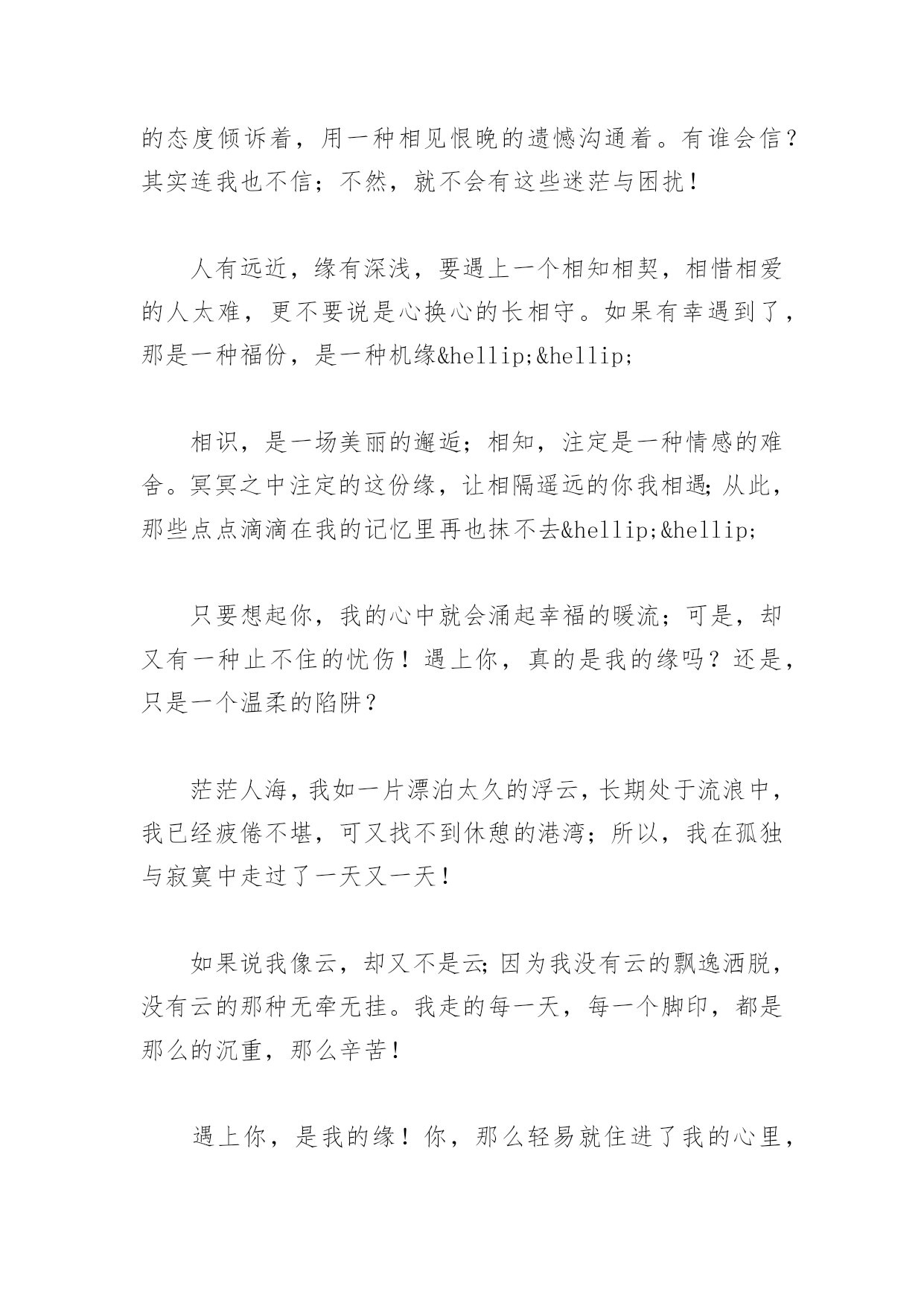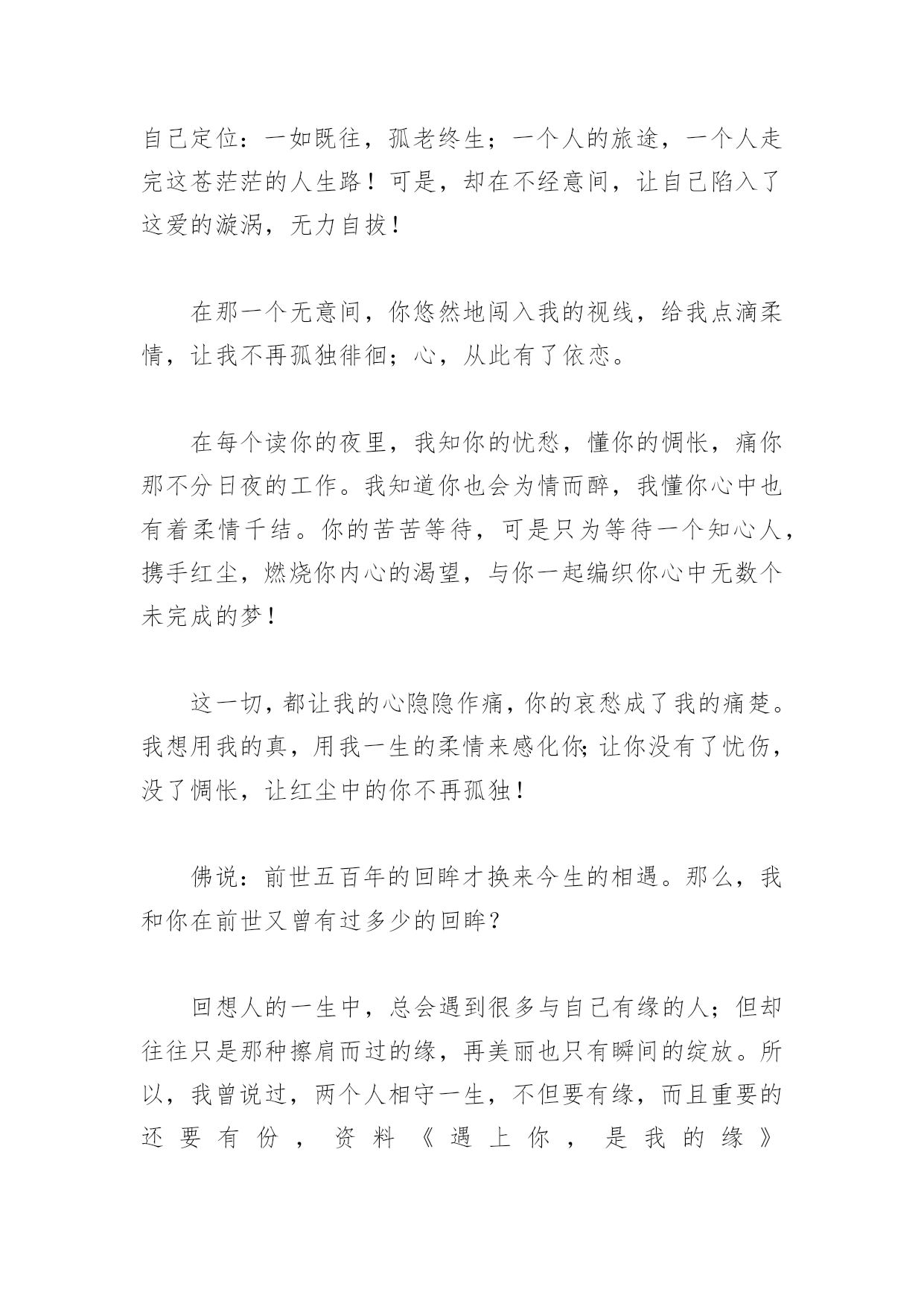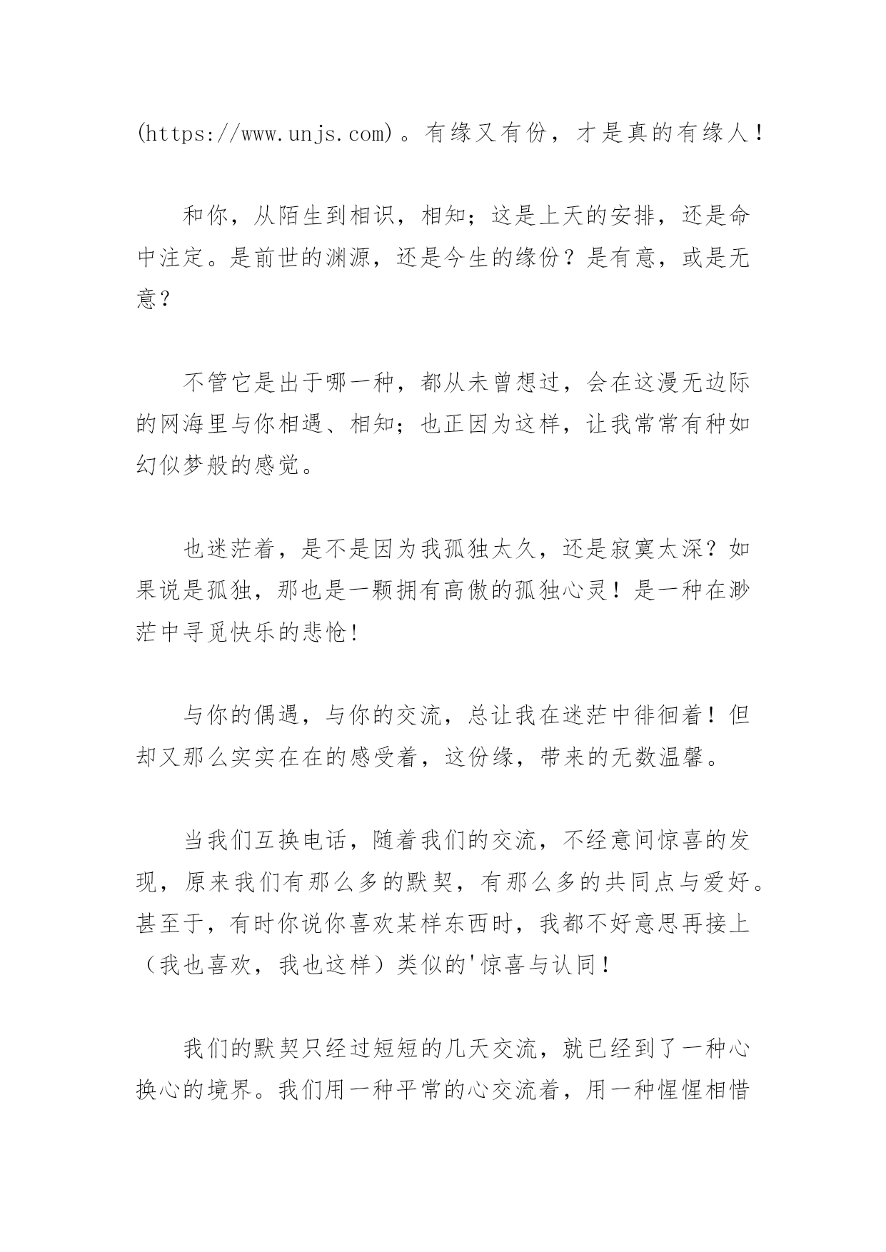 遇上你,是我的缘-资料遇上你,是我的缘-资料 夜已深,心难眠;丝丝细雨,缠缠绵绵!漂泊的心,何处是归宿?多少深情,多少缱绻,遗失红尘中!夜色凄凄,满怀思绪,不知何以诉起!看着窗外朦胧的天地,听着这雨声,遇上你,是我的缘。此刻,我更深刻地体会到李清照的那“怎一个愁字了得”的感慨!在这样的雨夜里,时常也会出现一种幻想:幻想我的小屋里有一个,我深爱的、深爱着我的人,为我点一盏灯,陪我细听这雨声。这该是件多么温馨、幸福的事!听着这首《遇上你是我的缘》,这是一首很美的歌。于今晚,我这样的听着,心中想起了你!同样的,遇上你是否也是我的缘!我的心在那河水里游,蓝天下的相思,是这弯弯的路,我的梦都装在行囊中。一切等待不再是等待,我的一生就选择了你,遇上你是我的缘,守望你是我的歌,亲爱的,亲爱的,亲爱的我爱你,就象山里的雪莲花……曾经有过多少个不眠之夜,憔悴着人生的无奈。曾经给自己定位:一如既往,孤老终生;一个人的旅途,一个人走完这苍茫茫的人生路!可是,却在不经意间,让自己陷入了这爱的漩涡,无力自拔!在那一个无意间,你悠然地闯入我的视线,给我点滴柔情,让我不再孤独徘徊;心,从此有了依恋。在每个读你的夜里,我知你的忧愁,懂你的惆怅,痛你那不分日夜的工作。我知道你也会为情而醉,我懂你心中也有着柔情千结。你的苦苦等待,可是只为等待一个知心人,携手红尘,燃烧你内心的渴望,与你一起编织你心中无数个未完成的梦!这一切,都让我的心隐隐作痛,你的哀愁成了我的痛楚。我想用我的真,用我一生的柔情来感化你;让你没有了忧伤,没了惆怅,让红尘中的你不再孤独!佛说:前世五百年的回眸才换来今生的相遇。那么,我和你在前世又曾有过多少的回眸?回想人的一生中,总会遇到很多与自己有缘的人;但却往往只是那种擦肩而过的缘,再美丽也只有瞬间的绽放。所以,我曾说过,两个人相守一生,不但要有缘,而且重要的还要有份,资料《遇上你,是我的缘》(https://www.unjs.com)。有缘又有份,才是真的有缘人!和你,从陌生到相识,相知;这是上天的安排,还是命中注定。是前世的渊源,还是今生的缘份?是有意,或是无意?不管它是出于哪一种,都从未曾想过,会在这漫无边际的网海里与你相遇、相知;也正因为这样,让我常常有种如幻似梦般的感觉。也迷茫着,是不是因为我孤独太久,还是寂寞太深?如果说是孤独,那也是一颗拥有高傲的孤独心灵!是一种在渺茫中寻觅快乐的悲怆!与你的偶遇,与你的交流,总让我在迷茫中徘徊着!但却又那么实实在在的感受着,这份缘,带来的无数温馨。当我们互换电话,随着我们的交流,不经意间惊喜的发现,原来我们有那么多的默契,有那么多的共同点与爱好。甚至于,有时你说你喜欢某样东西时,我都不好意思再接上(我也喜欢,我也这样)类似的'惊喜与认同!我们的默契只经过短短的几天交流,就已经到了一种心换心的境界。我们用一种平常的心交流着,用一种惺惺相惜的态度倾诉着,用一种相见恨晚的遗憾沟通着。有谁会信?其实连我也不信;不然,就不会有这些迷茫与困扰!人有远近,缘有深浅,要遇上一个相知相契,相惜相爱的人太难,更不要说是心换心的长相守。如果有幸遇到了,那是一种福份,是一种机缘……相识,是一场美丽的邂逅;相知,注定是一种情感的难舍。冥冥之中注定的这份缘,让相隔遥远的你我相遇;从此,那些点点滴滴在我的记忆里再也抹不去……只要想起你,我的心中就会涌起幸福的暖流;可是,却又有一种止不住的忧伤!遇上你,真的是我的缘吗?还是,只是一个温柔的陷阱?茫茫人海,我如一片漂泊太久的浮云,长期处于流浪中,我已经疲倦不堪,可又找不到休憩的港湾;所以,我在孤独与寂寞中走过了一天又一天!如果说我像云,却又不是云;因为我没有云的飘逸洒脱,没有云的那种无牵无挂。我走的每一天,每一个脚印,都是那么的沉重,那么辛苦!遇上你,是我的缘!你,那么轻易就住进了我的心里,你又悄悄地潜入我的梦中,两颗原本陌生的心紧紧相连;难道,你就是我今世的缘份,是我今生最美的相遇!在缘份世界里,我感动这份美丽的邂逅;也许,它是我在劫难逃的缘!于是,我开始守候真诚与善良;同时,我也选择了期待与梦想!从此不再流浪,从此心与心靠航!