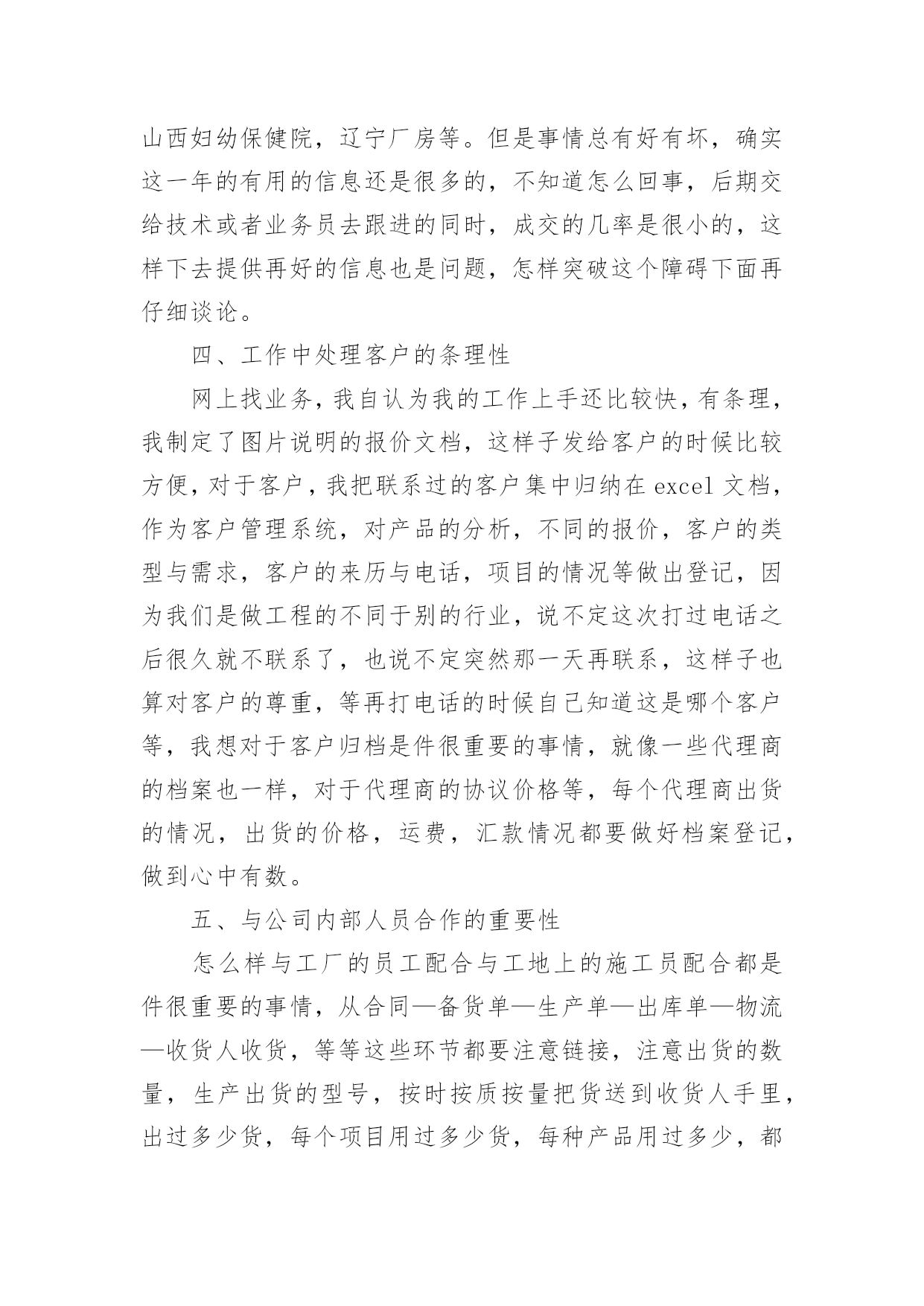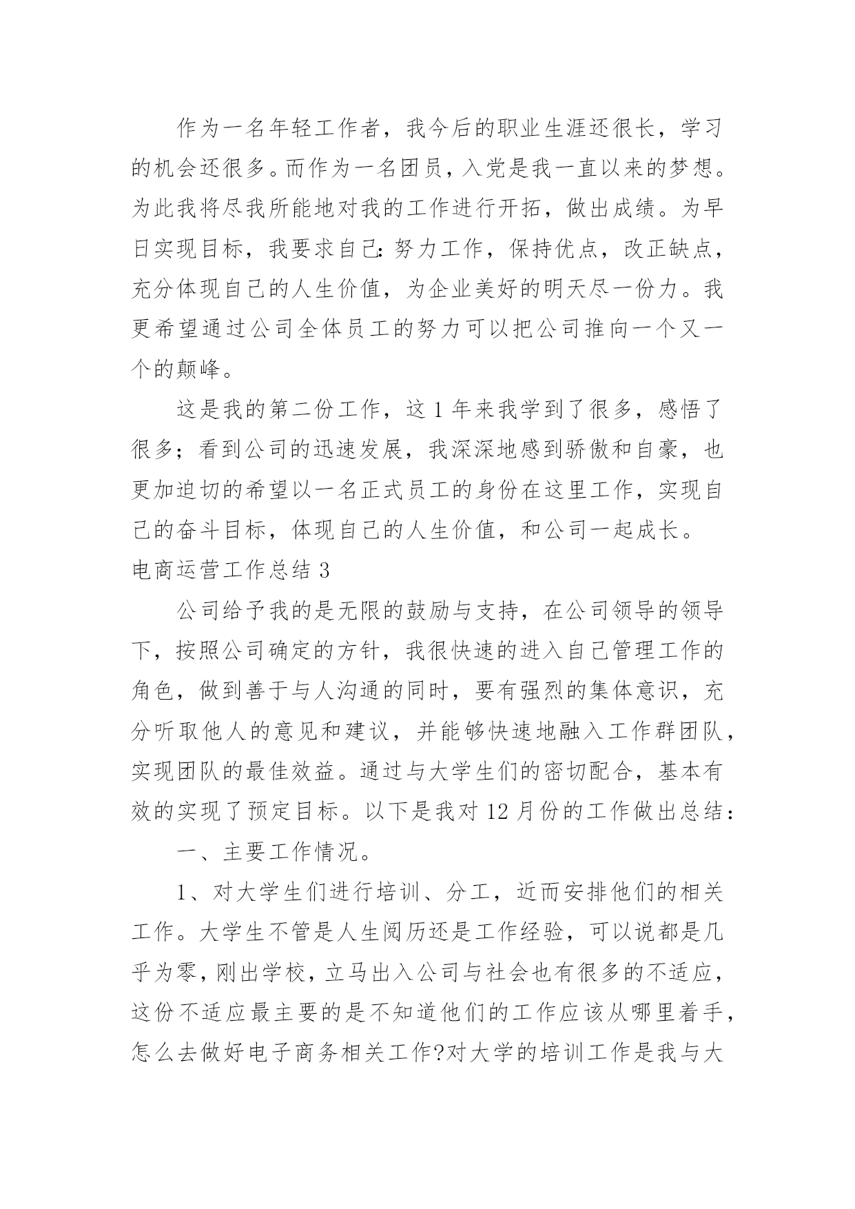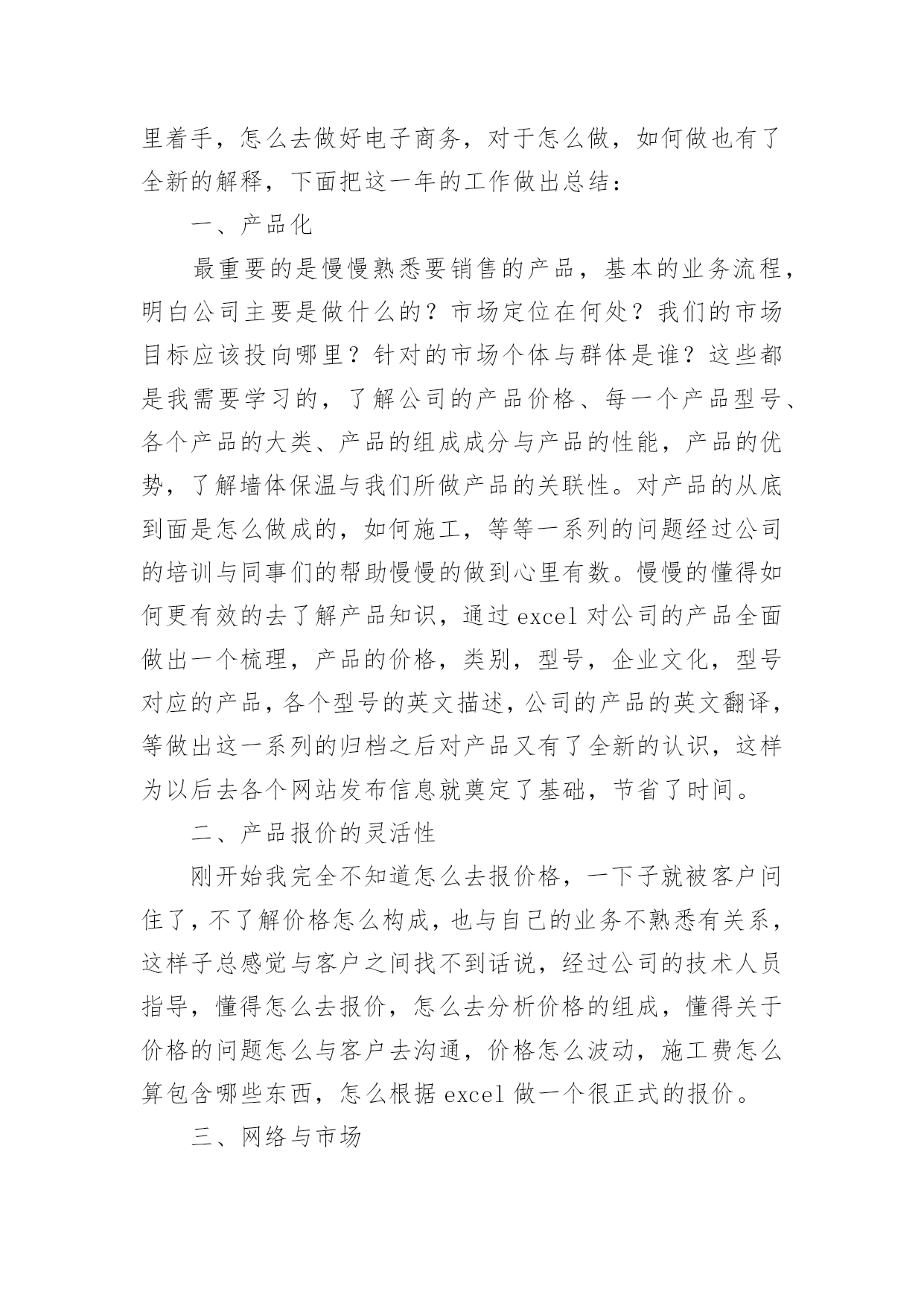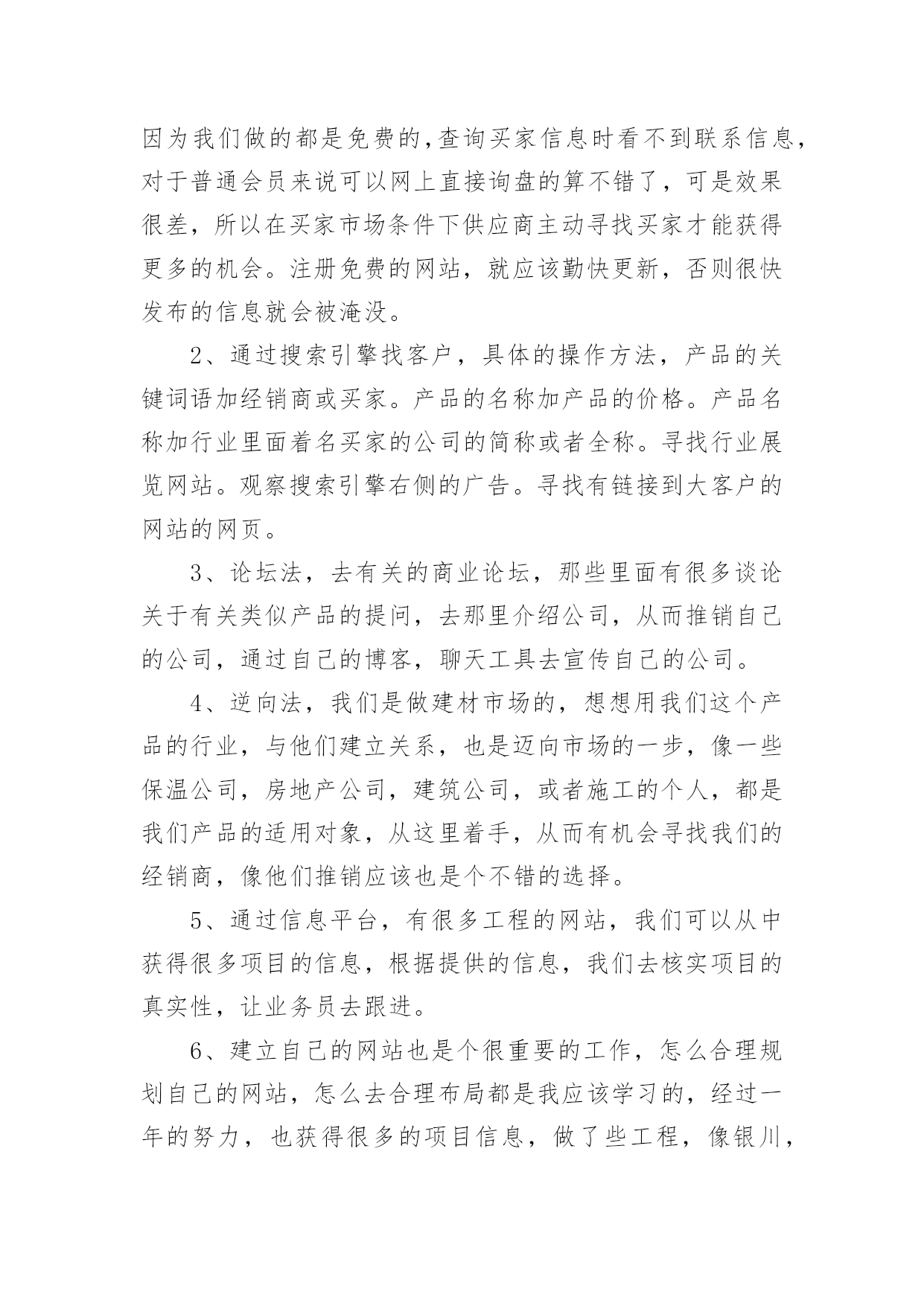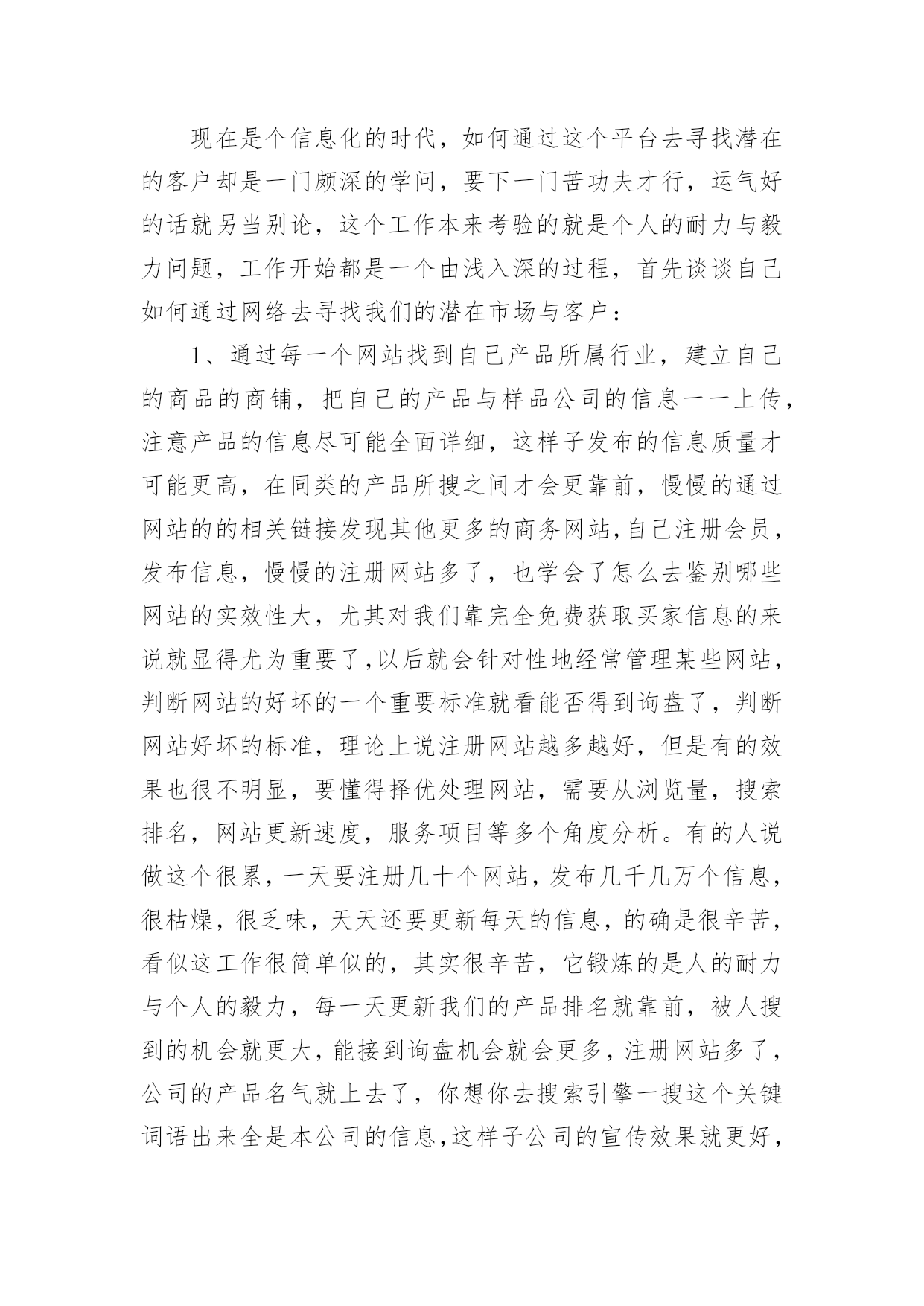 电商运营工作总结电商运营工作总结15篇总结就是把一个时段的学习、工作或其完成情况进行一次全面系统的总结,它能够给人努力工作的动力,让我们来为自己写一份总结吧。我们该怎么写总结呢?下面是小编为大家收集的电商运营工作总结,欢迎阅读与收藏。电商运营工作总结1在繁忙的工作中不知不觉又迎来了新的一年,回顾这一年的工作历程,也让我收获很多,还记得刚刚离开学校步入社会的时候,怀着无比激动与些许忐忑的心情走出我人生的第一步。这一步往往也是最重要的一步,像许多人一样,我们在职场中摸索着前进,让自己充实让自己去学习,没有任何经验的我们比别人更多了一份艰难,但是路往往是自己走出来的,凭着自己对生活的热情与对工作的向往最后成为济南__新型建材有限公司的一名新员工。这一年可能是我步入社会最艰难的一年,因为不管人生阅历与工作经验,可以说我几乎是零,但是公司对我始终不放弃,而是给予更多的鼓励与支持,让我自己学会前进,刚出学校,立马出入公司与社会也有很多的不适应,这份不适应最主要的是不知道自己的工作应该从哪里着手,整天过着令人担忧的生活,但是经过公司对我的帮助慢慢学会了从哪里着手,怎么去做好电子商务,对于怎么做,如何做也有了全新的解释,下面把这一年的工作做出总结:一、产品化最重要的是慢慢熟悉要销售的产品,基本的业务流程,明白公司主要是做什么的?市场定位在何处?我们的市场目标应该投向哪里?针对的市场个体与群体是谁?这些都是我需要学习的,了解公司的产品价格、每一个产品型号、各个产品的大类、产品的组成成分与产品的性能,产品的优势,了解墙体保温与我们所做产品的关联性。对产品的从底到面是怎么做成的,如何施工,等等一系列的问题经过公司的培训与同事们的帮助慢慢的做到心里有数。慢慢的懂得如何更有效的去了解产品知识,通过excel对公司的产品全面做出一个梳理,产品的价格,类别,型号,企业文化,型号对应的产品,各个型号的英文描述,公司的产品的英文翻译,等做出这一系列的归档之后对产品又有了全新的认识,这样为以后去各个网站发布信息就奠定了基础,节省了时间。二、产品报价的灵活性刚开始我完全不知道怎么去报价格,一下子就被客户问住了,不了解价格怎么构成,也与自己的业务不熟悉有关系,这样子总感觉与客户之间找不到话说,经过公司的技术人员指导,懂得怎么去报价,怎么去分析价格的组成,懂得关于价格的问题怎么与客户去沟通,价格怎么波动,施工费怎么算包含哪些东西,怎么根据excel做一个很正式的报价。三、网络与市场现在是个信息化的时代,如何通过这个平台去寻找潜在的客户却是一门颇深的学问,要下一门苦功夫才行,运气好的话就另当别论,这个工作本来考验的就是个人的耐力与毅力问题,工作开始都是一个由浅入深的过程,首先谈谈自己如何通过网络去寻找我们的潜在市场与客户:1、通过每一个网站找到自己产品所属行业,建立自己的商品的商铺,把自己的产品与样品公司的信息一一上传,注意产品的信息尽可能全面详细,这样子发布的信息质量才可能更高,在同类的产品所搜之间才会更靠前,慢慢的通过网站的的相关链接发现其他更多的商务网站,自己注册会员,发布信息,慢慢的注册网站多了,也学会了怎么去鉴别哪些网站的实效性大,尤其对我们靠完全免费获取买家信息的来说就显得尤为重要了,以后就会针对性地经常管理某些网站,判断网站的好坏的一个重要标准就看能否得到询盘了,判断网站好坏的标准,理论上说注册网站越多越好,但是有的效果也很不明显,要懂得择优处理网站,需要从浏览量,搜索排名,网站更新速度,服务项目等多个角度分析。有的人说做这个很累,一天要注册几十个网站,发布几千几万个信息,很枯燥,很乏味,天天还要更新每天的信息,的确是很辛苦,看似这工作很简单似的,其实很辛苦,它锻炼的是人的耐力与个人的毅力,每一天更新我们的产品排名就靠前,被人搜到的机会就更大,能接到询盘机会就会更多,注册网站多了,公司的产品名气就上去了,你想你去搜索引擎一搜这个关键词语出来全是本公司的信息,这样子公司的宣传效果就更好,因为我们做的都是免费的,查询买家信息时看不到联系信息,对于普通会员来说可以网上直接询盘的算不错了,可是效果很差,所以在买家市场条件下供应商主动寻找买家才能获得更多的机会。注册免费的网站,就应该勤快更新,否则很快发布的信息就会被淹没。2、通过搜索引擎找客户,具体的操作方法,产品的关键词语加经销商或买家。产品的名称加产品的价格。产品名称加行业里面着名买家的公司的简称或者全称。寻找行业展览网站。观察搜索引擎右侧的广告。寻找有链接到大客户的网站的网页。3、论坛法,去有关的商业论坛,那些里面有很多谈论关于有关类似产品的提问,去那里介绍公司,从而推销自己的公司,通过自己的博客,聊天工具去宣传自己的公司。4、逆向法,我们是做建材市场的,想想用我们这个产品的行业,与他们建立关系,也是迈向