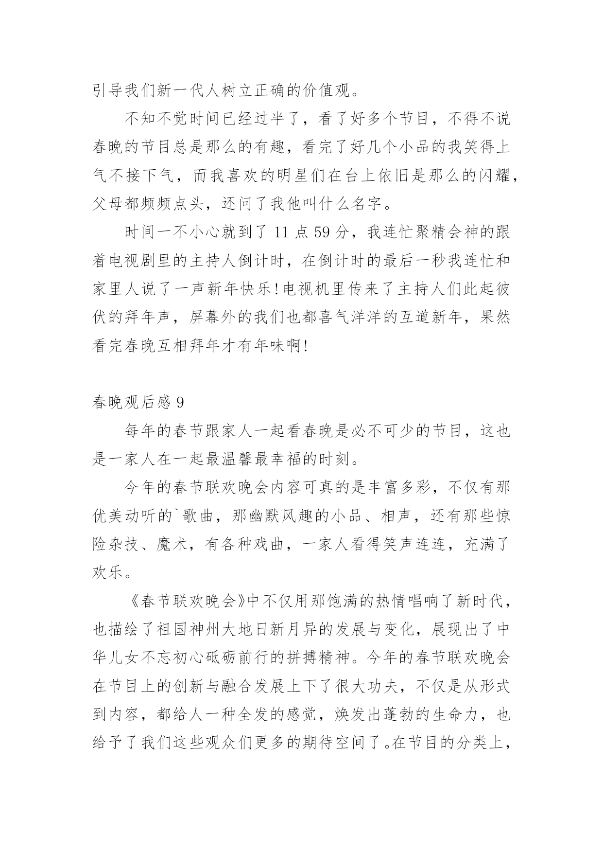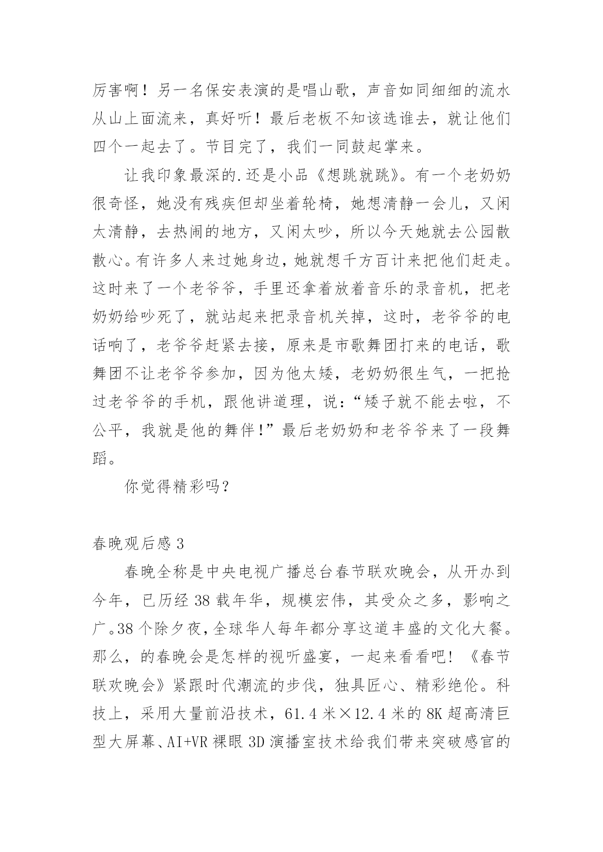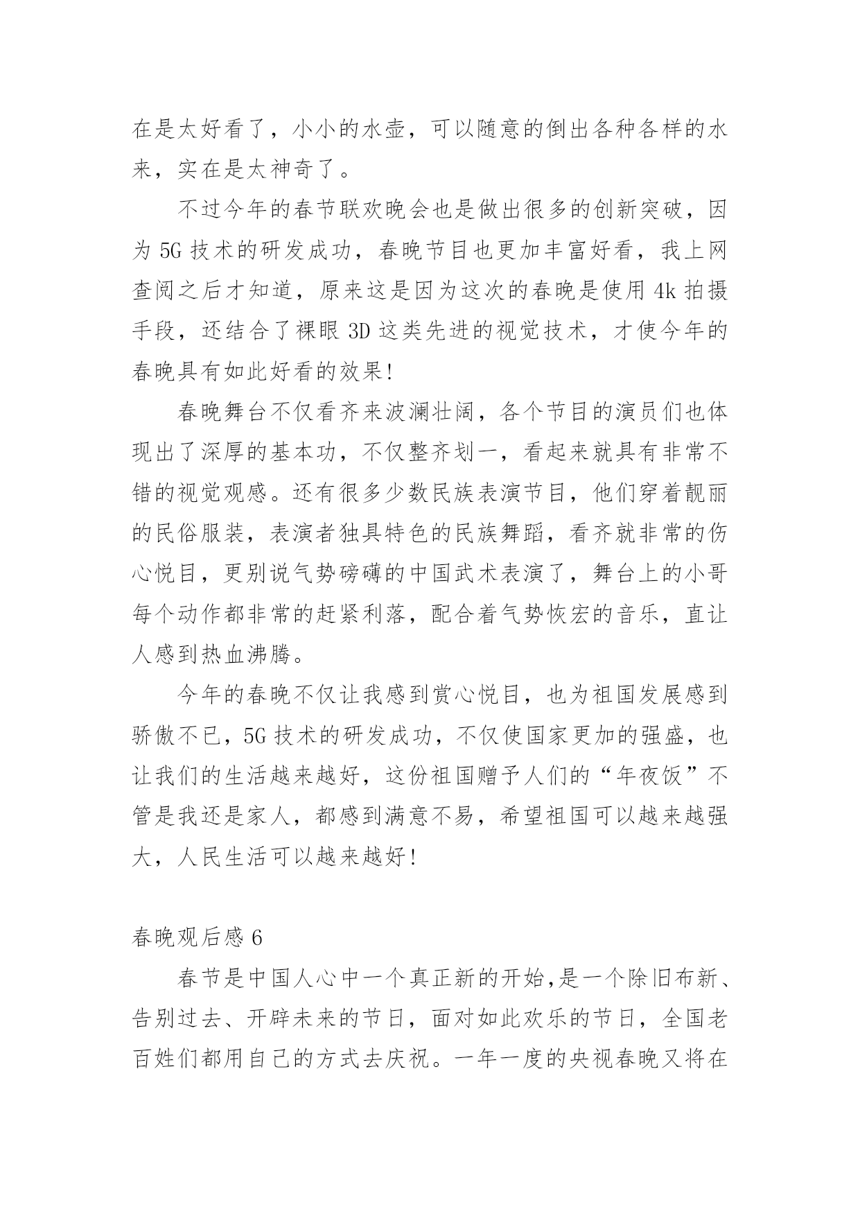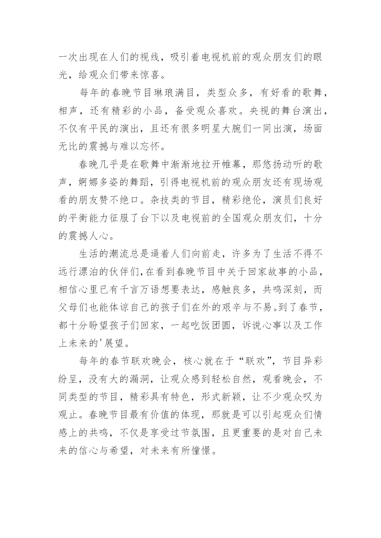 春晚观后感(热)春晚观后感15篇当品味完一部影视作品后,从中我们可以吸收新的思想,观后感的表达方式灵活多样,基本属于议论范畴,但写法不同于一般议论文,因为它必须是在观看后的基础上发感想。观后感你想好怎么写了吗?下面是小编整理的春晚观后感,希望能够帮助到大家。春晚观后感1转眼间我们已经告别特殊的牛年,迎来新一年虎年新春,这不仅让我们激动不已,感慨过得那么快,同时也为的到来而欢欣雀跃。在迎接春节的前一天,也便是除夕,它是中华民族传统团圆夜,这一天我们一家人都开心的聚在一起,互相祝福未来一年能够更加的繁华,同时也不忘打开电视,跟家里人一起看春节联欢晚会,共同迎接虎年的到来。今年的春节晚会举办所谓是特别的隆重,不仅场景宏大,歌曲跟灯光结合的非常的不错,给我们带来一种听觉与视觉的冲击,正是所谓虎虎生威。我个人而言是非常喜欢的,毕竟春晚早就融入生活,是我们迎接新年必不可缺的一到“菜”,由于年年的春晚都在创新,给观众们一种怎么看都不会腻的样子。每年的春晚都会结合科技给我们带来更好的视觉体验,像是今年运用XR、AR虚拟视觉技术,我们能够感受出,中国的伟大,中国科技的发达,我们的生活也正在潜移默化变得越来越好,从此刻我们过上了这一美好的'幸福生活。今年的虎年晚会个人感觉创新是非常棒的,不管是舞蹈上,还是在音乐上,还是搞笑的小品中,都融入了我们中国的民俗,根据当下的环境,反映了我们社会的样子,真实又精彩,今晚的央视联欢晚会,可以说是祖国给我们的新年礼物,让我们这吉祥年能够过的更加有年味。春晚观后感2很遗憾,没有举办成家庭春晚,因为大家也有自己的亲戚朋友,都很忙,没时间,但是今年的春晚很好看。“开始啦!”不知谁在叫喊着,我们赶紧放下手中的饭碗,跑到沙发上坐着等待。不知为什么,心里有点紧张,怕表演中途有什么差错,为我们国家丢脸。正式开始了,跟往常一样,先说开场白,然后用非常好笑的方式来介绍下一个节目,第一个节目叫《我要上春晚》。在一个餐厅里,老板要选一个人去参加某小区的春节联欢晚会,老板选了两名保安和两名服务员来比赛,老板让每个人表演一个自己最擅长的节目,然后老板决定谁去,一名服务员表演的是用花生来吹曲子,相当好听,另一名服务员表演的是唱歌,唱了一首《我是一只小小鸟》,音真是高。两名保安不服气了,觉得自己的节目比他们的好多了,老板让他们表演。一名保安表演的是后空翻,一连翻了好几个,真是厉害啊!另一名保安表演的是唱山歌,声音如同细细的流水从山上面流来,真好听!最后老板不知该选谁去,就让他们四个一起去了。节目完了,我们一同鼓起掌来。让我印象最深的.还是小品《想跳就跳》。有一个老奶奶很奇怪,她没有残疾但却坐着轮椅,她想清静一会儿,又闲太清静,去热闹的地方,又闲太吵,所以今天她就去公园散散心。有许多人来过她身边,她就想千方百计来把他们赶走。这时来了一个老爷爷,手里还拿着放着音乐的录音机,把老奶奶给吵死了,就站起来把录音机关掉,这时,老爷爷的电话响了,老爷爷赶紧去接,原来是市歌舞团打来的电话,歌舞团不让老爷爷参加,因为他太矮,老奶奶很生气,一把抢过老爷爷的手机,跟他讲道理,说:“矮子就不能去啦,不公平,我就是他的舞伴!”最后老奶奶和老爷爷来了一段舞蹈。你觉得精彩吗?春晚观后感3春晚全称是中央电视广播总台春节联欢晚会,从开办到今年,已历经38载年华,规模宏伟,其受众之多,影响之广。38个除夕夜,全球华人每年都分享这道丰盛的文化大餐。那么,的春晚会是怎样的视听盛宴,一起来看看吧!《春节联欢晚会》紧跟时代潮流的步伐,独具匠心、精彩绝伦。科技上,采用大量前沿技术,61.4米×12.4米的8K超高清巨型大屏幕、AI+VR裸眼3D演播室技术给我们带来突破感官的`惊喜体验。在节目人员的选取上,也是符合大众需求。有时代新星王一博、朱一龙、时代少年团、任嘉伦等,也有老一辈艺术家朱明瑛、杨洪基、蒋大为等,他们尽情演出,用艺术的力量鼓舞人心、感人肺腑、催人奋进《春节联欢晚会》的各类节目:歌舞戏曲、相声小品、武术杂技等等妙趣横生,不仅在题材上紧扣重大主题,紧贴时代脉搏,也在节目形式上富于创新,以新颖、丰富、精彩的表现力呈现出高水准的审美性、艺术性与观赏性给我们带来无数欢乐。这个时代,科技日新月异,人手一部手机,在自己的领域独自享受。而春晚是一盘丰盛的“年夜饭”,是我们每个人童年的记忆,让我们每个人又聚集到电视前,享受合家欢乐的气氛。春晚对我们来说,不仅是文艺“大餐”,更是我们成长的“痕迹”,我们中的许多人是春晚一起成长,有些人看着春晚慢慢长大,有些人看着春晚慢慢变老。这个始于改革开放的春晚“盛宴”,在地球村绽放光彩,她成了炎黄子孙的“图腾”和“盛典”。春晚观后感4时间悄悄而过,转眼间虎年的步伐已经靠近了,让不少人都欢喜不已,新的一年,又是一个全新的开始。每年春节的前一天就是一年一