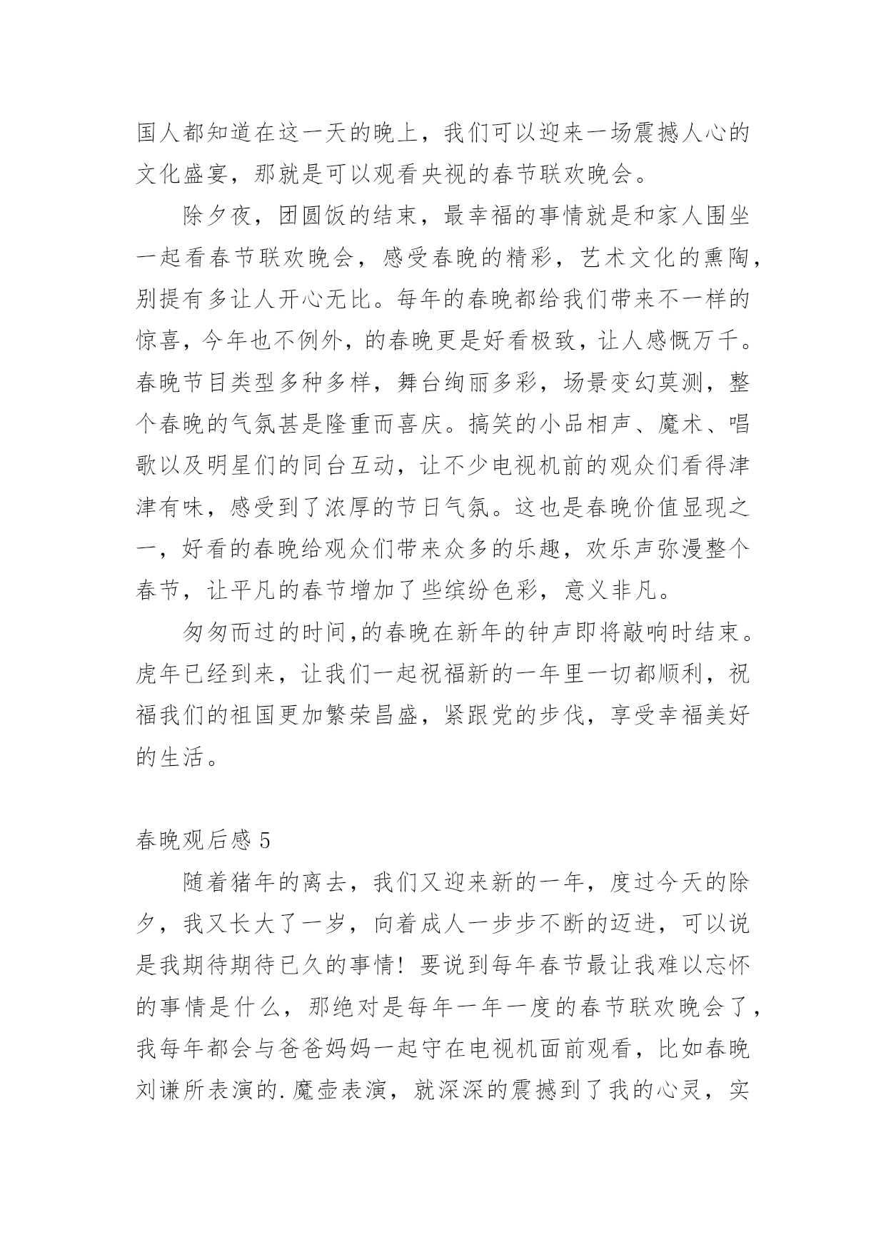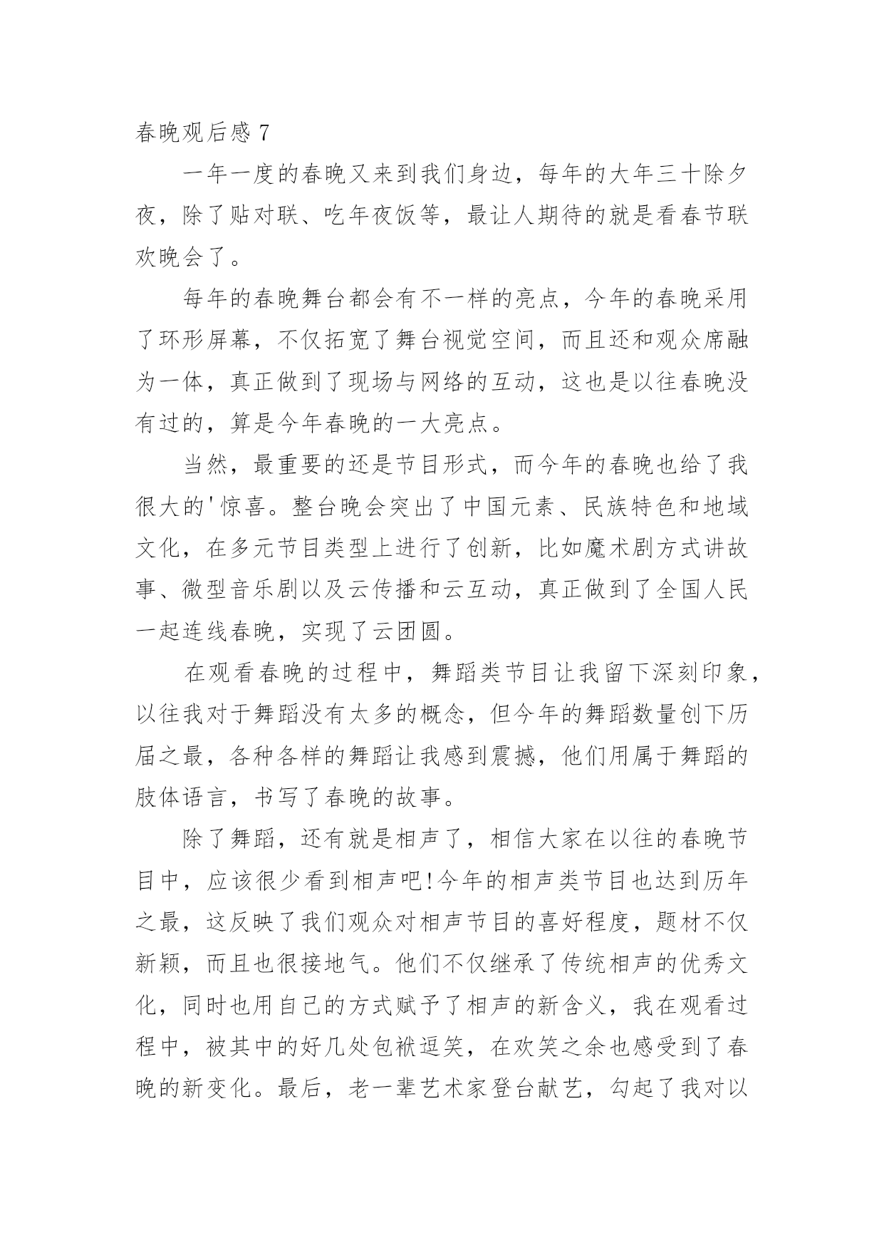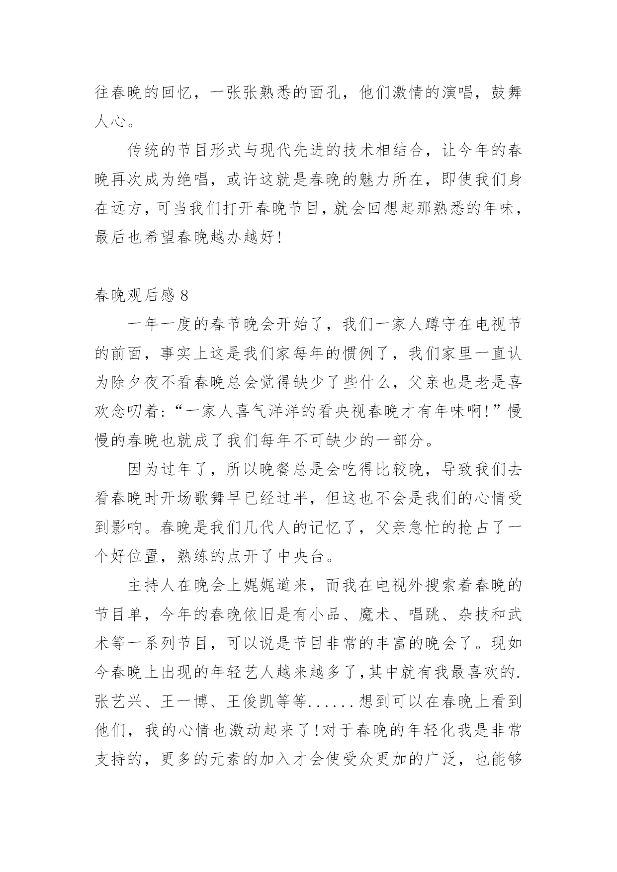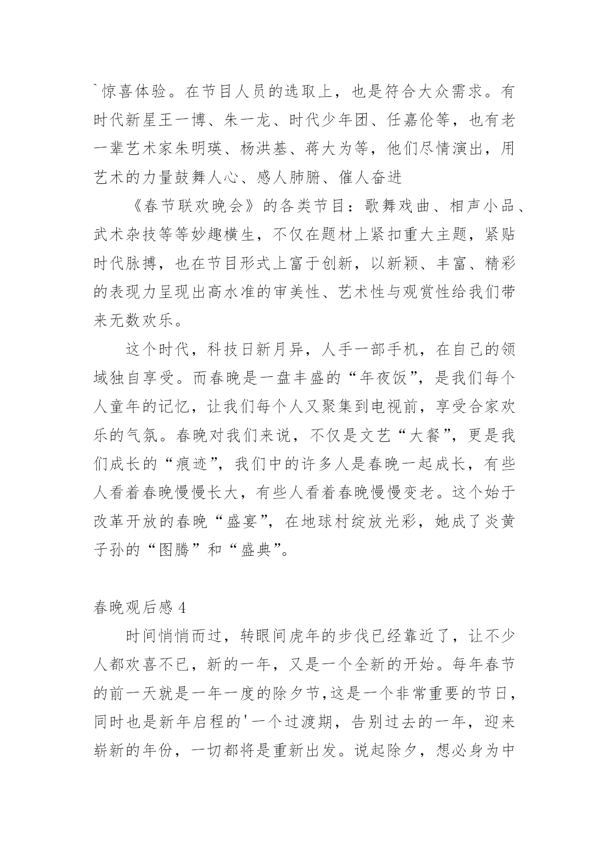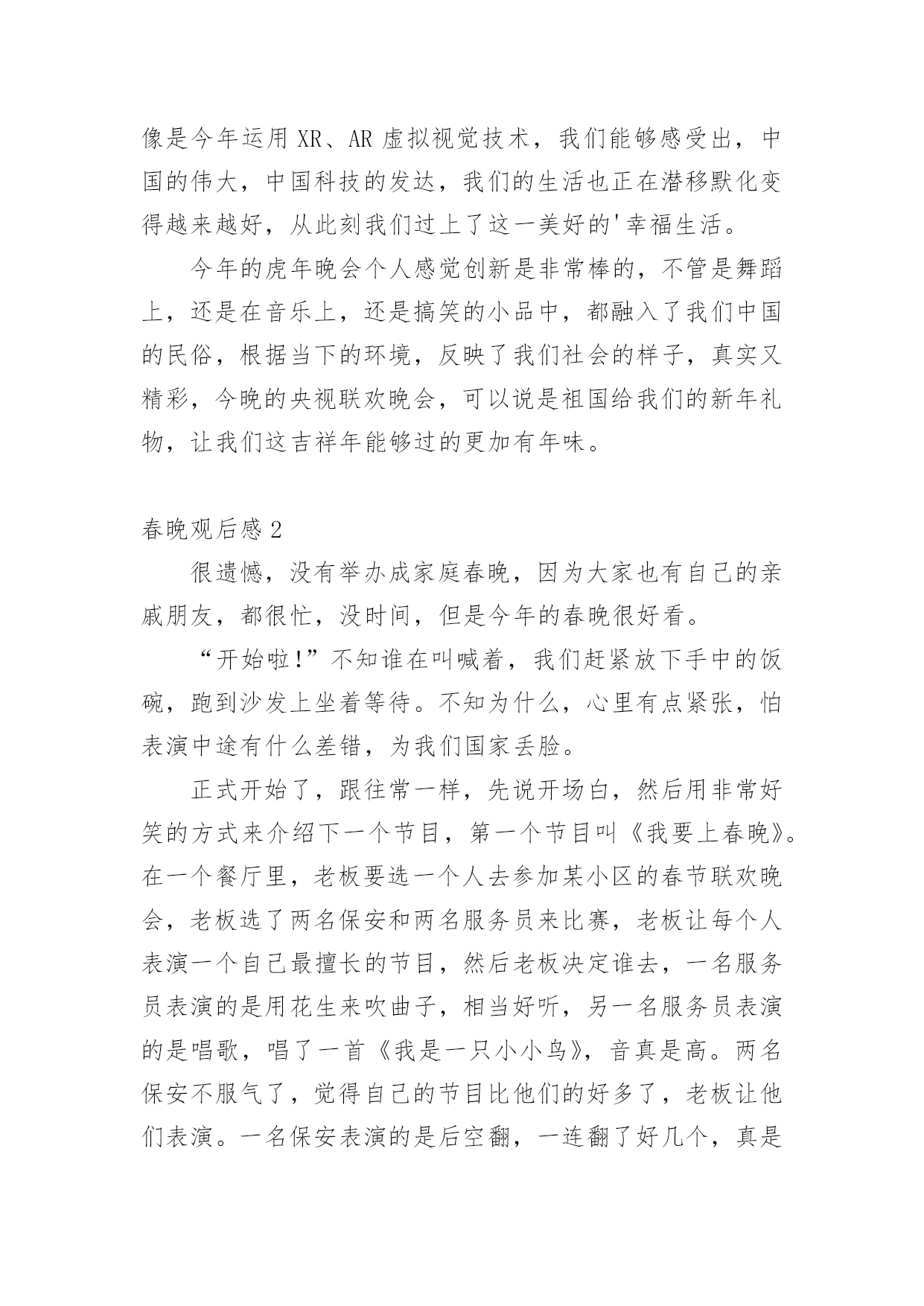 春晚观后感(热)春晚观后感15篇当品味完一部影视作品后,从中我们可以吸收新的思想,观后感的表达方式灵活多样,基本属于议论范畴,但写法不同于一般议论文,因为它必须是在观看后的基础上发感想。观后感你想好怎么写了吗?下面是小编整理的春晚观后感,希望能够帮助到大家。春晚观后感1转眼间我们已经告别特殊的牛年,迎来新一年虎年新春,这不仅让我们激动不已,感慨过得那么快,同时也为的到来而欢欣雀跃。在迎接春节的前一天,也便是除夕,它是中华民族传统团圆夜,这一天我们一家人都开心的聚在一起,互相祝福未来一年能够更加的繁华,同时也不忘打开电视,跟家里人一起看春节联欢晚会,共同迎接虎年的到来。今年的春节晚会举办所谓是特别的隆重,不仅场景宏大,歌曲跟灯光结合的非常的不错,给我们带来一种听觉与视觉的冲击,正是所谓虎虎生威。我个人而言是非常喜欢的,毕竟春晚早就融入生活,是我们迎接新年必不可缺的一到“菜”,由于年年的春晚都在创新,给观众们一种怎么看都不会腻的样子。每年的春晚都会结合科技给我们带来更好的视觉体验,像是今年运用XR、AR虚拟视觉技术,我们能够感受出,中国的伟大,中国科技的发达,我们的生活也正在潜移默化变得越来越好,从此刻我们过上了这一美好的'幸福生活。今年的虎年晚会个人感觉创新是非常棒的,不管是舞蹈上,还是在音乐上,还是搞笑的小品中,都融入了我们中国的民俗,根据当下的环境,反映了我们社会的样子,真实又精彩,今晚的央视联欢晚会,可以说是祖国给我们的新年礼物,让我们这吉祥年能够过的更加有年味。春晚观后感2很遗憾,没有举办成家庭春晚,因为大家也有自己的亲戚朋友,都很忙,没时间,但是今年的春晚很好看。“开始啦!”不知谁在叫喊着,我们赶紧放下手中的饭碗,跑到沙发上坐着等待。不知为什么,心里有点紧张,怕表演中途有什么差错,为我们国家丢脸。正式开始了,跟往常一样,先说开场白,然后用非常好笑的方式来介绍下一个节目,第一个节目叫《我要上春晚》。在一个餐厅里,老板要选一个人去参加某小区的春节联欢晚会,老板选了两名保安和两名服务员来比赛,老板让每个人表演一个自己最擅长的节目,然后老板决定谁去,一名服务员表演的是用花生来吹曲子,相当好听,另一名服务员表演的是唱歌,唱了一首《我是一只小小鸟》,音真是高。两名保安不服气了,觉得自己的节目比他们的好多了,老板让他们表演。一名保安表演的是后空翻,一连翻了好几个,真是厉害啊!另一名保安表演的是唱山歌,声音如同细细的流水从山上面流来,真好听!最后老板不知该选谁去,就让他们四个一起去了。节目完了,我们一同鼓起掌来。让我印象最深的.还是小品《想跳就跳》。有一个老奶奶很奇怪,她没有残疾但却坐着轮椅,她想清静一会儿,又闲太清静,去热闹的地方,又闲太吵,所以今天她就去公园散散心。有许多人来过她身边,她就想千方百计来把他们赶走。这时来了一个老爷爷,手里还拿着放着音乐的录音机,把老奶奶给吵死了,就站起来把录音机关掉,这时,老爷爷的电话响了,老爷爷赶紧去接,原来是市歌舞团打来的电话,歌舞团不让老爷爷参加,因为他太矮,老奶奶很生气,一把抢过老爷爷的手机,跟他讲道理,说:“矮子就不能去啦,不公平,我就是他的舞伴!”最后老奶奶和老爷爷来了一段舞蹈。你觉得精彩吗?春晚观后感3春晚全称是中央电视广播总台春节联欢晚会,从开办到今年,已历经38载年华,规模宏伟,其受众之多,影响之广。38个除夕夜,全球华人每年都分享这道丰盛的文化大餐。那么,的春晚会是怎样的视听盛宴,一起来看看吧!《春节联欢晚会》紧跟时代潮流的步伐,独具匠心、精彩绝伦。科技上,采用大量前沿技术,61.4米×12.4米的8K超高清巨型大屏幕、AI+VR裸眼3D演播室技术给我们带来突破感官的`惊喜体验。在节目人员的选取上,也是符合大众需求。有时代新星王一博、朱一龙、时代少年团、任嘉伦等,也有老一辈艺术家朱明瑛、杨洪基、蒋大为等,他们尽情演出,用艺术的力量鼓舞人心、感人肺腑、催人奋进《春节联欢晚会》的各类节目:歌舞戏曲、相声小品、武术杂技等等妙趣横生,不仅在题材上紧扣重大主题,紧贴时代脉搏,也在节目形式上富于创新,以新颖、丰富、精彩的表现力呈现出高水准的审美性、艺术性与观赏性给我们带来无数欢乐。这个时代,科技日新月异,人手一部手机,在自己的领域独自享受。而春晚是一盘丰盛的“年夜饭”,是我们每个人童年的记忆,让我们每个人又聚集到电视前,享受合家欢乐的气氛。春晚对我们来说,不仅是文艺“大餐”,更是我们成长的“痕迹”,我们中的许多人是春晚一起成长,有些人看着春晚慢慢长大,有些人看着春晚慢慢变老。这个始于改革开放的春晚“盛宴”,在地球村绽放光彩,她成了炎黄子孙的“图腾”和“盛典”。春晚观后感4时间悄悄而过,转眼间虎年的步伐已经靠近了,让不少人都欢喜不已,新的一年,又是一个全新的开始。每年春节的前一天就是一年一