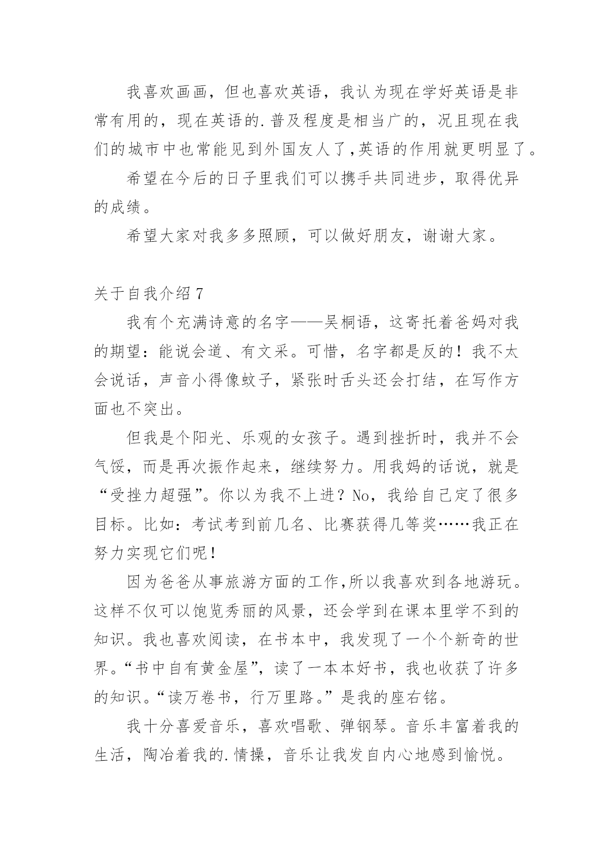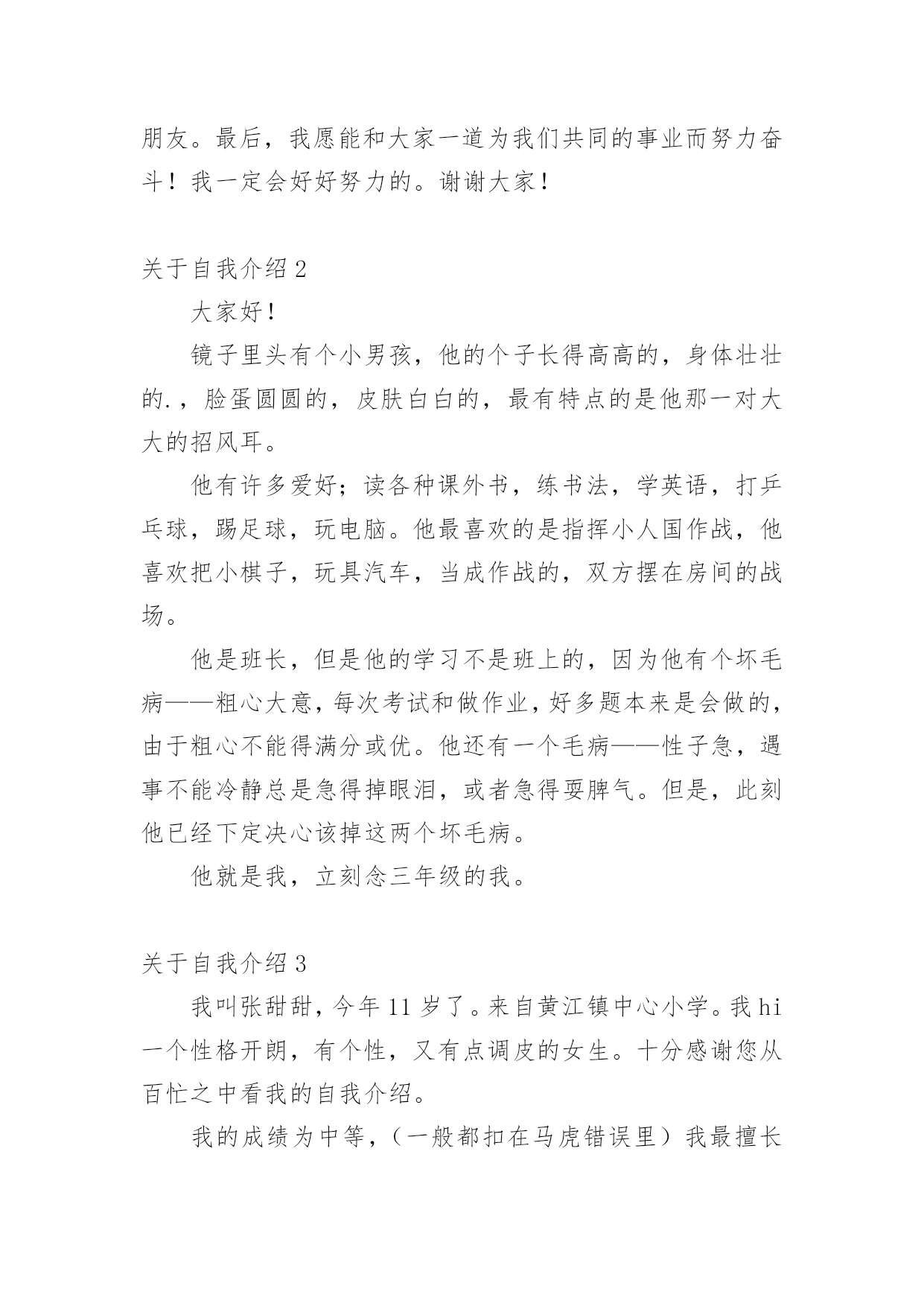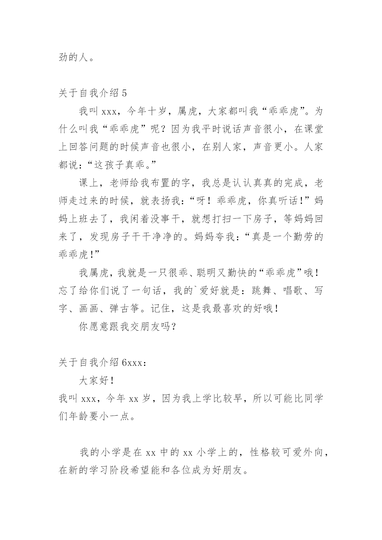 自我介绍【集合】关于自我介绍当换了一个新环境后,我们通常会被要求作自我介绍,自我介绍可以给陌生人留下一个好的印象。相信许多人会觉得自我介绍很难写吧,下面是小编整理的关于自我介绍,欢迎大家分享。关于自我介绍1各位领导,各位同事:大家好!我的名字是xxx,来自于xxx,我是一个乐观开朗的人,我是一个爱好广泛的人,我喜欢听歌、看书、打篮球等等,我很高兴自己能够成为公司的一员,我感到很高兴,也很荣幸,我希望以后大家能够相处得很愉快。我非常高兴也非常荣幸的加入到“xxx”这个大家庭中来,这里不仅为我提供了一个成长锻炼、展示自我的良好平台,也让我有机会认识更多的新同事、新朋友。——借此,我非常感谢各位领导,谢谢您们能给我一次这么好的机会。我初来乍到,还有许多方方面面的知识需要向大家学习,还望在以后的'工作中大家能够多多指教!我相信,通过我们彼此之间的相互了解和认识,我们不但会成为事业上齐头并进一起奋斗的战友,更会成为人生中志同道合、荣辱与共的朋友。最后,我愿能和大家一道为我们共同的事业而努力奋斗!我一定会好好努力的。谢谢大家!关于自我介绍2大家好!镜子里头有个小男孩,他的个子长得高高的,身体壮壮的.,脸蛋圆圆的,皮肤白白的,最有特点的是他那一对大大的招风耳。他有许多爱好;读各种课外书,练书法,学英语,打乒乓球,踢足球,玩电脑。他最喜欢的是指挥小人国作战,他喜欢把小棋子,玩具汽车,当成作战的,双方摆在房间的战场。他是班长,但是他的学习不是班上的,因为他有个坏毛病——粗心大意,每次考试和做作业,好多题本来是会做的,由于粗心不能得满分或优。他还有一个毛病——性子急,遇事不能冷静总是急得掉眼泪,或者急得耍脾气。但是,此刻他已经下定决心该掉这两个坏毛病。他就是我,立刻念三年级的我。关于自我介绍3我叫张甜甜,今年11岁了。来自黄江镇中心小学。我hi一个性格开朗,有个性,又有点调皮的女生。十分感谢您从百忙之中看我的自我介绍。我的成绩为中等,(一般都扣在马虎错误里)我最擅长的是语文的阅读了。只是我并不喜欢那些“硬邦邦”的`文章。我比较喜欢那些带有想象力,还给读者留着发展空间的文章。(如希腊神话波西·杰克逊)我的爱好有很多(如写字,画画,阅读,音乐,写小说。)我最爱的是绘画了。因为我可以从绘画中来发泄自己的情绪,来表达自己的情感。我有着一个幸福美满的家庭。爸爸妈妈经常带我去玩。他们不会像有些家长那样强势自己的孩子去学这个学那个的,而是让我自由发展,做我自己喜欢的事情。我喜欢英语,也想向国外发展。尽管我的英语不是很好也不算很bad!但是我相信这所学校可以帮助我提高英语水平。希望我可以在新的年纪,同学与老师和睦相处,学习愉快!关于自我介绍4我做事一丝不苟,擅长交际,有良好的表达能力,做事认真负责,胆大心细的女孩,秉承自己的一套原则,做大于说,有良好的团队意识和协助团队精神。认真对待自己手中的工作,遇到困难,绝不会半途而废,坚持完成自己的工作,克服困难。在自己的人际有很好的口碑,相信我能快速融入团队的氛围,一定好好发扬自己的长处,友好与同事相处,认真负责并且完成上级领导交予自己的`任务,努力打造自己的一片天地,深信,成功永远属于有上进心的,有奋斗冲劲的人。关于自我介绍5我叫xxx,今年十岁,属虎,大家都叫我“乖乖虎”。为什么叫我“乖乖虎”呢?因为我平时说话声音很小,在课堂上回答问题的时候声音也很小,在别人家,声音更小。人家都说:“这孩子真乖。”课上,老师给我布置的字,我总是认认真真的完成,老师走过来的时候,就表扬我:“呀!乖乖虎,你真听话!”妈妈上班去了,我闲着没事干,就想打扫一下房子,等妈妈回来了,发现房子干干净净的。妈妈夸我:“真是一个勤劳的乖乖虎!”我属虎,我就是一只很乖、聪明又勤快的“乖乖虎”哦!忘了给你们说了一句话,我的`爱好就是:跳舞、唱歌、写字、画画、弹古筝。记住,这是我最喜欢的好哦!你愿意跟我交朋友吗?关于自我介绍6xxx:大家好!我叫xxx,今年xx岁,因为我上学比较早,所以可能比同学们年龄要小一点。我的小学是在xx中的xx小学上的,性格较可爱外向,在新的学习阶段希望能和各位成为好朋友。我喜欢画画,但也喜欢英语,我认为现在学好英语是非常有用的,现在英语的.普及程度是相当广的,况且现在我们的城市中也常能见到外国友人了,英语的作用就更明显了。希望在今后的日子里我们可以携手共同进步,取得优异的成绩。希望大家对我多多照顾,可以做好朋友,谢谢大家。关于自我介绍7我有个充满诗意的名字——吴桐语,这寄托着爸妈对我的期望:能说会道、有文采。可惜,名字都是反的!我不太会说话,声音小得像蚊子,紧张时舌头还会打结,在写作方面也不突出。但我是个阳光、乐观的女孩子。遇到挫折时,我并不会气馁,而是再次振作起来,继续努力。用我妈的话说,就是“受挫力超强”。你以为我不上进