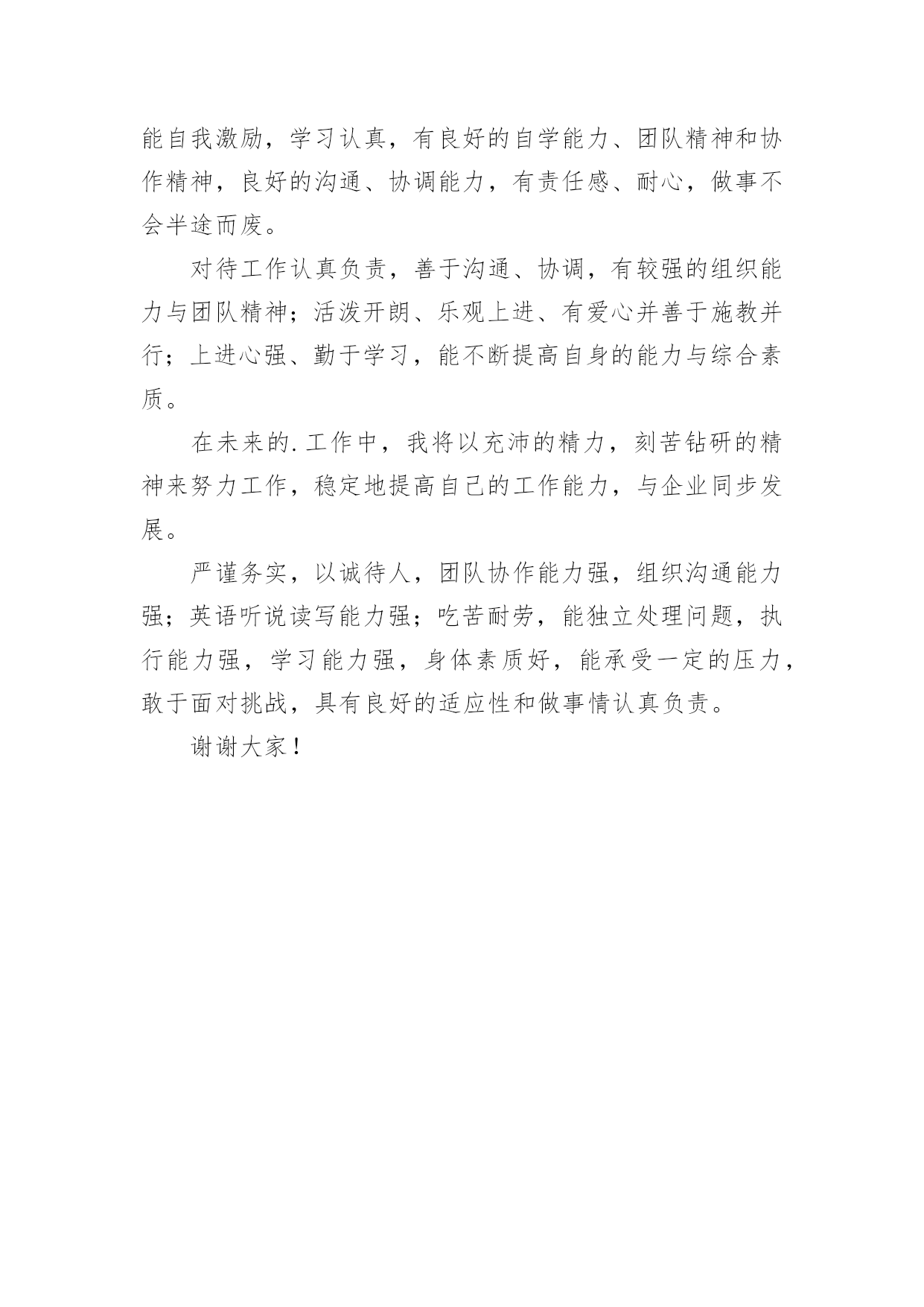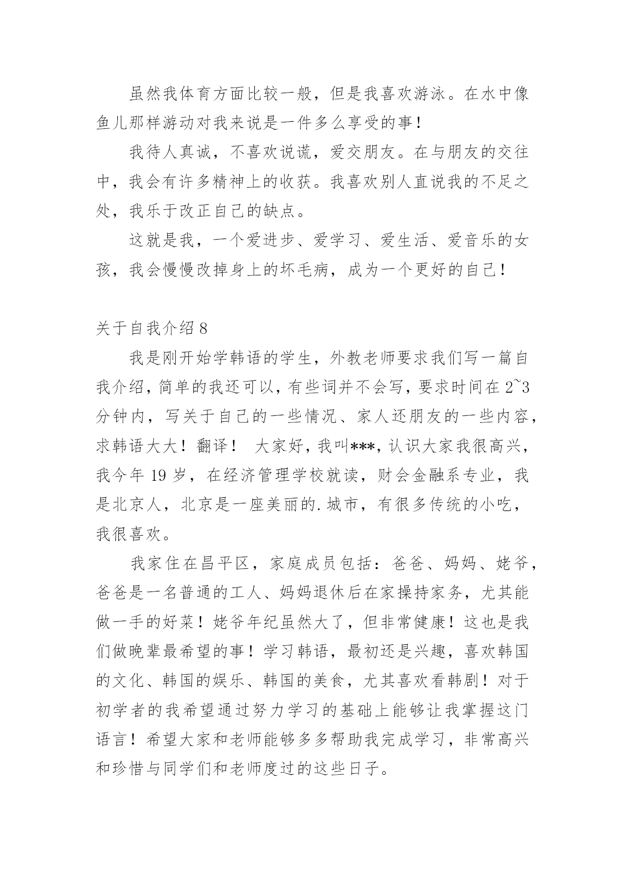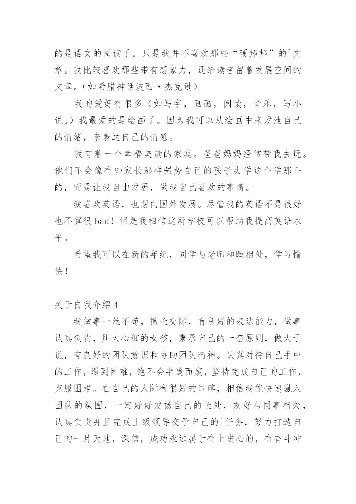 自我介绍【集合】关于自我介绍当换了一个新环境后,我们通常会被要求作自我介绍,自我介绍可以给陌生人留下一个好的印象。相信许多人会觉得自我介绍很难写吧,下面是小编整理的关于自我介绍,欢迎大家分享。关于自我介绍1各位领导,各位同事:大家好!我的名字是xxx,来自于xxx,我是一个乐观开朗的人,我是一个爱好广泛的人,我喜欢听歌、看书、打篮球等等,我很高兴自己能够成为公司的一员,我感到很高兴,也很荣幸,我希望以后大家能够相处得很愉快。我非常高兴也非常荣幸的加入到“xxx”这个大家庭中来,这里不仅为我提供了一个成长锻炼、展示自我的良好平台,也让我有机会认识更多的新同事、新朋友。——借此,我非常感谢各位领导,谢谢您们能给我一次这么好的机会。我初来乍到,还有许多方方面面的知识需要向大家学习,还望在以后的'工作中大家能够多多指教!我相信,通过我们彼此之间的相互了解和认识,我们不但会成为事业上齐头并进一起奋斗的战友,更会成为人生中志同道合、荣辱与共的朋友。最后,我愿能和大家一道为我们共同的事业而努力奋斗!我一定会好好努力的。谢谢大家!关于自我介绍2大家好!镜子里头有个小男孩,他的个子长得高高的,身体壮壮的.,脸蛋圆圆的,皮肤白白的,最有特点的是他那一对大大的招风耳。他有许多爱好;读各种课外书,练书法,学英语,打乒乓球,踢足球,玩电脑。他最喜欢的是指挥小人国作战,他喜欢把小棋子,玩具汽车,当成作战的,双方摆在房间的战场。他是班长,但是他的学习不是班上的,因为他有个坏毛病——粗心大意,每次考试和做作业,好多题本来是会做的,由于粗心不能得满分或优。他还有一个毛病——性子急,遇事不能冷静总是急得掉眼泪,或者急得耍脾气。但是,此刻他已经下定决心该掉这两个坏毛病。他就是我,立刻念三年级的我。关于自我介绍3我叫张甜甜,今年11岁了。来自黄江镇中心小学。我hi一个性格开朗,有个性,又有点调皮的女生。十分感谢您从百忙之中看我的自我介绍。我的成绩为中等,(一般都扣在马虎错误里)我最擅长的是语文的阅读了。只是我并不喜欢那些“硬邦邦”的`文章。我比较喜欢那些带有想象力,还给读者留着发展空间的文章。(如希腊神话波西·杰克逊)我的爱好有很多(如写字,画画,阅读,音乐,写小说。)我最爱的是绘画了。因为我可以从绘画中来发泄自己的情绪,来表达自己的情感。我有着一个幸福美满的家庭。爸爸妈妈经常带我去玩。他们不会像有些家长那样强势自己的孩子去学这个学那个的,而是让我自由发展,做我自己喜欢的事情。我喜欢英语,也想向国外发展。尽管我的英语不是很好也不算很bad!但是我相信这所学校可以帮助我提高英语水平。希望我可以在新的年纪,同学与老师和睦相处,学习愉快!关于自我介绍4我做事一丝不苟,擅长交际,有良好的表达能力,做事认真负责,胆大心细的女孩,秉承自己的一套原则,做大于说,有良好的团队意识和协助团队精神。认真对待自己手中的工作,遇到困难,绝不会半途而废,坚持完成自己的工作,克服困难。在自己的人际有很好的口碑,相信我能快速融入团队的氛围,一定好好发扬自己的长处,友好与同事相处,认真负责并且完成上级领导交予自己的`任务,努力打造自己的一片天地,深信,成功永远属于有上进心的,有奋斗冲劲的人。关于自我介绍5我叫xxx,今年十岁,属虎,大家都叫我“乖乖虎”。为什么叫我“乖乖虎”呢?因为我平时说话声音很小,在课堂上回答问题的时候声音也很小,在别人家,声音更小。人家都说:“这孩子真乖。”课上,老师给我布置的字,我总是认认真真的完成,老师走过来的时候,就表扬我:“呀!乖乖虎,你真听话!”妈妈上班去了,我闲着没事干,就想打扫一下房子,等妈妈回来了,发现房子干干净净的。妈妈夸我:“真是一个勤劳的乖乖虎!”我属虎,我就是一只很乖、聪明又勤快的“乖乖虎”哦!忘了给你们说了一句话,我的`爱好就是:跳舞、唱歌、写字、画画、弹古筝。记住,这是我最喜欢的好哦!你愿意跟我交朋友吗?关于自我介绍6xxx:大家好!我叫xxx,今年xx岁,因为我上学比较早,所以可能比同学们年龄要小一点。我的小学是在xx中的xx小学上的,性格较可爱外向,在新的学习阶段希望能和各位成为好朋友。我喜欢画画,但也喜欢英语,我认为现在学好英语是非常有用的,现在英语的.普及程度是相当广的,况且现在我们的城市中也常能见到外国友人了,英语的作用就更明显了。希望在今后的日子里我们可以携手共同进步,取得优异的成绩。希望大家对我多多照顾,可以做好朋友,谢谢大家。关于自我介绍7我有个充满诗意的名字——吴桐语,这寄托着爸妈对我的期望:能说会道、有文采。可惜,名字都是反的!我不太会说话,声音小得像蚊子,紧张时舌头还会打结,在写作方面也不突出。但我是个阳光、乐观的女孩子。遇到挫折时,我并不会气馁,而是再次振作起来,继续努力。用我妈的话说,就是“受挫力超强”。你以为我不上进