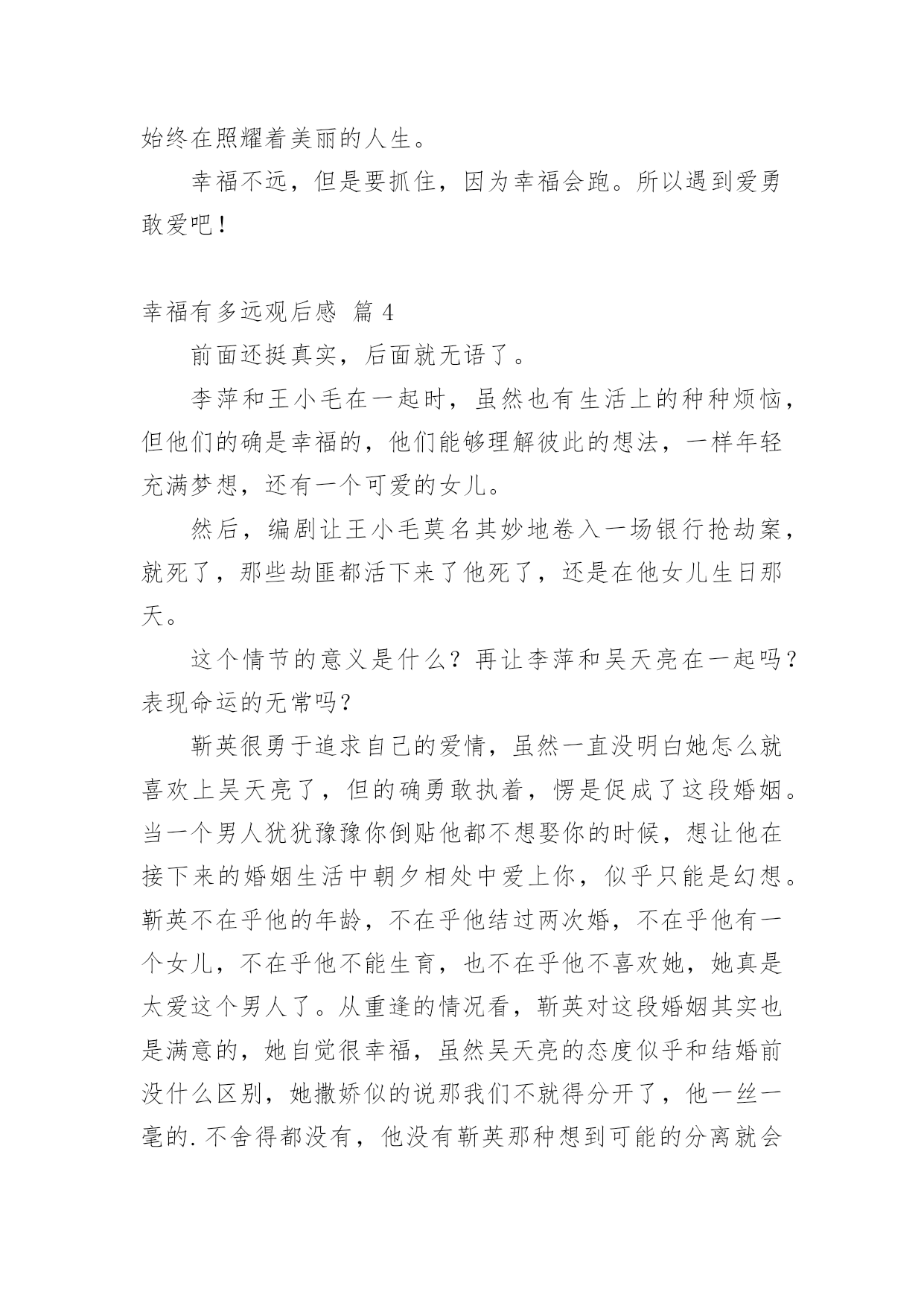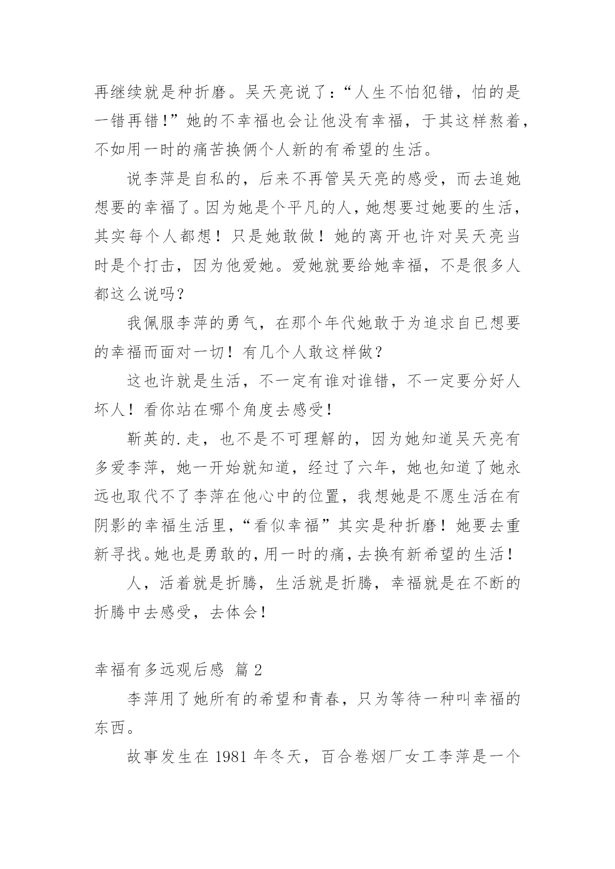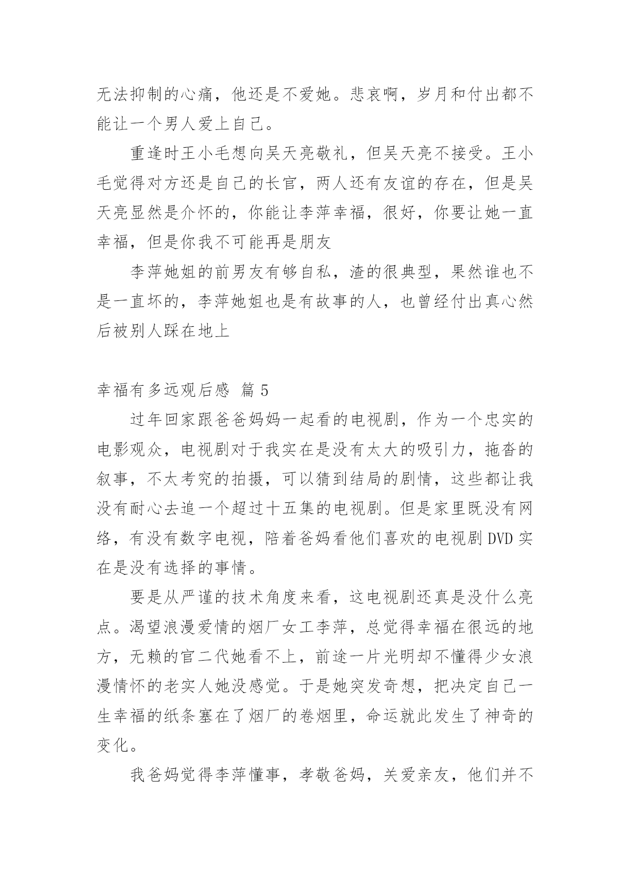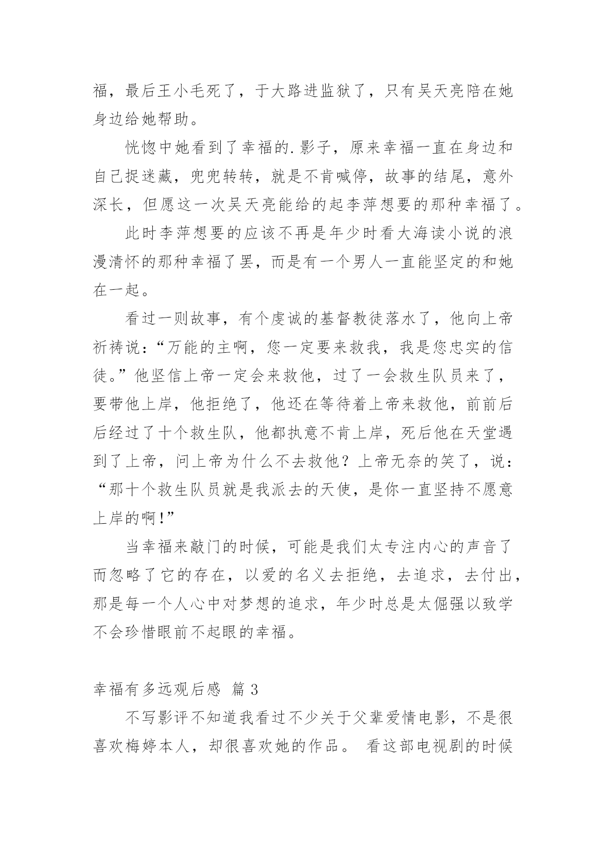 幸福有多远观后感幸福有多远观后感(精选8篇)当认真看完一部影视作品后,你有什么总结呢?是时候抽出时间写写观后感了。你想知道观后感怎么写吗?下面是小编帮大家整理的幸福有多远观后感,仅供参考,欢迎大家阅读。幸福有多远观后感篇1我看完了电视剧“幸福还有多远”的全集,心情很复杂,想不到会是这样的结局。真是想问,幸福是什么?幸福在哪儿?幸福可能就是现在,也可能还要等待;幸福可能无处不在,也可能要靠自已去争取,幸福其实是人们追求一辈子的东西。幸福其实很近,其实也很遥远……我看到了大多数人在网上评论,说李萍——自私!因为她离开了好人——吴天亮,认为她伤害了吴天亮。我不这样想,为什么是李萍错了?为什么她这就是自私了?我觉得她有权追求她想要的生活!她和吴天亮一开始就是个误会。既然错了,她也努力过了,为什么不去改变它?为什么她一定要委曲求全呢?这对双方都是一种欺骗!吴天亮是好人,难道他没错吗?他从一开始就欺骗了李萍。李萍是坏人吗?她善良的接受了开始的一切,她也被感动过,她也去爱了,去努力了,去忍耐了。但最终那不是她想要的那种幸福生活,再继续就是种折磨。吴天亮说了:“人生不怕犯错,怕的是一错再错!”她的不幸福也会让他没有幸福,于其这样熬着,不如用一时的痛苦换俩个人新的有希望的生活。说李萍是自私的,后来不再管吴天亮的感受,而去追她想要的幸福了。因为她是个平凡的人,她想要过她要的生活,其实每个人都想!只是她敢做!她的离开也许对吴天亮当时是个打击,因为他爱她。爱她就要给她幸福,不是很多人都这么说吗?我佩服李萍的勇气,在那个年代她敢于为追求自已想要的幸福而面对一切!有几个人敢这样做?这也许就是生活,不一定有谁对谁错,不一定要分好人坏人!看你站在哪个角度去感受!靳英的.走,也不是不可理解的,因为她知道吴天亮有多爱李萍,她一开始就知道,经过了六年,她也知道了她永远也取代不了李萍在他心中的位置,我想她是不愿生活在有阴影的幸福生活里,“看似幸福”其实是种折磨!她要去重新寻找。她也是勇敢的,用一时的痛,去换有新希望的生活!人,活着就是折腾,生活就是折腾,幸福就是在不断的折腾中去感受,去体会!幸福有多远观后感篇2李萍用了她所有的希望和青春,只为等待一种叫幸福的东西。故事发生在1981年冬天,百合卷烟厂女工李萍是一个普通女工,一次要赶制一批慰问海军的香烟,她突发奇想写下了一张纸条:“当你抽到这盒烟,那就是我们缘分的开始。假如你是个军人,还没有结婚,我愿意嫁给你,愿意做你的妻子。”她把这张纸条塞到烟盒里,天天与她的好友靳英共同期盼着回音,她坚信幸福离她并不遥远,这盒香烟就是她新生活的开始……军人吴天亮点因此走进了她的生活,没过多久,他们结婚了,可婚后的生活并不如期待的那样完美,吴天亮点爱她,可并不理解她,相比之下,李萍更喜欢和吴天亮的通讯员王小毛在一起,军队大院里谣言四起,生活无法再回复到往日的平静了,李萍离开吴天亮后嫁给了王小毛,而李萍的最好的朋友靳英则走进了吴天亮点的生活,两个新的家庭重组了。也许这一次才是她们想要的幸福。幸福的生活终于开始了,李萍和王小毛虽然贫穷,但生活很开心,让人意想不到的事情发生了,幸福的生活并没有持续太久,王小毛在一次意外中去世了,留下了李萍和年幼的女儿艰难的生活,吴天亮点伸出了援助之手,靳英无法接受深爱的男人心里还有别人,一个人离开了,等李萍和吴天亮赶到车站时,列车早已经开走了,只剩下李萍和吴天亮两个人相互凝望着对方,这一次幸福还有多远……看到结尾的时候,心情很复杂,李萍一直以来的追求的幸福总是输给了她想象的范围,她拒绝烟厂主任于大路的追求,而执意嫁给了军人吴天亮,她和团长吴天亮离婚,执意嫁给了一无所有的王小毛,一直在坚定的寻找着她心中的幸福,最后王小毛死了,于大路进监狱了,只有吴天亮陪在她身边给她帮助。恍惚中她看到了幸福的.影子,原来幸福一直在身边和自己捉迷藏,兜兜转转,就是不肯喊停,故事的结尾,意外深长,但愿这一次吴天亮能给的起李萍想要的那种幸福了。此时李萍想要的应该不再是年少时看大海读小说的浪漫清怀的那种幸福了罢,而是有一个男人一直能坚定的和她在一起。看过一则故事,有个虔诚的基督教徒落水了,他向上帝祈祷说:“万能的主啊,您一定要来救我,我是您忠实的信徒。”他坚信上帝一定会来救他,过了一会救生队员来了,要带他上岸,他拒绝了,他还在等待着上帝来救他,前前后后经过了十个救生队,他都执意不肯上岸,死后他在天堂遇到了上帝,问上帝为什么不去救他?上帝无奈的笑了,说:“那十个救生队员就是我派去的天使,是你一直坚持不愿意上岸的啊!”当幸福来敲门的时候,可能是我们太专注内心的声音了而忽略了它的存在,以爱的名义去拒绝,去追求,去付出,那是每一个人心中对梦想的追求,年少时总是太倔强以致学不会珍惜眼前不起眼的幸福。幸福有多远观后感篇3不写影评不知道我看过不