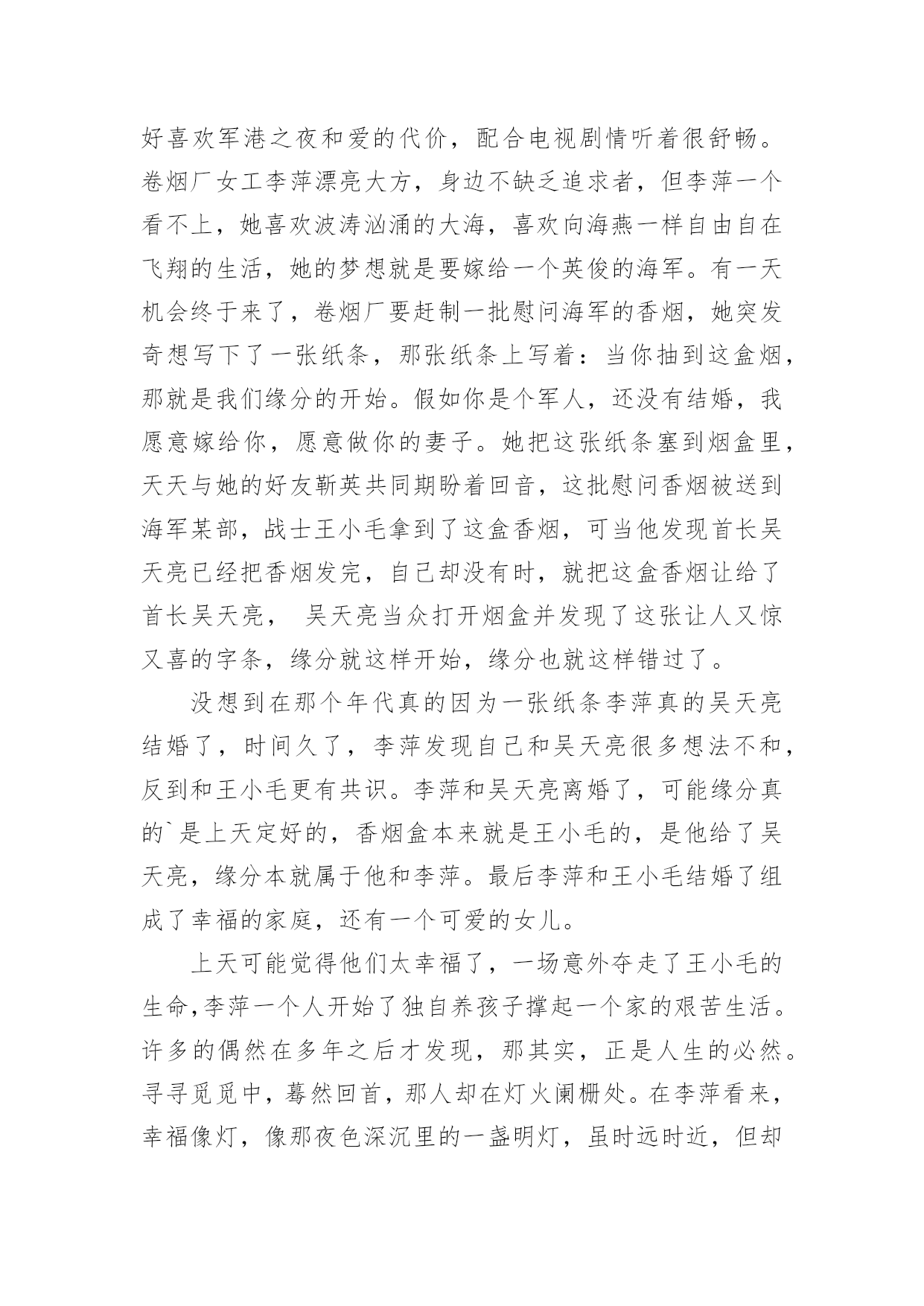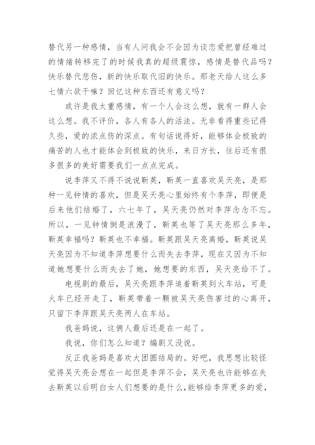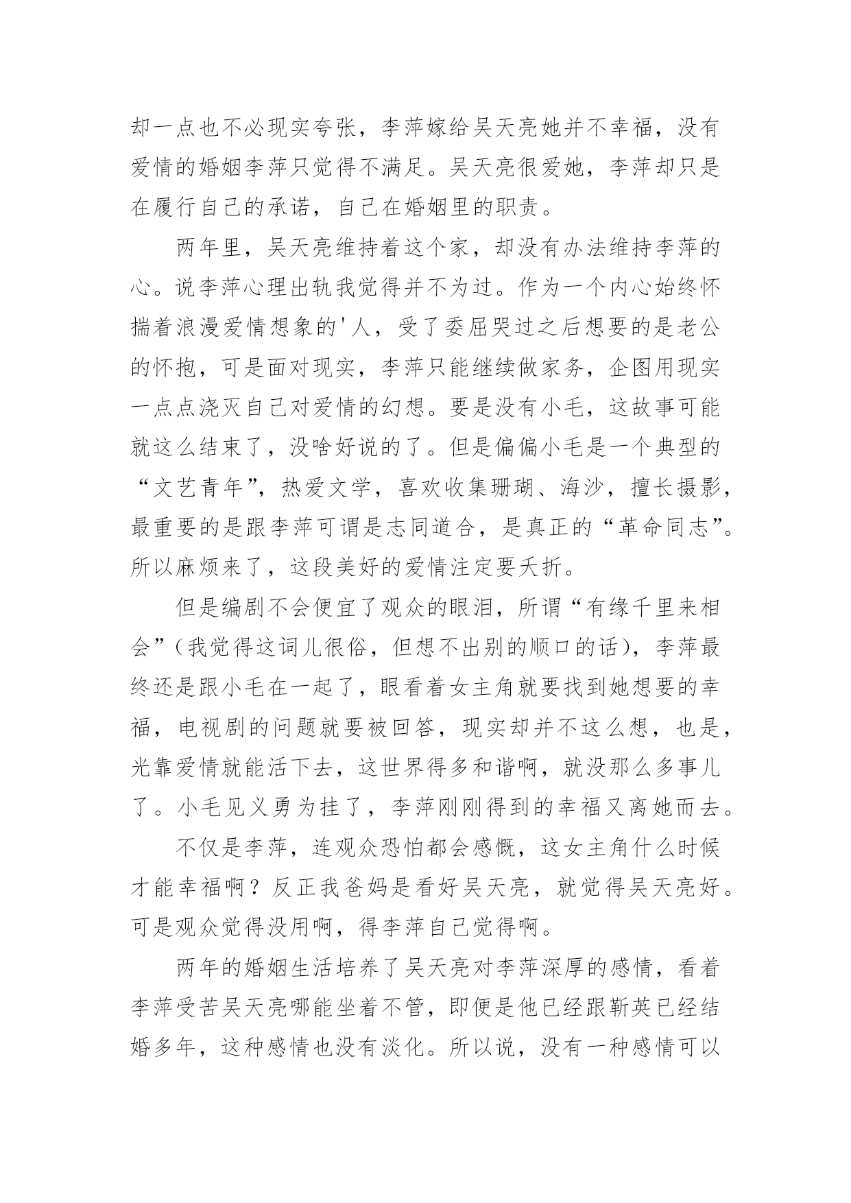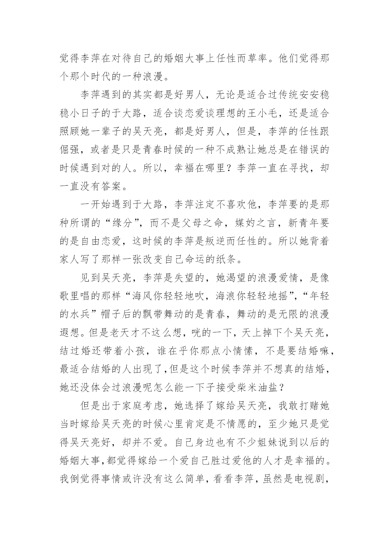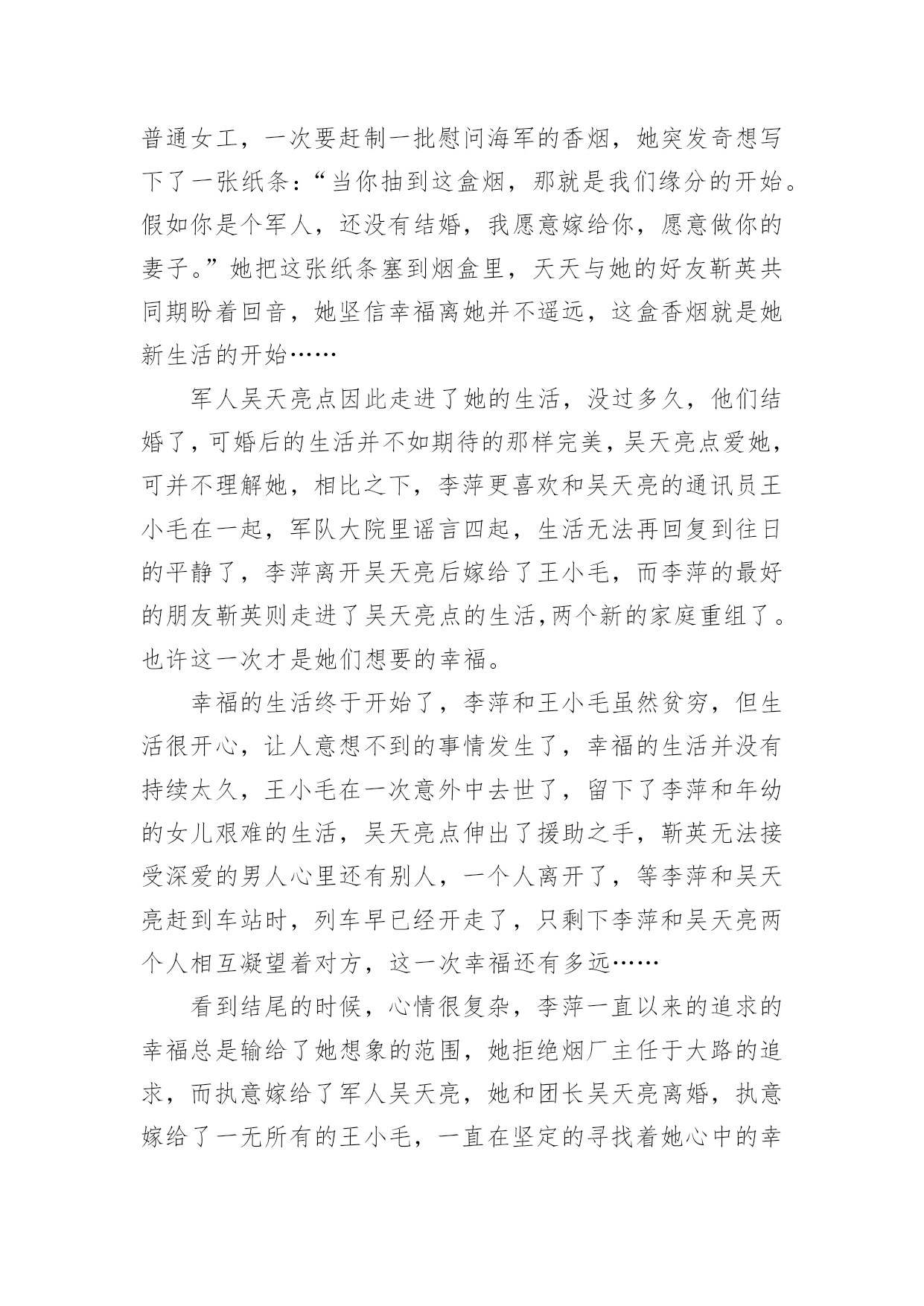 幸福有多远观后感幸福有多远观后感(精选8篇)当认真看完一部影视作品后,你有什么总结呢?是时候抽出时间写写观后感了。你想知道观后感怎么写吗?下面是小编帮大家整理的幸福有多远观后感,仅供参考,欢迎大家阅读。幸福有多远观后感篇1我看完了电视剧“幸福还有多远”的全集,心情很复杂,想不到会是这样的结局。真是想问,幸福是什么?幸福在哪儿?幸福可能就是现在,也可能还要等待;幸福可能无处不在,也可能要靠自已去争取,幸福其实是人们追求一辈子的东西。幸福其实很近,其实也很遥远……我看到了大多数人在网上评论,说李萍——自私!因为她离开了好人——吴天亮,认为她伤害了吴天亮。我不这样想,为什么是李萍错了?为什么她这就是自私了?我觉得她有权追求她想要的生活!她和吴天亮一开始就是个误会。既然错了,她也努力过了,为什么不去改变它?为什么她一定要委曲求全呢?这对双方都是一种欺骗!吴天亮是好人,难道他没错吗?他从一开始就欺骗了李萍。李萍是坏人吗?她善良的接受了开始的一切,她也被感动过,她也去爱了,去努力了,去忍耐了。但最终那不是她想要的那种幸福生活,再继续就是种折磨。吴天亮说了:“人生不怕犯错,怕的是一错再错!”她的不幸福也会让他没有幸福,于其这样熬着,不如用一时的痛苦换俩个人新的有希望的生活。说李萍是自私的,后来不再管吴天亮的感受,而去追她想要的幸福了。因为她是个平凡的人,她想要过她要的生活,其实每个人都想!只是她敢做!她的离开也许对吴天亮当时是个打击,因为他爱她。爱她就要给她幸福,不是很多人都这么说吗?我佩服李萍的勇气,在那个年代她敢于为追求自已想要的幸福而面对一切!有几个人敢这样做?这也许就是生活,不一定有谁对谁错,不一定要分好人坏人!看你站在哪个角度去感受!靳英的.走,也不是不可理解的,因为她知道吴天亮有多爱李萍,她一开始就知道,经过了六年,她也知道了她永远也取代不了李萍在他心中的位置,我想她是不愿生活在有阴影的幸福生活里,“看似幸福”其实是种折磨!她要去重新寻找。她也是勇敢的,用一时的痛,去换有新希望的生活!人,活着就是折腾,生活就是折腾,幸福就是在不断的折腾中去感受,去体会!幸福有多远观后感篇2李萍用了她所有的希望和青春,只为等待一种叫幸福的东西。故事发生在1981年冬天,百合卷烟厂女工李萍是一个普通女工,一次要赶制一批慰问海军的香烟,她突发奇想写下了一张纸条:“当你抽到这盒烟,那就是我们缘分的开始。假如你是个军人,还没有结婚,我愿意嫁给你,愿意做你的妻子。”她把这张纸条塞到烟盒里,天天与她的好友靳英共同期盼着回音,她坚信幸福离她并不遥远,这盒香烟就是她新生活的开始……军人吴天亮点因此走进了她的生活,没过多久,他们结婚了,可婚后的生活并不如期待的那样完美,吴天亮点爱她,可并不理解她,相比之下,李萍更喜欢和吴天亮的通讯员王小毛在一起,军队大院里谣言四起,生活无法再回复到往日的平静了,李萍离开吴天亮后嫁给了王小毛,而李萍的最好的朋友靳英则走进了吴天亮点的生活,两个新的家庭重组了。也许这一次才是她们想要的幸福。幸福的生活终于开始了,李萍和王小毛虽然贫穷,但生活很开心,让人意想不到的事情发生了,幸福的生活并没有持续太久,王小毛在一次意外中去世了,留下了李萍和年幼的女儿艰难的生活,吴天亮点伸出了援助之手,靳英无法接受深爱的男人心里还有别人,一个人离开了,等李萍和吴天亮赶到车站时,列车早已经开走了,只剩下李萍和吴天亮两个人相互凝望着对方,这一次幸福还有多远……看到结尾的时候,心情很复杂,李萍一直以来的追求的幸福总是输给了她想象的范围,她拒绝烟厂主任于大路的追求,而执意嫁给了军人吴天亮,她和团长吴天亮离婚,执意嫁给了一无所有的王小毛,一直在坚定的寻找着她心中的幸福,最后王小毛死了,于大路进监狱了,只有吴天亮陪在她身边给她帮助。恍惚中她看到了幸福的.影子,原来幸福一直在身边和自己捉迷藏,兜兜转转,就是不肯喊停,故事的结尾,意外深长,但愿这一次吴天亮能给的起李萍想要的那种幸福了。此时李萍想要的应该不再是年少时看大海读小说的浪漫清怀的那种幸福了罢,而是有一个男人一直能坚定的和她在一起。看过一则故事,有个虔诚的基督教徒落水了,他向上帝祈祷说:“万能的主啊,您一定要来救我,我是您忠实的信徒。”他坚信上帝一定会来救他,过了一会救生队员来了,要带他上岸,他拒绝了,他还在等待着上帝来救他,前前后后经过了十个救生队,他都执意不肯上岸,死后他在天堂遇到了上帝,问上帝为什么不去救他?上帝无奈的笑了,说:“那十个救生队员就是我派去的天使,是你一直坚持不愿意上岸的啊!”当幸福来敲门的时候,可能是我们太专注内心的声音了而忽略了它的存在,以爱的名义去拒绝,去追求,去付出,那是每一个人心中对梦想的追求,年少时总是太倔强以致学不会珍惜眼前不起眼的幸福。幸福有多远观后感篇3不写影评不知道我看过不