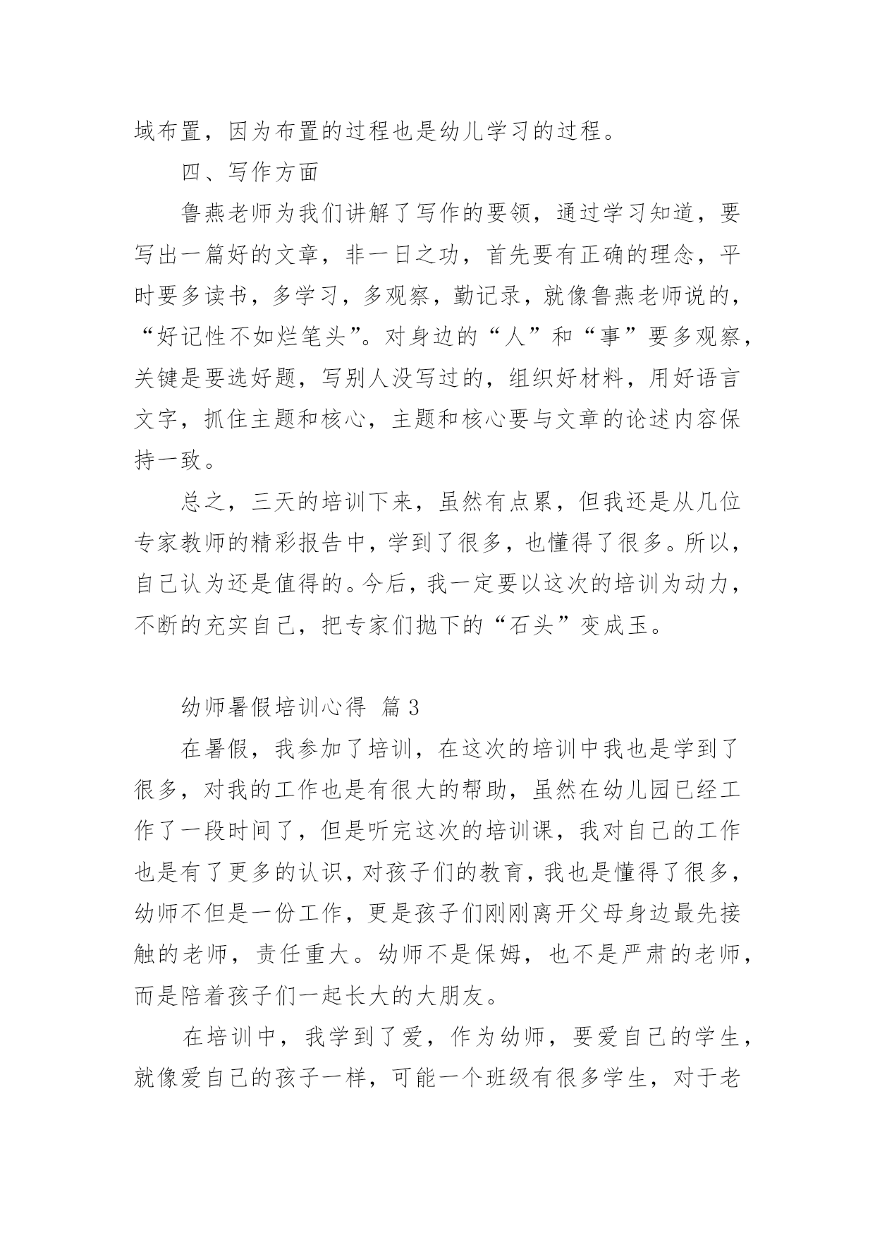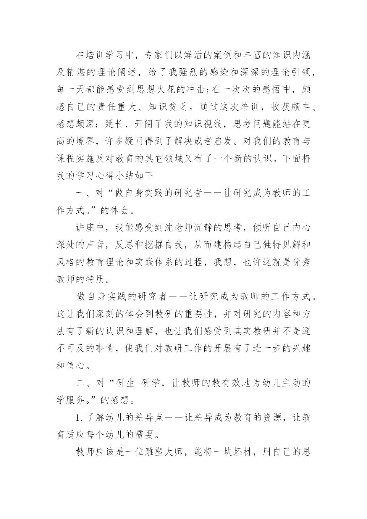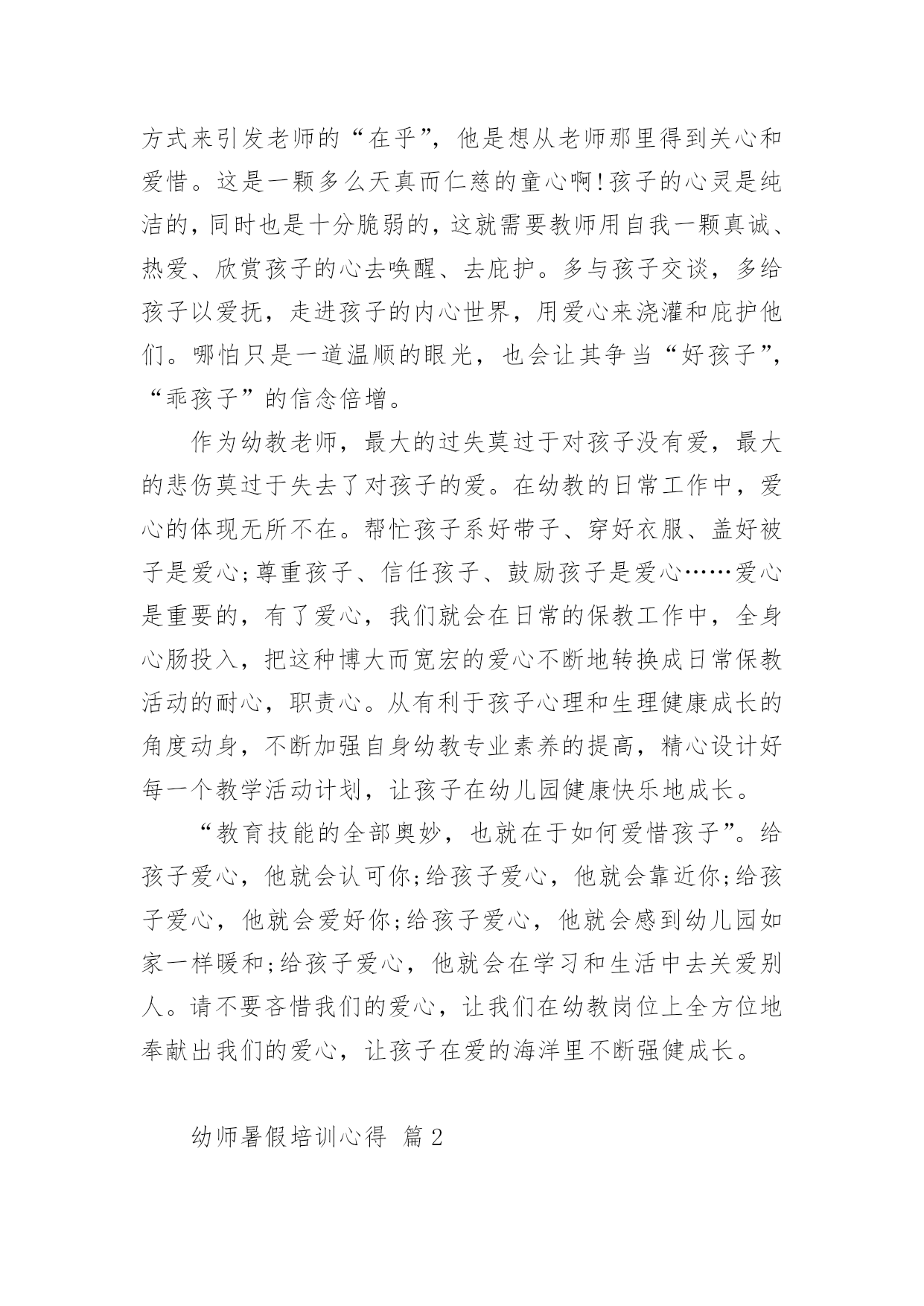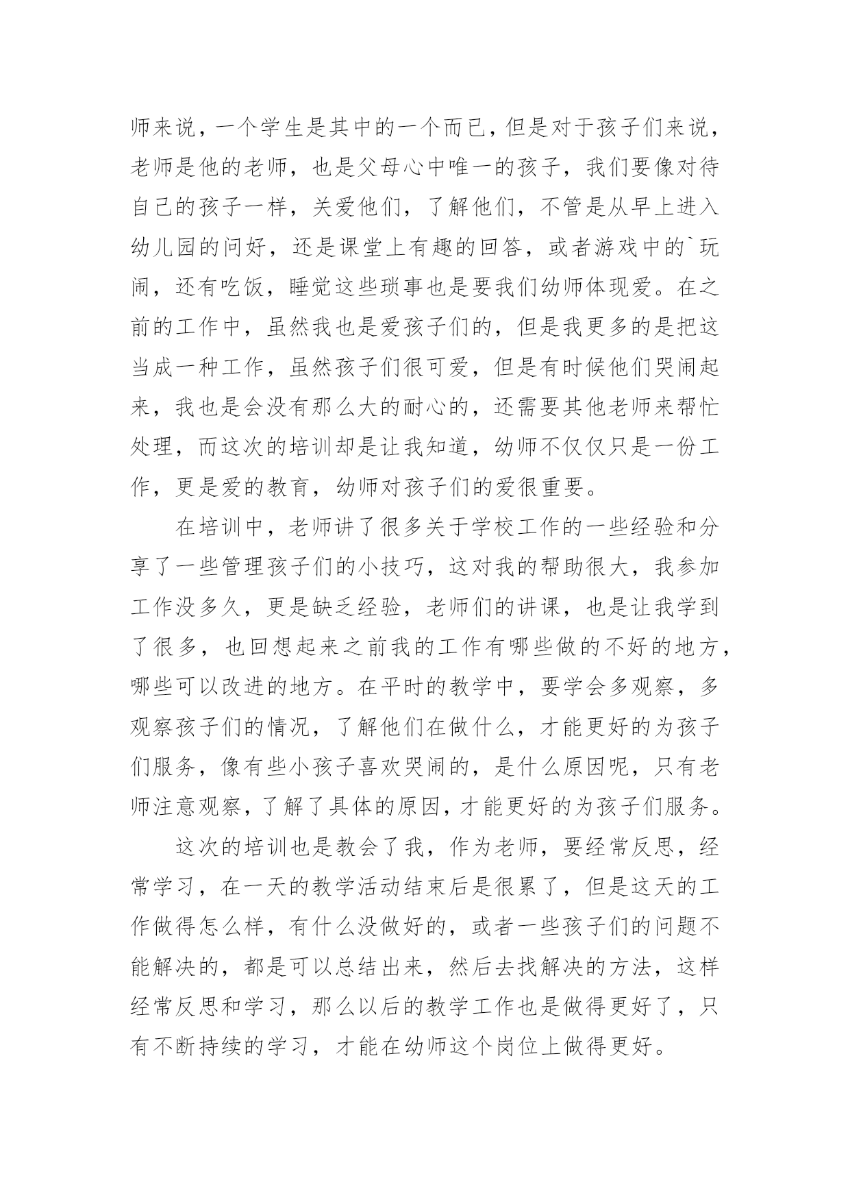幼师暑假培训心得当我们备受启迪时,不如来好好地做个总结,写一篇心得体会,从而不断地丰富我们的思想。到底应如何写心得体会呢?下面是小编为大家收集的幼师暑假培训心得,欢迎阅读与收藏。幼师暑假培训心得篇1我们生活的这个世界需要爱心,在幼儿园学习和生活的孩子们更需要爱心,记得一位名人以前说过“谁不爱孩子,孩子就不爱他,只有爱孩子的人,才能教育好孩子。”作为幼教老师,教育好孩子是我们的终究目标,要想实现这个目标,就需要我们在日常的保教工作中全方位地奉献出我们的爱心。孩子上幼儿园是人生的一个重要起点,他从那里开始了真正的社会生活和学习生活。对于刚刚脱离父母怀抱的他们来说,幼儿园是一个全新而又陌生的环境。他们期望得到认可、称赞、同情、关心和爱惜,期望得到老师的爱。在那里,我不妨先举一个例子。康康是小班里一个十分聪明能干的小家伙,自我吃饭,自我尿尿,就是我们常常说的那种小大人型的,但不知怎样的,最近一个星期己经连续尿了三次床了,问他的妈妈,他在家里最近一段时光从来不尿床。这可怪了,究竟是怎样一回事呢?之后才明白,本来这个小家伙是成心的',他只是不中意老师对他的“不在乎”,想用这种极端的方式来引发老师的“在乎”,他是想从老师那里得到关心和爱惜。这是一颗多么天真而仁慈的童心啊!孩子的心灵是纯洁的,同时也是十分脆弱的,这就需要教师用自我一颗真诚、热爱、欣赏孩子的心去唤醒、去庇护。多与孩子交谈,多给孩子以爱抚,走进孩子的内心世界,用爱心来浇灌和庇护他们。哪怕只是一道温顺的眼光,也会让其争当“好孩子”,“乖孩子”的信念倍增。作为幼教老师,最大的过失莫过于对孩子没有爱,最大的悲伤莫过于失去了对孩子的爱。在幼教的日常工作中,爱心的体现无所不在。帮忙孩子系好带子、穿好衣服、盖好被子是爱心;尊重孩子、信任孩子、鼓励孩子是爱心……爱心是重要的,有了爱心,我们就会在日常的保教工作中,全身心肠投入,把这种博大而宽宏的爱心不断地转换成日常保教活动的耐心,职责心。从有利于孩子心理和生理健康成长的角度动身,不断加强自身幼教专业素养的提高,精心设计好每一个教学活动计划,让孩子在幼儿园健康快乐地成长。“教育技能的全部奥妙,也就在于如何爱惜孩子”。给孩子爱心,他就会认可你;给孩子爱心,他就会靠近你;给孩子爱心,他就会爱好你;给孩子爱心,他就会感到幼儿园如家一样暖和;给孩子爱心,他就会在学习和生活中去关爱别人。请不要吝惜我们的爱心,让我们在幼教岗位上全方位地奉献出我们的爱心,让孩子在爱的海洋里不断强健成长。幼师暑假培训心得篇2在培训学习中,专家们以鲜活的案例和丰富的知识内涵及精湛的理论阐述,给了我强烈的感染和深深的理论引领,每一天都能感受到思想火花的冲击;在一次次的感悟中,颇感自己的责任重大、知识贫乏。通过这次培训,收获颇丰、感想颇深:延长、开阔了我的知识视线,思考问题能站在更高的境界,许多疑问得到了解决或者启发。对我们的教育与课程实施及对教育的其它领域又有了一个新的认识。下面将我的学习心得小结如下一、对“做自身实践的研究者――让研究成为教师的工作方式。”的体会。讲座中,我能感受到沈老师沉静的思考,倾听自己内心深处的声音,反思和挖掘自我,从而建构起自己独特见解和风格的教育理论和实践体系的过程,我想,也许这就是优秀教师的特质。做自身实践的研究者――让研究成为教师的工作方式。这让我们深刻的体会到教研的重要性,并对研究的内容和方法有了新的认识和理解,也让我们感受到其实教研并不是遥不可及的事情,使我们对教研工作的开展有了进一步的兴趣和信心。二、对“研生研学,让教师的教有效地为幼儿主动的学服务。”的感想。1.了解幼儿的差异点――让差异成为教育的资源,让教育适应每个幼儿的需要。教师应该是一位雕塑大师,能将一块坯材,用自己的思想与感情,将它雕塑成一件艺术精品。因此,我们教师更要关注那些角落里的孩子,更应对他们给予加备的关爱与呵护。如冰心也曾说过:“爱是教育的基础,是老师教育的源泉,有爱便有一切。”要想成为一名优秀的教师,我们首先要爱学生;其次,爱就不能放弃。2.尊重幼儿的年龄特点和学习特点,是教师职责所在。教师的责任是让儿童对学习充满热情和生命力,瑞吉欧教师是这样解读教师的职责:“教师就是发现、了解并跟随孩子的目光,并让孩子的目光更具有生命力和更有价值,3.为幼儿创造适宜的体验点,把握与幼儿互动的介入点。这让我们领悟到:教学有法,教无定法,贵在得法;在五彩缤纷的花园里,不可眼花缭乱,要学蜜蜂,采撷百花精华,自酿成蜜,形成自己的教法,形成自己的特色,形成自己的风格,教出自己的风采。4.教育应回归幼儿的生活,生活即教育。在幼儿教育活动中,一日生活皆教育。教育,贯穿在幼儿一整天的活动中;教育,流淌在幼儿园主题教育活动中;教育,渗透到主题教育活动中的各个领域:健康、艺术、社会、语言、科学;教育,来