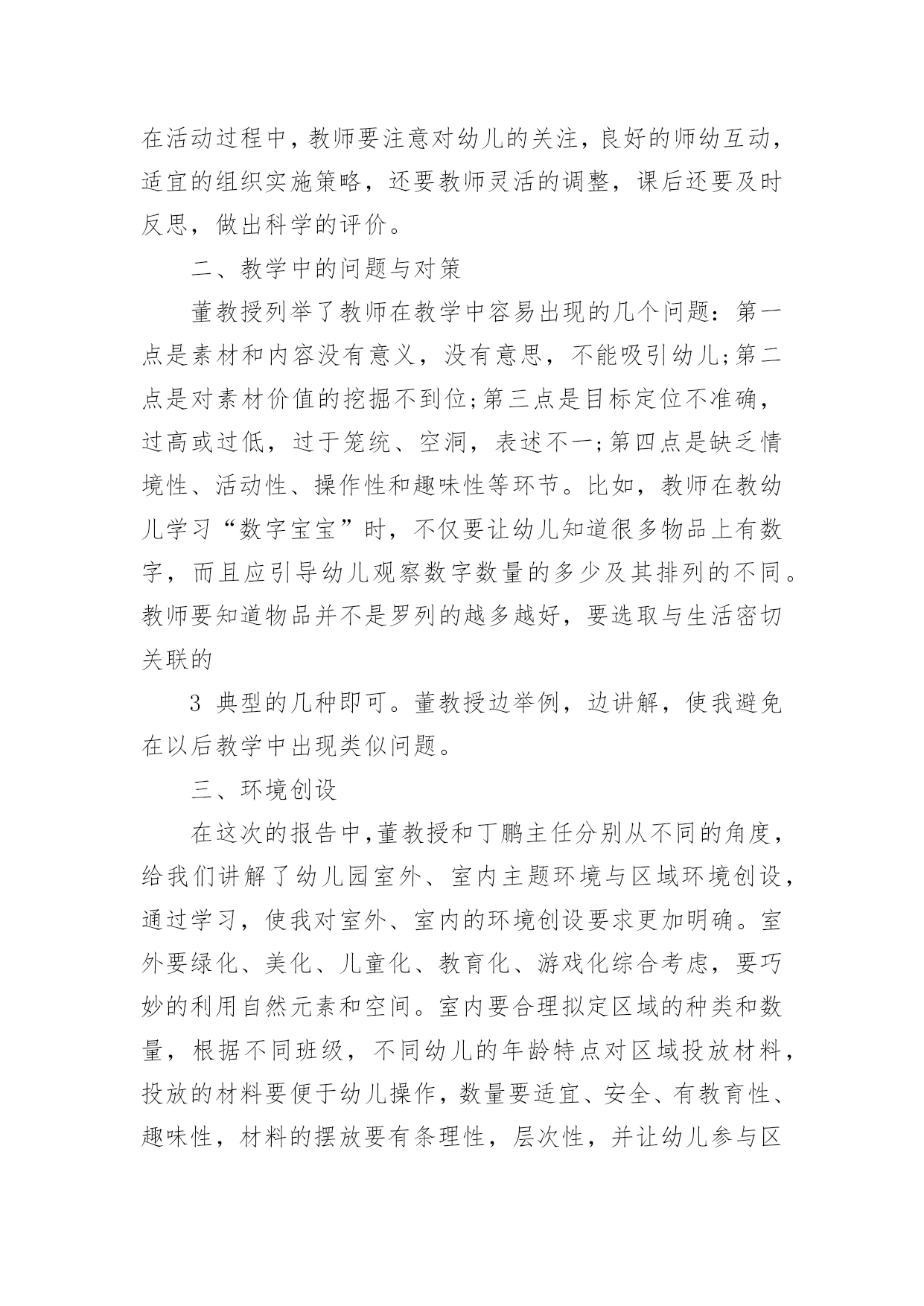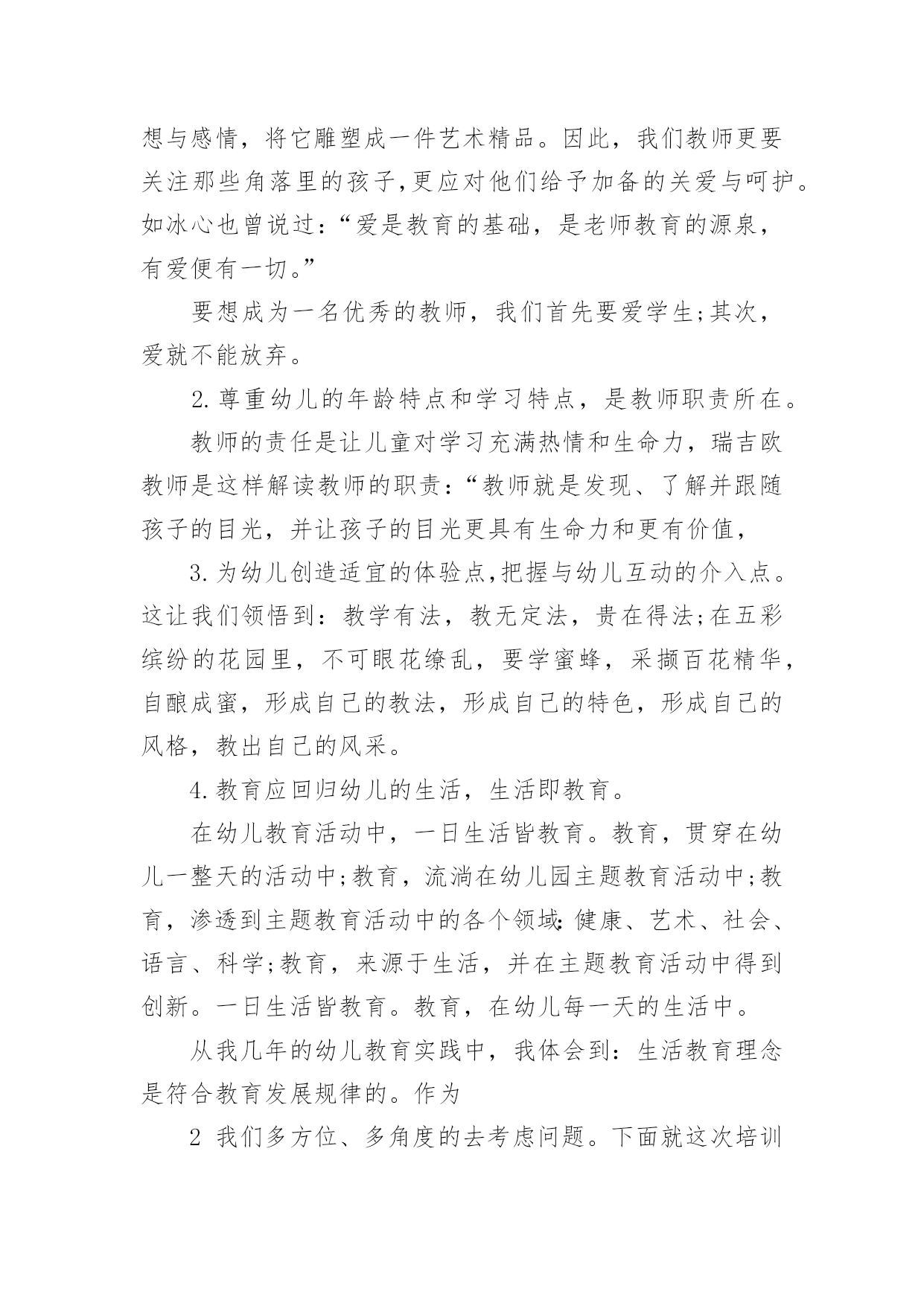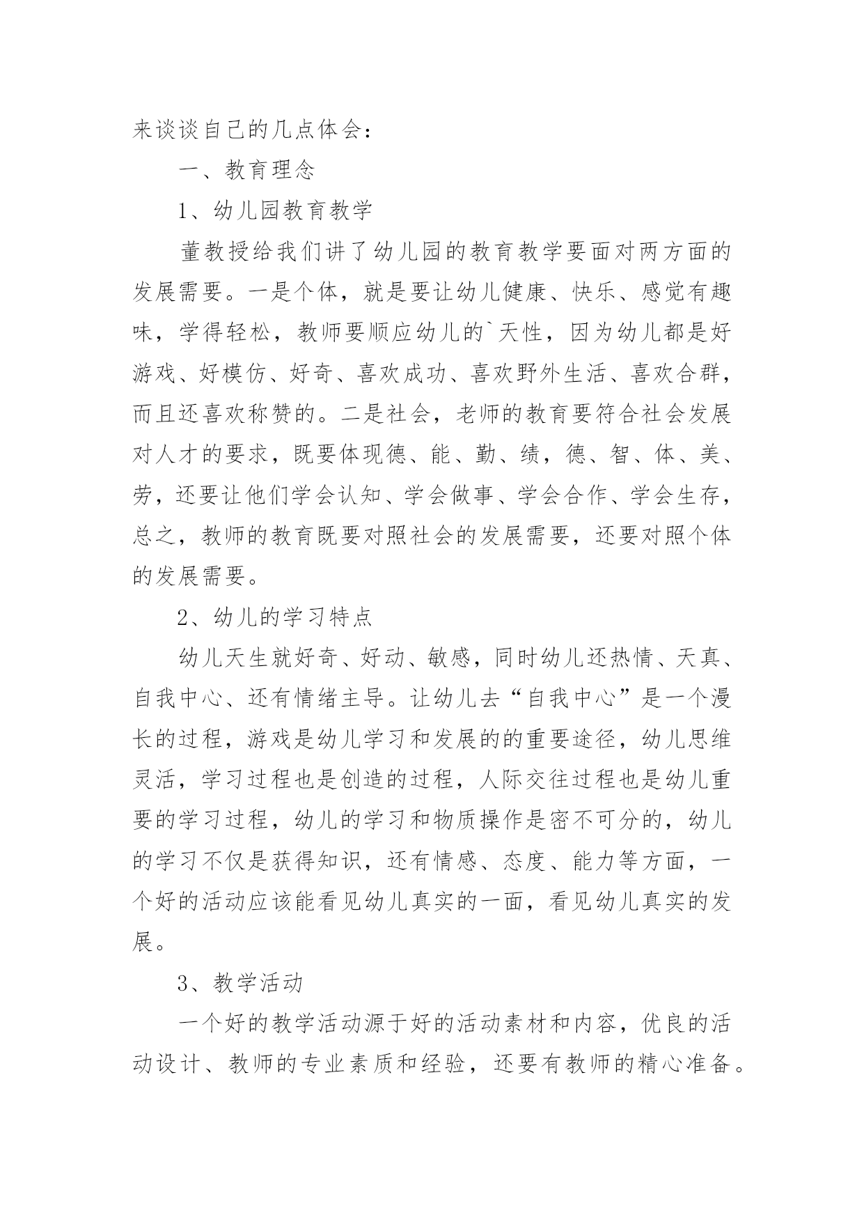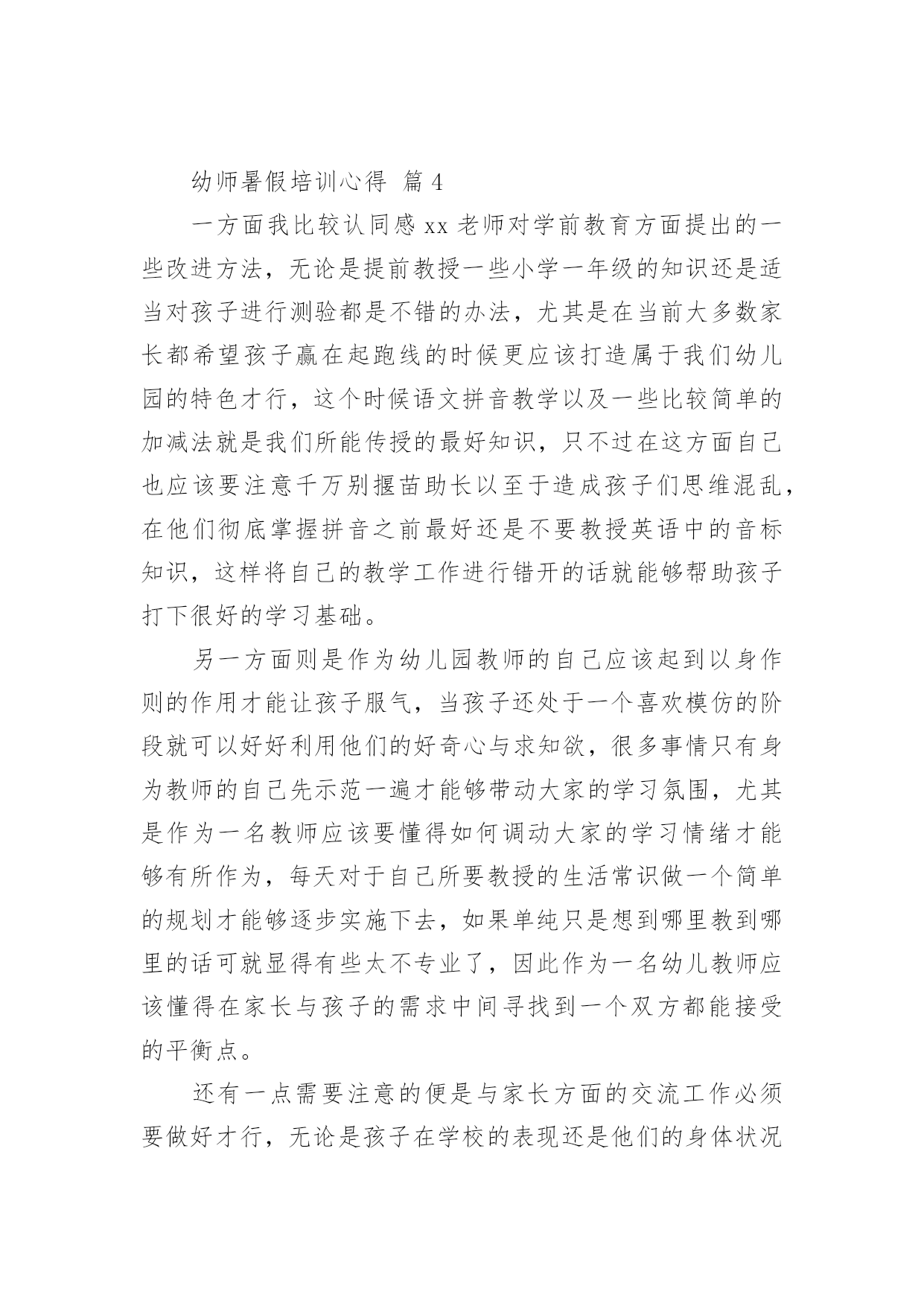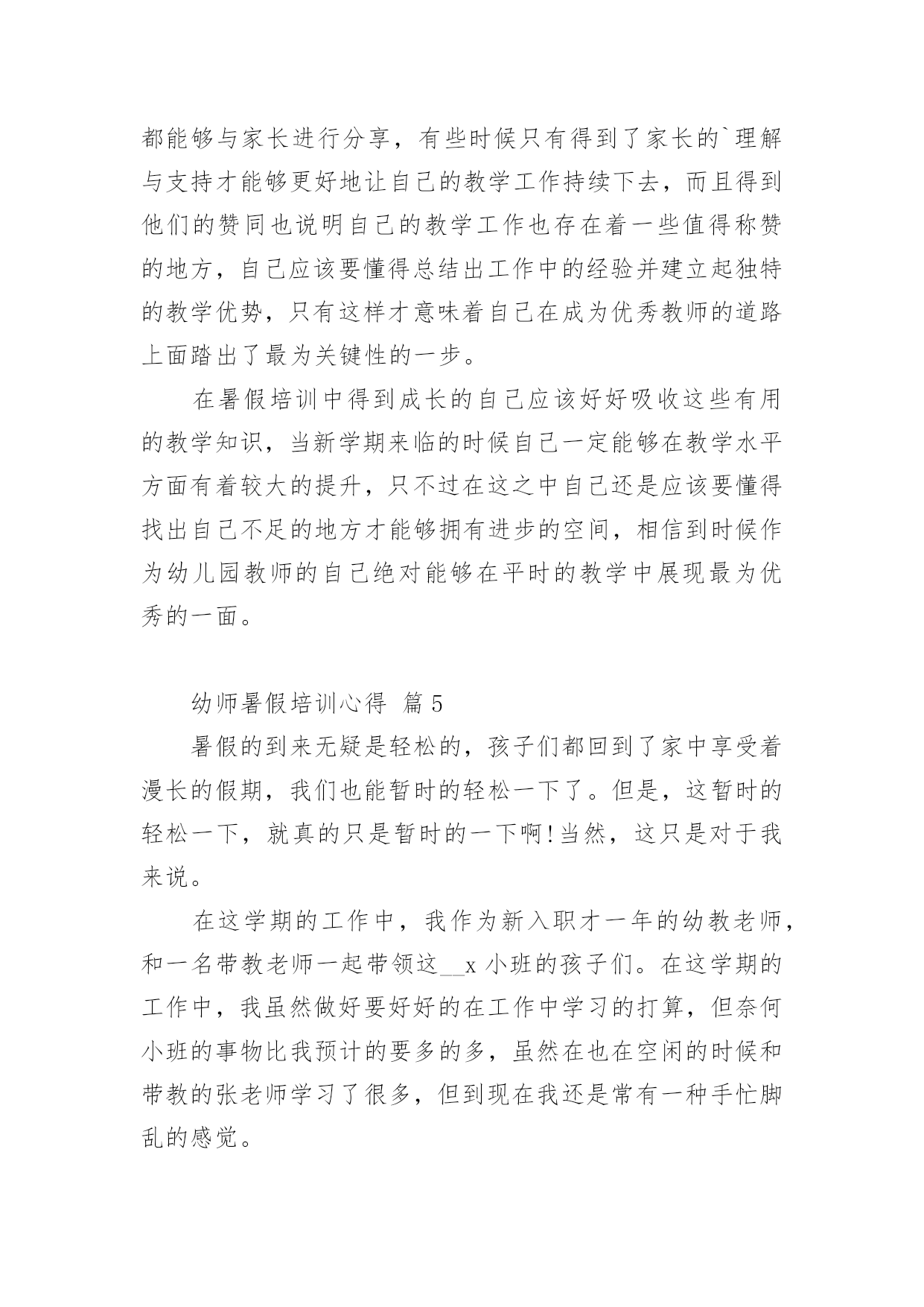 幼师暑假培训心得当我们备受启迪时,不如来好好地做个总结,写一篇心得体会,从而不断地丰富我们的思想。到底应如何写心得体会呢?下面是小编为大家收集的幼师暑假培训心得,欢迎阅读与收藏。幼师暑假培训心得篇1我们生活的这个世界需要爱心,在幼儿园学习和生活的孩子们更需要爱心,记得一位名人以前说过“谁不爱孩子,孩子就不爱他,只有爱孩子的人,才能教育好孩子。”作为幼教老师,教育好孩子是我们的终究目标,要想实现这个目标,就需要我们在日常的保教工作中全方位地奉献出我们的爱心。孩子上幼儿园是人生的一个重要起点,他从那里开始了真正的社会生活和学习生活。对于刚刚脱离父母怀抱的他们来说,幼儿园是一个全新而又陌生的环境。他们期望得到认可、称赞、同情、关心和爱惜,期望得到老师的爱。在那里,我不妨先举一个例子。康康是小班里一个十分聪明能干的小家伙,自我吃饭,自我尿尿,就是我们常常说的那种小大人型的,但不知怎样的,最近一个星期己经连续尿了三次床了,问他的妈妈,他在家里最近一段时光从来不尿床。这可怪了,究竟是怎样一回事呢?之后才明白,本来这个小家伙是成心的',他只是不中意老师对他的“不在乎”,想用这种极端的方式来引发老师的“在乎”,他是想从老师那里得到关心和爱惜。这是一颗多么天真而仁慈的童心啊!孩子的心灵是纯洁的,同时也是十分脆弱的,这就需要教师用自我一颗真诚、热爱、欣赏孩子的心去唤醒、去庇护。多与孩子交谈,多给孩子以爱抚,走进孩子的内心世界,用爱心来浇灌和庇护他们。哪怕只是一道温顺的眼光,也会让其争当“好孩子”,“乖孩子”的信念倍增。作为幼教老师,最大的过失莫过于对孩子没有爱,最大的悲伤莫过于失去了对孩子的爱。在幼教的日常工作中,爱心的体现无所不在。帮忙孩子系好带子、穿好衣服、盖好被子是爱心;尊重孩子、信任孩子、鼓励孩子是爱心……爱心是重要的,有了爱心,我们就会在日常的保教工作中,全身心肠投入,把这种博大而宽宏的爱心不断地转换成日常保教活动的耐心,职责心。从有利于孩子心理和生理健康成长的角度动身,不断加强自身幼教专业素养的提高,精心设计好每一个教学活动计划,让孩子在幼儿园健康快乐地成长。“教育技能的全部奥妙,也就在于如何爱惜孩子”。给孩子爱心,他就会认可你;给孩子爱心,他就会靠近你;给孩子爱心,他就会爱好你;给孩子爱心,他就会感到幼儿园如家一样暖和;给孩子爱心,他就会在学习和生活中去关爱别人。请不要吝惜我们的爱心,让我们在幼教岗位上全方位地奉献出我们的爱心,让孩子在爱的海洋里不断强健成长。幼师暑假培训心得篇2在培训学习中,专家们以鲜活的案例和丰富的知识内涵及精湛的理论阐述,给了我强烈的感染和深深的理论引领,每一天都能感受到思想火花的冲击;在一次次的感悟中,颇感自己的责任重大、知识贫乏。通过这次培训,收获颇丰、感想颇深:延长、开阔了我的知识视线,思考问题能站在更高的境界,许多疑问得到了解决或者启发。对我们的教育与课程实施及对教育的其它领域又有了一个新的认识。下面将我的学习心得小结如下一、对“做自身实践的研究者――让研究成为教师的工作方式。”的体会。讲座中,我能感受到沈老师沉静的思考,倾听自己内心深处的声音,反思和挖掘自我,从而建构起自己独特见解和风格的教育理论和实践体系的过程,我想,也许这就是优秀教师的特质。做自身实践的研究者――让研究成为教师的工作方式。这让我们深刻的体会到教研的重要性,并对研究的内容和方法有了新的认识和理解,也让我们感受到其实教研并不是遥不可及的事情,使我们对教研工作的开展有了进一步的兴趣和信心。二、对“研生研学,让教师的教有效地为幼儿主动的学服务。”的感想。1.了解幼儿的差异点――让差异成为教育的资源,让教育适应每个幼儿的需要。教师应该是一位雕塑大师,能将一块坯材,用自己的思想与感情,将它雕塑成一件艺术精品。因此,我们教师更要关注那些角落里的孩子,更应对他们给予加备的关爱与呵护。如冰心也曾说过:“爱是教育的基础,是老师教育的源泉,有爱便有一切。”要想成为一名优秀的教师,我们首先要爱学生;其次,爱就不能放弃。2.尊重幼儿的年龄特点和学习特点,是教师职责所在。教师的责任是让儿童对学习充满热情和生命力,瑞吉欧教师是这样解读教师的职责:“教师就是发现、了解并跟随孩子的目光,并让孩子的目光更具有生命力和更有价值,3.为幼儿创造适宜的体验点,把握与幼儿互动的介入点。这让我们领悟到:教学有法,教无定法,贵在得法;在五彩缤纷的花园里,不可眼花缭乱,要学蜜蜂,采撷百花精华,自酿成蜜,形成自己的教法,形成自己的特色,形成自己的风格,教出自己的风采。4.教育应回归幼儿的生活,生活即教育。在幼儿教育活动中,一日生活皆教育。教育,贯穿在幼儿一整天的活动中;教育,流淌在幼儿园主题教育活动中;教育,渗透到主题教育活动中的各个领域:健康、艺术、社会、语言、科学;教育,来