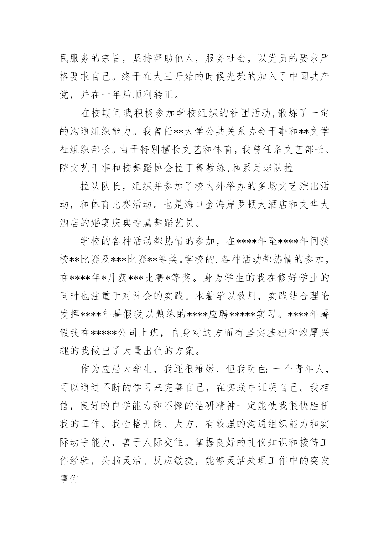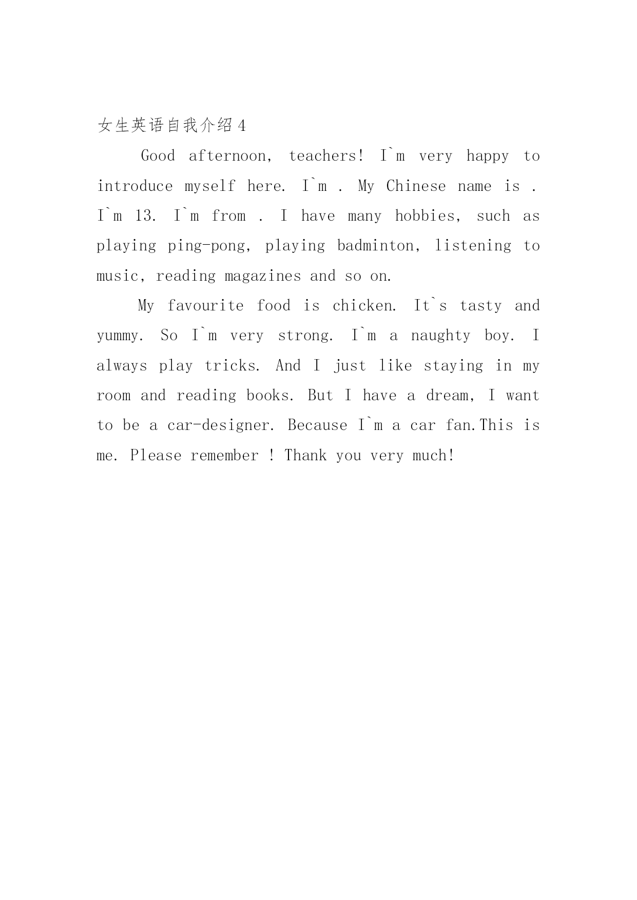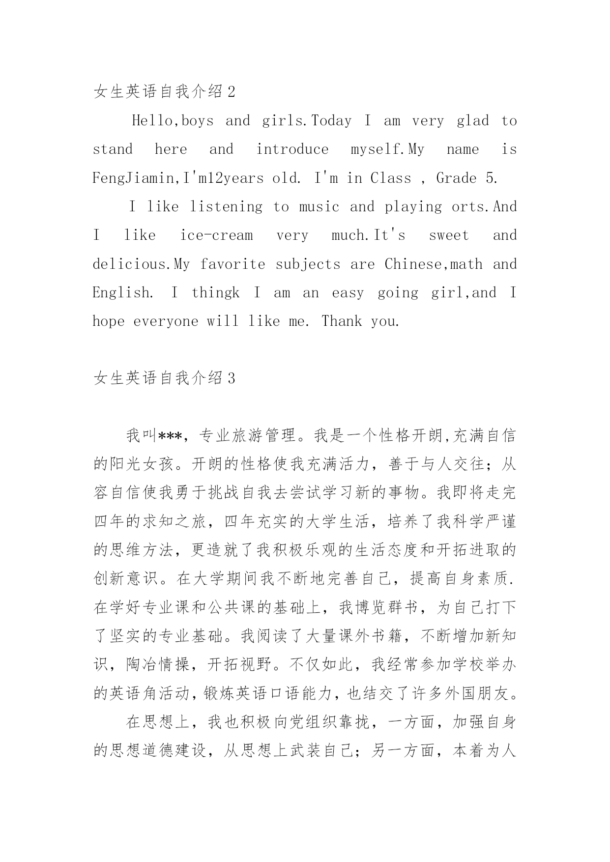 女生英语自我介绍当到达一个新的环境后,我们时常会需要作自我介绍,自我介绍是让陌生人彼此认识的好方法。到底应如何写自我介绍呢?下面是小编帮大家整理的女生英语自我介绍,希望对大家有所帮助。女生英语自我介绍1Goodafternoon,teachers!Today,Imveryhappytomakeaspeechhere.Now,letmeintroducemyself.MynameisZhuRuijie.MyEnglishnameisMolly.Im12.IcomefromClass1Grade6ofTongPuNo.2PrimarySchool.Imanactivegirl.Ilikeplayingbasketball.BecauseIthinkitsveryinteresting.Idliketoeatpotatoes.Theyretasty.Myfavouritecolourisgreen.AndIlikemathbest.Itsfun.Ontheweekend,Ilikereadingbooksinmyroom.Ihaveahappyfamily.Myfatheristallandstrong.Mymotherishard-workingandtall,too.Mybrotherissmart.AndImagoodstudent.Mydreamistobeateacher,becauseIwanttohelpthepoorchildreninthefuture.Thankyouforlistening!Pleaserememberme!女生英语自我介绍2Hello,boysandgirls.TodayIamverygladtostandhereandintroducemyself.MynameisFengJiamin,I'm12yearsold.I'minClass,Grade5.Ilikelisteningtomusicandplayingorts.AndIlikeice-creamverymuch.It'ssweetanddelicious.MyfavoritesubjectsareChinese,mathandEnglish.IthingkIamaneasygoinggirl,andIhopeeveryonewilllikeme.Thankyou.女生英语自我介绍3我叫***,专业旅游管理。我是一个性格开朗,充满自信的阳光女孩。开朗的性格使我充满活力,善于与人交往;从容自信使我勇于挑战自我去尝试学习新的事物。我即将走完四年的求知之旅,四年充实的大学生活,培养了我科学严谨的思维方法,更造就了我积极乐观的生活态度和开拓进取的创新意识。在大学期间我不断地完善自己,提高自身素质.在学好专业课和公共课的基础上,我博览群书,为自己打下了坚实的专业基础。我阅读了大量课外书籍,不断增加新知识,陶冶情操,开拓视野。不仅如此,我经常参加学校举办的英语角活动,锻炼英语口语能力,也结交了许多外国朋友。在思想上,我也积极向党组织靠拢,一方面,加强自身的思想道德建设,从思想上武装自己;另一方面,本着为人民服务的宗旨,坚持帮助他人,服务社会,以党员的要求严格要求自己。终于在大三开始的时候光荣的加入了中国共产党,并在一年后顺利转正。在校期间我积极参加学校组织的社团活动,锻炼了一定的沟通组织能力。我曾任**大学公共关系协会干事和**文学社组织部长。由于特别擅长文艺和体育,我曾任系文艺部长、院文艺干事和校舞蹈协会拉丁舞教练,和系足球队拉拉队队长,组织并参加了校内外举办的多场文艺演出活动,和体育比赛活动。也是海口金海岸罗顿大酒店和文华大酒店的婚宴庆典专属舞蹈艺员。学校的各种活动都热情的参加,在****年至****年间获校**比赛及***比赛**等奖。学校的.各种活动都热情的参加,在****年*月获***比赛*等奖。身为学生的我在修好学业的同时也注重于对社会的实践。本着学以致用,实践结合理论发挥****年暑假我以熟练的****应聘*****实习。****年暑假我在*****公司上班,自身对这方面有坚实基础和浓厚兴趣的我做出了大量出色的方案。作为应届大学生,我还很稚嫩,但我明白:一个青年人,可以通过不断的学习来完善自己,在实践中证明自己。我相信,良好的自学能力和不懈的钻研精神一定能使我很快胜任我的工作。我性格开朗、大方,有较强的沟通组织能力和实际动手能力,善于人际交往。掌握良好的礼仪知识和接待工作经验,头脑灵活、反应敏捷,能够灵活处理工作中的突发事件女生英语自我介绍4Goodafternoon,teachers!I`mveryhappytointroducemyselfhere.I`m.MyChinesenameis.I`m13.I`mfrom.Ihav