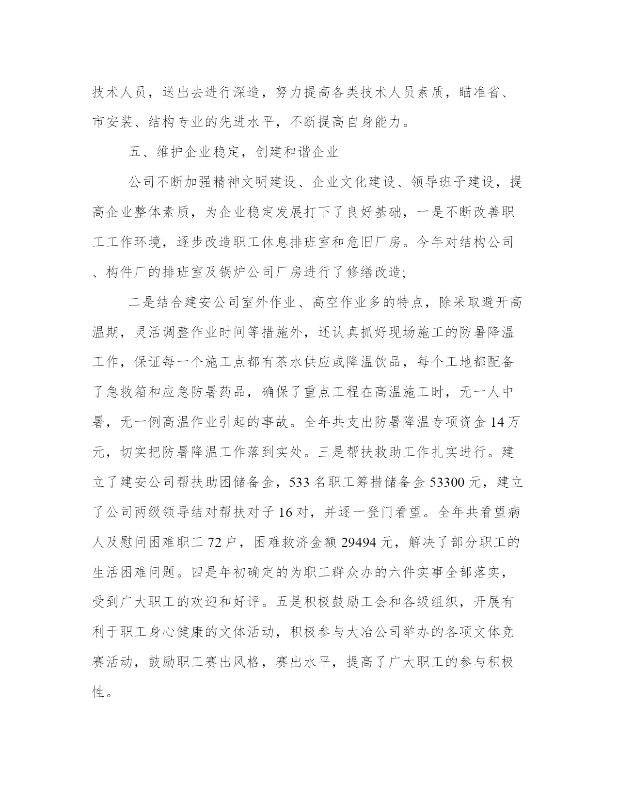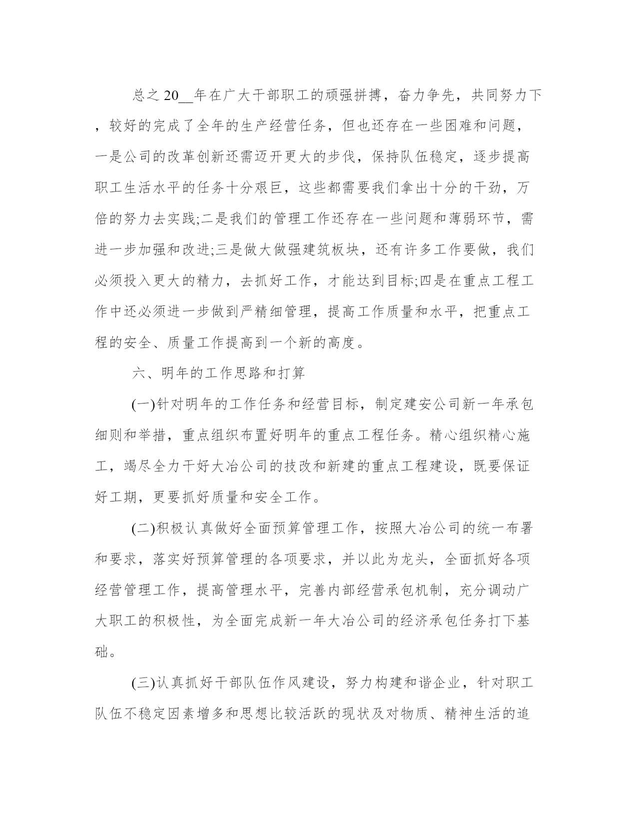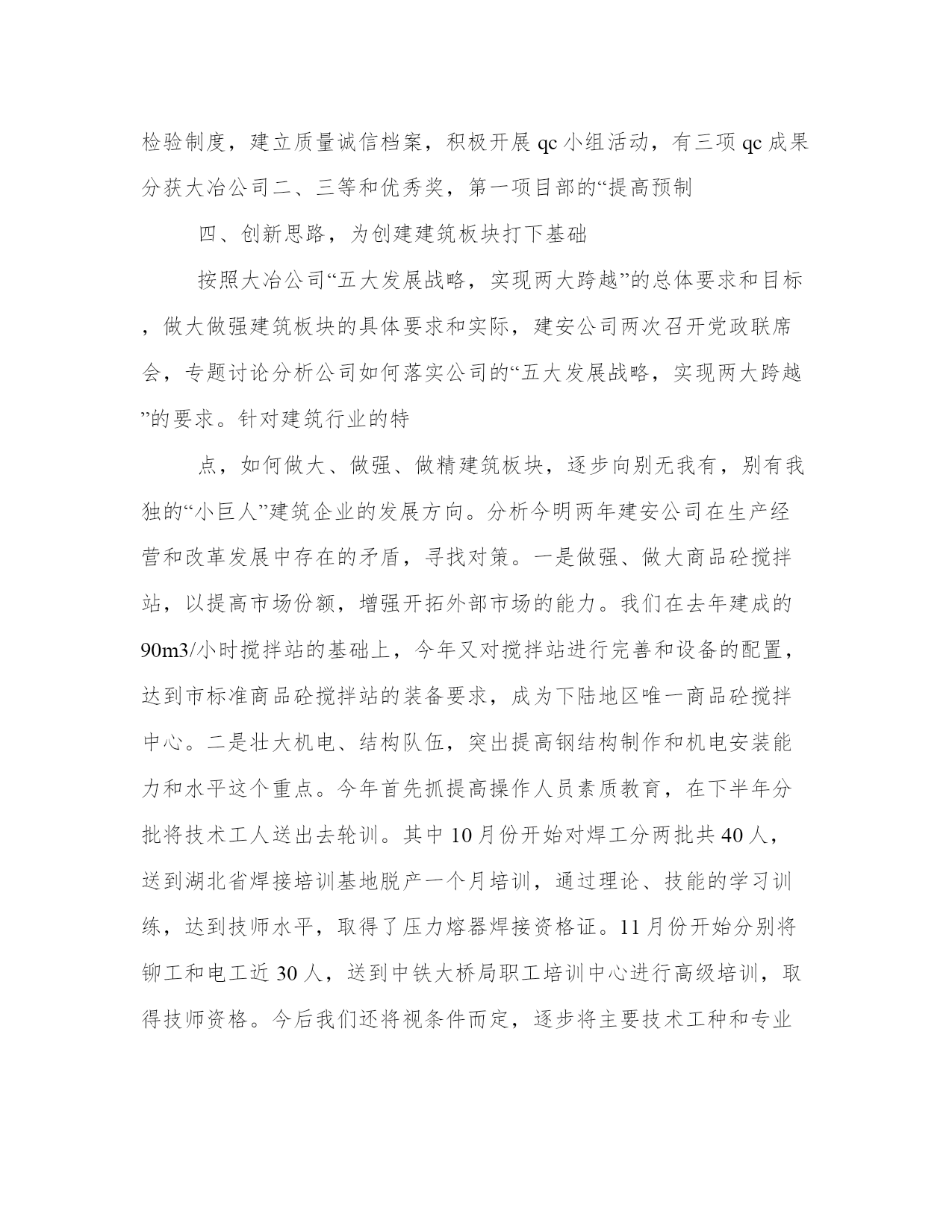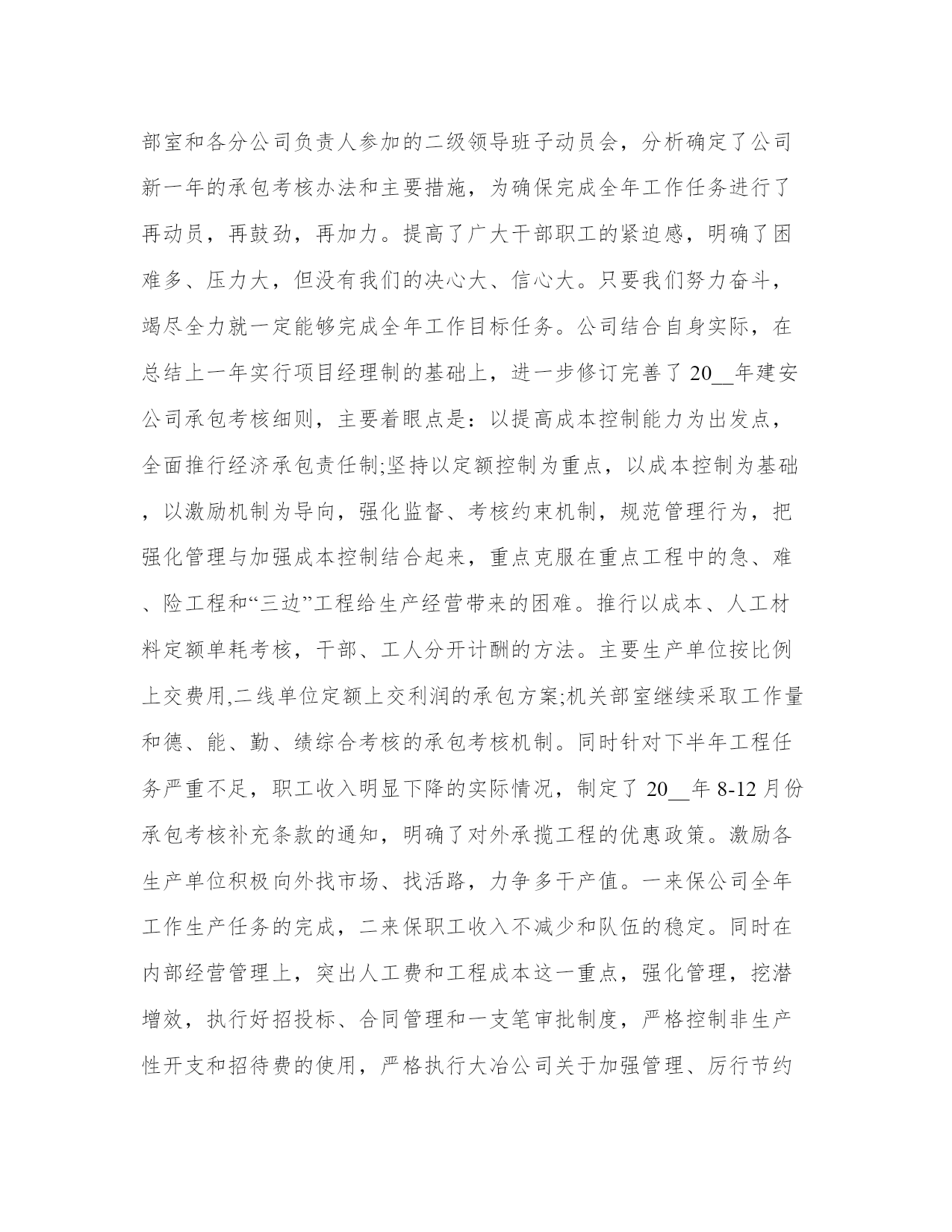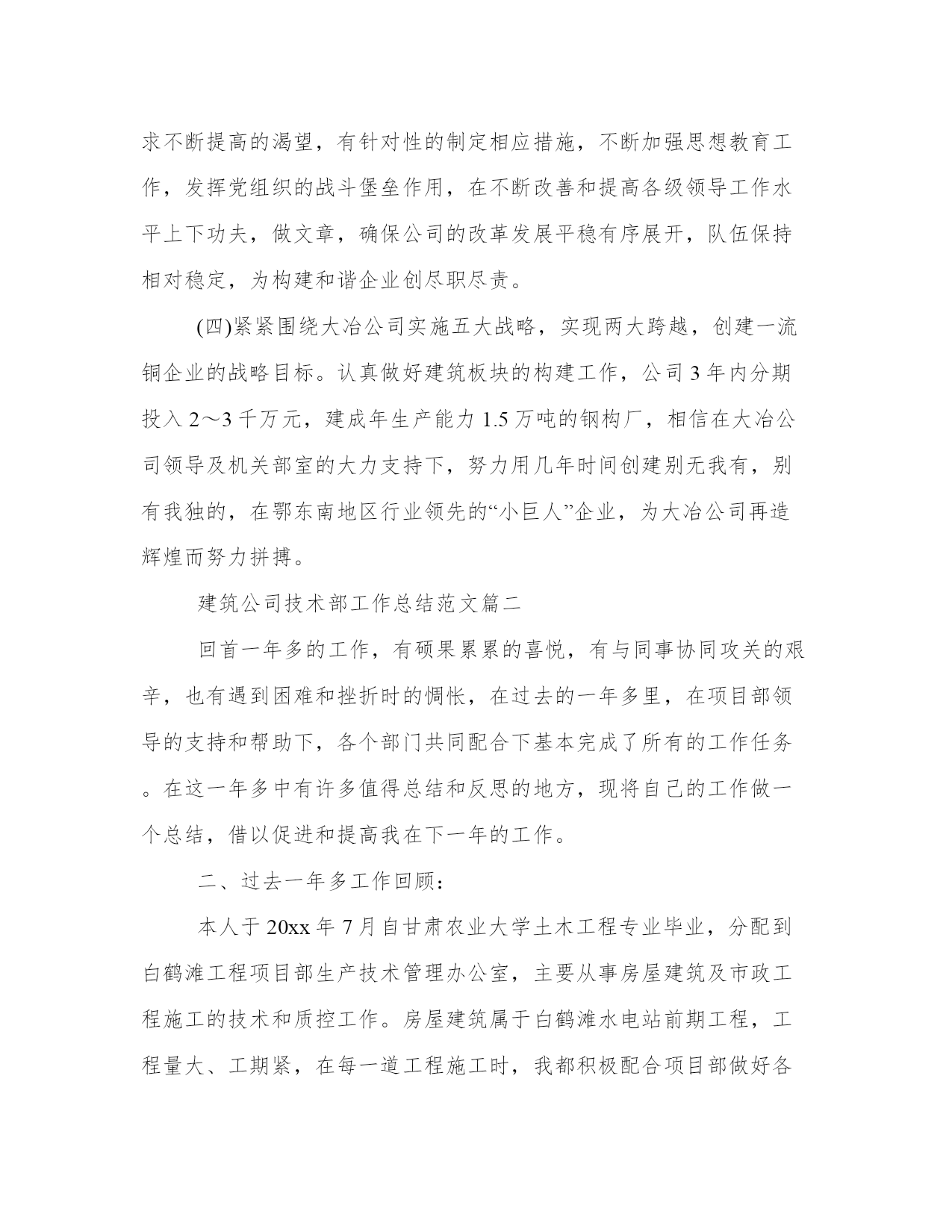 建筑公司技术部工作总结范文(三篇)总结是把一定阶段内的有关情况分析分析,做出有指导性的经验方法以及结论的书面材料,它可以使我们更有效率,不妨坐下来好好写写总结吧。怎样写总结才更能起到其作用呢?总结应该怎么写呢?这里给大家分享一些最新的总结书范文,方便大家学习。建筑公司技术部工作总结范文篇一公司根据全年的重点工程任务实际情况,分清主次,把握重点,认真组织各施工单位合理安排工期、调配施工力量。保证新上的公司重大技改项目按期完工,又服务好稀贵厂、冶炼厂新、老系统的检修改造,还适时保证铜板带项目的进度需求,采取了一些超常规的办法,集中兵力,分块突击,取得了明显的成效。20__年的主要施工项目及完成情况:大板铜精炼技改收尾完善、电解液净化、阳极泥处理、稀贵厂硒资源综合利用、稀贵厂分银渣综合利用、冶炼厂2#精炼炉圆盘浇铸机、冶炼厂35t锅炉改造、第九次新系统检修、职工总医院住院大楼、铜板带熔铸车间、铜板带消防循环水泵站、华盛小区住宅楼,除冶炼厂35t锅炉改造正在进行框架施工外其它均建成投产,施工进度、质量达到公司总体要求。二、主要经济指标和利润完成情况今年在大冶公司新的考核指标和承包细则下达后,公司迅速召开了职代会和工作会,确定了我们的工作目标和举措。同时召开了机关部室和各分公司负责人参加的二级领导班子动员会,分析确定了公司新一年的承包考核办法和主要措施,为确保完成全年工作任务进行了再动员,再鼓劲,再加力。提高了广大干部职工的紧迫感,明确了困难多、压力大,但没有我们的决心大、信心大。只要我们努力奋斗,竭尽全力就一定能够完成全年工作目标任务。公司结合自身实际,在总结上一年实行项目经理制的基础上,进一步修订完善了20__年建安公司承包考核细则,主要着眼点是:以提高成本控制能力为出发点,全面推行经济承包责任制;坚持以定额控制为重点,以成本控制为基础,以激励机制为导向,强化监督、考核约束机制,规范管理行为,把强化管理与加强成本控制结合起来,重点克服在重点工程中的急、难、险工程和“三边”工程给生产经营带来的困难。推行以成本、人工材料定额单耗考核,干部、工人分开计酬的方法。主要生产单位按比例上交费用,二线单位定额上交利润的承包方案;机关部室继续采取工作量和德、能、勤、绩综合考核的承包考核机制。同时针对下半年工程任务严重不足,职工收入明显下降的实际情况,制定了20__年8-12月份承包考核补充条款的通知,明确了对外承揽工程的优惠政策。激励各生产单位积极向外找市场、找活路,力争多干产值。一来保公司全年工作生产任务的完成,二来保职工收入不减少和队伍的稳定。同时在内部经营管理上,突出人工费和工程成本这一重点,强化管理,挖潜增效,执行好招投标、合同管理和一支笔审批制度,严格控制非生产性开支和招待费的使用,严格执行大冶公司关于加强管理、厉行节约,严格控制非生产性开支的若干规定,取得了良好的效果。目前,预计完成财务收入8200万元,预计能够实现考核利润指标730万元,其它技术经济指标预计都能达到大冶公司年初下达的要求。三、安全、质量管理工作年初安全工作会议后,公司及时召开了建安公司安全工作会,并按惯例定期召开了安全委员会,分析布置落实了大冶公司安全工作的各项要求、规定和指导意见。严格安全生产目标承包责任考核,奖罚兑现。坚持做到重点部位监护到位,重点项目监管有力,重点人员监督到点,把安全工作落到实处。重点对外协工326人进行了三级安全教育,利用党委中心组扩大会对二级领导班子成员进行劳动保护与安全管理专题教育。还对60余名特种作业人员进行了专业培训,通过全面抓好安全工作的宣传教育和现场违纠工作,深入开展“青安岗”、“安康杯”竞赛和“安全宣教月”等活动,做好安全预防监督检查工作,促进安全工作良性发展。全年轻伤1人,未发生重大的人身、设备事故和交通事故。荣获了黄石市“建设工程管理先进单位”称号。质量管理方面,我们认真按照iso9001质量管理体系的要求,利用双休日组织内审员及两级班子、科室负责人计107人请中建协专家进行授课,取得了明显成效,为按期完成评审和换版培训工作打下良好基础。公司坚持持续改进质量管理体系,健全质量责任制和质量考核机制,确保质量管理体系规范有效运行,强化了定期检查考核的力度。加强对重点工程的质量监督检查工作,强调过程控制,强化三级检验制度,建立质量诚信档案,积极开展qc小组活动,有三项qc成果分获大冶公司二、三等和优秀奖,第一项目部的“提高预制四、创新思路,为创建建筑板块打下基础按照大冶公司“五大发展战略,实现两大跨越”的总体要求和目标,做大做强建筑板块的具体要求和实际,建安公司两次召开党政联席会,专题讨论分析公司如何落实公司的“五大发展战略,实现两大跨越”的要求。针对建筑行业的特点,如何做大、做强、做精建筑板块,逐步向别无我