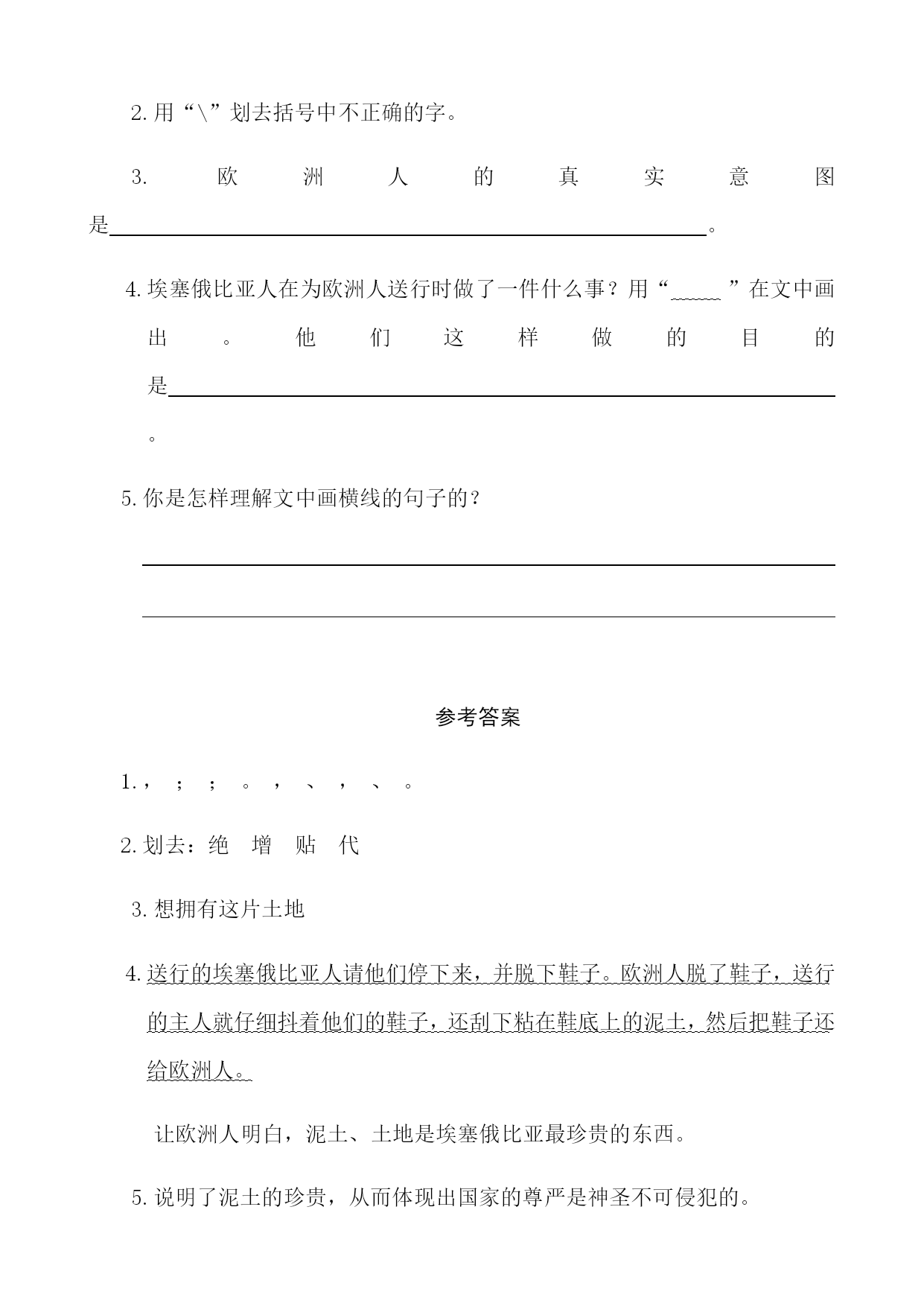 类文阅读-21*三黑和土地泥土最珍贵两个欧洲人来到埃塞俄比亚。他们到处奔波,绘制地图。国王知道后,就派了一个向导去帮忙。欧洲人结束工作后,向导回到首都,报告国王说:“陛下,欧洲人把见到的一切都画到地图上。他们到过尼罗河发源地塔那湖,然后顺流而下;他们找到了金银矿,把矿产、森林、大大小小的河流都记了下来。”国王对欧洲人的意图思考了很久,(绝决)定接见欧洲人。欧洲人到了皇宫,国王亲自接见并宴请他们,还(赠增)送了贵重的礼物。最后国王派了几个人送欧洲人上船。欧洲人到了河边,正要上船时,送行的埃塞俄比亚人请他们停