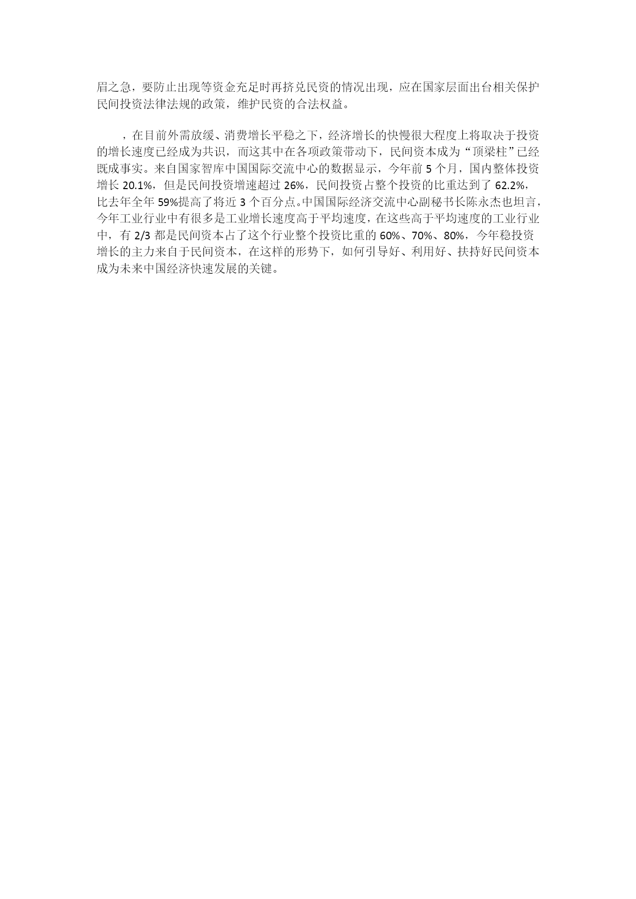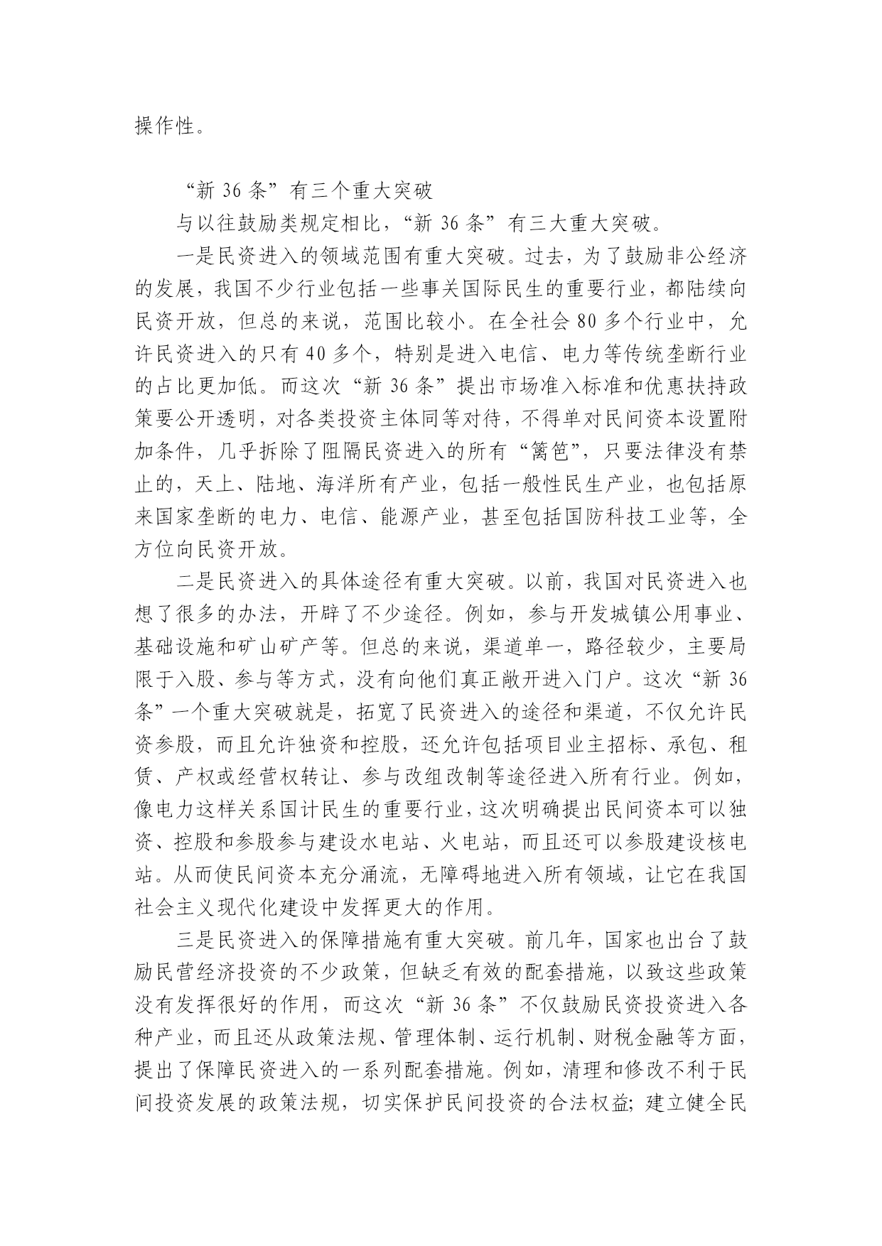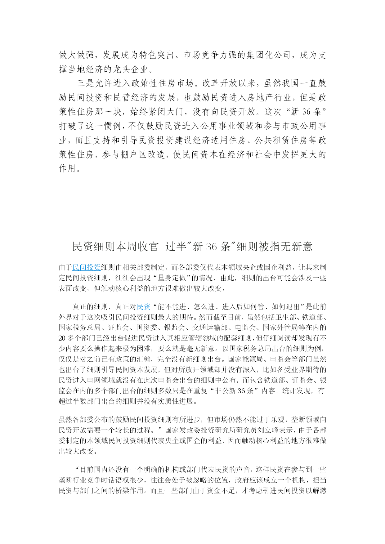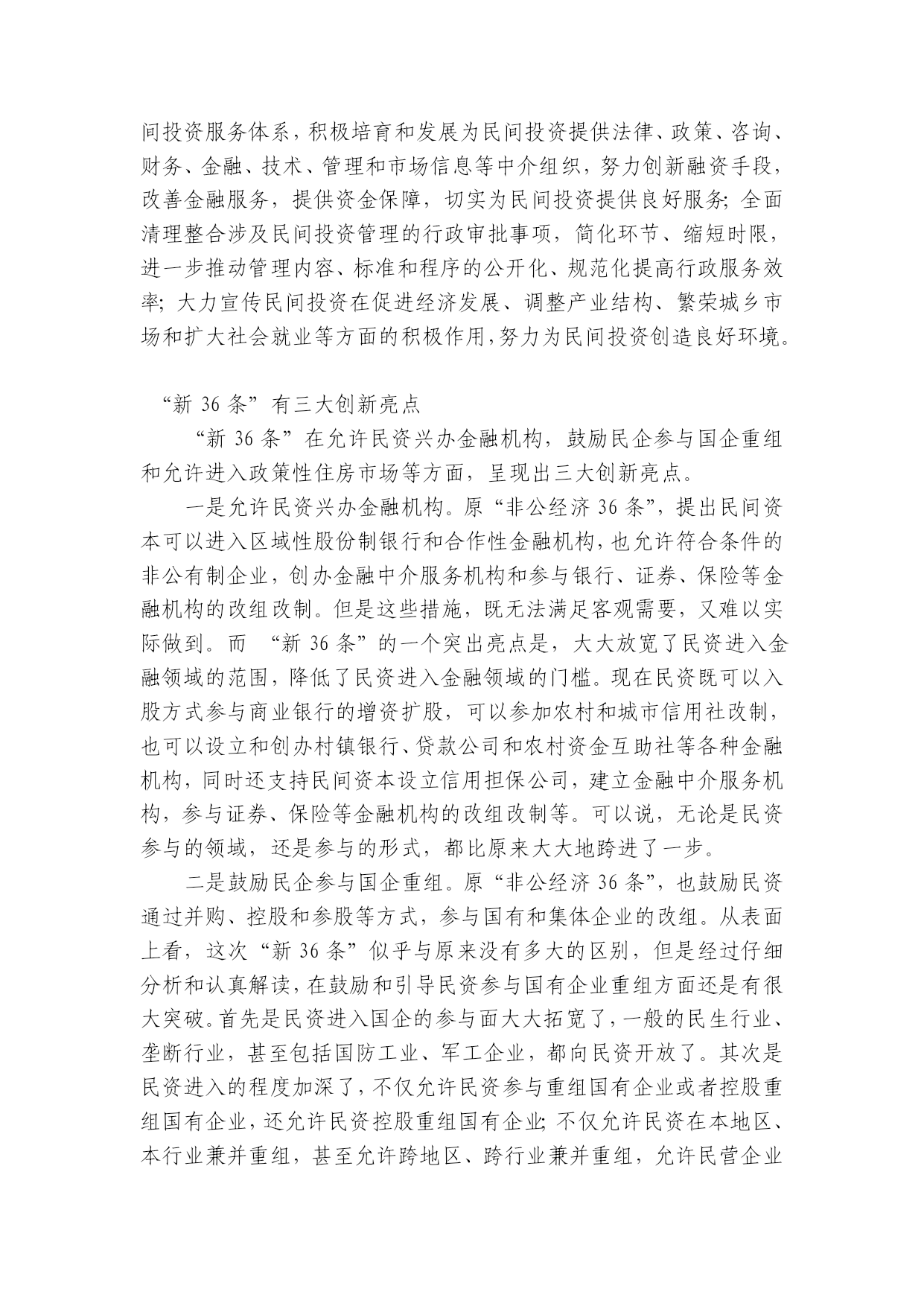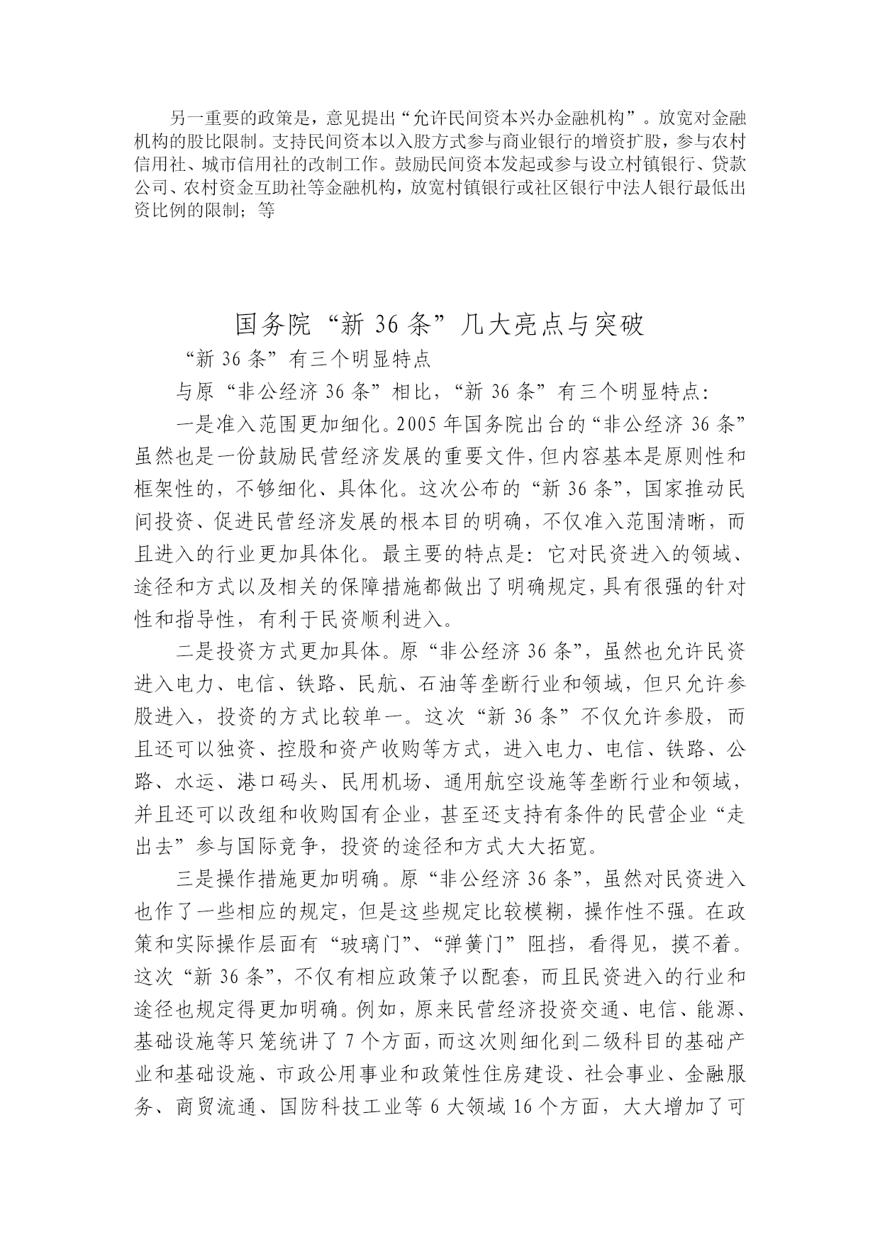 民资新36条公布允许民间资本兴办金融机构经过近两个月的修改,中国政府终于公布了支持民间投资的“新36条”,5月13日,国务院发布《关于鼓励和引导民间投资健康发展的若干意见》提出,要进一步拓宽民间投资的领域和范围。意见强调了“非禁准入”原则,鼓励和引导民间资本进入法律法规未明确禁止准入的行业和领域。规范设置投资准入门槛,创造公平竞争、平等准入的市场环境。意见要求,市场准入标准和优惠扶持政策要公开透明,对各类投资主体同等对待,不得单对民间资本设置附加条件。2005年,国务院颁布了《国务院关于鼓励支持和引导个体私营等非公有制经济发展的若干意见》,即后来所称的“非公经济36条”、或“老36条”,希望能破除阻碍民间投资发展的种种门槛。几年过去,虽然民营企业生存空间有所拓展,但羁绊民企发展的“玻璃门”“弹簧门”并未打破。今年3月24日国务院召开常务会议,确定了进一步鼓励和引导民间投资健康发展的政策措施。本次出台意见,是对国务院有关决定的落实。意见提出要“明确界定政府投资范围”。政府投资主要用于关系国家安全、市场不能有效配置资源的经济和社会领域。对于可以实行市场化运作的基础设施、市政工程和其他公共服务领域,应鼓励和支持民间资本进入。意见要求,鼓励和引导民间资本进入基础产业和基础设施领域,包括交通运输、水利工程、电力、石油天然气、电信建设以及土地整治和矿产资源勘探开发等。此外,鼓励和引导民间资本进入市政公用事业和政策性住房建设领域。支持民间资本进入城市供水、供气、供热、污水和垃圾处理、公共交通、城市园林绿化等领域;支持和引导民间资本投资建设经济适用住房、公共租赁住房等政策性住房,参与棚户区改造,享受相应的政策性住房建设政策。意见提出,鼓励和引导民间资本进入社会事业领域。支持民间资本兴办各类医院、社区卫生服务机构、疗养院、门诊部、诊所、卫生所(室)等医疗机构,参与公立医院转制改组;支持民间资本兴办高等学校、中小学校、幼儿园、职业教育等各类教育和社会培训机构。另一重要的政策是,意见提出“允许民间资本兴办金融机构”。放宽对金融机构的股比限制。支持民间资本以入股方式参与商业银行的增资扩股,参与农村信用社、城市信用社的改制工作。鼓励民间资本发起或参与设立村镇银行、贷款公司、农村资金互助社等金融机构,放宽村镇银行或社区银行中法人银行最低出资比例的限制;等国务院“新36条”几大亮点与突破“新36条”有三个明显特点与原“非公经济36条”相比,“新36条”有三个明显特点:一是准入范围更加细化。2005年国务院出台的“非公经济36条”虽然也是一份鼓励民营经济发展的重要文件,但内容基本是原则性和框架性的,不够细化、具体化。这次公布的“新36条”,国家推动民间投资、促进民营经济发展的根本目的明确,不仅准入范围清晰,而且进入的行业更加具体化。最主要的特点是:它对民资进入的领域、途径和方式以及相关的保障措施都做出了明确规定,具有很强的针对性和指导性,有利于民资顺利进入。二是投资方式更加具体。原“非公经济36条”,虽然也允许民资进入电力、电信、铁路、民航、石油等垄断行业和领域,但只允许参股进入,投资的方式比较单一。这次“新36条”不仅允许参股,而且还可以独资、控股和资产收购等方式,进入电力、电信、铁路、公路、水运、港口码头、民用机场、通用航空设施等垄断行业和领域,并且还可以改组和收购国有企业,甚至还支持有条件的民营企业“走出去”参与国际竞争,投资的途径和方式大大拓宽。三是操作措施更加明确。原“非公经济36条”,虽然对民资进入也作了一些相应的规定,但是这些规定比较模糊,操作性不强。在政策和实际操作层面有“玻璃门”、“弹簧门”阻挡,看得见,摸不着。这次“新36条”,不仅有相应政策予以配套,而且民资进入的行业和途径也规定得更加明确。例如,原来民营经济投资交通、电信、能源、基础设施等只笼统讲了7个方面,而这次则细化到二级科目的基础产业和基础设施、市政公用事业和政策性住房建设、社会事业、金融服务、商贸流通、国防科技工业等6大领域16个方面,大大增加了可操作性。“新36条”有三个重大突破与以往鼓励类规定相比,“新36条”有三大重大突破。一是民资进入的领域范围有重大突破。过去,为了鼓励非公经济的发展,我国不少行业包括一些事关国际民生的重要行业,都陆续向民资开放,但总的来说,范围比较小。在全社会80多个行业中,允许民资进入的只有40多个,特别是进入电信、电力等传统垄断行业的占比更加低。而这次“新36条”提出市场准入标准和优惠扶持政策要公开透明,对各类投资主体同等对待,不得单对民间资本设置附加条件,几乎拆除了阻隔民资进入的所有“篱笆”,只要法律没有禁止的,天上、陆地、海洋所有产业,包括一般性民生产业,也包括原来国家垄断的电力、电信、能源产业,甚