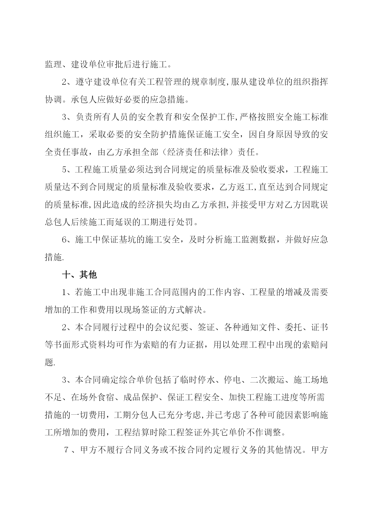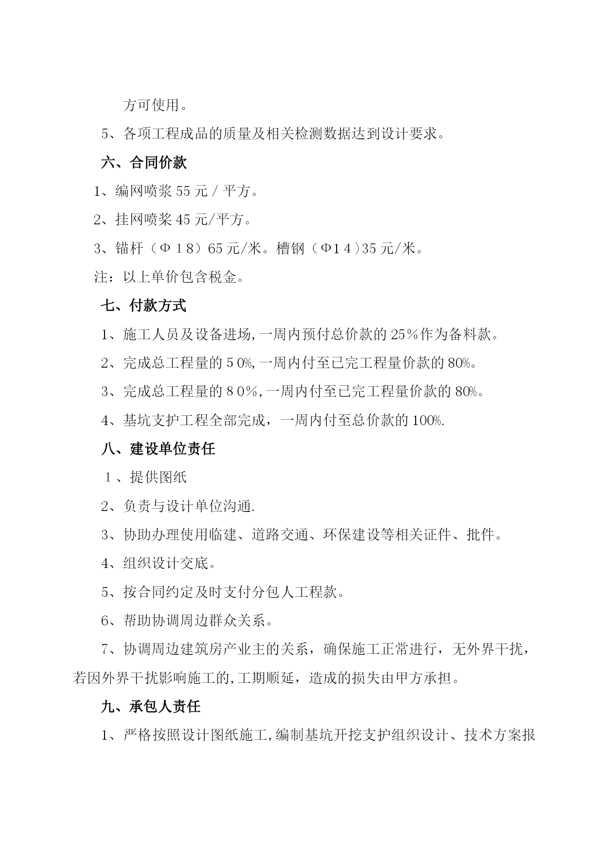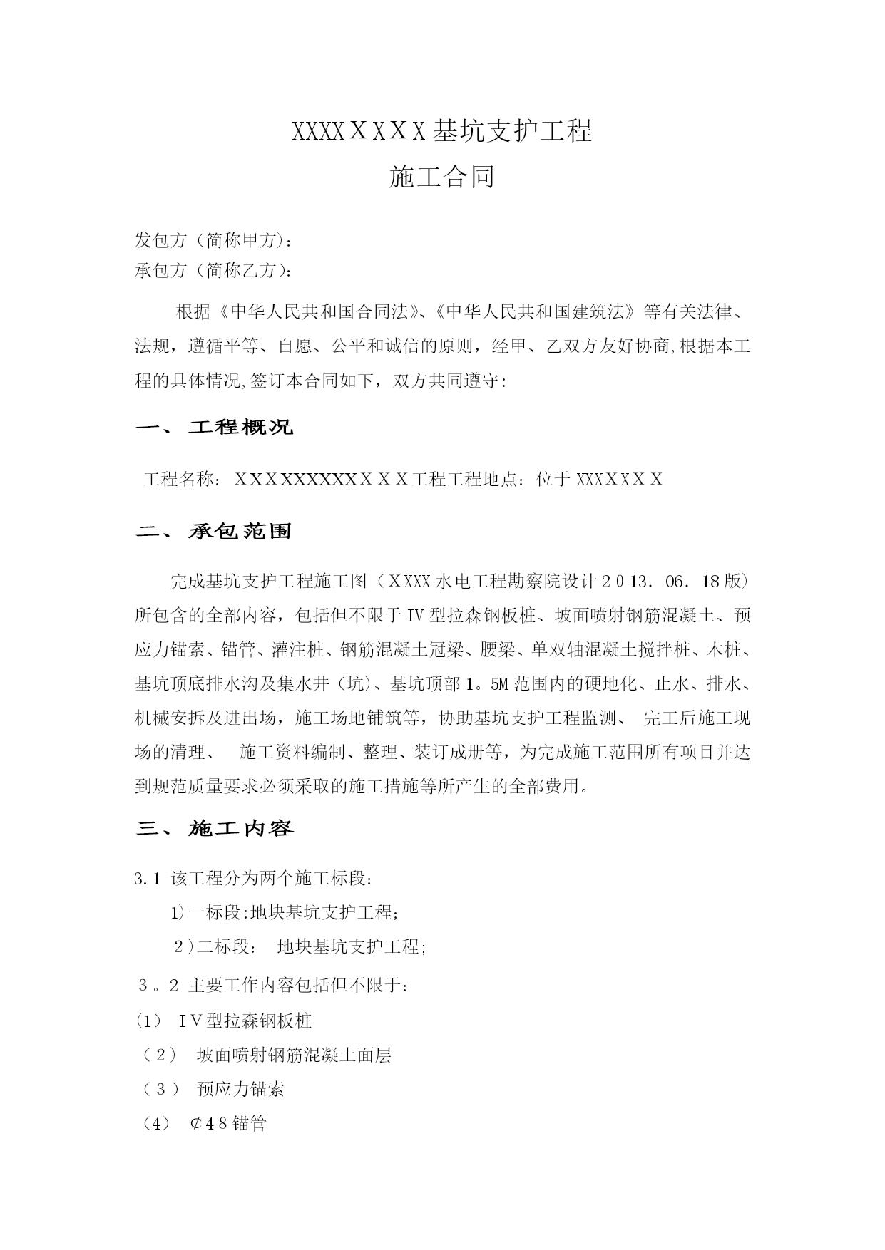 基坑支护合同(完整资料)(可以直接使用,可编辑优秀版资料,欢迎下载)基坑支护、工程承包合同建设单位:承包单位:签订时间:建设单位(甲方):承包单位(乙方):依照《中华人民共和国合同法》、《中华人民共和国建筑法》及其他有关法律、行政法规,遵循平等、自愿、公平和诚实信用的原则,三方就巨野康庄新型社区河畔花都小区8#、41#楼基坑支护工程事项协商一致,订立本合同。一、工程概况工程名称:工程地点:工程内容:基坑支护工程。二、工程承包范围承包范围:施工图范围内的基坑支护工程施工。三、承包方式包工、包料、包工期、包质量、包安全文明施工等。四、合同工期开工日期:年月日(暂定),实际开工日期以监理单位的书面通知为准。五、质量标准1、施工操作及成品质量符合国家规范标准。2、严格按施工图纸及设计方提供的有效变更施工。3、所有施工及成品质量符合国家规范验收规定.4、工程所用材料必须符合相关规范标准要求,经现场监理验收认可后方可使用。5、各项工程成品的质量及相关检测数据达到设计要求。六、合同价款1、编网喷浆55元/平方。2、挂网喷桨45元/平方。3、锚杆(Ф18)65元/米。槽钢(Ф14)35元/米。注:以上单价包含税金。七、付款方式1、施工人员及设备进场,一周内预付总价款的25%作为备料款。2、完成总工程量的50%,一周内付至已完工程量价款的80%。3、完成总工程量的80%,一周内付至已完工程量价款的80%。4、基坑支护工程全部完成,一周内付至总价款的100%.八、建设单位责任1、提供图纸2、负责与设计单位沟通.3、协助办理使用临建、道路交通、环保建设等相关证件、批件。4、组织设计交底。5、按合同约定及时支付分包人工程款。6、帮助协调周边群众关系。7、协调周边建筑房产业主的关系,确保施工正常进行,无外界干扰,若因外界干扰影响施工的,工期顺延,造成的损失由甲方承担。九、承包人责任1、严格按照设计图纸施工,编制基坑开挖支护组织设计、技术方案报监理、建设单位审批后进行施工。2、遵守建设单位有关工程管理的规章制度,服从建设单位的组织指挥协调。承包人应做好必要的应急措施。3、负责所有人员的安全教育和安全保护工作,严格按照安全施工标准组织施工,采取必要的安全防护措施保证施工安全,因自身原因导致的安全责任事故,由乙方承担全部(经济责任和法律)责任。5、工程施工质量必须达到合同规定的质量标准及验收要求,工程施工质量达不到合同规定的质量标准及验收要求,乙方返工,直至达到合同规定的质量标准,因此造成的经济损失均由乙方承担,并接受甲方对乙方因耽误总包人后续施工而延误的工期进行处罚。6、施工中保证基坑的施工安全,及时分析施工监测数据,并做好应急措施.十、其他1、若施工中出现非施工合同范围内的工作内容、工程量的增减及需要增加的工作和费用以现场签证的方式解决。2、本合同履行过程中的会议纪要、签证、各种通知文件、委托、证书等书面形式资料均可作为索赔的有力证据,用以处理工程中出现的索赔问题.3、本合同确定综合单价包括了临时停水、停电、二次搬运、施工场地不足、在场外食宿、成品保护、保证工程安全、加快工程施工进度等所需措施的一切费用,工期分包人已充分考虑,并已考虑了各种可能因素影响施工所增加的费用,工程结算时除工程签证外其它单价不作调整。7、甲方不履行合同义务或不按合同约定履行义务的其他情况。甲方承担违约责任,赔偿因其违约给承包人造成的经济损失,顺延延误的工期。8、承包人不履行合同义务或不按合同约定履行义务的其他情况。承包人承担违约责任,赔偿因其违约给发包人造成的损失。9、一方违约后,另一方要求违约方继续履行合同时,违约方承担上述违约责任后仍应继续履行合同。10、本合同双方签字盖章生效,工程验收完工一切工程款项结清后即告终止。11、对发生的争议问题可协商解决,若协商未能达成共识,应在工程所在地选择仲裁或诉讼解决。12、本合同一式肆份,双方各执两份。未尽事宜,双方协商解决。建设单位:(公章)承包单位:法定代表人:法定代表人:委托代表人:委托代表人:电话:电话:年月日XXXXXXXX基坑支护工程施工合同发包方(简称甲方):承包方(简称乙方):根据《中华人民共和国合同法》、《中华人民共和国建筑法》等有关法律、法规,遵循平等、自愿、公平和诚信的原则,经甲、乙双方友好协商,根据本工程的具体情况,签订本合同如下,双方共同遵守:一、工程概况工程名称:XXXXXXXXXXXX工程工程地点:位于XXXXXXX二、承包范围完成基坑支护工程施工图(XXXX水电工程勘察院设计2013.06.18版)所包含的全部内容,包括但不限于IV型拉