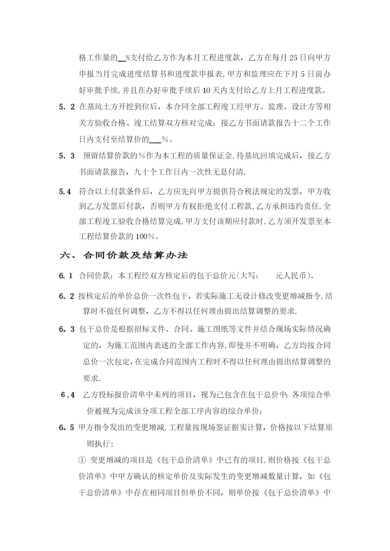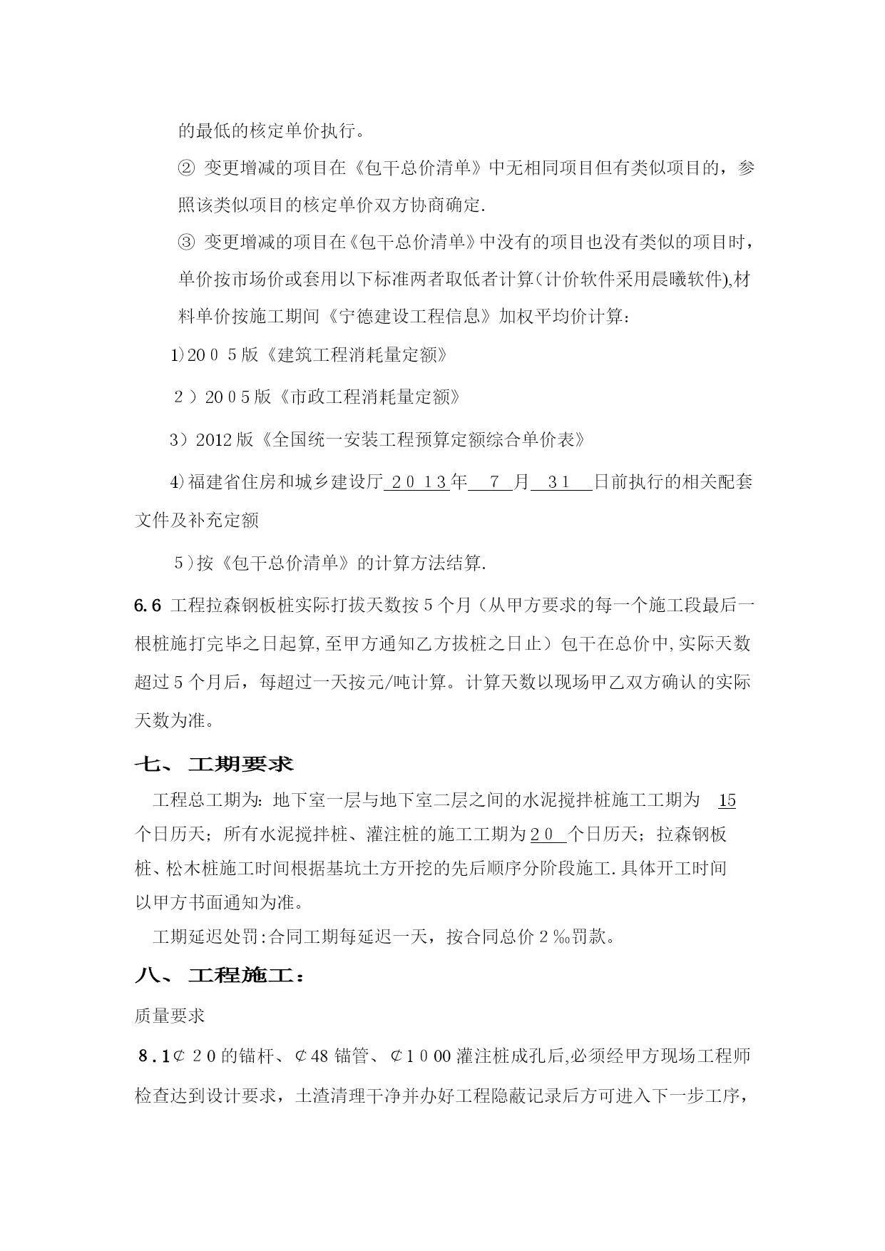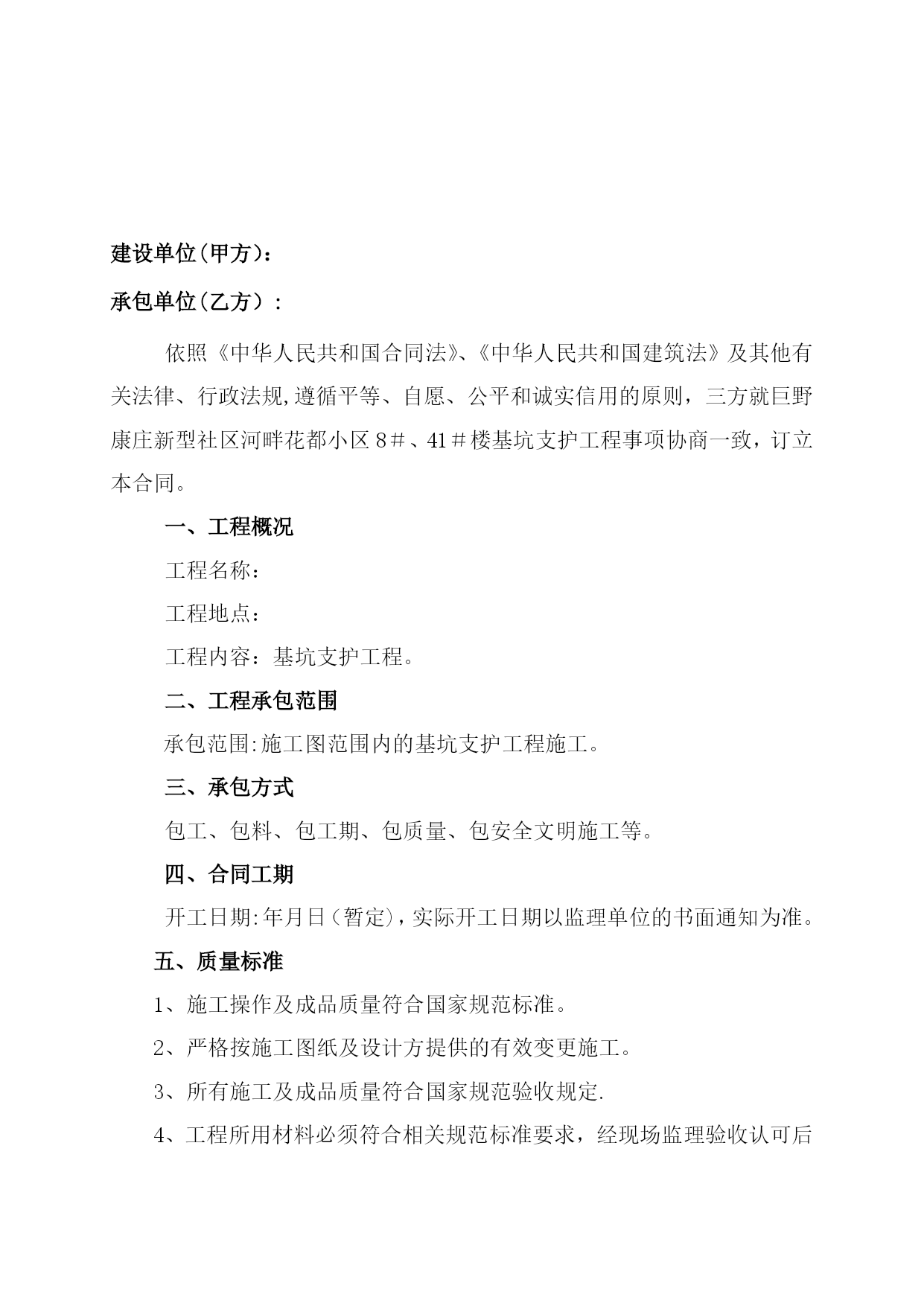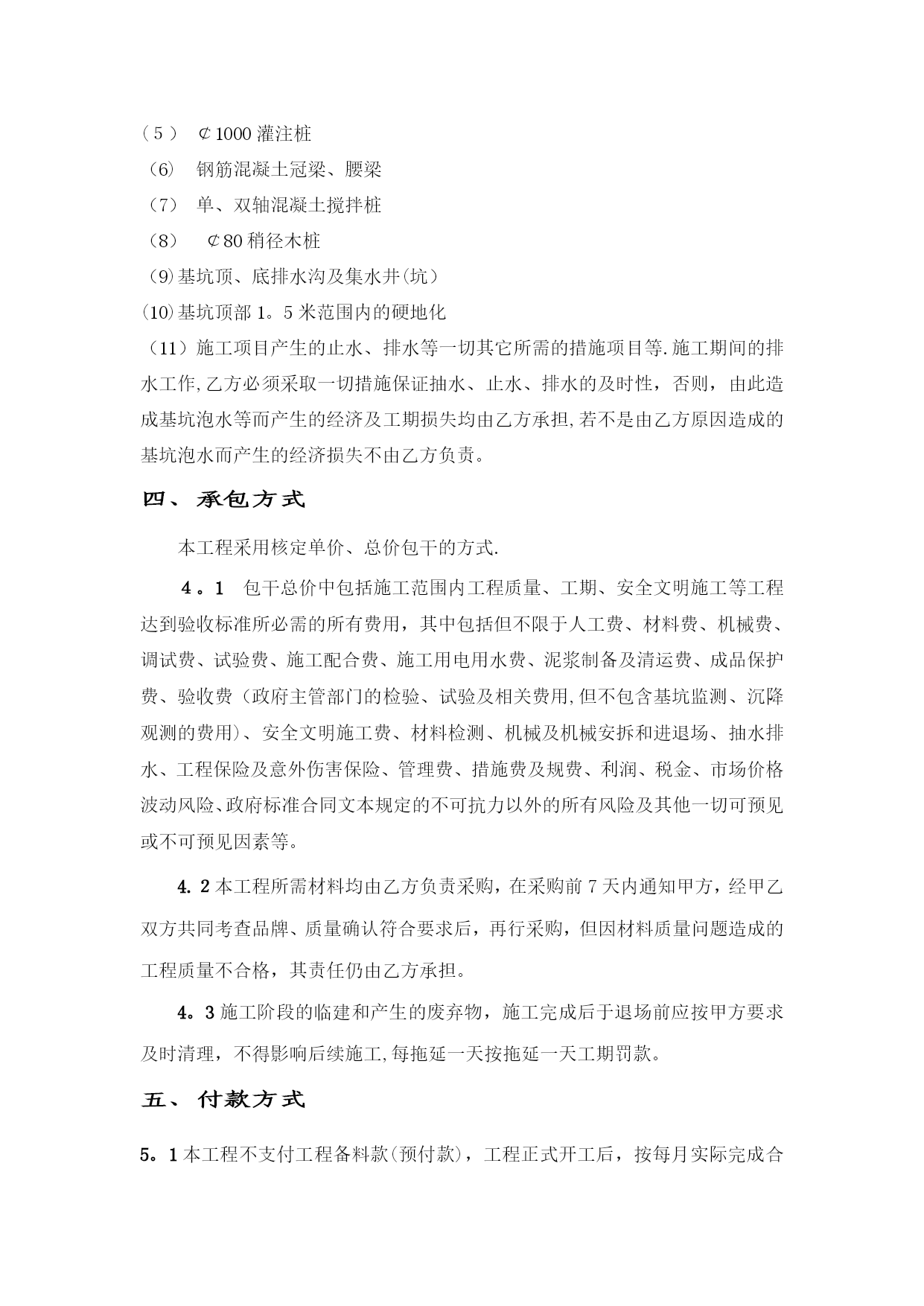 基坑支护合同(完整资料)(可以直接使用,可编辑优秀版资料,欢迎下载)基坑支护、工程承包合同建设单位:承包单位:签订时间:建设单位(甲方):承包单位(乙方):依照《中华人民共和国合同法》、《中华人民共和国建筑法》及其他有关法律、行政法规,遵循平等、自愿、公平和诚实信用的原则,三方就巨野康庄新型社区河畔花都小区8#、41#楼基坑支护工程事项协商一致,订立本合同。一、工程概况工程名称:工程地点:工程内容:基坑支护工程。二、工程承包范围承包范围:施工图范围内的基坑支护工程施工。三、承包方式包工、包料、包工期、包质量、包安全文明施工等。四、合同工期开工日期:年月日(暂定),实际开工日期以监理单位的书面通知为准。五、质量标准1、施工操作及成品质量符合国家规范标准。2、严格按施工图纸及设计方提供的有效变更施工。3、所有施工及成品质量符合国家规范验收规定.4、工程所用材料必须符合相关规范标准要求,经现场监理验收认可后方可使用。5、各项工程成品的质量及相关检测数据达到设计要求。六、合同价款1、编网喷浆55元/平方。2、挂网喷桨45元/平方。3、锚杆(Ф18)65元/米。槽钢(Ф14)35元/米。注:以上单价包含税金。七、付款方式1、施工人员及设备进场,一周内预付总价款的25%作为备料款。2、完成总工程量的50%,一周内付至已完工程量价款的80%。3、完成总工程量的80%,一周内付至已完工程量价款的80%。4、基坑支护工程全部完成,一周内付至总价款的100%.八、建设单位责任1、提供图纸2、负责与设计单位沟通.3、协助办理使用临建、道路交通、环保建设等相关证件、批件。4、组织设计交底。5、按合同约定及时支付分包人工程款。6、帮助协调周边群众关系。7、协调周边建筑房产业主的关系,确保施工正常进行,无外界干扰,若因外界干扰影响施工的,工期顺延,造成的损失由甲方承担。九、承包人责任1、严格按照设计图纸施工,编制基坑开挖支护组织设计、技术方案报监理、建设单位审批后进行施工。2、遵守建设单位有关工程管理的规章制度,服从建设单位的组织指挥协调。承包人应做好必要的应急措施。3、负责所有人员的安全教育和安全保护工作,严格按照安全施工标准组织施工,采取必要的安全防护措施保证施工安全,因自身原因导致的安全责任事故,由乙方承担全部(经济责任和法律)责任。5、工程施工质量必须达到合同规定的质量标准及验收要求,工程施工质量达不到合同规定的质量标准及验收要求,乙方返工,直至达到合同规定的质量标准,因此造成的经济损失均由乙方承担,并接受甲方对乙方因耽误总包人后续施工而延误的工期进行处罚。6、施工中保证基坑的施工安全,及时分析施工监测数据,并做好应急措施.十、其他1、若施工中出现非施工合同范围内的工作内容、工程量的增减及需要增加的工作和费用以现场签证的方式解决。2、本合同履行过程中的会议纪要、签证、各种通知文件、委托、证书等书面形式资料均可作为索赔的有力证据,用以处理工程中出现的索赔问题.3、本合同确定综合单价包括了临时停水、停电、二次搬运、施工场地不足、在场外食宿、成品保护、保证工程安全、加快工程施工进度等所需措施的一切费用,工期分包人已充分考虑,并已考虑了各种可能因素影响施工所增加的费用,工程结算时除工程签证外其它单价不作调整。7、甲方不履行合同义务或不按合同约定履行义务的其他情况。甲方承担违约责任,赔偿因其违约给承包人造成的经济损失,顺延延误的工期。8、承包人不履行合同义务或不按合同约定履行义务的其他情况。承包人承担违约责任,赔偿因其违约给发包人造成的损失。9、一方违约后,另一方要求违约方继续履行合同时,违约方承担上述违约责任后仍应继续履行合同。10、本合同双方签字盖章生效,工程验收完工一切工程款项结清后即告终止。11、对发生的争议问题可协商解决,若协商未能达成共识,应在工程所在地选择仲裁或诉讼解决。12、本合同一式肆份,双方各执两份。未尽事宜,双方协商解决。建设单位:(公章)承包单位:法定代表人:法定代表人:委托代表人:委托代表人:电话:电话:年月日XXXXXXXX基坑支护工程施工合同发包方(简称甲方):承包方(简称乙方):根据《中华人民共和国合同法》、《中华人民共和国建筑法》等有关法律、法规,遵循平等、自愿、公平和诚信的原则,经甲、乙双方友好协商,根据本工程的具体情况,签订本合同如下,双方共同遵守:一、工程概况工程名称:XXXXXXXXXXXX工程工程地点:位于XXXXXXX二、承包范围完成基坑支护工程施工图(XXXX水电工程勘察院设计2013.06.18版)所包含的全部内容,包括但不限于IV型拉