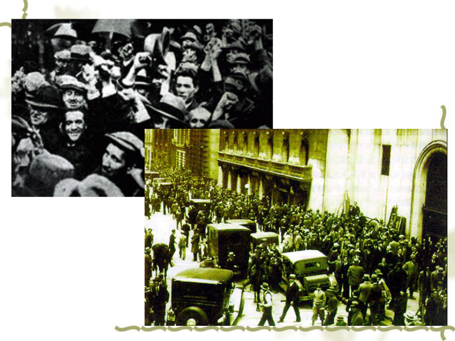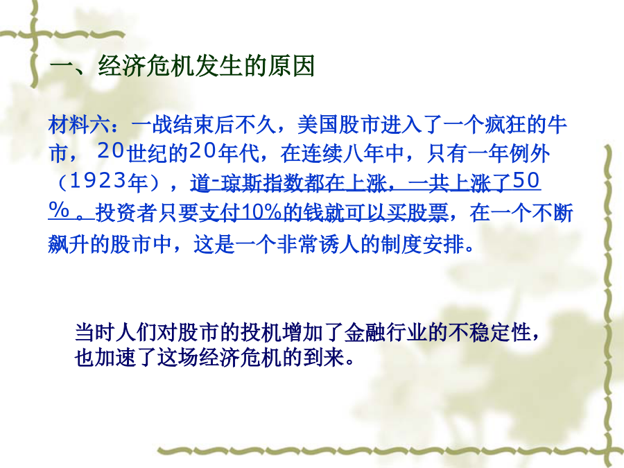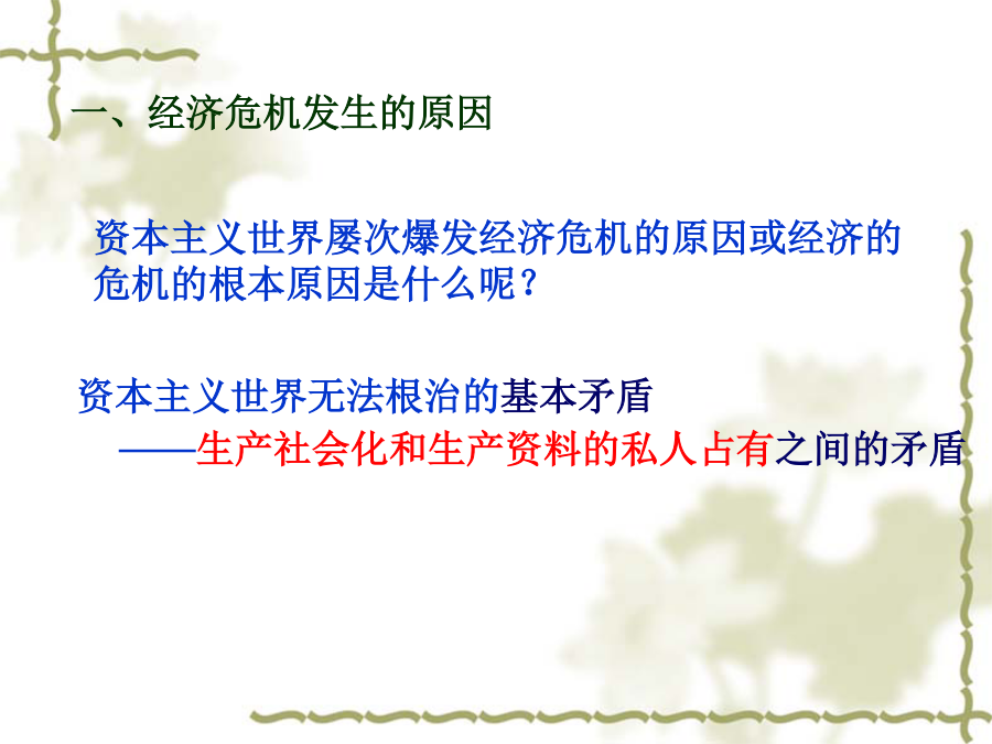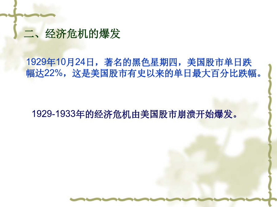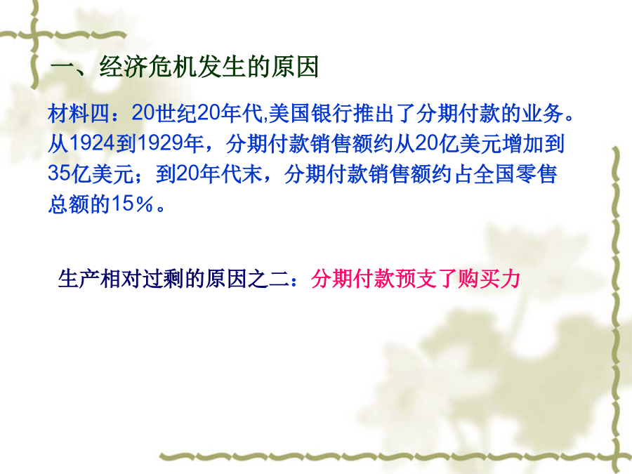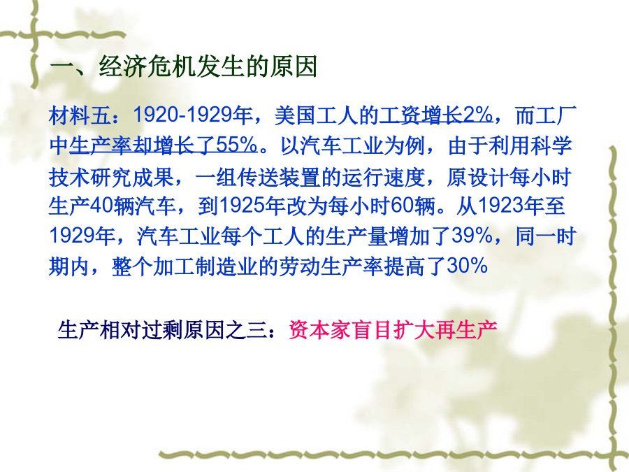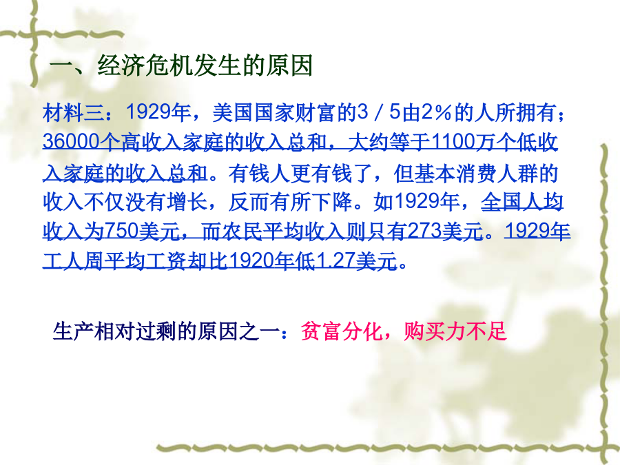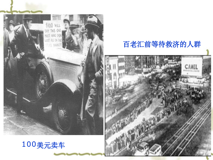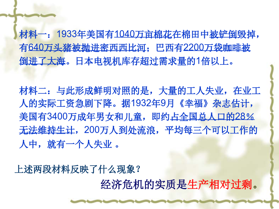 资本主义世界1929-1933年经济危机材料一:1933年美国有1040万亩棉花在棉田中被铲倒毁掉,有640万头猪被抛进密西西比河;巴西有2200万袋咖啡被倒进了大海。日本电视机库存超过需求量的1倍以上。材料三:1929年,美国国家财富的3/5由2%的人所拥有;36000个高收入家庭的收入总和,大约等于1100万个低收入家庭的收入总和。有钱人更有钱了,但基本消费人群的收入不仅没有增长,反而有所下降。如1929年,全国人均收入为750美元,而农民平均收入则只有273美元。1929年工人周平均工资却比1920年低1.27美元。材料四:20世纪20年代,美国银行推出了分期付款的业务。从1924到1929年,分期付款销售额约从20亿美元增加到35亿美元;到20年代末,分期付款销售额约占全国零售总额的15%。材料五:1920-1929年,美国工人的工资增长2%,而工厂中生产率却增长了55%。以汽车工业为例,由于利用科学技术研究成果,一组传送装置的运行速度,原设计每小时生产40辆汽车,到1925年改为每小时60辆。从1923年至1929年,汽车工业每个工人的生产量增加了39%,同一时期内,整个加工制造业的劳动生产率提高了30%材料六:一战结束后不久,美国股市进入了一个疯狂的牛市,20世纪的20年代,在连续八年中,只有一年例外(1923年),道-琼斯指数都在上涨,一共上涨了50%。投资者只要支付10%的钱就可以买股票,在一个不断飙升的股市中,这是一个非常诱人的制度安排。资本主义世界屡次爆发经济危机的原因或经济的危机的根本原因是什么呢?二、经济危机的爆发百老汇前等待救济的人群等待救济的德国工人材料七:从1929年10月份的股票市场崩溃到1932年,美国的产出下跌50%,出口贸易下跌60%,在此期间的失业人口从150万猛增至1200万,工农业产品的价格和从业人员的工资都大为下降,大批的个人和企业破产事件上升。各国的工业产量倒退到20世纪初甚至19世纪末的水平。美、德、法、英四国共有约29万家企业破产,出现了大片机器“草地”。各国的失业率达30%--50%。①欧洲战后复兴计划——道威斯计划②资本主义经济的扩张性——资本主义世界体系的确立和形成基本上经济发达的国家都卷入了经济危机,有没有例外的?它为什么可以幸免于难?四、经济危机的影响材料十:1930年5月,美国国会通过法案,把890种主要商品的进口关税平均提高近40%,由此引发了一场关税大战。……1933年6月世界经济会议,试图实行关税休战,结果反而促使各集团之间的对立越来越尖锐。在资源战日益激化的情况下,资源自给率较低、金融力量相对薄弱的德、日、意逐渐相互靠拢,……英、法、美逐渐捐弃前嫌,……两种不同类型的帝国主义国家在经济上的分化对立和重新组合,为以后两大政治军事集团的形成铺垫了道路。经济危机如此肆虐,你有没有解决之道?为什么同样是资本主义国家,解决经济危机的方法如此不同呢?克拉斯穆尔·佩佐夫(从事研究于美国阿拉巴马州奥地利经济学米塞斯研究院)认为:中国将不可避免地陷入一次大萧条,如同美国在20世纪30年代所经历的。