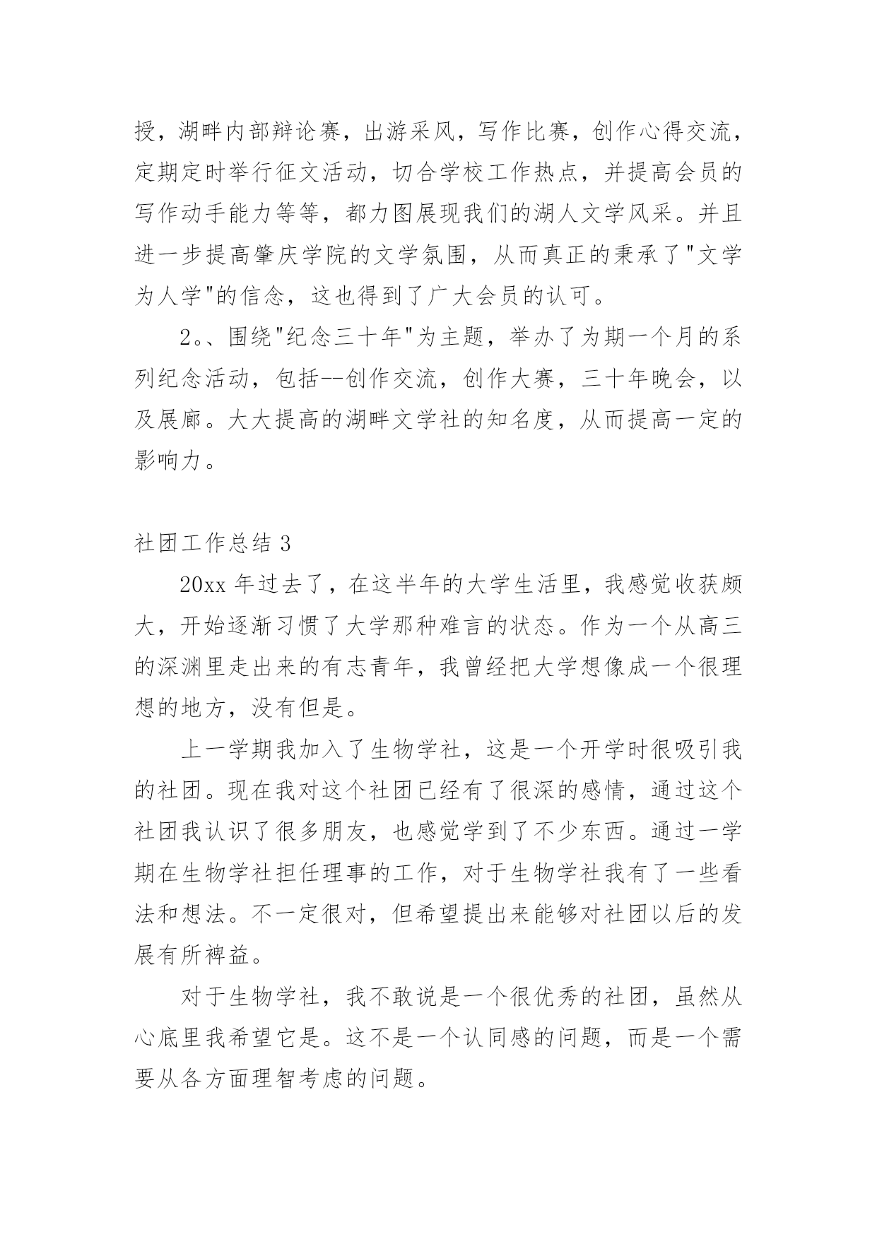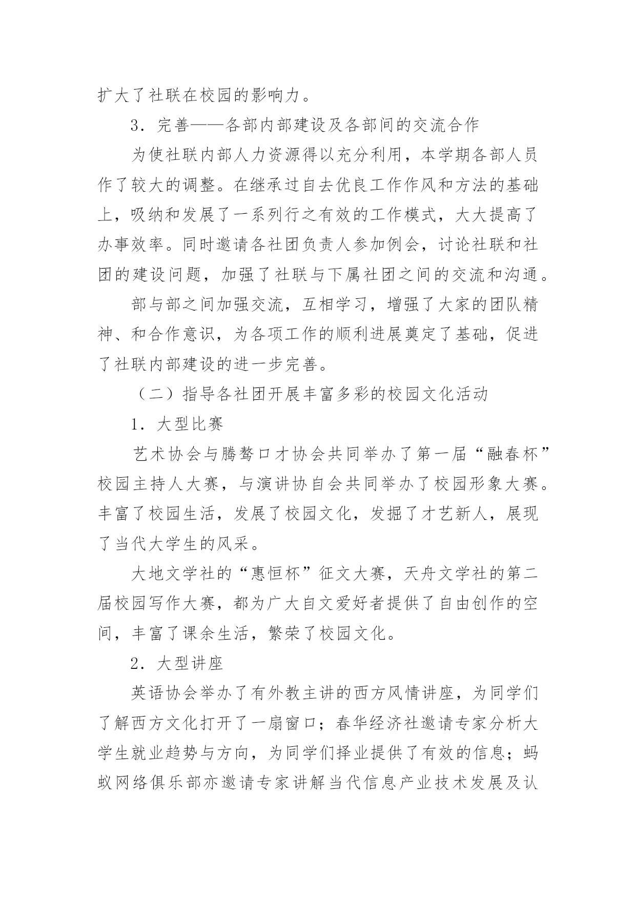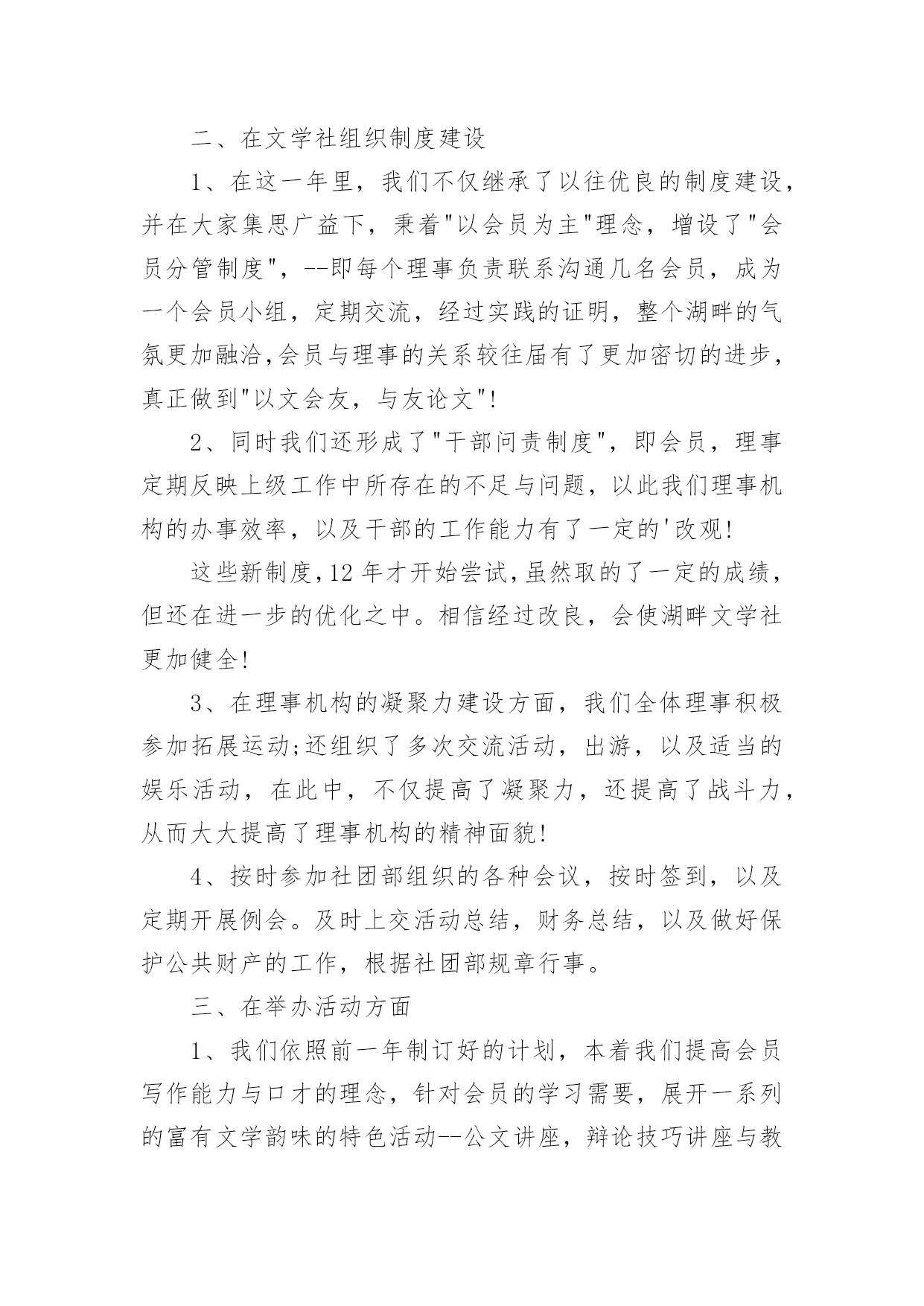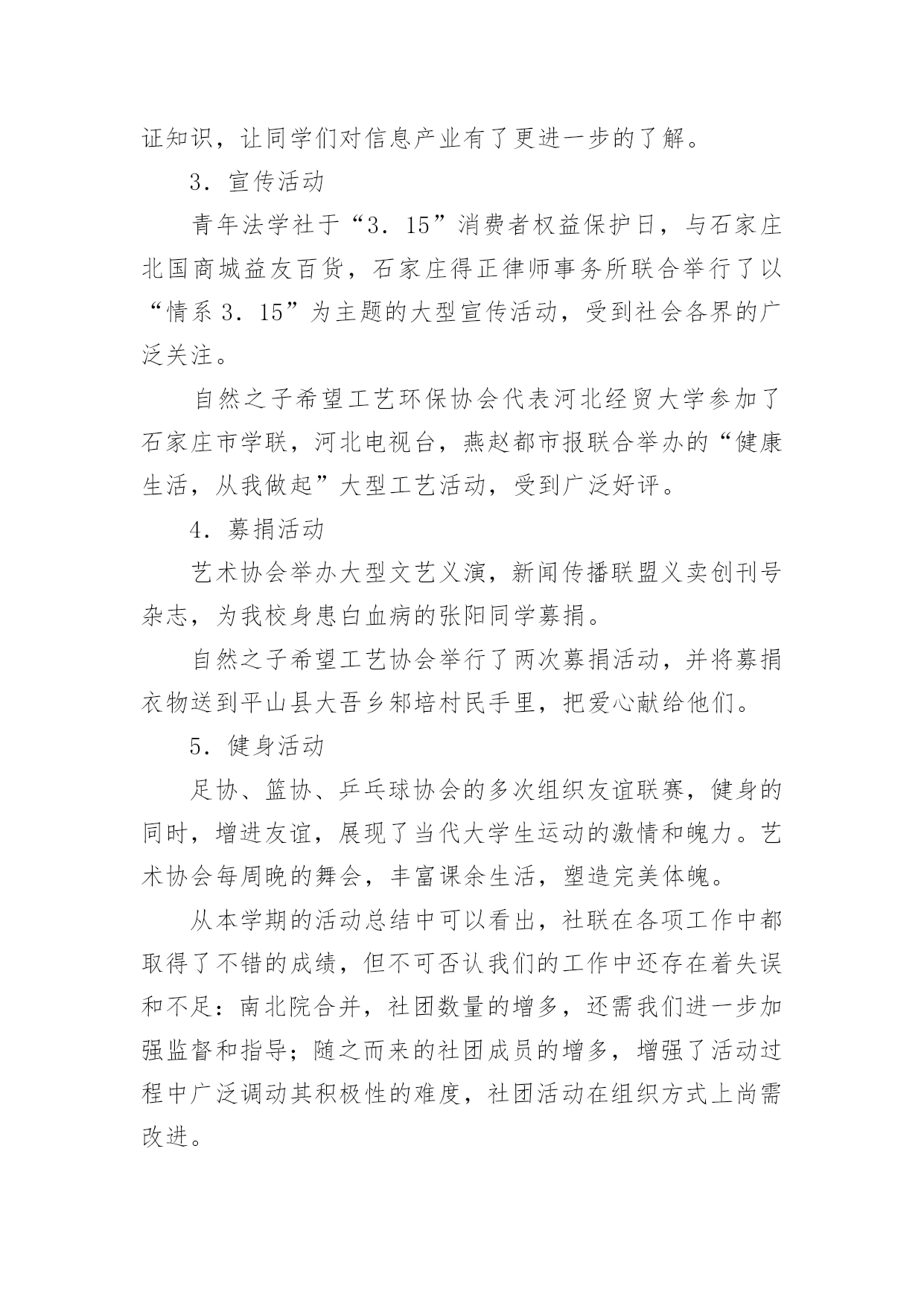 社团工作总结总结是事后对某一阶段的学习或工作情况作加以回顾检查并分析评价的书面材料,它可以使我们更有效率,让我们一起认真地写一份总结吧。总结一般是怎么写的呢?下面是小编为大家整理的社团工作总结,欢迎阅读与收藏。社团工作总结1本年度,在校党委正确领导和校团委紧密指导下,顺应学校加大改革力度,完善各项工作,共同“迎评促建”的大好形势下,社团联合会加快自身发展速度,以改革求发展,以发展促完善,向着更高的目标不断迈进。本学期以来,社联求真务实,开拓进取,积极地开展了一系列卓有成效的工作。现将其总结如下:(一)进一步加强社联自身的建设1.整——社团的合并南北校区合并使社联的实力进一步扩大,但同时社联在人员和数量上也发生了很大的变动。社联积极发挥其引导职能,使性质相同或相近的社团和为一体,既有利于壮大社团的实力,提高其活动的质量,又有利于社联的管理。2.宣传——《社联时讯》的发行20xx年4月18日,是社团联合会成立两周年的日子,为庆祝这一具有纪念意义的时刻,由社联主办,宣传部策划出版了《社联时讯》,使更多人对社联有了更深的`了解,自扩大了社联在校园的影响力。3.完善——各部内部建设及各部间的交流合作为使社联内部人力资源得以充分利用,本学期各部人员作了较大的调整。在继承过自去优良工作作风和方法的基础上,吸纳和发展了一系列行之有效的工作模式,大大提高了办事效率。同时邀请各社团负责人参加例会,讨论社联和社团的建设问题,加强了社联与下属社团之间的交流和沟通。部与部之间加强交流,互相学习,增强了大家的团队精神、和合作意识,为各项工作的顺利进展奠定了基础,促进了社联内部建设的进一步完善。(二)指导各社团开展丰富多彩的校园文化活动1.大型比赛艺术协会与腾骜口才协会共同举办了第一届“融春杯”校园主持人大赛,与演讲协自会共同举办了校园形象大赛。丰富了校园生活,发展了校园文化,发掘了才艺新人,展现了当代大学生的风采。大地文学社的“惠恒杯”征文大赛,天舟文学社的第二届校园写作大赛,都为广大自文爱好者提供了自由创作的空间,丰富了课余生活,繁荣了校园文化。2.大型讲座英语协会举办了有外教主讲的西方风情讲座,为同学们了解西方文化打开了一扇窗口;春华经济社邀请专家分析大学生就业趋势与方向,为同学们择业提供了有效的信息;蚂蚁网络俱乐部亦邀请专家讲解当代信息产业技术发展及认证知识,让同学们对信息产业有了更进一步的了解。3.宣传活动青年法学社于“3.15”消费者权益保护日,与石家庄北国商城益友百货,石家庄得正律师事务所联合举行了以“情系3.15”为主题的大型宣传活动,受到社会各界的广泛关注。自然之子希望工艺环保协会代表河北经贸大学参加了石家庄市学联,河北电视台,燕赵都市报联合举办的“健康生活,从我做起”大型工艺活动,受到广泛好评。4.募捐活动艺术协会举办大型文艺义演,新闻传播联盟义卖创刊号杂志,为我校身患白血病的张阳同学募捐。自然之子希望工艺协会举行了两次募捐活动,并将募捐衣物送到平山县大吾乡邾培村民手里,把爱心献给他们。5.健身活动足协、篮协、乒乓球协会的多次组织友谊联赛,健身的同时,增进友谊,展现了当代大学生运动的激情和魄力。艺术协会每周晚的舞会,丰富课余生活,塑造完美体魄。从本学期的活动总结中可以看出,社联在各项工作中都取得了不错的成绩,但不可否认我们的工作中还存在着失误和不足:南北院合并,社团数量的增多,还需我们进一步加强监督和指导;随之而来的社团成员的增多,增强了活动过程中广泛调动其积极性的难度,社团活动在组织方式上尚需改进。社团工作总结2本学年以来,湖畔文学社在校团委社团部,以及各指导老师的殷切关怀和精心指导下,各项工作进展顺利。我们深刻领会文学社的宗旨,不仅秉承了以往的优良工作思路和方式,还在新的环境下提出了新的要求,有了新的突破和发展。特别是在响应校团委"培养应用型人才"上,积极做了活动调整。xx年,对于湖畔来说,绝对不是平凡的一年,因为迄今为止,湖畔,已经走过了三十年春秋,在这一年里,从12年新生入学前的招生工作准备,到招生工作的进行,到选拔新理事,这些,让我们这些老理事,重新认识湖畔;也让我们的新成员,开始融入这个家庭!招生时的辛苦,我们仍然历历在目,但回想起来,我们却甘之如饴!然而,这个让人激动,并值得纪念的年岁,我们湖人,结结实实的在坎坷中成长了许多。现将xx-xx学年度湖畔文学社的工作主要总结为以下几点:一、在纳新以及选拔理事方面xx年10月的招生工作,湖畔在遵循社团规章前提下,以及湖畔07、08理事的深入新生群宣传湖畔,我们新纳入了139名文学爱好者成为我们的新会员,比去年约增长了40%。并在这一批文学新生军之中,本着公平公正的原则,选拔出了25名优秀的理事,组成新一届的理事机构。二、在文学社组织制度建设1、在这一年里,我们不仅继承了以往优