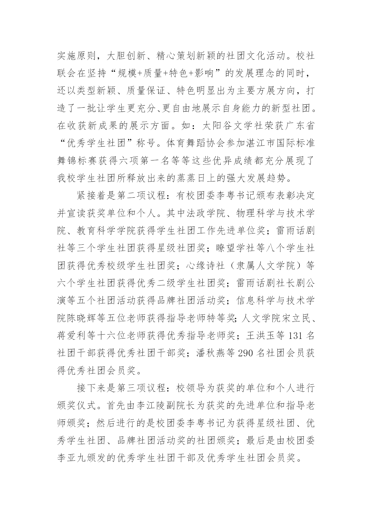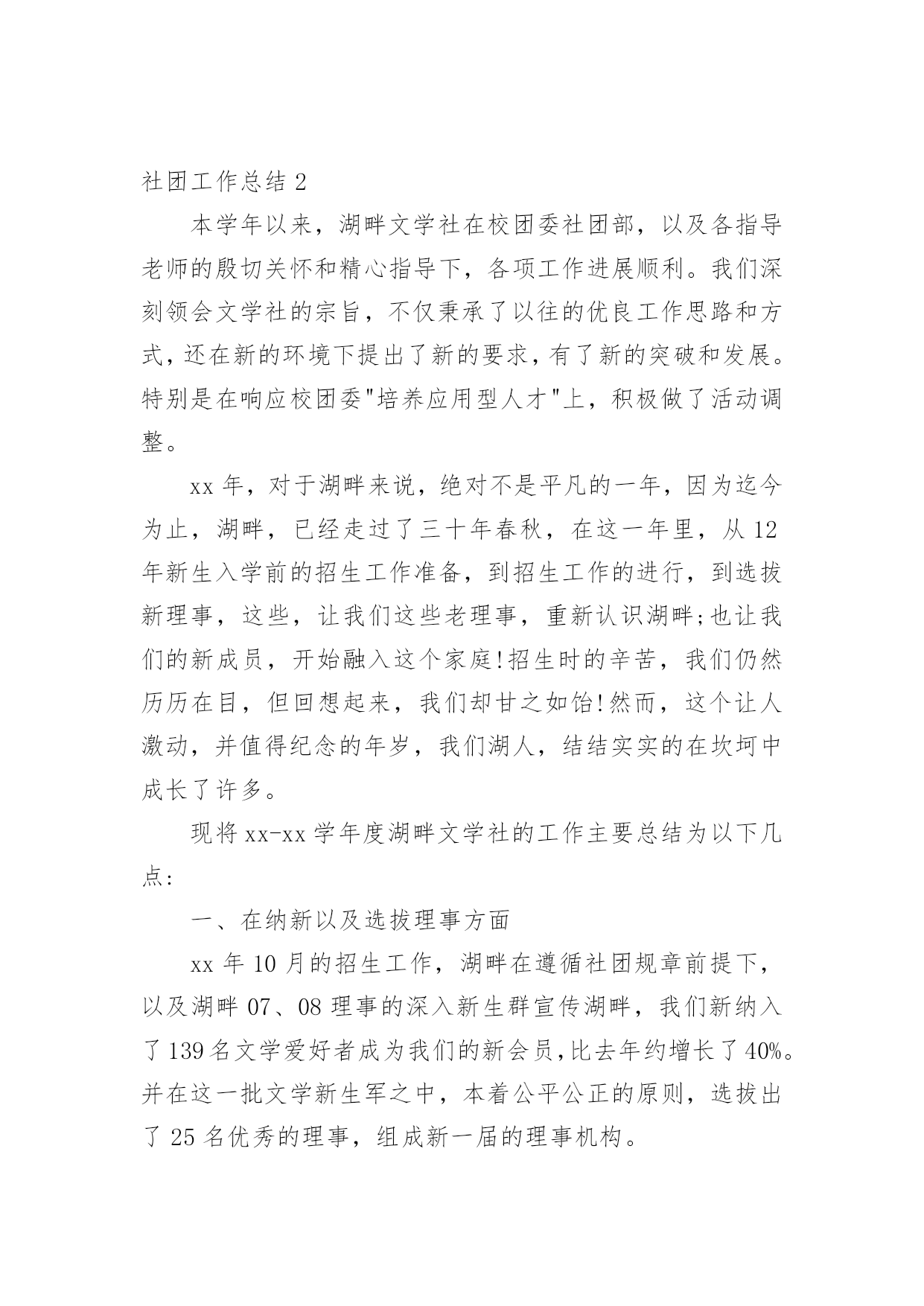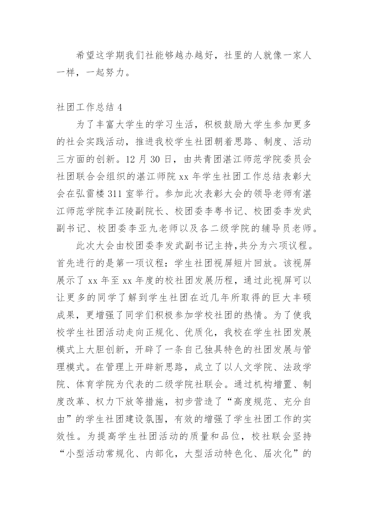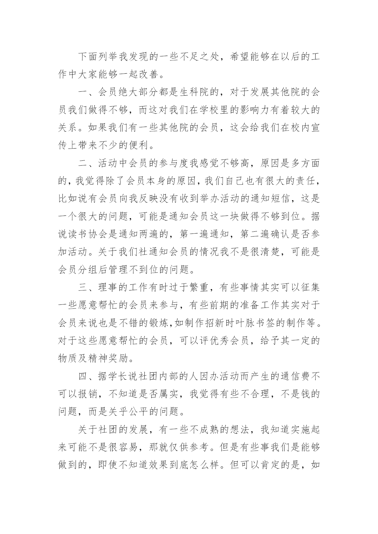 社团工作总结总结是事后对某一阶段的学习或工作情况作加以回顾检查并分析评价的书面材料,它可以使我们更有效率,让我们一起认真地写一份总结吧。总结一般是怎么写的呢?下面是小编为大家整理的社团工作总结,欢迎阅读与收藏。社团工作总结1本年度,在校党委正确领导和校团委紧密指导下,顺应学校加大改革力度,完善各项工作,共同“迎评促建”的大好形势下,社团联合会加快自身发展速度,以改革求发展,以发展促完善,向着更高的目标不断迈进。本学期以来,社联求真务实,开拓进取,积极地开展了一系列卓有成效的工作。现将其总结如下:(一)进一步加强社联自身的建设1.整——社团的合并南北校区合并使社联的实力进一步扩大,但同时社联在人员和数量上也发生了很大的变动。社联积极发挥其引导职能,使性质相同或相近的社团和为一体,既有利于壮大社团的实力,提高其活动的质量,又有利于社联的管理。2.宣传——《社联时讯》的发行20xx年4月18日,是社团联合会成立两周年的日子,为庆祝这一具有纪念意义的时刻,由社联主办,宣传部策划出版了《社联时讯》,使更多人对社联有了更深的`了解,自扩大了社联在校园的影响力。3.完善——各部内部建设及各部间的交流合作为使社联内部人力资源得以充分利用,本学期各部人员作了较大的调整。在继承过自去优良工作作风和方法的基础上,吸纳和发展了一系列行之有效的工作模式,大大提高了办事效率。同时邀请各社团负责人参加例会,讨论社联和社团的建设问题,加强了社联与下属社团之间的交流和沟通。部与部之间加强交流,互相学习,增强了大家的团队精神、和合作意识,为各项工作的顺利进展奠定了基础,促进了社联内部建设的进一步完善。(二)指导各社团开展丰富多彩的校园文化活动1.大型比赛艺术协会与腾骜口才协会共同举办了第一届“融春杯”校园主持人大赛,与演讲协自会共同举办了校园形象大赛。丰富了校园生活,发展了校园文化,发掘了才艺新人,展现了当代大学生的风采。大地文学社的“惠恒杯”征文大赛,天舟文学社的第二届校园写作大赛,都为广大自文爱好者提供了自由创作的空间,丰富了课余生活,繁荣了校园文化。2.大型讲座英语协会举办了有外教主讲的西方风情讲座,为同学们了解西方文化打开了一扇窗口;春华经济社邀请专家分析大学生就业趋势与方向,为同学们择业提供了有效的信息;蚂蚁网络俱乐部亦邀请专家讲解当代信息产业技术发展及认证知识,让同学们对信息产业有了更进一步的了解。3.宣传活动青年法学社于“3.15”消费者权益保护日,与石家庄北国商城益友百货,石家庄得正律师事务所联合举行了以“情系3.15”为主题的大型宣传活动,受到社会各界的广泛关注。自然之子希望工艺环保协会代表河北经贸大学参加了石家庄市学联,河北电视台,燕赵都市报联合举办的“健康生活,从我做起”大型工艺活动,受到广泛好评。4.募捐活动艺术协会举办大型文艺义演,新闻传播联盟义卖创刊号杂志,为我校身患白血病的张阳同学募捐。自然之子希望工艺协会举行了两次募捐活动,并将募捐衣物送到平山县大吾乡邾培村民手里,把爱心献给他们。5.健身活动足协、篮协、乒乓球协会的多次组织友谊联赛,健身的同时,增进友谊,展现了当代大学生运动的激情和魄力。艺术协会每周晚的舞会,丰富课余生活,塑造完美体魄。从本学期的活动总结中可以看出,社联在各项工作中都取得了不错的成绩,但不可否认我们的工作中还存在着失误和不足:南北院合并,社团数量的增多,还需我们进一步加强监督和指导;随之而来的社团成员的增多,增强了活动过程中广泛调动其积极性的难度,社团活动在组织方式上尚需改进。社团工作总结2本学年以来,湖畔文学社在校团委社团部,以及各指导老师的殷切关怀和精心指导下,各项工作进展顺利。我们深刻领会文学社的宗旨,不仅秉承了以往的优良工作思路和方式,还在新的环境下提出了新的要求,有了新的突破和发展。特别是在响应校团委"培养应用型人才"上,积极做了活动调整。xx年,对于湖畔来说,绝对不是平凡的一年,因为迄今为止,湖畔,已经走过了三十年春秋,在这一年里,从12年新生入学前的招生工作准备,到招生工作的进行,到选拔新理事,这些,让我们这些老理事,重新认识湖畔;也让我们的新成员,开始融入这个家庭!招生时的辛苦,我们仍然历历在目,但回想起来,我们却甘之如饴!然而,这个让人激动,并值得纪念的年岁,我们湖人,结结实实的在坎坷中成长了许多。现将xx-xx学年度湖畔文学社的工作主要总结为以下几点:一、在纳新以及选拔理事方面xx年10月的招生工作,湖畔在遵循社团规章前提下,以及湖畔07、08理事的深入新生群宣传湖畔,我们新纳入了139名文学爱好者成为我们的新会员,比去年约增长了40%。并在这一批文学新生军之中,本着公平公正的原则,选拔出了25名优秀的理事,组成新一届的理事机构。二、在文学社组织制度建设1、在这一年里,我们不仅继承了以往优