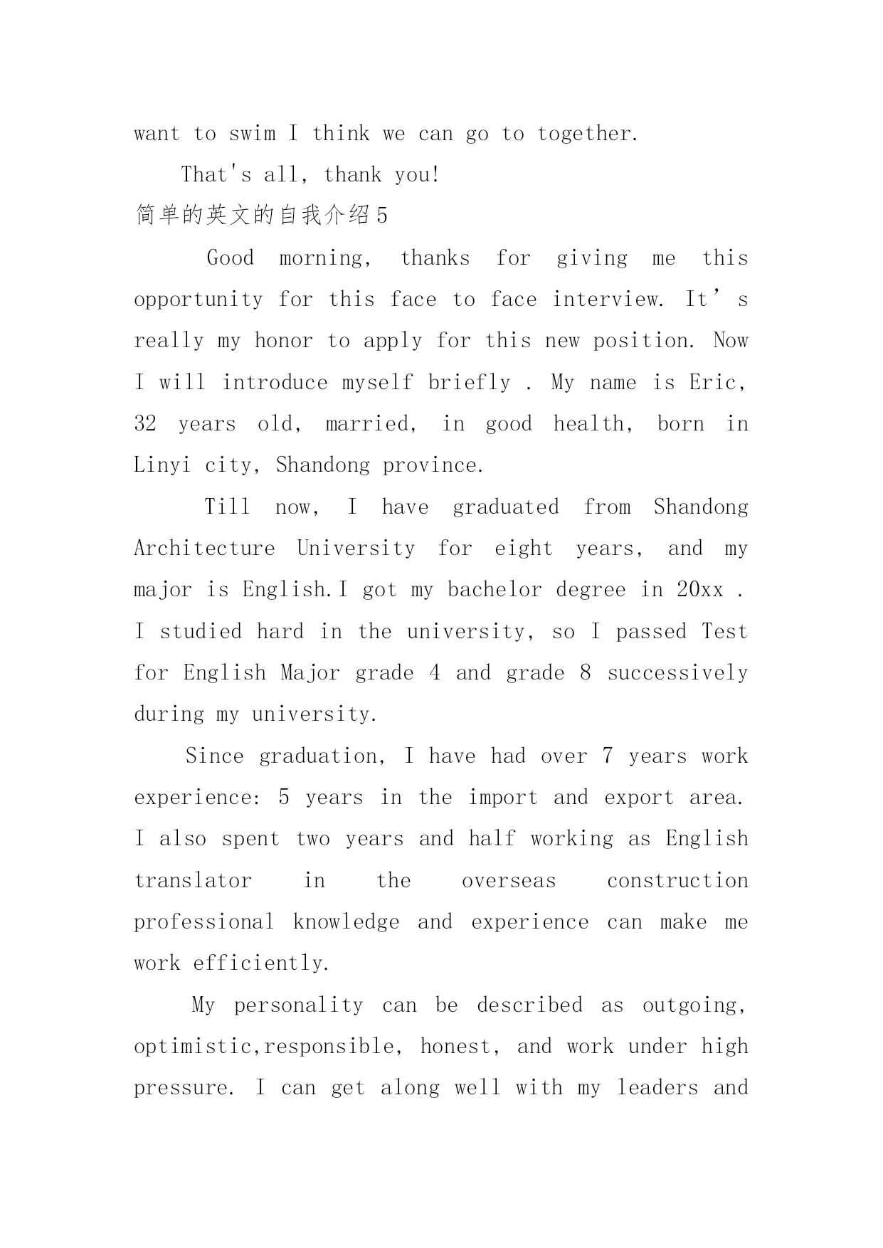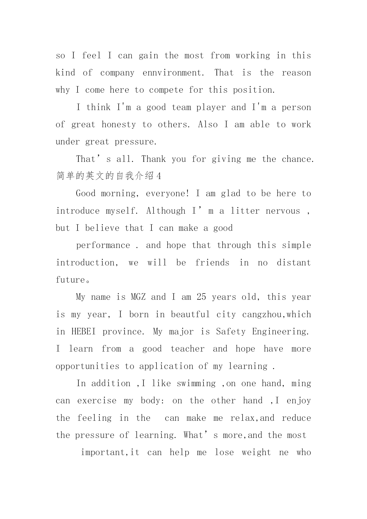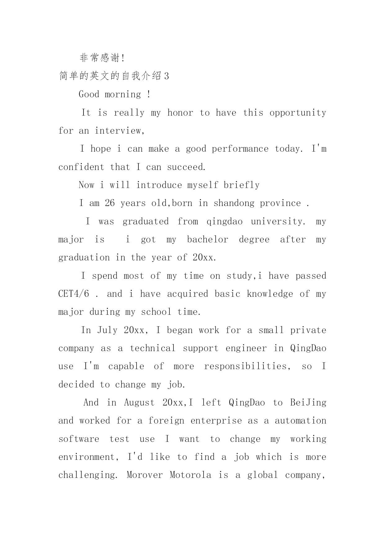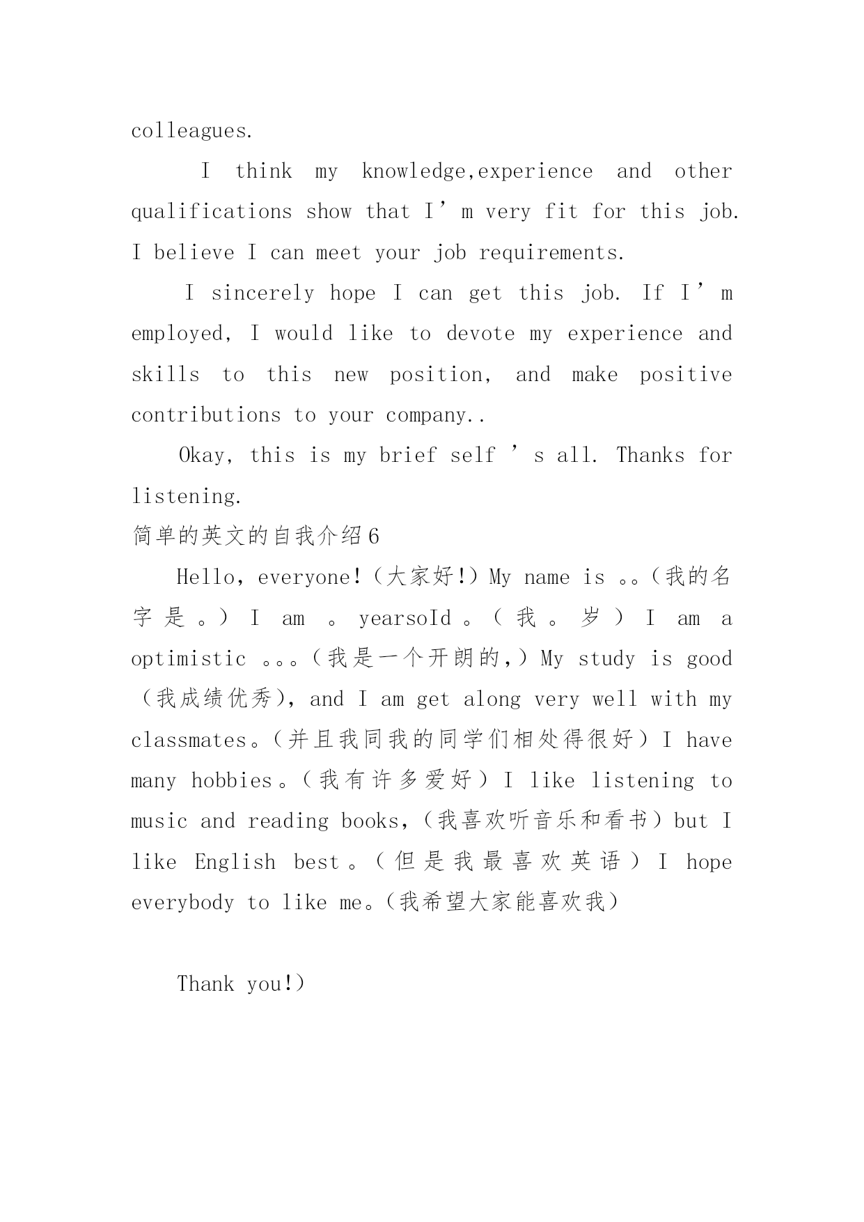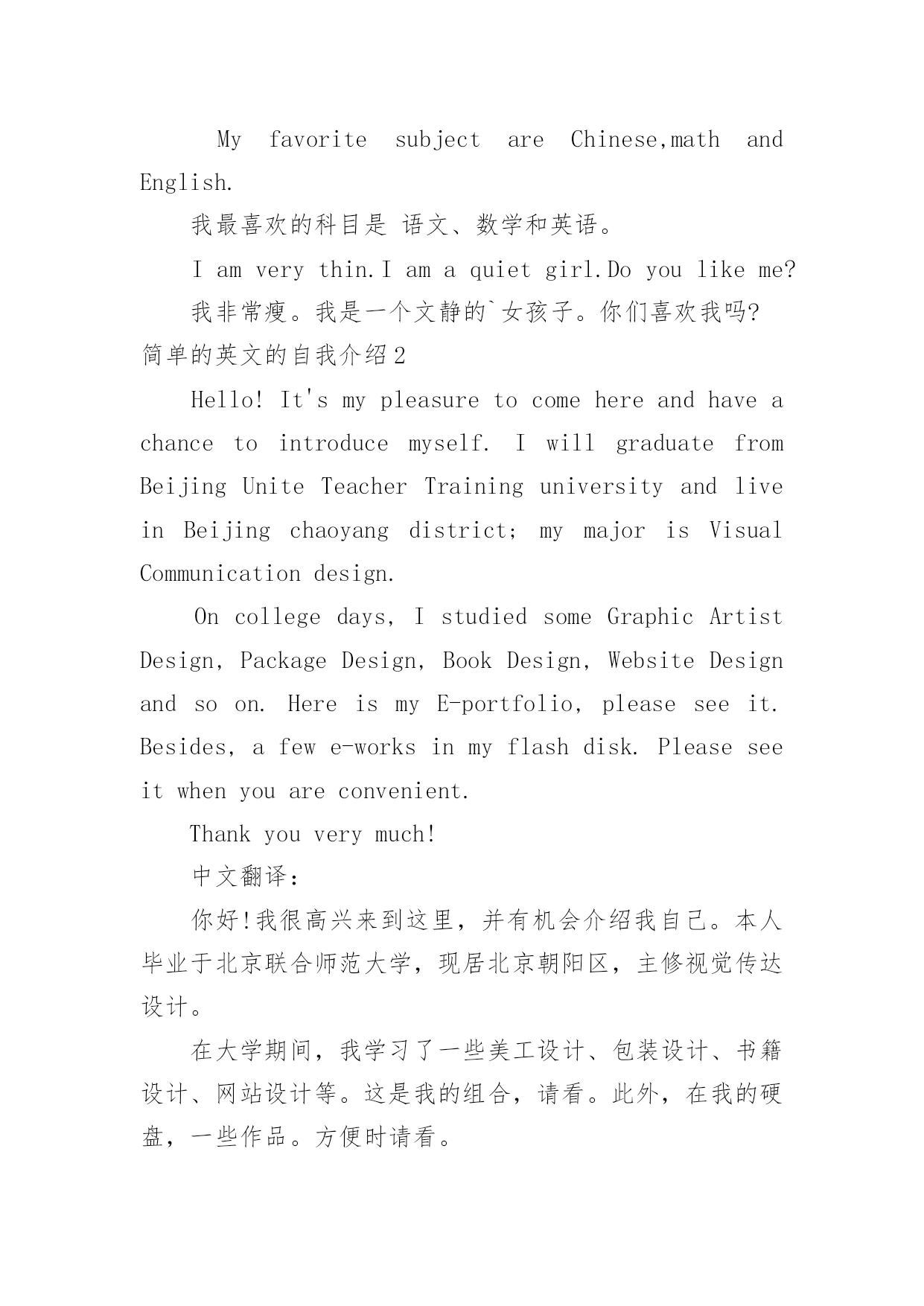 简单的英文的自我介绍简单的英文的自我介绍处在一个陌生场合时,常常要进行自我介绍,用自我介绍往往可以来展示自己。相信大家又在为写自我介绍犯愁了吧!下面是小编为大家收集的简单的英文的自我介绍,欢迎大家借鉴与参考,希望对大家有所帮助。简单的英文的自我介绍1Hello!Everyone.大家好!Mynameis...我的名字是......I'magirl.我是一个女孩。I'm10yearsold.我十岁了。I'minClass....我在......班里。Ilikeplayingbasketball.我喜欢打篮球。AndIlikecake,Ithinkitisdelicious.还有我喜欢蛋糕,我认为它很美味。MyfavoritesubjectareChinese,mathandEnglish.我最喜欢的科目是语文、数学和英语。Iamverythin.Iamaquietgirl.Doyoulikeme?我非常瘦。我是一个文静的`女孩子。你们喜欢我吗?简单的英文的自我介绍2Hello!It'smypleasuretocomehereandhaveachancetointroducemyself.IwillgraduatefromBeijingUniteTeacherTraininguniversityandliveinBeijingchaoyangdistrict;mymajorisVisualCommunicationdesign.Oncollegedays,IstudiedsomeGraphicArtistDesign,PackageDesign,BookDesign,WebsiteDesignandsoon.HereismyE-portfolio,pleaseseeit.Besides,afewe-worksinmyflashdisk.Pleaseseeitwhenyouareconvenient.Thankyouverymuch!中文翻译:你好!我很高兴来到这里,并有机会介绍我自己。本人毕业于北京联合师范大学,现居北京朝阳区,主修视觉传达设计。在大学期间,我学习了一些美工设计、包装设计、书籍设计、网站设计等。这是我的组合,请看。此外,在我的硬盘,一些作品。方便时请看。非常感谢!简单的英文的自我介绍3Goodmorning!Itisreallymyhonortohavethisopportunityforaninterview,Ihopeicanmakeagoodperformancetoday.I'mconfidentthatIcansucceed.NowiwillintroducemyselfbrieflyIam26yearsold,borninshandongprovince.Iwasgraduatedfromqingdaouniversity.mymajorisigotmybachelordegreeaftermygraduationintheyearof20xx.Ispendmostofmytimeonstudy,ihavepassedCET4/6.andihaveacquiredbasicknowledgeofmymajorduringmyschooltime.InJuly20xx,IbeganworkforasmallprivatecompanyasatechnicalsupportengineerinQingDaouseI'mcapableofmoreresponsibilities,soIdecidedtochangemyjob.AndinAugust20xx,IleftQingDaotoBeiJingandworkedforaforeignenterpriseasaautomationsoftwaretestuseIwanttochangemyworkingenvironment,I'dliketofindajobwhichismorechallenging.MoroverMotorolaisaglobalcompany,soIfeelIcangainthemostfromworkinginthiskindofcompanyennvironment.ThatisthereasonwhyIcomeheretocompeteforthisposition.IthinkI'magoodteamplayerandI'mapersonofgreathonestytoothers.AlsoIamabletoworkundergreatpressure.That’sall.Thankyouforgivingmethechance.简单的英文的自我介绍4Goodmorning,everyone!Iamgladtobeher