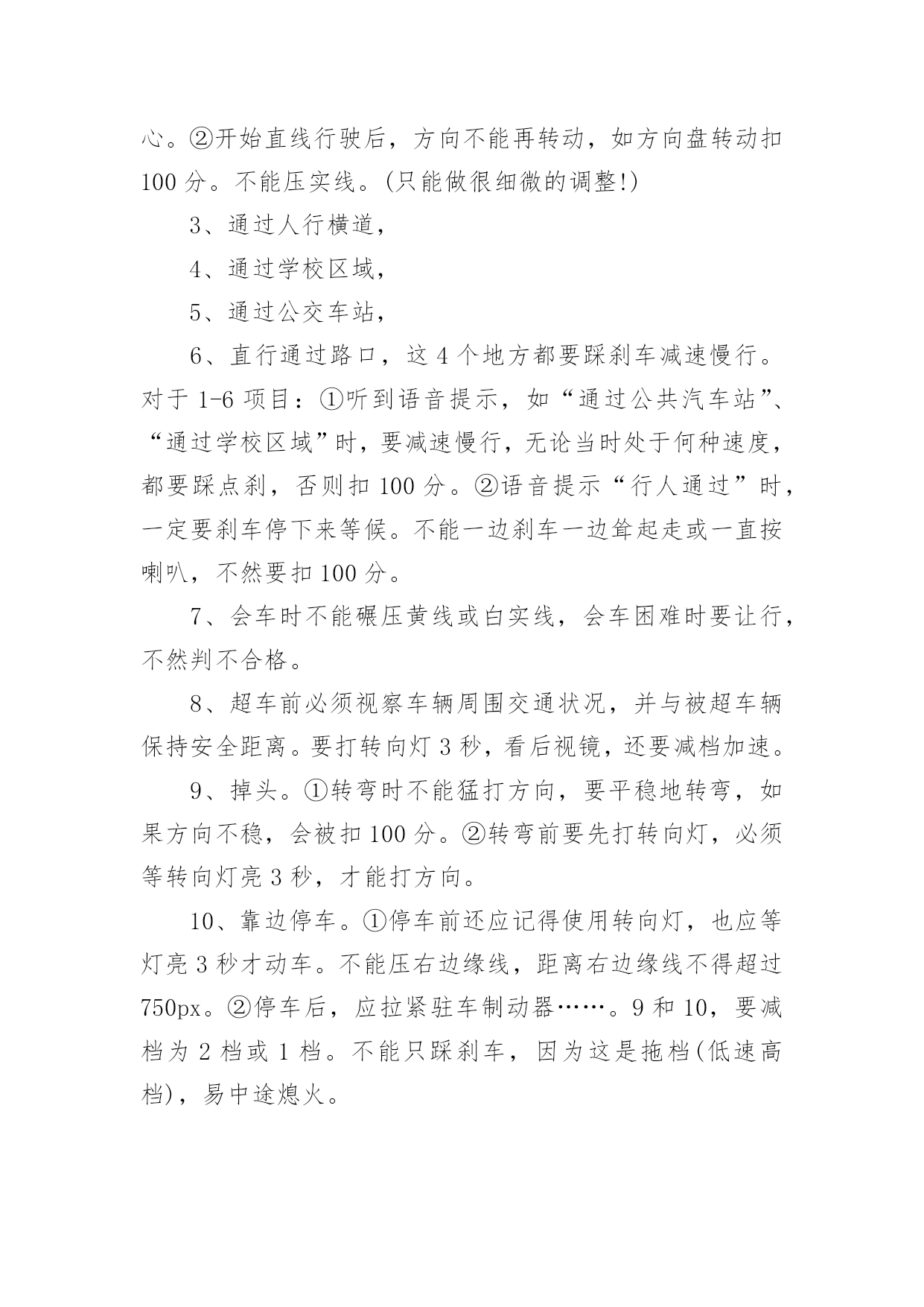 科目三考试流程及技巧科目三考试流程及技巧一、上车准备上车前的`检查非常必要,这由人工评判。要绕车检查一圈,要有检查四轮的动作,打开车门前要观察后方交通情况。如果未检查四轮、不观察交通情况,均直接扣100分。二、灯光操作1、模拟夜间行驶场景灯光使用考试。切记,听到语音提示后,须在5秒内做出相关操作;所有操作结束后,也需在5秒内关闭所有灯光。只要用光不准确一次,就会失去考试资格。除在无照明道路上行驶速度大于30km/h时仍不使用远光灯和在道路不平整、有障碍物时未使用近光灯,扣10分以外,其它内容考试,考生未能正确操作的全部为不合格。2、起步。①起步前要先打转向灯,必须等转向灯亮3秒以后,才能动车、动方向盘。打了转向灯后,还应观察路况,不然直接扣100分。②起步前,还应检查车门是否关闭,如果车门没关就起步也是直接扣100分。三、上路考试1、变更车道。①当听到语音提示“请变更车道”后,要开启转向灯,在灯亮3秒钟后才能转动方向。②只有单车道时不能变更车道。2、直线行驶。①直线行驶前要将方向调整到车道线的中心。②开始直线行驶后,方向不能再转动,如方向盘转动扣100分。不能压实线。(只能做很细微的调整!)3、通过人行横道,4、通过学校区域,5、通过公交车站,6、直行通过路口,这4个地方都要踩刹车减速慢行。对于1-6项目:①听到语音提示,如“通过公共汽车站”、“通过学校区域”时,要减速慢行,无论当时处于何种速度,都要踩点刹,否则扣100分。②语音提示“行人通过”时,一定要刹车停下来等候。不能一边刹车一边耸起走或一直按喇叭,不然要扣100分。7、会车时不能碾压黄线或白实线,会车困难时要让行,不然判不合格。8、超车前必须视察车辆周围交通状况,并与被超车辆保持安全距离。要打转向灯3秒,看后视镜,还要减档加速。9、掉头。①转弯时不能猛打方向,要平稳地转弯,如果方向不稳,会被扣100分。②转弯前要先打转向灯,必须等转向灯亮3秒,才能打方向。10、靠边停车。①停车前还应记得使用转向灯,也应等灯亮3秒才动车。不能压右边缘线,距离右边缘线不得超过750px。②停车后,应拉紧驻车制动器……。9和10,要减档为2档或1档。不能只踩刹车,因为这是拖档(低速高档),易中途熄火。