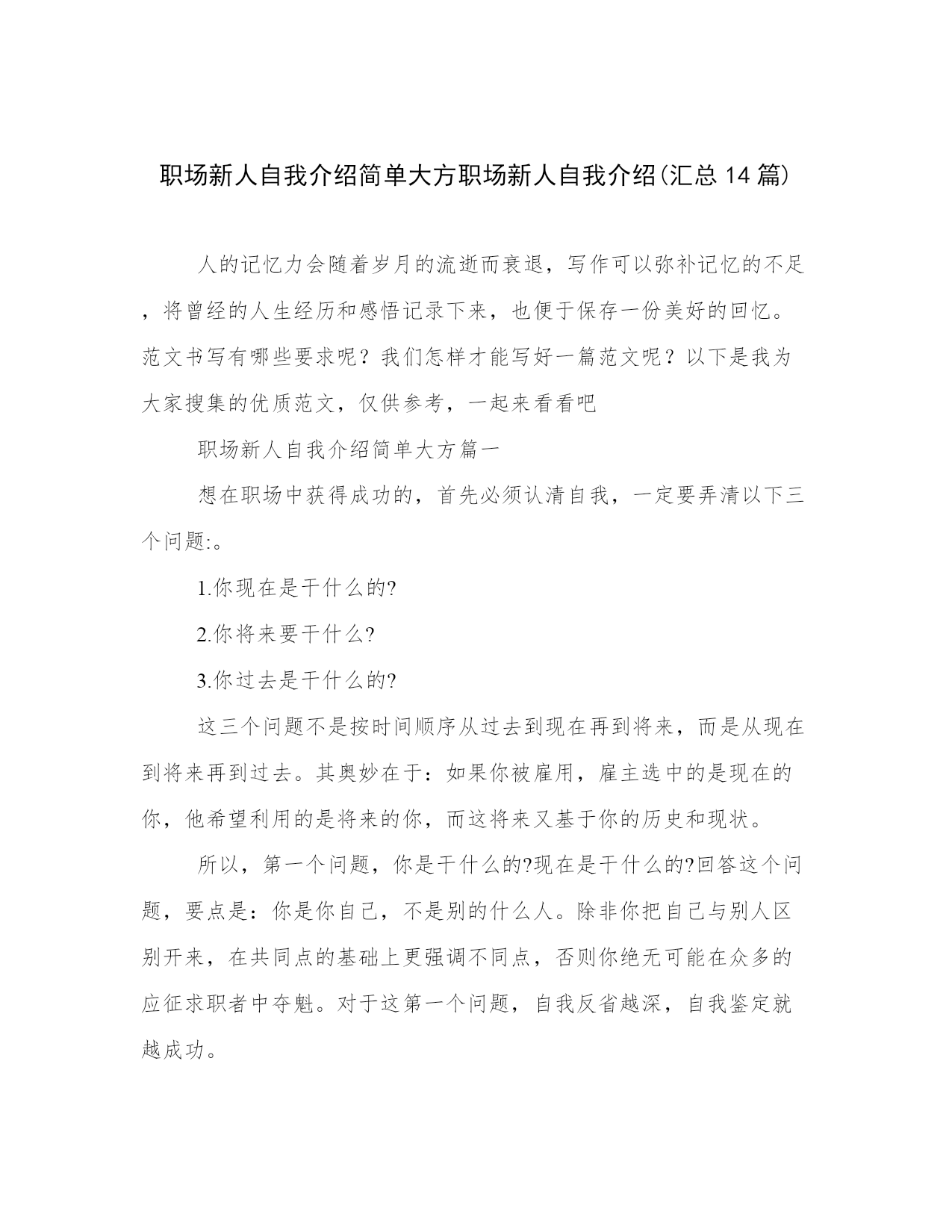 最新职场新人自我介绍简单大方职场新人自我介绍(汇总11篇)无论是身处学校还是步入社会,大家都尝试过写作吧,借助写作也可以提高我们的语言组织能力。相信许多人会觉得范文很难写?接下来小编就给大家介绍一下优秀的范文该怎么写,我们一起来看一看吧。职场新人自我介绍简单大方篇一想在职场中获得成功的,首先必须认清自我,一定要弄清以下三个问题:。1.你现在是干什么的?2.你将来要干什么?3.你过去是干什么的?这三个问题不是按时间顺序从过去到现在再到将来,而是从现在到将来再到过去。其奥妙在于:如果你被雇用,雇主选中的是现在的你,他希望利用的是将来的你,而这将来又基于你的历史和现状。所以,第一个问题,你是干什么的?现在是干什么的?回答这个问题,要点是:你是你自己,不是别的什么人。除非你把自己与别人区别开来,在共同点的基础上更强调不同点,否则你绝无可能在众多的应征求职者中夺魁。对于这第一个问题,自我反省越深,自我鉴定就越成功。随后,着手回答第二个问题:你将来要干什么?如果你申请的是一份举足轻重的工作,雇主肯定很关注你对未来的自我设计。你的回答要具体,合理,并符合你现在的身份,要有一个更别致的风格。然后,再着手回答最后一个问题:你过去是干什么的?你的过去当然都在履历上已有反映。你在面试中再度回答这个问题时,不可忽略之处是:不要抖落一个与你的将来毫不相干的过去。如果你中途彻底改行,更要在描述你的执着、职业目标的一贯性上下些功夫。要做到这一点,又要忠实于事实和本人,最简单的方法是:找到过去与将来的联系点,收集过去的资料,再按目标主次排列。用这样的方法,以现在为出发点,以将来为目标,以过去为证实,最重要的是加深了你的自我分析和理解其实,在面试的时候不一定有机会或者有必要照搬你的大作,但这三个问题的内在联系点一定会体现在自我表述的整体感觉中,使你的形象栩栩如生。2.投其所好。清楚自己的强项后,便可以开始准备自我介绍的内容:包括工作模式、优点、技能,突出成就、专业知识、学术背景等。好处众多,但只有短短一分钟,所以一切还是与该公司有关的好。如果是一间电脑公司,应说些电脑的话题;如是一间金融财务公司,便可跟他说钱的事,总之投其所好。但有一点必须紧记:话题所到之处,必须突出自己对该公司可以作出的贡献,如增加营业额、减低成本、发掘新市场等。3.铺排次序。内容的次序亦极重要,是否能抓住听众的注意力,全在于事件的编排方式。所以排在头位的,应是你最想他记得的事情。而这些事情,一般都是你最得意之作。与此同时,可呈上一些有关的作品或纪录增加印像分。1、尽量少用"我"这个字眼。举例:求职面试自我介绍中某人是这样表达的:"我叫某某,毕业于某校某系我的特长是---我的爱好是---我---"一连串的"我"!说着说着,她发现面试官的脸色越来越难看。分析:人们一般讨厌把"我"字放在嘴边,在自我介绍的开端如果连续三句都用"我"做开端面试官一般认为你是一个极端自私自利,自以为是的自我中心者。2、把好事留后头。举例:面试一开始,许多面试者就迫不及待的将自己的"光辉历史"一一历数,扬扬万里。分析:这不是明智的做法,容易给面试官一种自吹自擂,夸夸其谈的感觉。出招:好事应该留在后面说。尽量给人一种诚实谦虚的印象,使面试官对你刮目相看。或者将之换作一个话题,引起面试官兴趣,来主动问你。3、给自己留条后路。举例:为了证明自己"对这个企业的价值",作为一个刚从高校毕业的学生,有时甚至会夸下海口:"一年内,我能实现500万的利润!"。分析:殊不知,该企业业务比较分散,经验丰富的市场人员,一年的业绩能逾500万者也寥寥无几。面试官非常反感,问她"是否了解公司最近的动向"。"具体方案是什么",结果张口结实。出招:有些没办法确定的话题,先不要做出夸口。就是对自己能力有充分信心,也要有所保留,话不能说得太满。4、语言简洁,语气明快。举例:有些应聘者是这样介绍自己的:"我出生在海边,那儿风景优美---"。分析:应试者经常以为,这样的开头,形象生动,会给面试官留下深刻印象。殊不知,透过罗嗦的语言,面试官会发现应试者缺乏概括能力,并且,连他提问的用意都理解不了。出招:面试官不会想要了解你的成长经历,他想知道的是,你是否适合这份工作。所以,语言尽量简洁明快,要有条理性。千万不要采用"浪漫主意"的描述手法。“嗨,我叫巴里。天气不错,是吧?”这类介绍是你开启某种更有意义的事情的前奏。派对或社交活动中自我介绍的目的,是为了介绍你的业务,学习某种具体的事情,抑或仅仅是为了见面。我们来谈谈可能是最坏的自我介绍方式吧。一位男士走进一个会议室,与一组陌生人进行非正式的闲聊。他环绕整个房间与每个人握手,一边把自己介绍给对方,一边盯着每个人的眼睛看上差不多5秒钟的时间,并