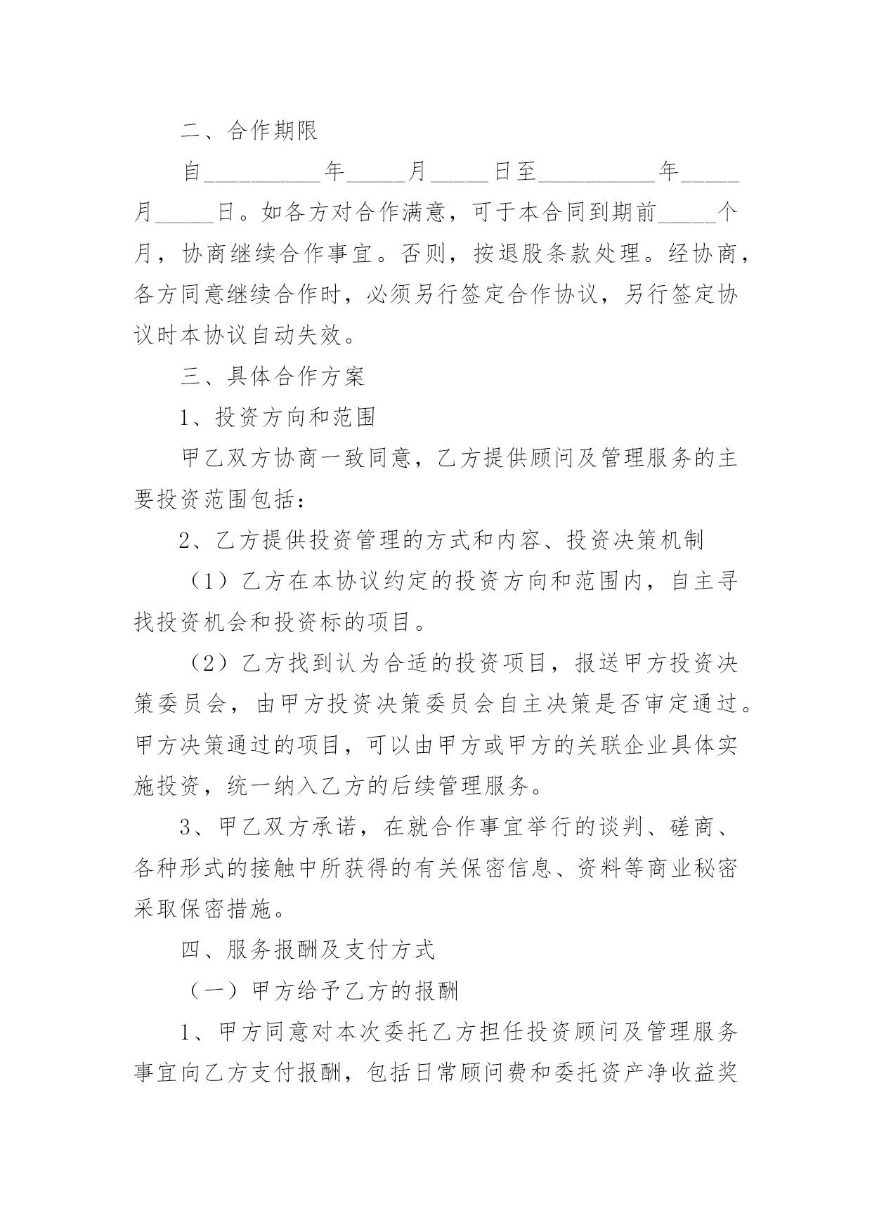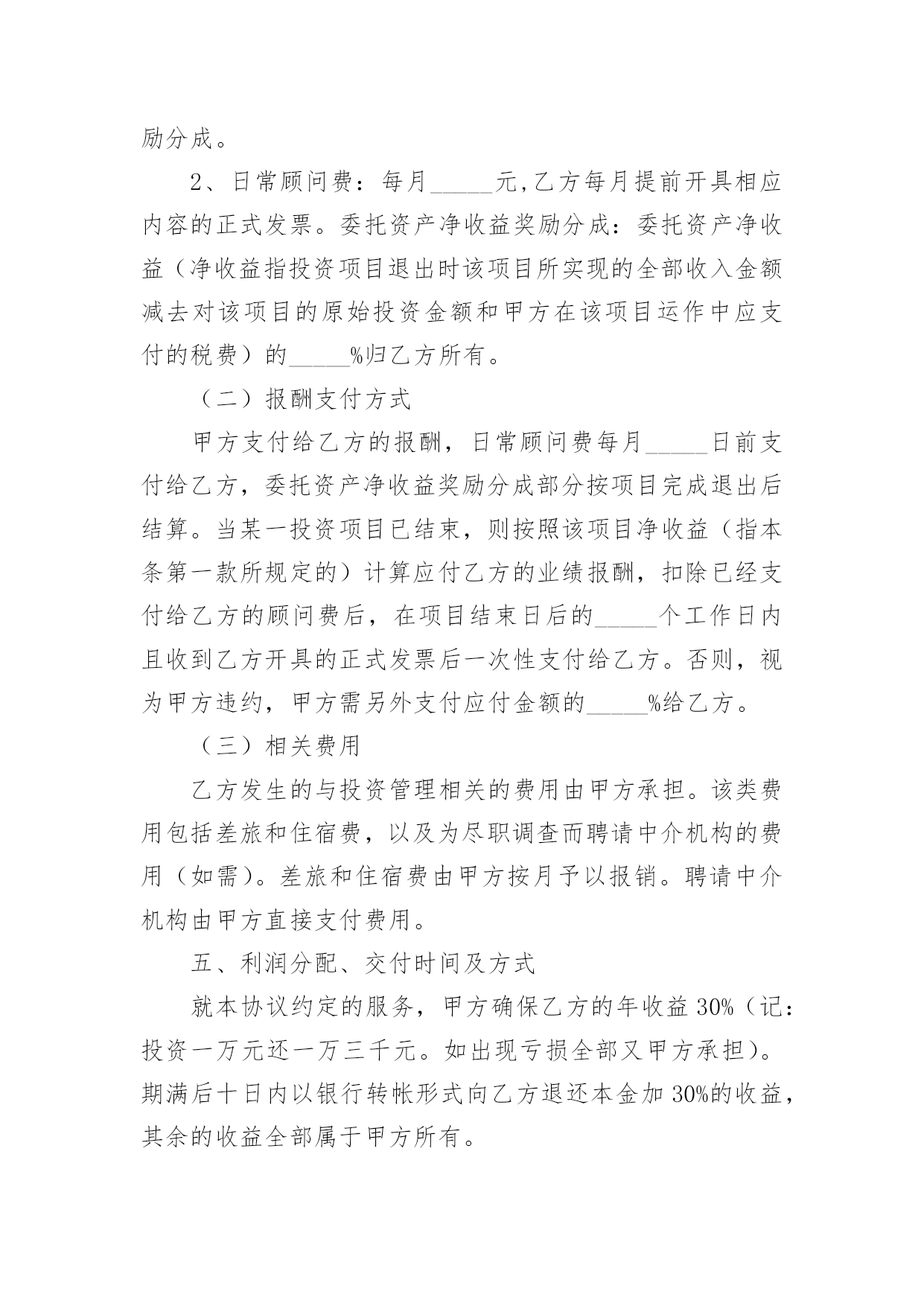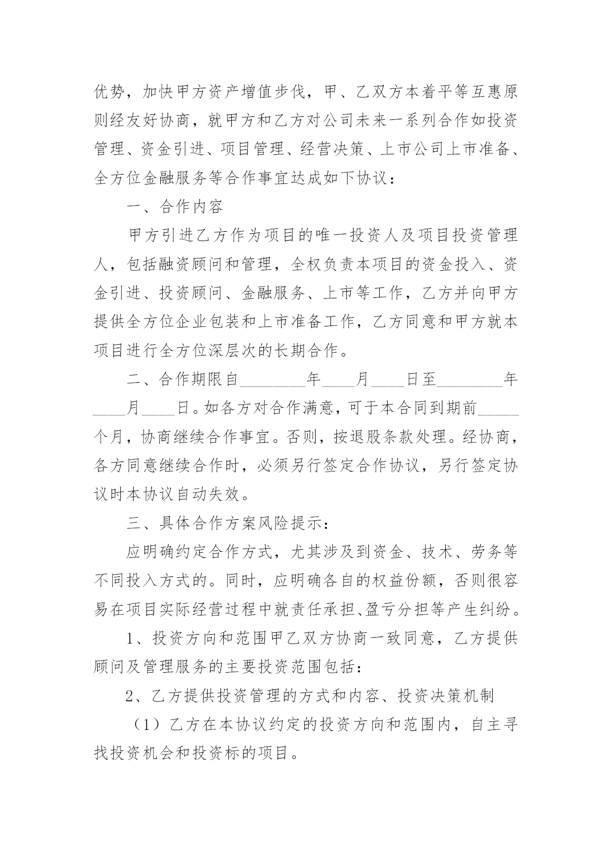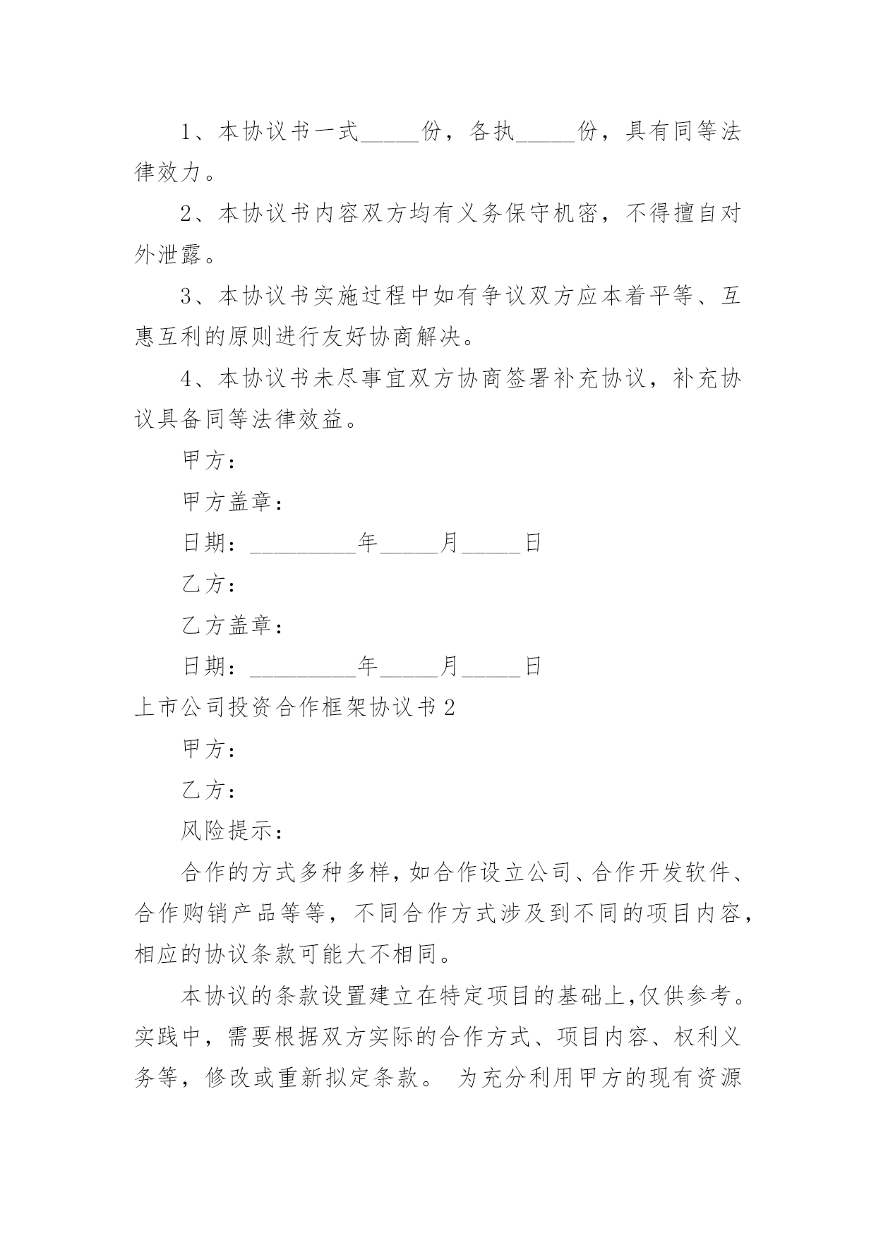 上市公司投资合作框架协议书上市公司投资合作框架协议书随着社会不断地进步,我们都跟协议书有着直接或间接的联系,签订协议书可以保障自身的权益不被侵害。那么写协议书真的很难吗?以下是小编精心整理的上市公司投资合作框架协议书,供大家参考借鉴,希望可以帮助到有需要的朋友。上市公司投资合作框架协议书1甲方:乙方:为充分利用甲方的现有资源优势,加快甲方资产增值步伐,甲、乙双方本着平等互惠原则经友好协商,就甲方和乙方对公司未来一系列合作如投资管理、资金引进、项目管理、经营决策、上市公司上市准备、全方位金融服务等合作事宜达成如下协议:一、合作内容甲方引进乙方作为项目的唯一投资人及项目投资管理人,包括融资顾问和管理,全权负责本项目的资金投入、资金引进、投资顾问、金融服务、上市等工作,乙方并向甲方提供全方位企业包装和上市准备工作,乙方同意和甲方就本项目进行全方位深层次的长期合作。二、合作期限自__________年_____月_____日至__________年_____月_____日。如各方对合作满意,可于本合同到期前_____个月,协商继续合作事宜。否则,按退股条款处理。经协商,各方同意继续合作时,必须另行签定合作协议,另行签定协议时本协议自动失效。三、具体合作方案1、投资方向和范围甲乙双方协商一致同意,乙方提供顾问及管理服务的主要投资范围包括:2、乙方提供投资管理的方式和内容、投资决策机制(1)乙方在本协议约定的投资方向和范围内,自主寻找投资机会和投资标的项目。(2)乙方找到认为合适的投资项目,报送甲方投资决策委员会,由甲方投资决策委员会自主决策是否审定通过。甲方决策通过的项目,可以由甲方或甲方的关联企业具体实施投资,统一纳入乙方的后续管理服务。3、甲乙双方承诺,在就合作事宜举行的谈判、磋商、各种形式的接触中所获得的有关保密信息、资料等商业秘密采取保密措施。四、服务报酬及支付方式(一)甲方给予乙方的报酬1、甲方同意对本次委托乙方担任投资顾问及管理服务事宜向乙方支付报酬,包括日常顾问费和委托资产净收益奖励分成。2、日常顾问费:每月_____元,乙方每月提前开具相应内容的正式发票。委托资产净收益奖励分成:委托资产净收益(净收益指投资项目退出时该项目所实现的全部收入金额减去对该项目的原始投资金额和甲方在该项目运作中应支付的税费)的_____%归乙方所有。(二)报酬支付方式甲方支付给乙方的报酬,日常顾问费每月_____日前支付给乙方,委托资产净收益奖励分成部分按项目完成退出后结算。当某一投资项目已结束,则按照该项目净收益(指本条第一款所规定的)计算应付乙方的业绩报酬,扣除已经支付给乙方的顾问费后,在项目结束日后的_____个工作日内且收到乙方开具的正式发票后一次性支付给乙方。否则,视为甲方违约,甲方需另外支付应付金额的_____%给乙方。(三)相关费用乙方发生的与投资管理相关的费用由甲方承担。该类费用包括差旅和住宿费,以及为尽职调查而聘请中介机构的费用(如需)。差旅和住宿费由甲方按月予以报销。聘请中介机构由甲方直接支付费用。五、利润分配、交付时间及方式就本协议约定的服务,甲方确保乙方的年收益30%(记:投资一万元还一万三千元。如出现亏损全部又甲方承担)。期满后十日内以银行转帐形式向乙方退还本金加30%的收益,其余的收益全部属于甲方所有。六、甲方义务1、甲方同意乙方作为该项目的唯一投资人及项目投资管理人,在本项目投资、经营、上市等工作实施中,如有重大事项决策乙方有一票否决权。2、甲方须及时按照乙方的要求提供该投资项目的详细资料,包括该项目的商业计划书或该项目的说明资料,并如实填报有关表格内容,如为复印件,甲方须加盖章证明,全力指导和支持、配合乙方引资或投资工作。3、甲方须向乙方提供公司的股权情况、客户及供应商名单、技术档案,专利技术、业务资料、财务状况等资料供乙方查阅。4、甲方配合乙方办理项目公司的股权质押手续,具体股权质押份额由双方协商拟定。5、在该协议执行过程中,甲方及时提供投资或投资所需的真实、有效的各项公司文件资料,及时为乙方工作提供必要的支持和便利条件。6、甲方在签订完协议后及时办理投资或融资的相关手续。及时付给乙方首次管理费用__________万元,承担约定付款方式及义务。7、投资或融资成功后管理费的支付方式:甲方须在第一笔资金到帐当天一次性向乙方支付全部管理服务费用,如有补充协议按补充协议之规定。七、乙方义务1、乙方快速搭建本次融资平台,成立专项投资和融资小组,指派小组负责人,全程负责该项目的实施进展工作,组织资深金融投资及资产管理专家为甲方经营管理量身订做策划出个性鲜明、切实可行的短期和长期投资管理目标、整体资金引进和管理战略规划方案和实施策略。2、根据甲方及其项目实际情况进行资料整理、对甲方项目运作进行价值分析、策划和包装,根据