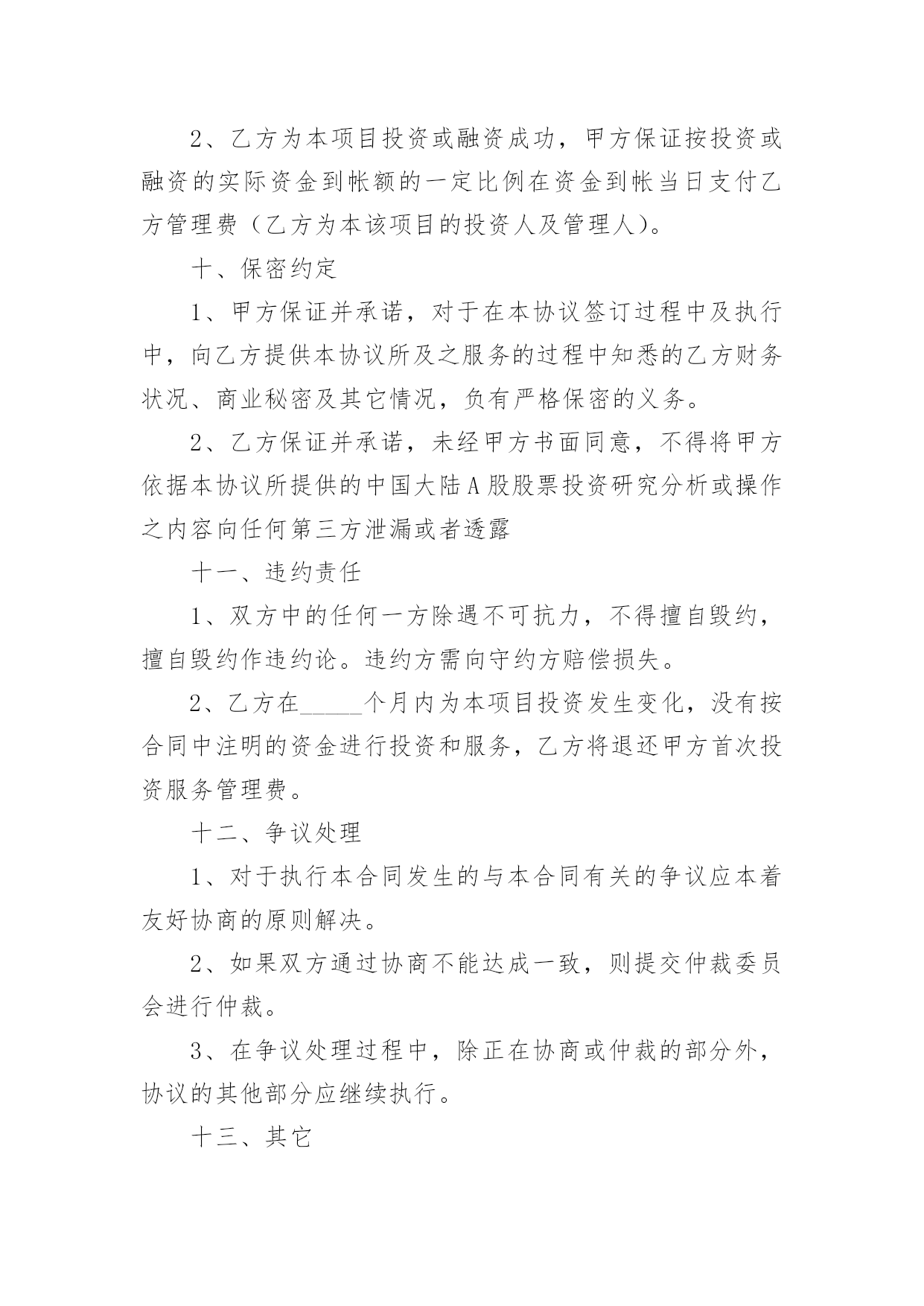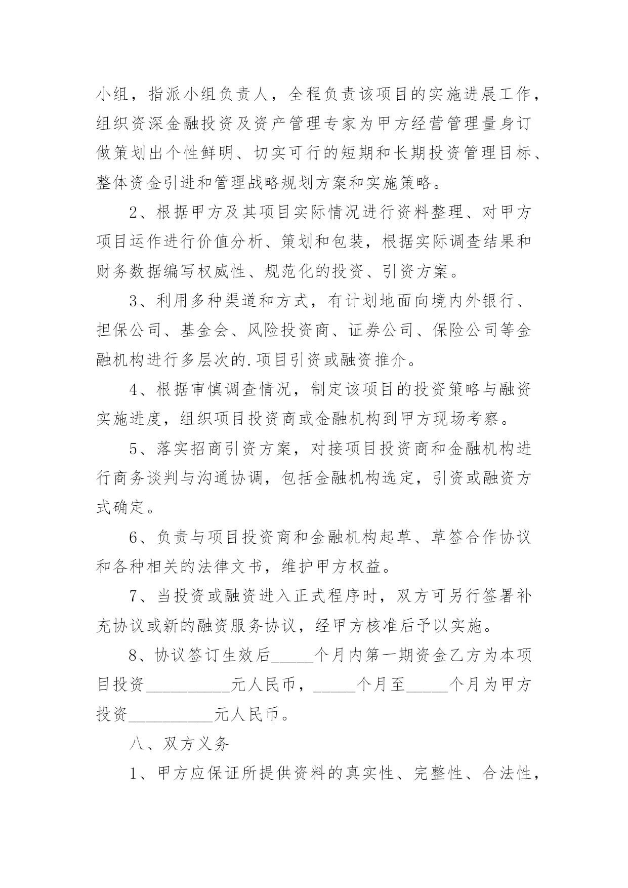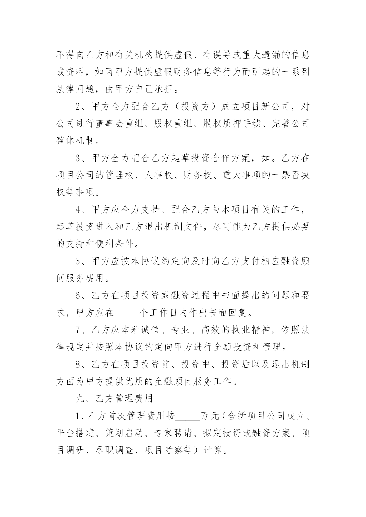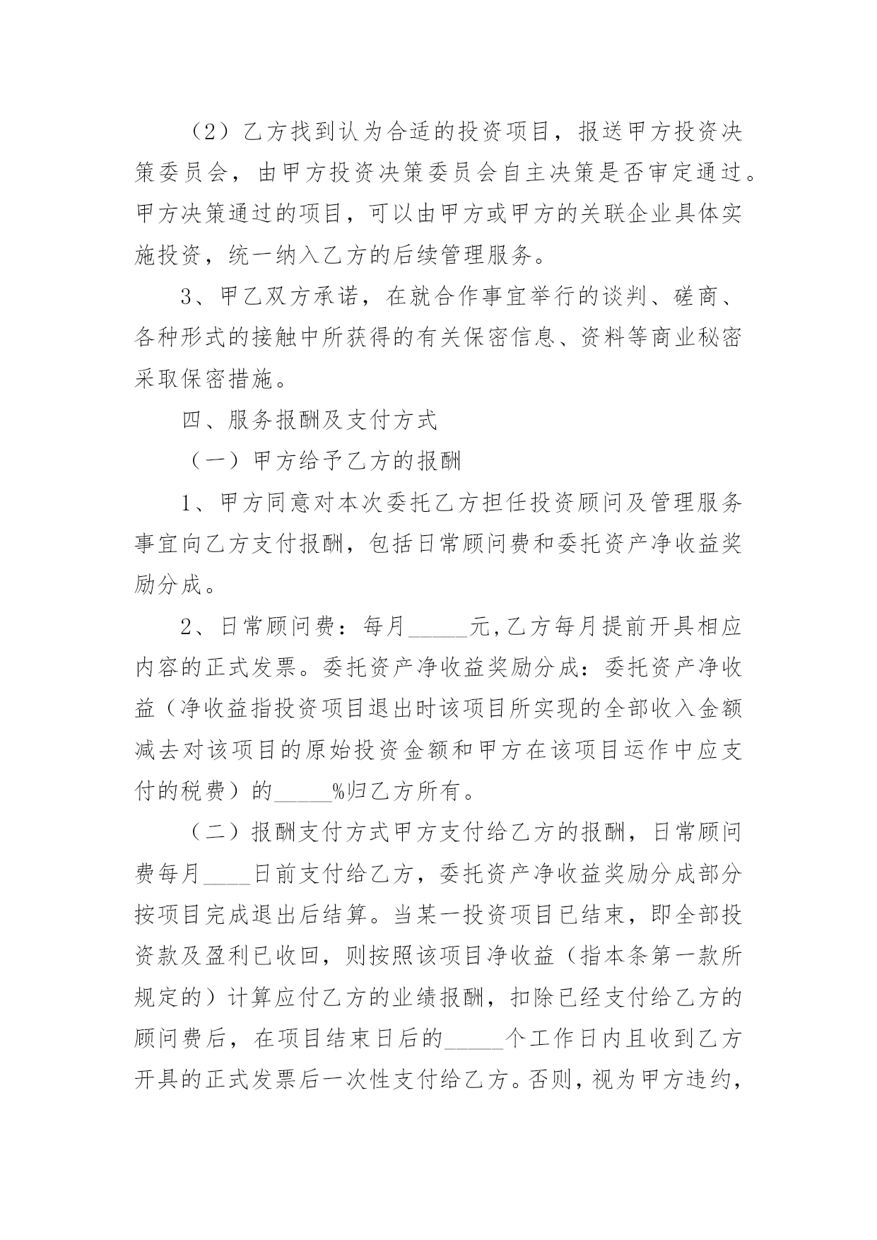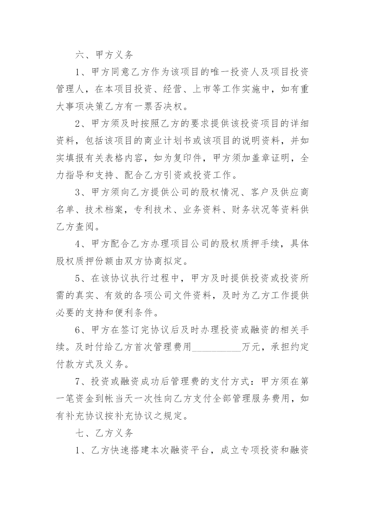 上市公司投资合作框架协议书上市公司投资合作框架协议书随着社会不断地进步,我们都跟协议书有着直接或间接的联系,签订协议书可以保障自身的权益不被侵害。那么写协议书真的很难吗?以下是小编精心整理的上市公司投资合作框架协议书,供大家参考借鉴,希望可以帮助到有需要的朋友。上市公司投资合作框架协议书1甲方:乙方:为充分利用甲方的现有资源优势,加快甲方资产增值步伐,甲、乙双方本着平等互惠原则经友好协商,就甲方和乙方对公司未来一系列合作如投资管理、资金引进、项目管理、经营决策、上市公司上市准备、全方位金融服务等合作事宜达成如下协议:一、合作内容甲方引进乙方作为项目的唯一投资人及项目投资管理人,包括融资顾问和管理,全权负责本项目的资金投入、资金引进、投资顾问、金融服务、上市等工作,乙方并向甲方提供全方位企业包装和上市准备工作,乙方同意和甲方就本项目进行全方位深层次的长期合作。二、合作期限自__________年_____月_____日至__________年_____月_____日。如各方对合作满意,可于本合同到期前_____个月,协商继续合作事宜。否则,按退股条款处理。经协商,各方同意继续合作时,必须另行签定合作协议,另行签定协议时本协议自动失效。三、具体合作方案1、投资方向和范围甲乙双方协商一致同意,乙方提供顾问及管理服务的主要投资范围包括:2、乙方提供投资管理的方式和内容、投资决策机制(1)乙方在本协议约定的投资方向和范围内,自主寻找投资机会和投资标的项目。(2)乙方找到认为合适的投资项目,报送甲方投资决策委员会,由甲方投资决策委员会自主决策是否审定通过。甲方决策通过的项目,可以由甲方或甲方的关联企业具体实施投资,统一纳入乙方的后续管理服务。3、甲乙双方承诺,在就合作事宜举行的谈判、磋商、各种形式的接触中所获得的有关保密信息、资料等商业秘密采取保密措施。四、服务报酬及支付方式(一)甲方给予乙方的报酬1、甲方同意对本次委托乙方担任投资顾问及管理服务事宜向乙方支付报酬,包括日常顾问费和委托资产净收益奖励分成。2、日常顾问费:每月_____元,乙方每月提前开具相应内容的正式发票。委托资产净收益奖励分成:委托资产净收益(净收益指投资项目退出时该项目所实现的全部收入金额减去对该项目的原始投资金额和甲方在该项目运作中应支付的税费)的_____%归乙方所有。(二)报酬支付方式甲方支付给乙方的报酬,日常顾问费每月_____日前支付给乙方,委托资产净收益奖励分成部分按项目完成退出后结算。当某一投资项目已结束,则按照该项目净收益(指本条第一款所规定的)计算应付乙方的业绩报酬,扣除已经支付给乙方的顾问费后,在项目结束日后的_____个工作日内且收到乙方开具的正式发票后一次性支付给乙方。否则,视为甲方违约,甲方需另外支付应付金额的_____%给乙方。(三)相关费用乙方发生的与投资管理相关的费用由甲方承担。该类费用包括差旅和住宿费,以及为尽职调查而聘请中介机构的费用(如需)。差旅和住宿费由甲方按月予以报销。聘请中介机构由甲方直接支付费用。五、利润分配、交付时间及方式就本协议约定的服务,甲方确保乙方的年收益30%(记:投资一万元还一万三千元。如出现亏损全部又甲方承担)。期满后十日内以银行转帐形式向乙方退还本金加30%的收益,其余的收益全部属于甲方所有。六、甲方义务1、甲方同意乙方作为该项目的唯一投资人及项目投资管理人,在本项目投资、经营、上市等工作实施中,如有重大事项决策乙方有一票否决权。2、甲方须及时按照乙方的要求提供该投资项目的详细资料,包括该项目的商业计划书或该项目的说明资料,并如实填报有关表格内容,如为复印件,甲方须加盖章证明,全力指导和支持、配合乙方引资或投资工作。3、甲方须向乙方提供公司的股权情况、客户及供应商名单、技术档案,专利技术、业务资料、财务状况等资料供乙方查阅。4、甲方配合乙方办理项目公司的股权质押手续,具体股权质押份额由双方协商拟定。5、在该协议执行过程中,甲方及时提供投资或投资所需的真实、有效的各项公司文件资料,及时为乙方工作提供必要的支持和便利条件。6、甲方在签订完协议后及时办理投资或融资的相关手续。及时付给乙方首次管理费用__________万元,承担约定付款方式及义务。7、投资或融资成功后管理费的支付方式:甲方须在第一笔资金到帐当天一次性向乙方支付全部管理服务费用,如有补充协议按补充协议之规定。七、乙方义务1、乙方快速搭建本次融资平台,成立专项投资和融资小组,指派小组负责人,全程负责该项目的实施进展工作,组织资深金融投资及资产管理专家为甲方经营管理量身订做策划出个性鲜明、切实可行的短期和长期投资管理目标、整体资金引进和管理战略规划方案和实施策略。2、根据甲方及其项目实际情况进行资料整理、对甲方项目运作进行价值分析、策划和包装,根据