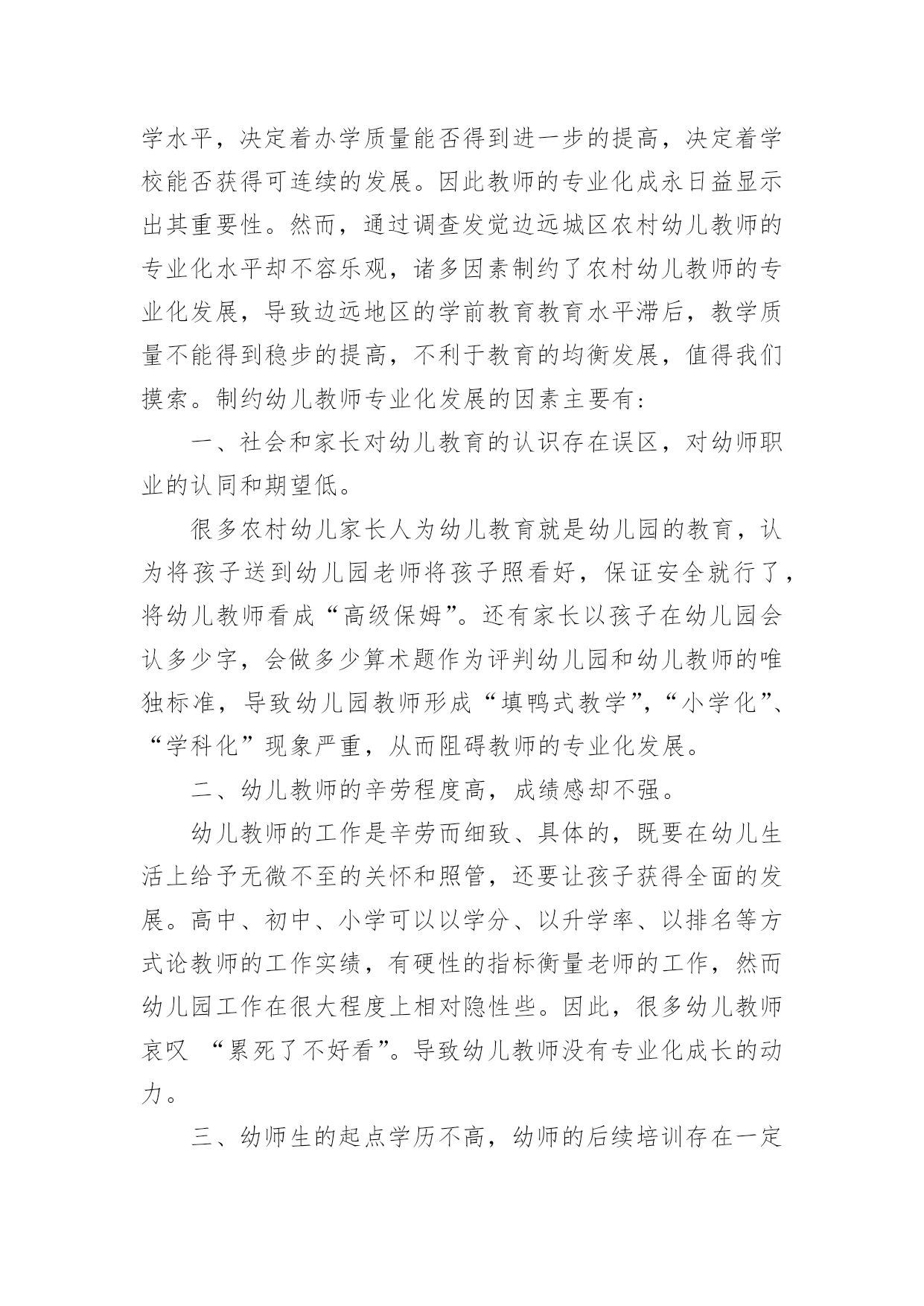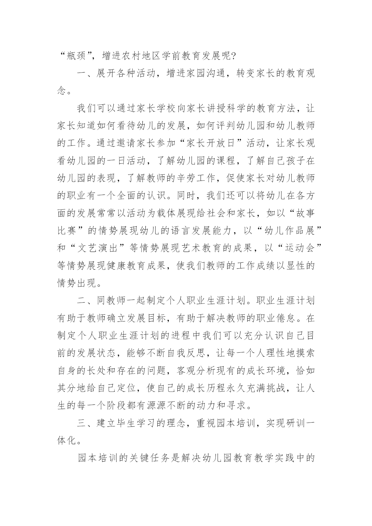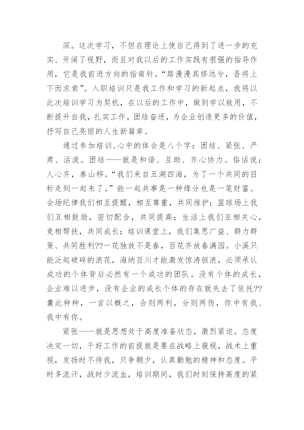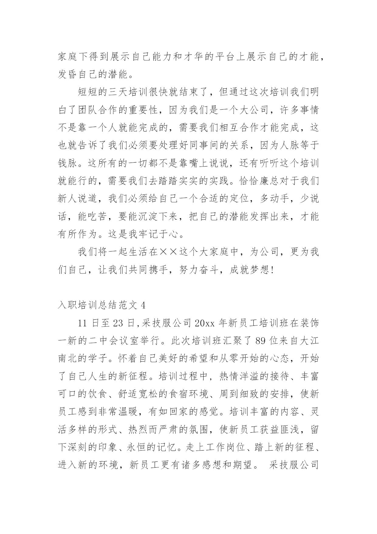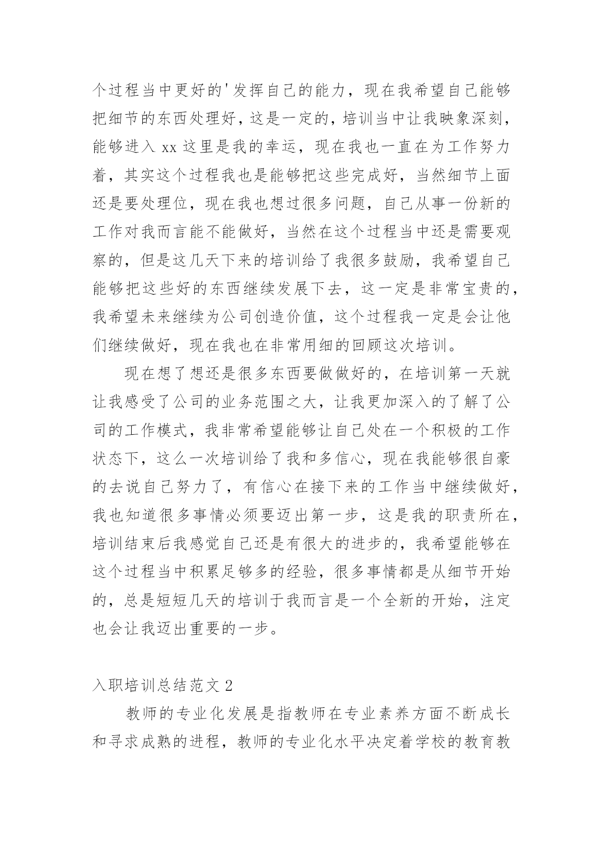 入职培训总结入职培训总结范文总结是事后对某一时期、某一项目或某些工作进行回顾和分析,从而做出带有规律性的结论,它在我们的学习、工作中起到呈上启下的作用,因此我们需要回头归纳,写一份总结了。总结怎么写才不会流于形式呢?以下是小编为大家收集的入职培训总结范文,仅供参考,欢迎大家阅读。入职培训总结范文1其实培训就是一个过程,但是我来xx这里这几天下来让我感触颇多,我对这里一切都是好奇的,在工作当中我也一直非常努力,进去xx公司这里是我的机遇,我一定会好好的珍惜,虽然说这个过程是非常枯燥,但是我也想让自己不断的成长,现在我也希望自己能够把这些细节的东西准备位,我知道只有努力了,只才会有进步,培训时间虽然不长,但是我一直都认为这是我应该做好的,应该努力的,在这个过程当会发生很多事情,当然也有一些细节上面的事情需要完善好,让我感受很多的就是自己的成长,自己的进步,这是不言而喻的,现在我也非常希望能够发挥自己的价值,今后为公司更加努力的工作,这几天的培训我也有一番心得。当然我也希望能够把这些细节的事情做好,但是在这个过程当中我也一直希望自己能够处理好细节上面的问题,我也希望自己在今后的工作当中更加用心,我也希望能够在这个过程当中更好的'发挥自己的能力,现在我希望自己能够把细节的东西处理好,这是一定的,培训当中让我映象深刻,能够进入xx这里是我的幸运,现在我也一直在为工作努力着,其实这个过程我也是能够把这些完成好,当然细节上面还是要处理位,现在我也想过很多问题,自己从事一份新的工作对我而言能不能做好,当然在这个过程当中还是需要观察的,但是这几天下来的培训给了我很多鼓励,我希望自己能够把这些好的东西继续发展下去,这一定是非常宝贵的,我希望未来继续为公司创造价值,这个过程我一定是会让他们继续做好,现在我也在非常用细的回顾这次培训。现在想了想还是很多东西要做做好的,在培训第一天就让我感受了公司的业务范围之大,让我更加深入的了解了公司的工作模式,我非常希望能够让自己处在一个积极的工作状态下,这么一次培训给了我和多信心,现在我能够很自豪的去说自己努力了,有信心在接下来的工作当中继续做好,我也知道很多事情必须要迈出第一步,这是我的职责所在,培训结束后我感觉自己还是有很大的进步的,我希望能够在这个过程当中积累足够多的经验,很多事情都是从细节开始的,总是短短几天的培训于我而言是一个全新的开始,注定也会让我迈出重要的一步。入职培训总结范文2教师的专业化发展是指教师在专业素养方面不断成长和寻求成熟的进程,教师的专业化水平决定着学校的教育教学水平,决定着办学质量能否得到进一步的提高,决定着学校能否获得可连续的发展。因此教师的专业化成永日益显示出其重要性。然而,通过调查发觉边远城区农村幼儿教师的专业化水平却不容乐观,诸多因素制约了农村幼儿教师的专业化发展,导致边远地区的学前教育教育水平滞后,教学质量不能得到稳步的提高,不利于教育的均衡发展,值得我们摸索。制约幼儿教师专业化发展的因素主要有:一、社会和家长对幼儿教育的认识存在误区,对幼师职业的认同和期望低。很多农村幼儿家长人为幼儿教育就是幼儿园的教育,认为将孩子送到幼儿园老师将孩子照看好,保证安全就行了,将幼儿教师看成“高级保姆”。还有家长以孩子在幼儿园会认多少字,会做多少算术题作为评判幼儿园和幼儿教师的唯独标准,导致幼儿园教师形成“填鸭式教学”,“小学化”、“学科化”现象严重,从而阻碍教师的专业化发展。二、幼儿教师的辛劳程度高,成绩感却不强。幼儿教师的工作是辛劳而细致、具体的,既要在幼儿生活上给予无微不至的关怀和照管,还要让孩子获得全面的发展。高中、初中、小学可以以学分、以升学率、以排名等方式论教师的工作实绩,有硬性的指标衡量老师的工作,然而幼儿园工作在很大程度上相对隐性些。因此,很多幼儿教师哀叹“累死了不好看”。导致幼儿教师没有专业化成长的动力。三、幼师生的起点学历不高,幼师的后续培训存在一定的局限性。目前我国幼儿园教师多是初中毕业后经过三年的'职前培训后直接就职的中专生,特别是近几年,很多幼师生是考大学无望,升高中无门的学生,基本的文化素养较低。而后续的培训常常理论和文化知识教多,培训的内容不能满足教师的实际工作的需要,造成理论和实践脱节,因此在工作中没法得心应手。四、管理者的水平和理念制约着教师的专业化发展。教师的专业化发展离不开管理者的重视和支持,有很多农村幼儿园的园长没有经过专业培训,观念不能跟上幼教改革情势,还有一部分民办幼儿园的幼儿教师活动性大,这些幼儿园的园长对幼儿园的可连续发展和教师的专业化发展没有作长远的计划,功利性强,只寻求眼前的短时间效益和利益,不愿花经费和精力、时间对教师进行培训、展开教研活动,因此也就谈不上有教师的专业发展。五、教师对自身职业的认识和看法也影响着教师的专业化发展。如果教