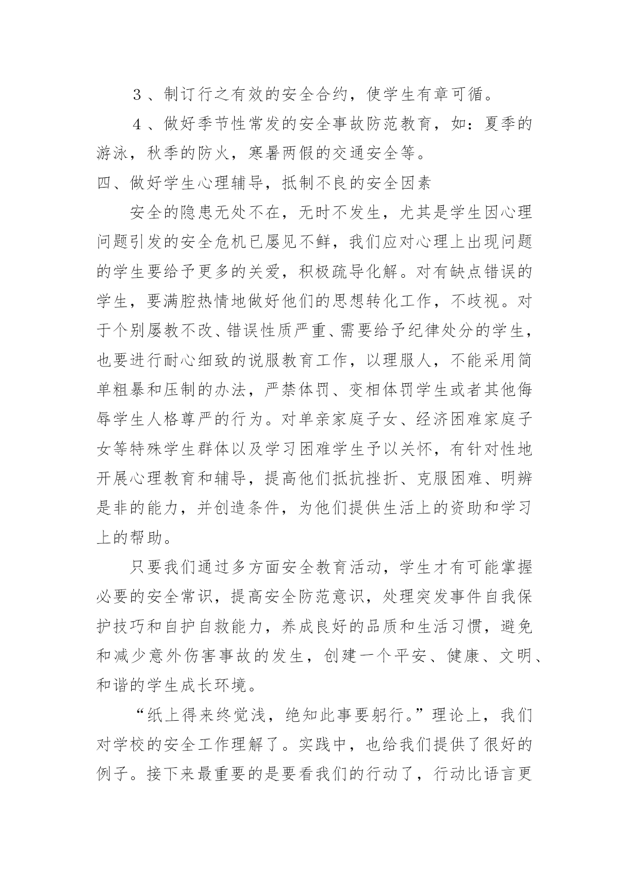 校园安全培训心得当我们心中积累了不少感想和见解时,不妨将其写成一篇心得体会,让自己铭记于心,这样能够给人努力向前的动力。是不是无从下笔、没有头绪?下面是小编帮大家整理的校园安全培训心得,希望能够帮助到大家。通过学校的安全培训,我对学校安全有了更系统的认识,更深刻体会到学校安全时时刻刻不能掉以轻心,校园安全时时刻刻不能忘。多位专家通过调研和收集大量数据分析,近来因校方直接或间接责任,造成数十人、甚至上百人伤亡的交通、火灾、爆炸、踩死踩伤、溺水等特重大事故。溺水死亡事故,食物中毒、服用药物引起的不良事件、不法分子冲击校园(特别是小学、幼儿园才是真正的弱势群体)扰乱学校秩序伤害师生的案件仍有发生。这些事故、事件的发生、不能不引发我们的深思,学校正常的教育教学秩序被打乱了,学生的身心健康会受到伤害、死伤学生的家庭遭受不可挽回的损失,同时,也给社会增加不安定因素,造成比较严重的社会影响。校园的安全是实行教育教学的保障,没有安全的保障,就没有办法实行教育教学。所以,我们要尽自己所能保障学生的安全。保障学生的安全可以从以下几个途径实施:一、教育学生自我防范,多渠道宣传安全知识。“授人以鱼不如授之与渔”。提高学生自我安全防护能力尤为重要。学生自我安全防护内容有:防触电,防火灾,防溺水,防食物中毒,防气体中毒,防拐骗,防自然灾害(雷电、大风、暴雨等)、防交通事故、防偷窃盗抢、防其他意外伤害等。以上内容可以通过加强遵纪守法教育,张贴安全教育宣传标语,发放宣传手册,利用周一国旗下讲话,广播、黑板报、墙报、课堂教学、班会集体活动等对学生进行安全知识宣传,使学生清楚地认识到“人人懂安全,个个讲安全”的思想教育。二、充分发挥家校合一的安全教育作用在家父母是学生的监护人,在校教师承担了儿童的监护人角色。因此,安全教育还需与家长加强联系,积极引导学生家长加强对学生安全知识教育,充分利用校讯通宣传安全公约,让安全教育家喻户晓,进入千家万户。做到教师与家长相互沟通,避免一些事故发生,增强彼此间树立“珍惜生命,安全第一”的共教意识。三、加强班级安全教育意识1、在班级中设立安全委员,随时发现班中的不安全因素,善于观察同学的细致变化,及时提醒老师给予这些同学更多的关心与帮助。2、充分利用相关的安全日组织学生观看安全教育录像,举行专题讲座和“争当安全文明卫士”演讲比赛,结合实际培养自救能力和处理问题能力的安全演练,提高学生的防范意识。3、制订行之有效的安全合约,使学生有章可循。4、做好季节性常发的安全事故防范教育,如:夏季的游泳,秋季的防火,寒暑两假的交通安全等。四、做好学生心理辅导,抵制不良的安全因素安全的隐患无处不在,无时不发生,尤其是学生因心理问题引发的安全危机已屡见不鲜,我们应对心理上出现问题的学生要给予更多的关爱,积极疏导化解。对有缺点错误的学生,要满腔热情地做好他们的思想转化工作,不歧视。对于个别屡教不改、错误性质严重、需要给予纪律处分的学生,也要进行耐心细致的说服教育工作,以理服人,不能采用简单粗暴和压制的办法,严禁体罚、变相体罚学生或者其他侮辱学生人格尊严的行为。对单亲家庭子女、经济困难家庭子女等特殊学生群体以及学习困难学生予以关怀,有针对性地开展心理教育和辅导,提高他们抵抗挫折、克服困难、明辨是非的能力,并创造条件,为他们提供生活上的资助和学习上的帮助。只要我们通过多方面安全教育活动,学生才有可能掌握必要的安全常识,提高安全防范意识,处理突发事件自我保护技巧和自护自救能力,养成良好的品质和生活习惯,避免和减少意外伤害事故的发生,创建一个平安、健康、文明、和谐的学生成长环境。“纸上得来终觉浅,绝知此事要躬行。”理论上,我们对学校的安全工作理解了。实践中,也给我们提供了很好的例子。接下来最重要的是要看我们的行动了,行动比语言更有力”。