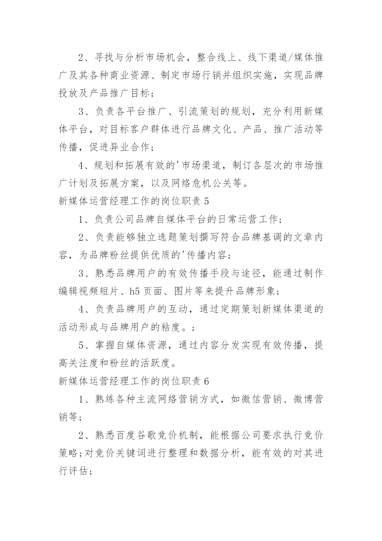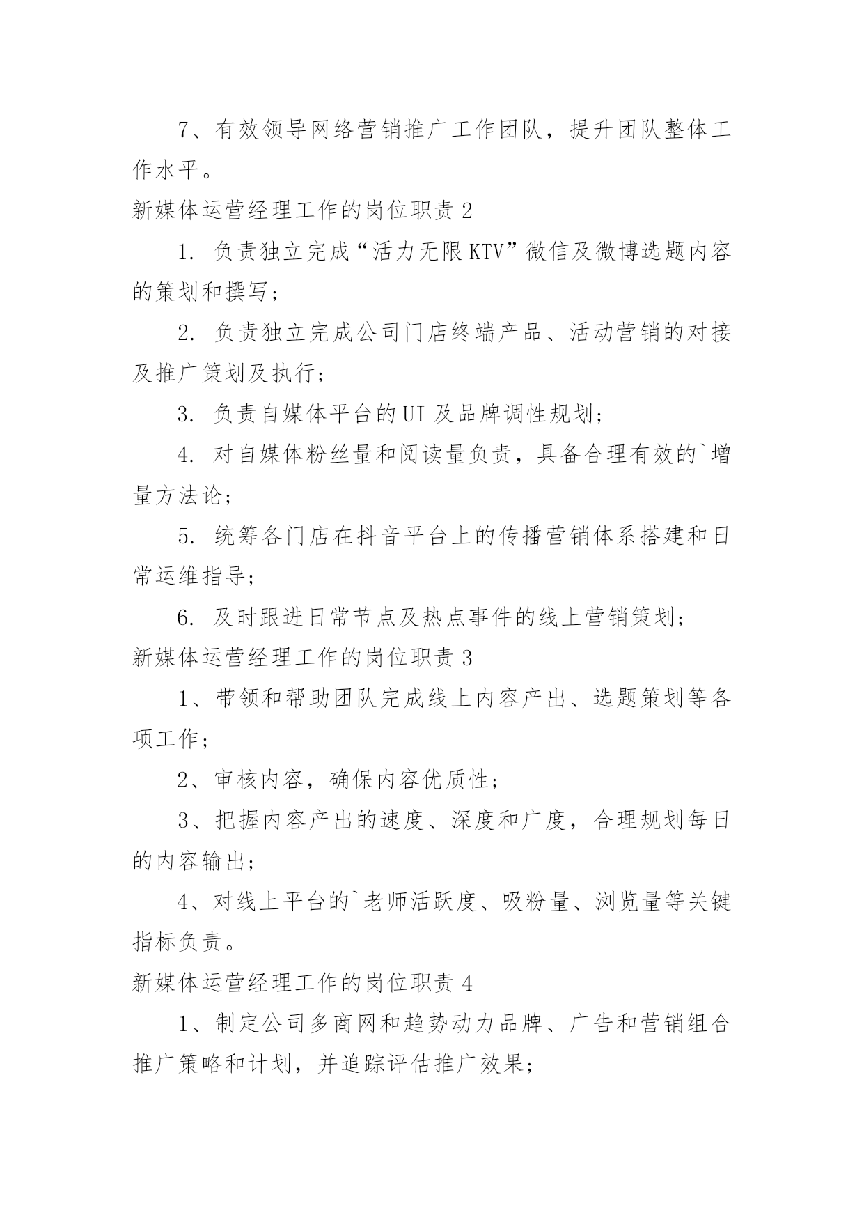 新媒体运营经理工作的岗位职责新媒体运营经理工作的岗位职责在不断进步的社会中,很多情况下我们都会接触到岗位职责,岗位职责是组织考核的依据。什么样的岗位职责才是有效的呢?以下是小编收集整理的新媒体运营经理工作的岗位职责,欢迎大家分享。新媒体运营经理工作的岗位职责11、有微信公众号,小程序开发经验,对微信公众平台上微网站微应用开发有较深的理解与应用,熟悉微信开发语言环境,能独立开发应用。2、制定适合公司平台的整体运营规划与网络营销策略,研究运营数据和用户反馈,快速调整网络运营策略,反馈产品优化方案;3、负责网站SEO推广、SEM推进,各种流量推广的策划、执行与跟踪;4、负责网络广告投放,及第三方网站进行流量、反链交换,专题活动合作,增加网站的流量、订单量和成交额;5、负责监控活动效果,优化宣传渠道和推广文案,提升运营效果;完成推广渠道的建设;6、负责搜集竞争行业产品创意和方案,进行调研分析,指导本公司项目的'策划执行;7、有效领导网络营销推广工作团队,提升团队整体工作水平。新媒体运营经理工作的岗位职责21.负责独立完成“活力无限KTV”微信及微博选题内容的策划和撰写;2.负责独立完成公司门店终端产品、活动营销的对接及推广策划及执行;3.负责自媒体平台的UI及品牌调性规划;4.对自媒体粉丝量和阅读量负责,具备合理有效的`增量方法论;5.统筹各门店在抖音平台上的传播营销体系搭建和日常运维指导;6.及时跟进日常节点及热点事件的线上营销策划;新媒体运营经理工作的岗位职责31、带领和帮助团队完成线上内容产出、选题策划等各项工作;2、审核内容,确保内容优质性;3、把握内容产出的速度、深度和广度,合理规划每日的内容输出;4、对线上平台的`老师活跃度、吸粉量、浏览量等关键指标负责。新媒体运营经理工作的岗位职责41、制定公司多商网和趋势动力品牌、广告和营销组合推广策略和计划,并追踪评估推广效果;2、寻找与分析市场机会,整合线上、线下渠道/媒体推广及其各种商业资源、制定市场行销并组织实施,实现品牌投放及产品推广目标;3、负责各平台推广、引流策划的规划,充分利用新媒体平台,对目标客户群体进行品牌文化、产品、推广活动等传播,促进异业合作;4、规划和拓展有效的'市场渠道,制订各层次的市场推广计划及拓展方案,以及网络危机公关等。新媒体运营经理工作的岗位职责51、负责公司品牌自媒体平台的日常运营工作;2、负责能够独立选题策划撰写符合品牌基调的文章内容,为品牌粉丝提供优质的'传播内容;3、熟悉品牌用户的有效传播手段与途径,能通过制作编辑视频短片、h5页面、图片等来提升品牌形象;4、负责品牌用户的互动,通过定期策划新媒体渠道的活动形成与品牌用户的粘度。;5、掌握自媒体资源,通过内容分发实现有效传播,提高关注度和粉丝的活跃度。新媒体运营经理工作的岗位职责61、熟练各种主流网络营销方式,如微信营销、微博营销等;2、熟悉百度谷歌竞价机制,能根据公司要求执行竞价策略;对竞价关键词进行整理和数据分析,能有效的对其进行评估;3、具有一定的文字理解能力和编写能力,负责公司网页描述的`撰写工作,有photoshop基础更佳;4、具有良好的沟通、理解能力,工作责任心强,能承担工作压力,具有团队合作精神;