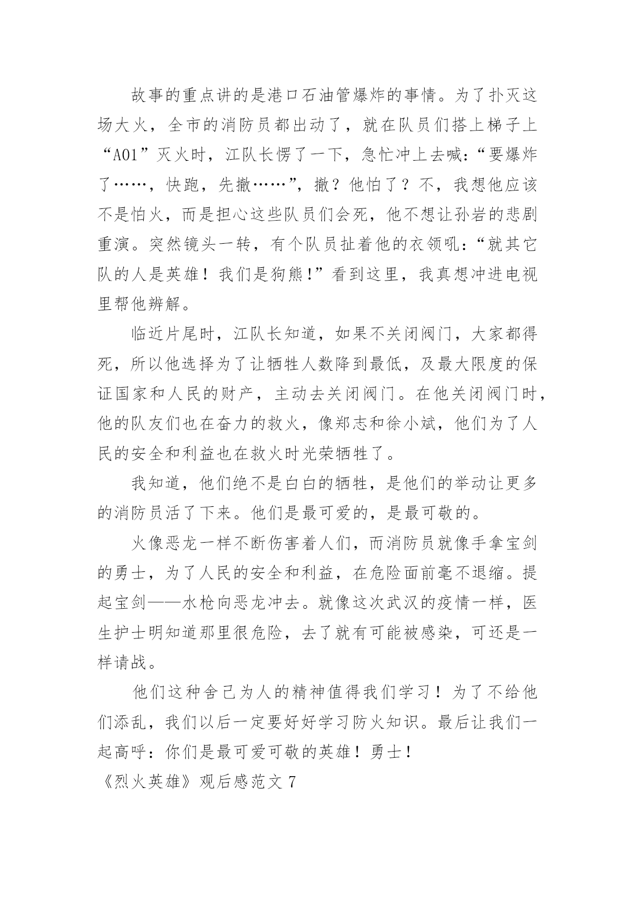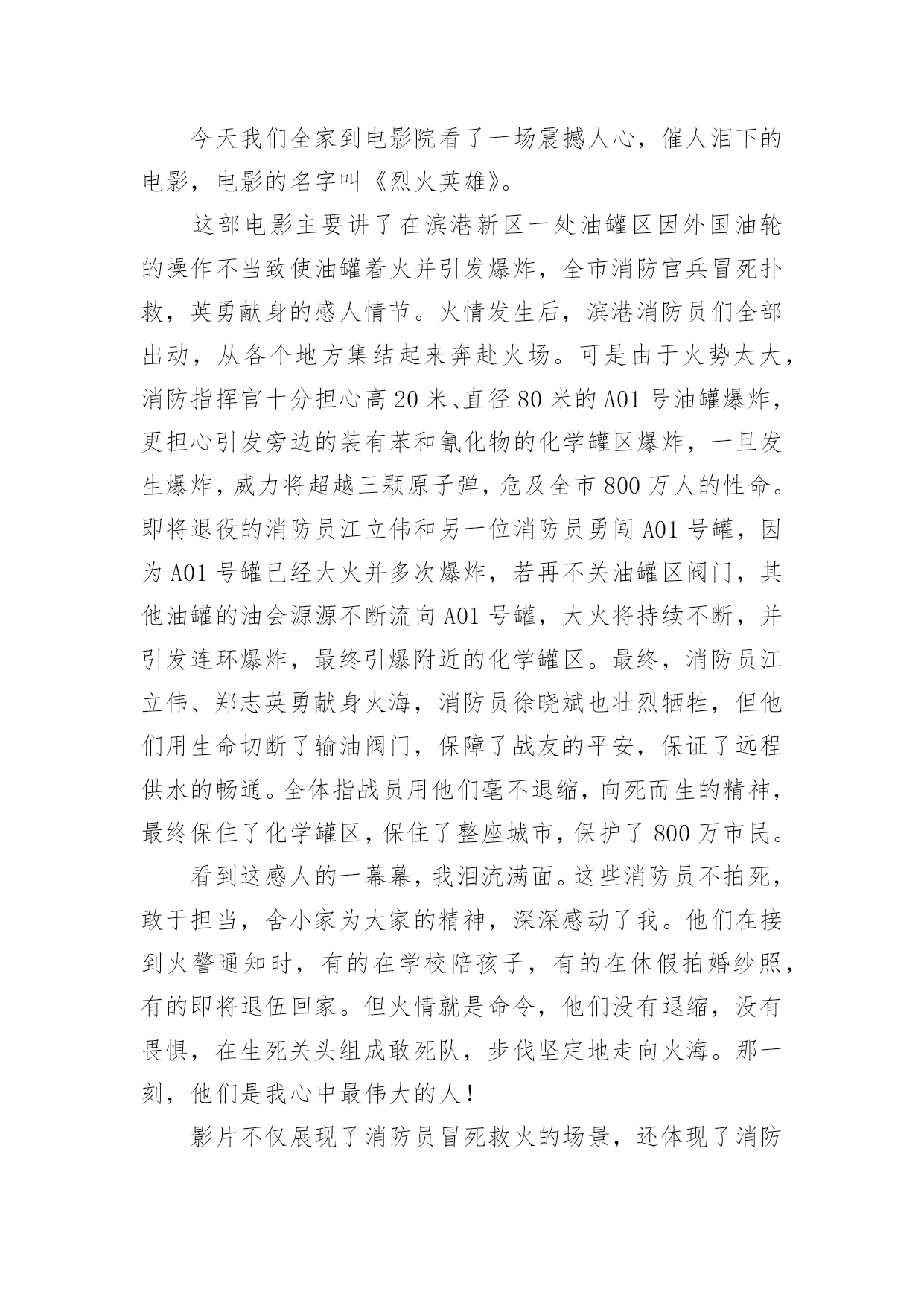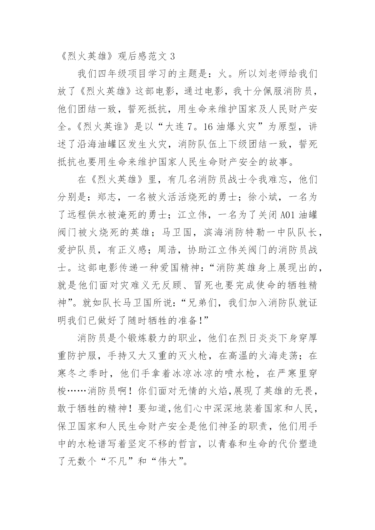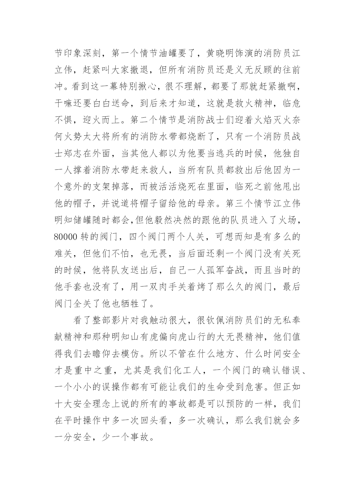 《烈火英雄》观后感《烈火英雄》观后感范文在观看完一部作品以后,一定对生活有了新的感悟和看法吧,不能光会看哦,写一篇观后感吧。你想知道观后感怎么写吗?以下是小编为大家收集的《烈火英雄》观后感范文,欢迎大家分享。《烈火英雄》观后感范文1那天,我跟着妈妈去看了电影《烈火英雄》,这部电影是以大连7·16油爆火灾”为原型,讲述了沿海油罐区发生火灾,消防员团结一致、誓死抵抗,以生命维护国家及人民财产安全的故事。我们学校附近就有一个消防站,几乎每天都能听到消防车出警的警笛声。在过年期间,当大家正欢聚一堂庆祝新年的时候,他们也不能休息,随时准备着出警。我知道消防员非常辛苦,但是看了电影之后,才知道他们的辛苦是我难以想象的。故事开头,江立伟奋不顾身冲入火场去救那个小女孩,可是饭店老板没有告诉消防员火场具体情况,最后虽然救出了小女孩,却牺牲了一名消防员。后来,有位男孩还有他的老师和爸爸,都说江立伟害死了那位消防员,我非常难受,明明是饭店老板隐瞒,他们为什么要污蔑江立伟,把消防员牺牲的责任推给他呢?我想不明白!当油罐区着火,全市的消防员齐心协力来灭火。徐作文晓彬和王璐正在拍婚纱照,二话不说就来火场,最后徐晓彬却因为海洋污染物缠住而牺牲。环境污染,不止害了海洋生物,最后的受害者还是人类!那个油罐区的领导最可恨,他担心消防员不肯救火,故意隐瞒谎报火情,耽搁救火时间!江立伟不得不徒手关闭阀门,他手套都被烫穿,满手伤,但依旧一圈一圈转动着阀门,他跟油罐大火说,现在我要和你一对一,你输了!不知道是什么样的信念让他坚持下来的啊。看着电影,我心里难过、感动、担心,一直紧张不已。我看过凉山大火的报道,牺牲了很多消防员,他们都很年轻,有的才比我大8岁。我问妈妈:他们的妈妈怎么舍得让他们做消防员呢?他们为什么要做消防员呢?难道他们不怕死吗?”妈妈缓缓地回答:每个人都怕死,但是为了守护我们的平安幸福,他们选择自己去承担危险。”哪有什么岁月静好,不过是有人替你负重前行致敬伟大的消防员!《烈火英雄》观后感范文28.26公司组织观看《烈火英雄》这部电影,它主要讲述的是滨港市海港码头发生管道,整个区原油都顺着A001油罐往外流,化成火海和阵阵,成胁全市、全省,甚至邻国的安全。慌乱的市民们四处奔逃,一辆辆消防车却逆向冲进火海。观看的时候感觉自己好几次都要泪崩了,里面有几个情节印象深刻,第一个情节油罐要了,黄晓明饰演的消防员江立伟,赶紧叫大家撤退,但所有消防员还是义无反顾的往前冲。看到这一幕特別揪心,很不理解,都要了那就赶紧撤啊,干嘛还要白白送命,到后来才知道,这就是救火精神,临危不惧,迎火而上。第二个情节是消防战士们迎着火焰灭火奈何火势太大将所有的消防水带都烧断了,只有一个消防员战士郑志在外面,当其他人都以为他要当逃兵的时候,他独自一人撑着消防水带赶来救人,当所有队员都救出后他因为一个意外的支架掉落,而被活活烧死在里面,临死之前他甩出他的帽子,并说道将帽子留给他的母亲。第三个情节江立伟明知储罐随时都会,但他毅然决然的跟他的队员进入了火场,80000转的阀门,四个阀门两个人关,可想而知是有多么的难关,但他们不怕,也无畏,当后面还剩一个阀门没有关死的时候,他将队友送出后,自己一人孤军奋战,而且当时的他手套也没有了,用一双肉手关着烤了那么久的阀门,最后阀门全关了他也牺牲了。看了整部影片对我触动很大,很钦佩消防员们的无私奉献精神和那种明知山有虎偏向虎山行的大无畏精神,他们值得我们去瞻仰去模仿。所以不管在什么地方、什么时间安全才是重中之重,尤其是我们化工人,一个阀门的确认错误、一个小小的误操作都有可能让我们的生命受到危害。但正如十大安全理念上说的所有的事故都是可以预防的一样,我们在平时操作中多一次回头看,多一次确认,那么我们就会多一分安全,少一个事故。《烈火英雄》观后感范文3我们四年级项目学习的主题是:火。所以刘老师给我们放了《烈火英雄》这部电影,通过电影,我十分佩服消防员,他们团结一致,誓死抵抗,用生命来维护国家及人民财产安全。《烈火英谁》是以“大连7。16油爆火灾”为原型,讲述了沿海油罐区发生火灾,消防队伍上下级团结一致,誓死抵抗也要用生命来维护国家人民生命财产安全的故事。在《烈火英雄》里,有几名消防员战士令我难忘,他们分别是:郑志,一名被火活活烧死的勇士;徐小斌,一名为了远程供水被淹死的勇士;江立伟,一名为了关闭A01油罐阀门被火烧死的英雄;马卫国,滨海消防特勒一中队队长,爱护队员,有正义感;周浩,协助江立伟关阀门的消防员战士。这部电影传递一种爱国精神:“消防英雄身上展现出的,就是他们面对灾难义无反顾、冒死也要完成使命的牺牲精神”。就如队长马卫国所说:“兄弟们,我们加入消防队就证明我们已做好了随时牺牲的准备!”消防员是个锻炼毅力的职业,他们在烈日炎炎下身穿厚重防护服,手持又大又重