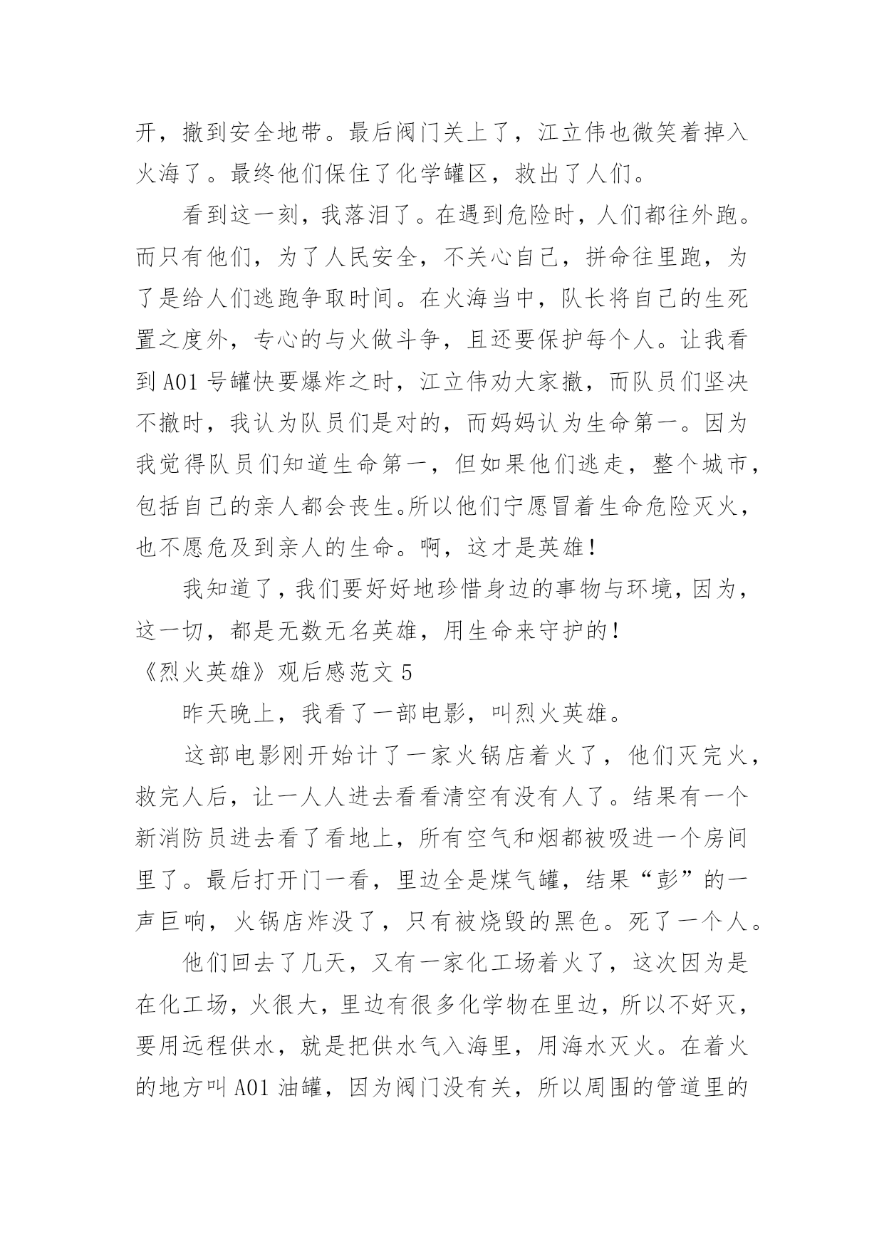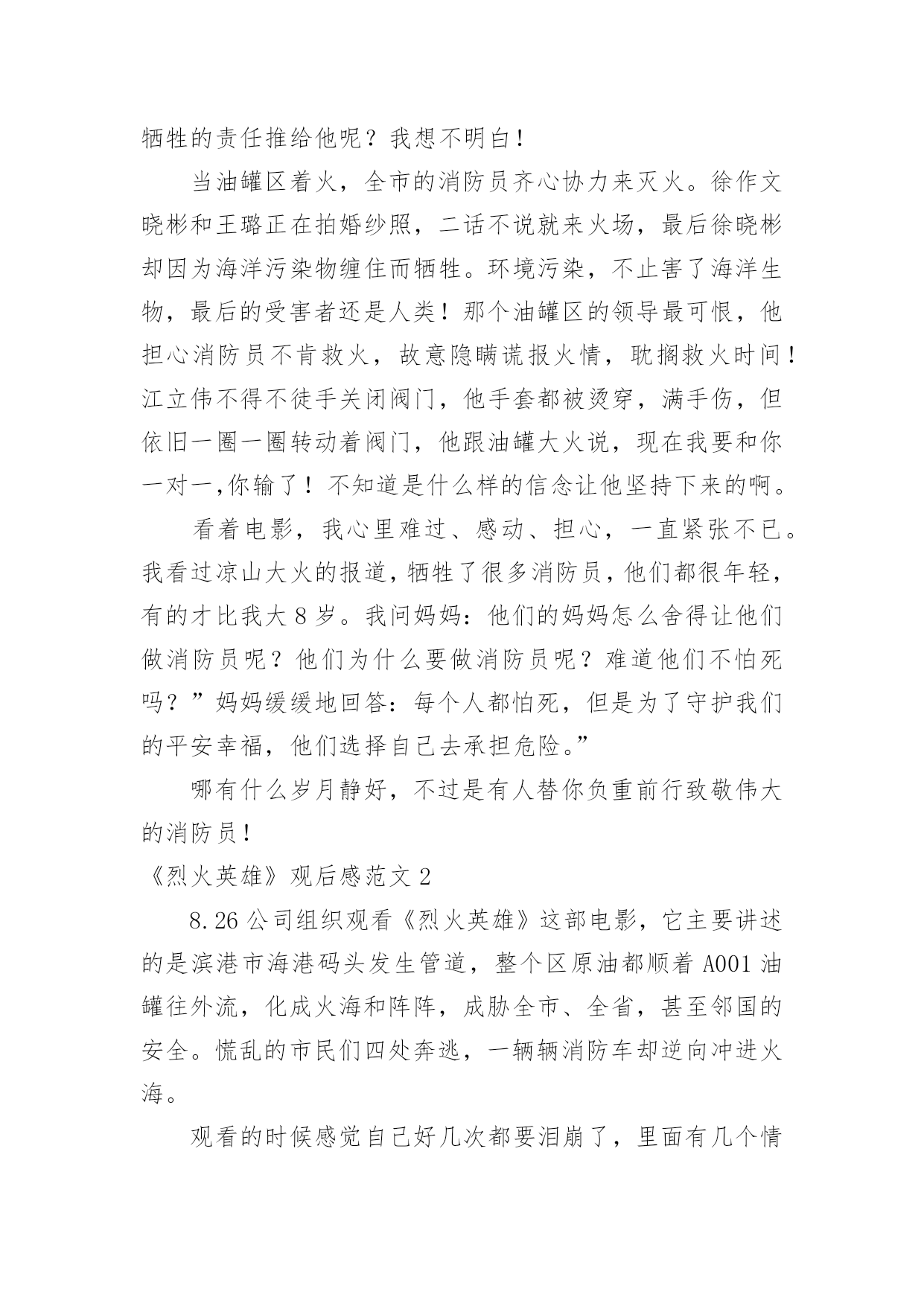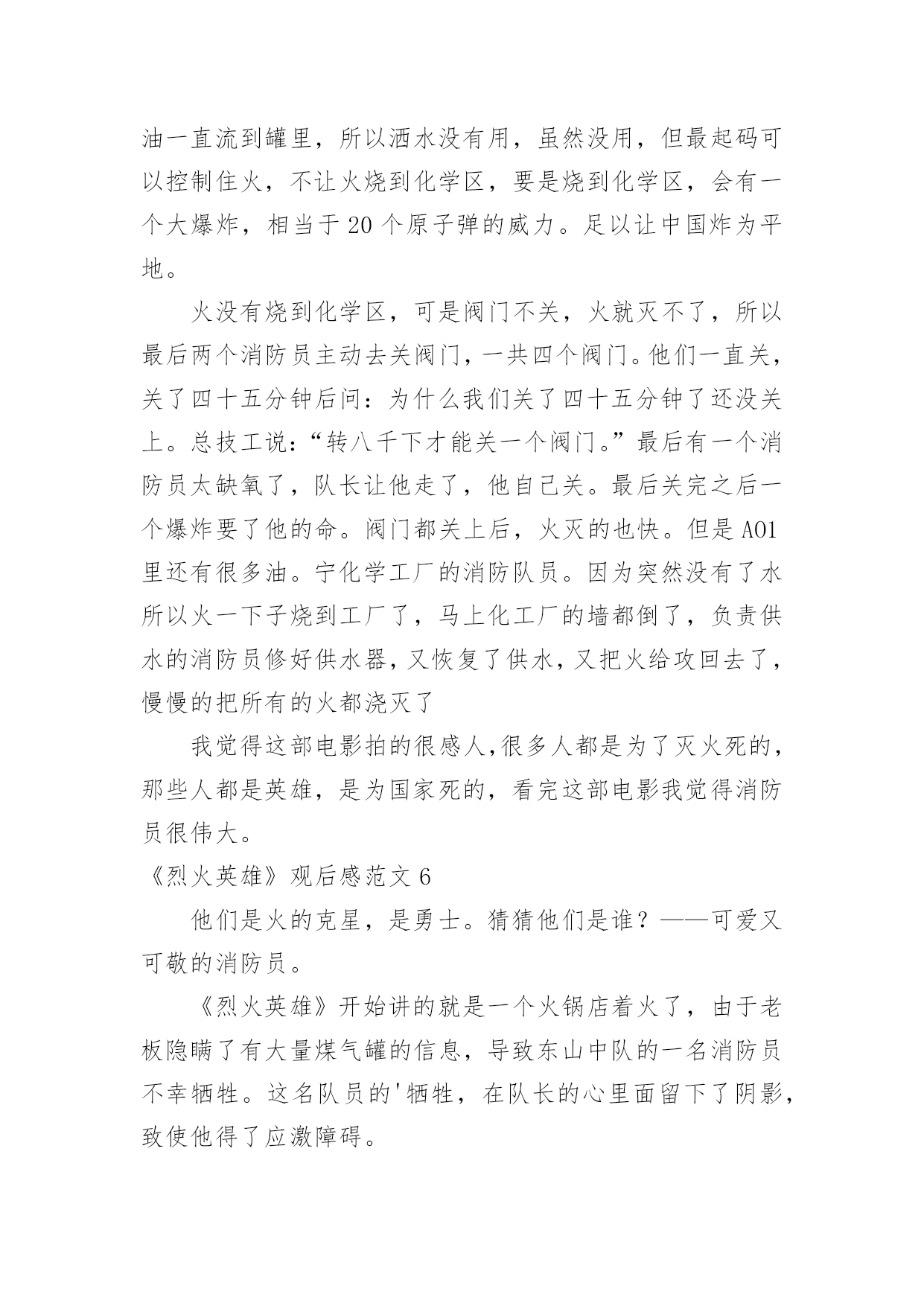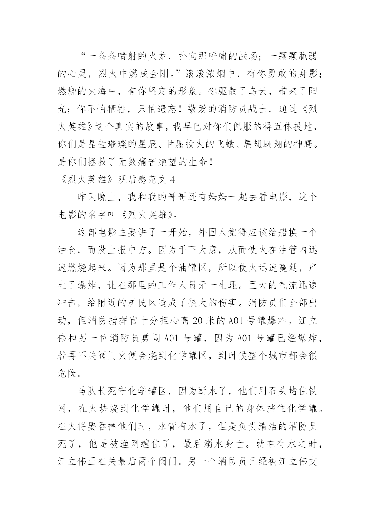 《烈火英雄》观后感《烈火英雄》观后感范文在观看完一部作品以后,一定对生活有了新的感悟和看法吧,不能光会看哦,写一篇观后感吧。你想知道观后感怎么写吗?以下是小编为大家收集的《烈火英雄》观后感范文,欢迎大家分享。《烈火英雄》观后感范文1那天,我跟着妈妈去看了电影《烈火英雄》,这部电影是以大连7·16油爆火灾”为原型,讲述了沿海油罐区发生火灾,消防员团结一致、誓死抵抗,以生命维护国家及人民财产安全的故事。我们学校附近就有一个消防站,几乎每天都能听到消防车出警的警笛声。在过年期间,当大家正欢聚一堂庆祝新年的时候,他们也不能休息,随时准备着出警。我知道消防员非常辛苦,但是看了电影之后,才知道他们的辛苦是我难以想象的。故事开头,江立伟奋不顾身冲入火场去救那个小女孩,可是饭店老板没有告诉消防员火场具体情况,最后虽然救出了小女孩,却牺牲了一名消防员。后来,有位男孩还有他的老师和爸爸,都说江立伟害死了那位消防员,我非常难受,明明是饭店老板隐瞒,他们为什么要污蔑江立伟,把消防员牺牲的责任推给他呢?我想不明白!当油罐区着火,全市的消防员齐心协力来灭火。徐作文晓彬和王璐正在拍婚纱照,二话不说就来火场,最后徐晓彬却因为海洋污染物缠住而牺牲。环境污染,不止害了海洋生物,最后的受害者还是人类!那个油罐区的领导最可恨,他担心消防员不肯救火,故意隐瞒谎报火情,耽搁救火时间!江立伟不得不徒手关闭阀门,他手套都被烫穿,满手伤,但依旧一圈一圈转动着阀门,他跟油罐大火说,现在我要和你一对一,你输了!不知道是什么样的信念让他坚持下来的啊。看着电影,我心里难过、感动、担心,一直紧张不已。我看过凉山大火的报道,牺牲了很多消防员,他们都很年轻,有的才比我大8岁。我问妈妈:他们的妈妈怎么舍得让他们做消防员呢?他们为什么要做消防员呢?难道他们不怕死吗?”妈妈缓缓地回答:每个人都怕死,但是为了守护我们的平安幸福,他们选择自己去承担危险。”哪有什么岁月静好,不过是有人替你负重前行致敬伟大的消防员!《烈火英雄》观后感范文28.26公司组织观看《烈火英雄》这部电影,它主要讲述的是滨港市海港码头发生管道,整个区原油都顺着A001油罐往外流,化成火海和阵阵,成胁全市、全省,甚至邻国的安全。慌乱的市民们四处奔逃,一辆辆消防车却逆向冲进火海。观看的时候感觉自己好几次都要泪崩了,里面有几个情节印象深刻,第一个情节油罐要了,黄晓明饰演的消防员江立伟,赶紧叫大家撤退,但所有消防员还是义无反顾的往前冲。看到这一幕特別揪心,很不理解,都要了那就赶紧撤啊,干嘛还要白白送命,到后来才知道,这就是救火精神,临危不惧,迎火而上。第二个情节是消防战士们迎着火焰灭火奈何火势太大将所有的消防水带都烧断了,只有一个消防员战士郑志在外面,当其他人都以为他要当逃兵的时候,他独自一人撑着消防水带赶来救人,当所有队员都救出后他因为一个意外的支架掉落,而被活活烧死在里面,临死之前他甩出他的帽子,并说道将帽子留给他的母亲。第三个情节江立伟明知储罐随时都会,但他毅然决然的跟他的队员进入了火场,80000转的阀门,四个阀门两个人关,可想而知是有多么的难关,但他们不怕,也无畏,当后面还剩一个阀门没有关死的时候,他将队友送出后,自己一人孤军奋战,而且当时的他手套也没有了,用一双肉手关着烤了那么久的阀门,最后阀门全关了他也牺牲了。看了整部影片对我触动很大,很钦佩消防员们的无私奉献精神和那种明知山有虎偏向虎山行的大无畏精神,他们值得我们去瞻仰去模仿。所以不管在什么地方、什么时间安全才是重中之重,尤其是我们化工人,一个阀门的确认错误、一个小小的误操作都有可能让我们的生命受到危害。但正如十大安全理念上说的所有的事故都是可以预防的一样,我们在平时操作中多一次回头看,多一次确认,那么我们就会多一分安全,少一个事故。《烈火英雄》观后感范文3我们四年级项目学习的主题是:火。所以刘老师给我们放了《烈火英雄》这部电影,通过电影,我十分佩服消防员,他们团结一致,誓死抵抗,用生命来维护国家及人民财产安全。《烈火英谁》是以“大连7。16油爆火灾”为原型,讲述了沿海油罐区发生火灾,消防队伍上下级团结一致,誓死抵抗也要用生命来维护国家人民生命财产安全的故事。在《烈火英雄》里,有几名消防员战士令我难忘,他们分别是:郑志,一名被火活活烧死的勇士;徐小斌,一名为了远程供水被淹死的勇士;江立伟,一名为了关闭A01油罐阀门被火烧死的英雄;马卫国,滨海消防特勒一中队队长,爱护队员,有正义感;周浩,协助江立伟关阀门的消防员战士。这部电影传递一种爱国精神:“消防英雄身上展现出的,就是他们面对灾难义无反顾、冒死也要完成使命的牺牲精神”。就如队长马卫国所说:“兄弟们,我们加入消防队就证明我们已做好了随时牺牲的准备!”消防员是个锻炼毅力的职业,他们在烈日炎炎下身穿厚重防护服,手持又大又重