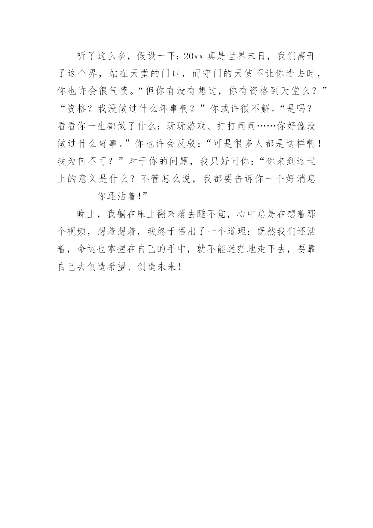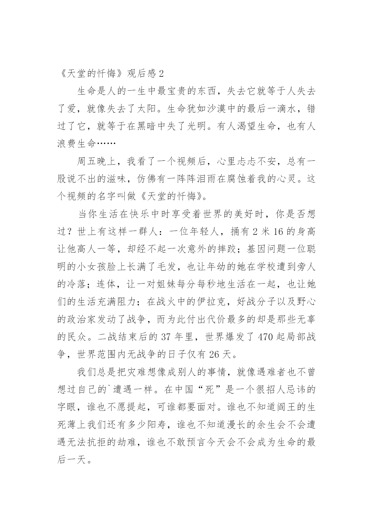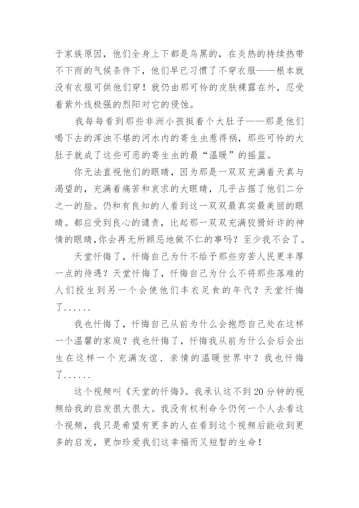 《天堂的忏悔》观后感看完一部作品后,对人生或者事物一定产生了许多感想吧,观后感需要表达真实的情感,不能虚假刻意。想必许多人都在为如何写好观后感而烦恼吧,以下是小编整理的《天堂的忏悔》观后感,欢迎阅读,希望大家能够喜欢。《天堂的忏悔》观后感1当你沉浸在此时的幸福却感觉不到身边的幸福时;当你正在挑剔某样东西如何如何的不好时,你却会发现,这世界上的有一群人连抱怨的机会都没有,他们深处的环境是仍何人都想象不到的,他们的处境寒酸到足以让天堂忏悔。这个周末我看了一个视频,画面上出现了一组对比图:左边是一幅几位富二代在饭店中夸夸其谈,暴殄天物;而另一幅是在贫苦的非洲大陆上的无数名穷人因饥恶而饿死的图片。看到这组对比图,我的心真是无法形容的沉重,而在我们中国,浪费粮食已经成了“最普遍”的。“最寻常”的了,由于世道上的种种原因,“打包”都成了很难为情的的事。当现代人整天争嚷着要减肥时,却不知道那些非洲的贫苦人家的孩子成天忍饥挨饿,只剩下了皮包骨头!这个比喻真得一点儿也不过分,在长期缺少营养物质的`情况下,几乎所有的黑人小孩都失去了人体最本质的肉,儿他们拥有的是多少现代少女梦寐以求的“纤细”“苗条”的腿啊?!由于家族原因,他们全身上下都是乌黑的,在炎热的持续热带不下雨的气候条件下,他们早已习惯了不穿衣服——根本就没有衣服可供他们穿!就仍由那可怜的皮肤裸露在外,忍受着紫外线极强的烈阳对它的侵蚀。我每每看到那些非洲小孩挺着个大肚子——那是他们喝下去的浑浊不堪的河水内的寄生虫惹得祸,那些可怜的大肚子就成了这些可恶的寄生虫的最“温暖”的摇篮。你无法直视他们的眼睛,因为那是一双双充满着天真与渴望的,充满着痛苦和哀求的大眼睛,几乎占据了他们二分之一的脸。仍和有良知的人看到这一双双最真实最美丽的眼睛。都应受到良心的谴责,比起那一双双充满狡猾奸诈的神情的眼睛,你会再无所顾忌地做不仁的事吗?至少我不会了。天堂忏悔了,忏悔自己为什不给予那些穷苦人民更丰厚一点的待遇?天堂忏悔了,忏悔自己为什么不将那些落难的人们投生到另一个会使他们丰衣足食的年代?天堂忏悔了......我也忏悔了,忏悔自己从前为什么会抱怨自己处在这样一个温馨的家庭?我也忏悔了,忏悔我从前为什么会后会出生在这样一个充满友谊、亲情的温暖世界中?我也忏悔了......这个视频叫《天堂的忏悔》。我承认这不到20分钟的视频给我的启发很大很大。我没有权利命令仍何一个人去看这个视频,我只是希望有更多的人在看到这个视频后能收到更多的启发,更加珍爱我们这幸福而又短暂的生命!《天堂的忏悔》观后感2生命是人的一生中最宝贵的东西,失去它就等于人失去了爱,就像失去了太阳。生命犹如沙漠中的最后一滴水,错过了它,就等于在黑暗中失了光明。有人渴望生命,也有人浪费生命……周五晚上,我看了一个视频后,心里忐忐不安,总有一股说不出的滋味,仿佛有一阵阵泪雨在腐蚀着我的心灵。这个视频的名字叫做《天堂的忏悔》。当你生活在快乐中时享受着世界的美好时,你是否想过?世上有这样一群人:一位年轻人,捅有2米16的身高让他高人一等,却经不起一次意外的摔跤;基因问题一位聪明的小女孩脸上长满了毛发,也让年幼的她在学校遭到旁人的冷落;连体,让一对姐妹每分每秒地生活在一起,也让她们的生活充满阻力;在战火中的伊拉克,好战分子以及野心的政治家发动了战争,而为此付出代价最多的却是那些无辜的民众。二战结束后的37年里,世界爆发了470起局部战争,世界范围内无战争的日子仅有26天。我们总是把灾难想像成别人的事情,就像遇难者也不曾想过自己的`遭遇一样。在中国“死”是一个很招人忌讳的字眼,谁也不愿提起,可谁都要面对。谁也不知道阎王的生死薄上我们还有多少阳寿,谁也不知道漫长的余生会不会遭遇无法抗拒的劫难,谁也不敢预言今天会不会成为生命的最后一天。听了这么多,假设一下:20xx真是世界末日,我们离开了这个界,站在天堂的门口,而守门的天使不让你进去时,你也许会很气愤。“但你有没有想过,你有资格到天堂么?”“资格?我没做过什么坏事啊?”你或许很不解。“是吗?看看你一生都做了什么:玩玩游戏、打打闹闹……你好像没做过什么好事。”你也许会反驳:“可是很多人都是这样啊!我为何不可?”对于你的问题,我只好问你:“你来到这世上的意义是什么?不管怎么说,我都要告诉你一个好消息————你还活着!”晚上,我躺在床上翻来覆去睡不觉,心中总是在想着那个视频,想着想着,我终于悟出了一个道理:既然我们还活着,命运也掌握在自己的手中,就不能迷茫地走下去,要靠自己去创造希望、创造未来!