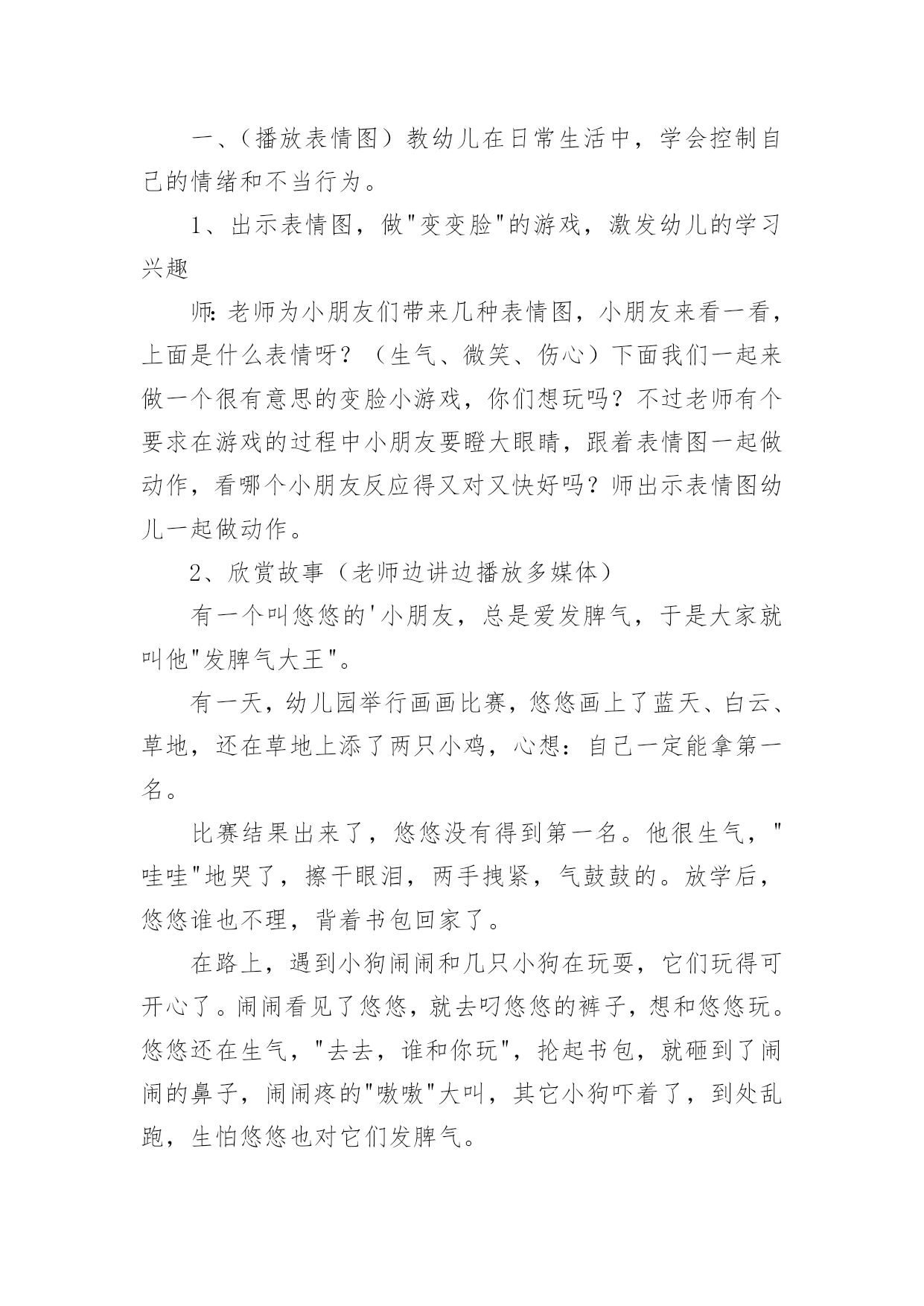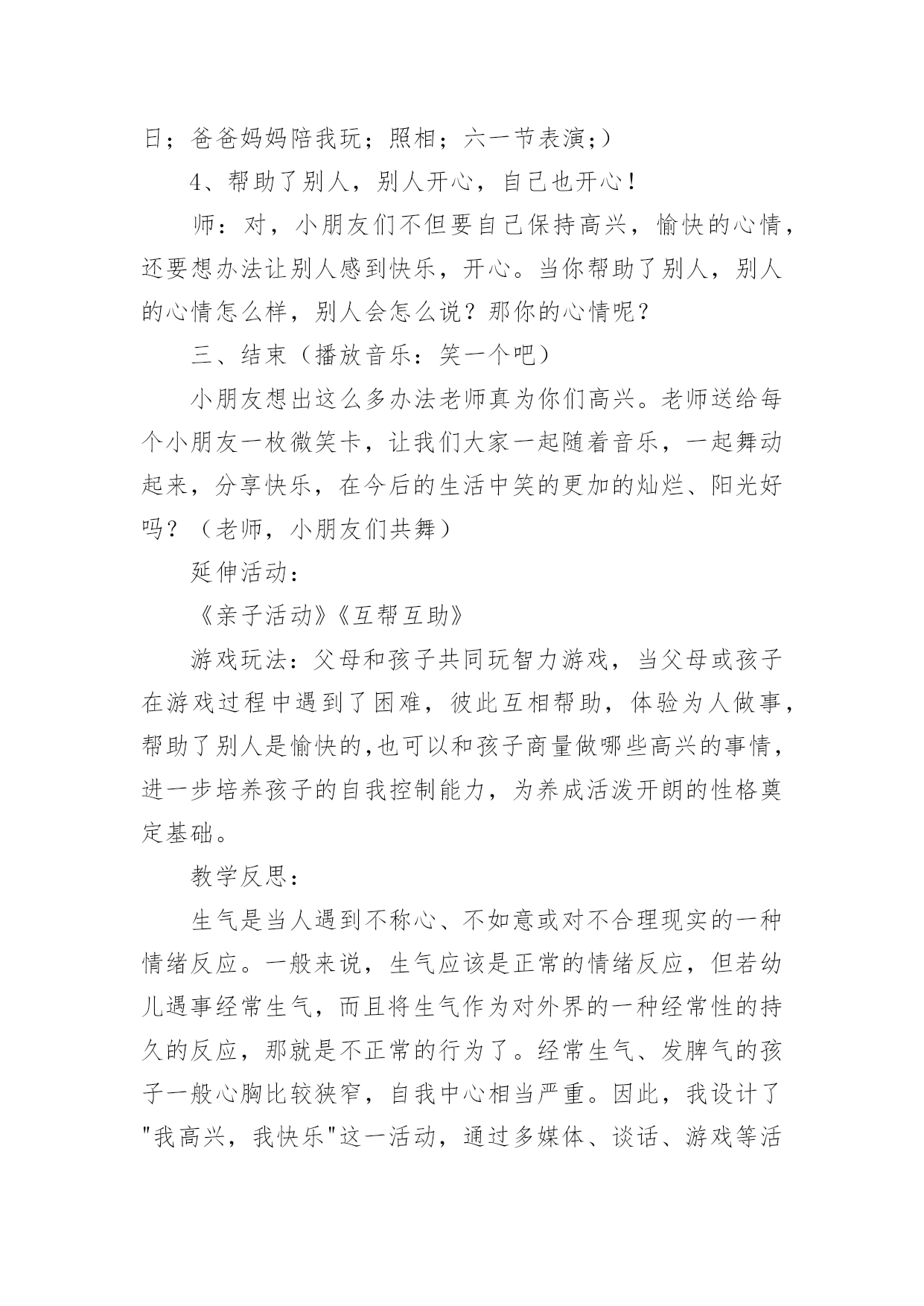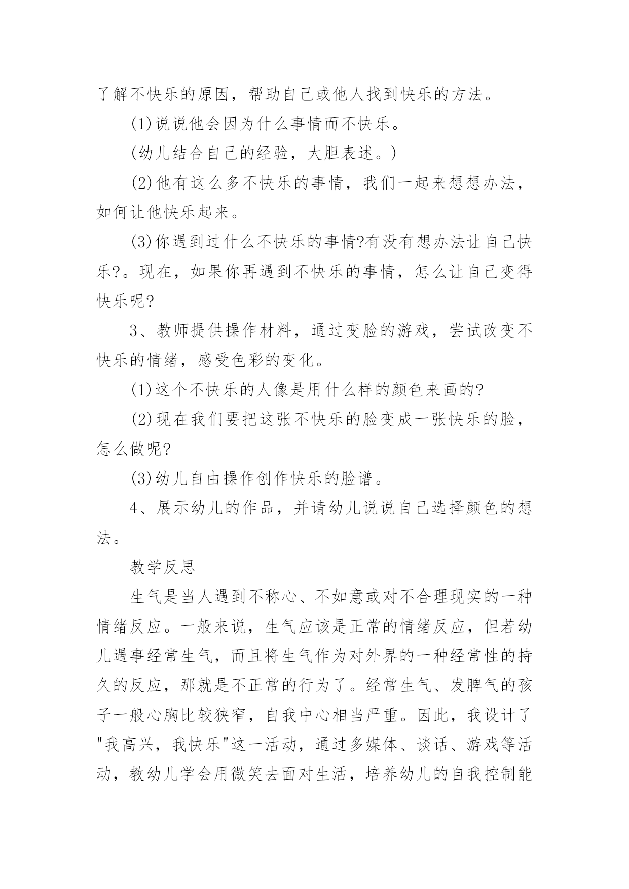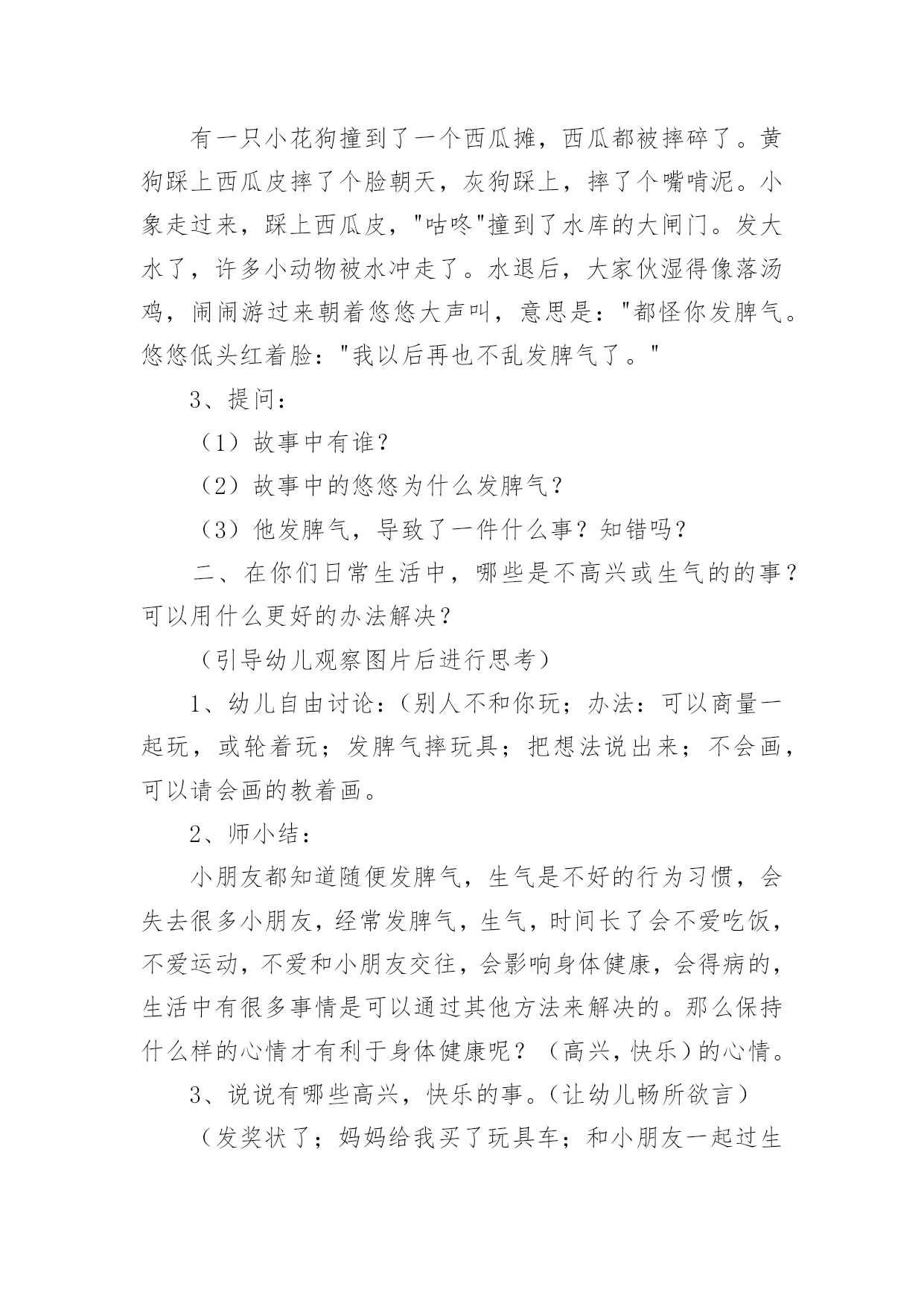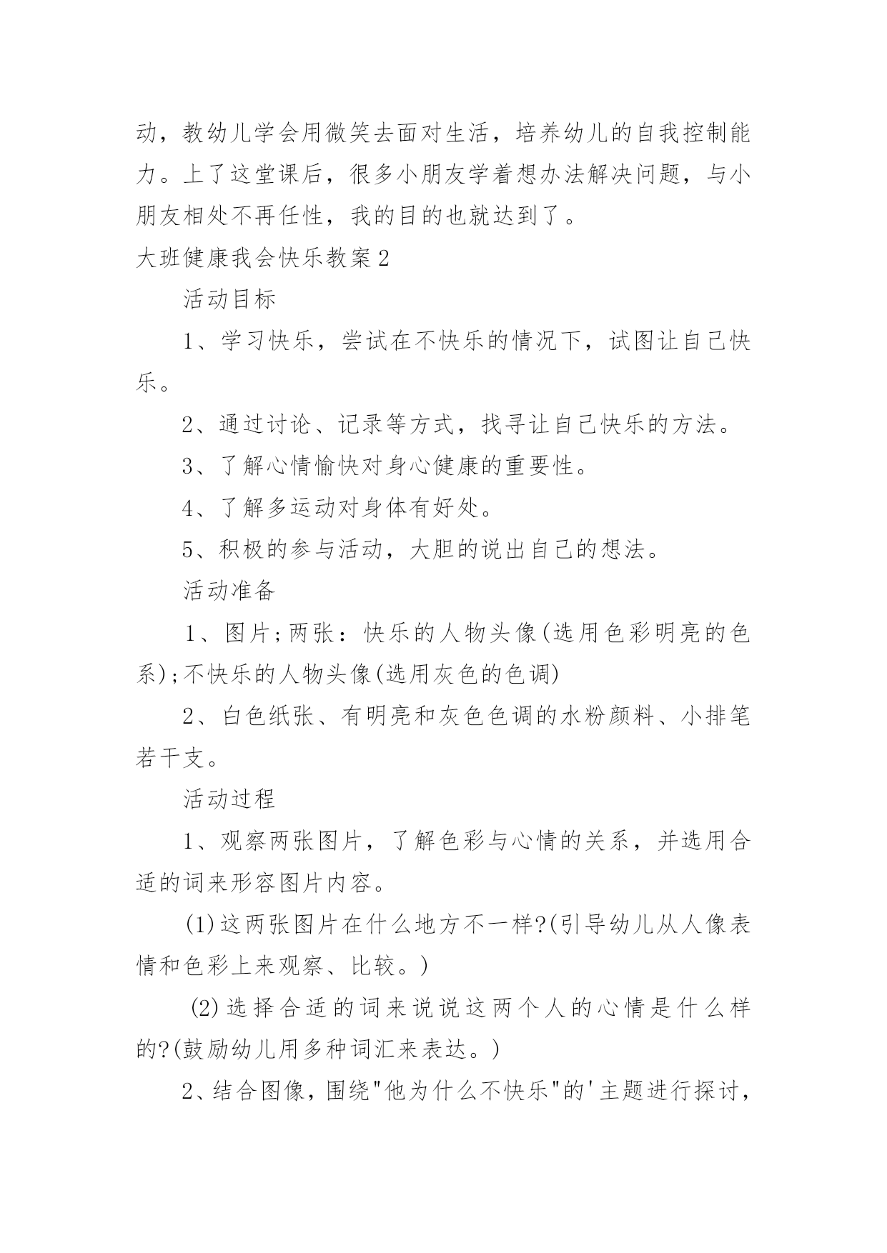 大班健康我会快乐教案大班健康我会快乐教案作为一位杰出的教职工,常常需要准备教案,通过教案准备可以更好地根据具体情况对教学进程做适当的必要的调整。那么大家知道正规的教案是怎么写的吗?以下是小编收集整理的大班健康我会快乐教案,仅供参考,大家一起来看看吧。大班健康我会快乐教案1教育目标:1、欣赏故事内容,知道每个人都有几种常见的情绪和表情,了解不同的情绪对身体影响不同。2、能正确地表达与控制自己的情绪,学着让自己拥有好心情。3、初步学习疏导不愉快的情绪。4、学会保持愉快的心情,培养幼儿热爱生活,快乐生活的良好情感。5、让幼儿知道愉快有益于身体健康。活动准备:1、多媒体、音乐《笑一个吧》2、微笑卡(与幼儿人数相同)活动过程:一、(播放表情图)教幼儿在日常生活中,学会控制自己的情绪和不当行为。1、出示表情图,做"变变脸"的游戏,激发幼儿的学习兴趣师:老师为小朋友们带来几种表情图,小朋友来看一看,上面是什么表情呀?(生气、微笑、伤心)下面我们一起来做一个很有意思的变脸小游戏,你们想玩吗?不过老师有个要求在游戏的过程中小朋友要瞪大眼睛,跟着表情图一起做动作,看哪个小朋友反应得又对又快好吗?师出示表情图幼儿一起做动作。2、欣赏故事(老师边讲边播放多媒体)有一个叫悠悠的'小朋友,总是爱发脾气,于是大家就叫他"发脾气大王"。有一天,幼儿园举行画画比赛,悠悠画上了蓝天、白云、草地,还在草地上添了两只小鸡,心想:自己一定能拿第一名。比赛结果出来了,悠悠没有得到第一名。他很生气,"哇哇"地哭了,擦干眼泪,两手拽紧,气鼓鼓的。放学后,悠悠谁也不理,背着书包回家了。在路上,遇到小狗闹闹和几只小狗在玩耍,它们玩得可开心了。闹闹看见了悠悠,就去叼悠悠的裤子,想和悠悠玩。悠悠还在生气,"去去,谁和你玩",抡起书包,就砸到了闹闹的鼻子,闹闹疼的"嗷嗷"大叫,其它小狗吓着了,到处乱跑,生怕悠悠也对它们发脾气。有一只小花狗撞到了一个西瓜摊,西瓜都被摔碎了。黄狗踩上西瓜皮摔了个脸朝天,灰狗踩上,摔了个嘴啃泥。小象走过来,踩上西瓜皮,"咕咚"撞到了水库的大闸门。发大水了,许多小动物被水冲走了。水退后,大家伙湿得像落汤鸡,闹闹游过来朝着悠悠大声叫,意思是:"都怪你发脾气。悠悠低头红着脸:"我以后再也不乱发脾气了。"3、提问:(1)故事中有谁?(2)故事中的悠悠为什么发脾气?(3)他发脾气,导致了一件什么事?知错吗?二、在你们日常生活中,哪些是不高兴或生气的的事?可以用什么更好的办法解决?(引导幼儿观察图片后进行思考)1、幼儿自由讨论:(别人不和你玩;办法:可以商量一起玩,或轮着玩;发脾气摔玩具;把想法说出来;不会画,可以请会画的教着画。2、师小结:小朋友都知道随便发脾气,生气是不好的行为习惯,会失去很多小朋友,经常发脾气,生气,时间长了会不爱吃饭,不爱运动,不爱和小朋友交往,会影响身体健康,会得病的,生活中有很多事情是可以通过其他方法来解决的。那么保持什么样的心情才有利于身体健康呢?(高兴,快乐)的心情。3、说说有哪些高兴,快乐的事。(让幼儿畅所欲言)(发奖状了;妈妈给我买了玩具车;和小朋友一起过生日;爸爸妈妈陪我玩;照相;六一节表演;)4、帮助了别人,别人开心,自己也开心!师:对,小朋友们不但要自己保持高兴,愉快的心情,还要想办法让别人感到快乐,开心。当你帮助了别人,别人的心情怎么样,别人会怎么说?那你的心情呢?三、结束(播放音乐:笑一个吧)小朋友想出这么多办法老师真为你们高兴。老师送给每个小朋友一枚微笑卡,让我们大家一起随着音乐,一起舞动起来,分享快乐,在今后的生活中笑的更加的灿烂、阳光好吗?(老师,小朋友们共舞)延伸活动:《亲子活动》《互帮互助》游戏玩法:父母和孩子共同玩智力游戏,当父母或孩子在游戏过程中遇到了困难,彼此互相帮助,体验为人做事,帮助了别人是愉快的,也可以和孩子商量做哪些高兴的事情,进一步培养孩子的自我控制能力,为养成活泼开朗的性格奠定基础。教学反思:生气是当人遇到不称心、不如意或对不合理现实的一种情绪反应。一般来说,生气应该是正常的情绪反应,但若幼儿遇事经常生气,而且将生气作为对外界的一种经常性的持久的反应,那就是不正常的行为了。经常生气、发脾气的孩子一般心胸比较狭窄,自我中心相当严重。因此,我设计了"我高兴,我快乐"这一活动,通过多媒体、谈话、游戏等活动,教幼儿学会用微笑去面对生活,培养幼儿的自我控制能力。上了这堂课后,很多小朋友学着想办法解决问题,与小朋友相处不再任性,我的目的也就达到了。大班健康我会快乐教案2活动目标1、学习快乐,尝试在不快乐的情况下,试图让自己快乐。2、通过讨论、记录等方式,找寻让自己快乐的方法。3、了解心情愉快对身心健康的重要性。4、了解多运动对身体有好处。5、积极的参与活动,大胆的说出自己的想法。活动准备1、图片;两张: