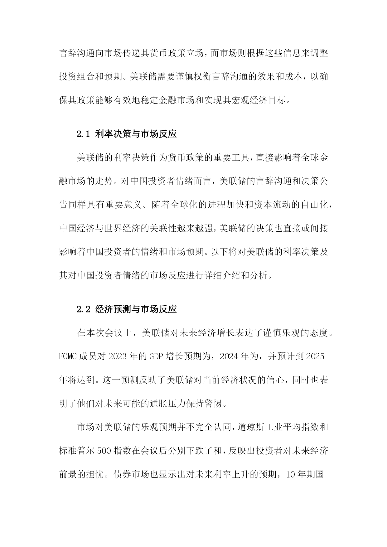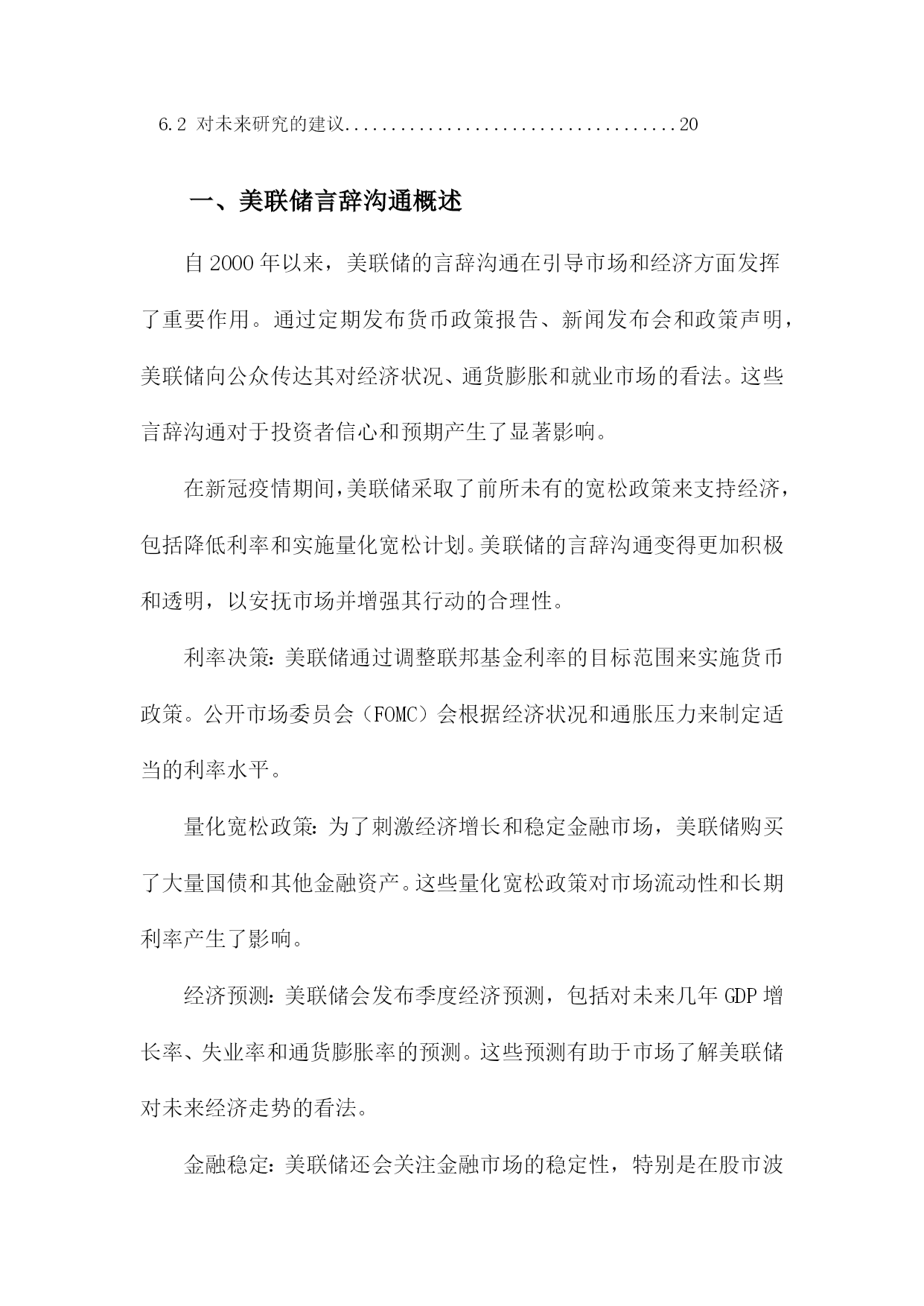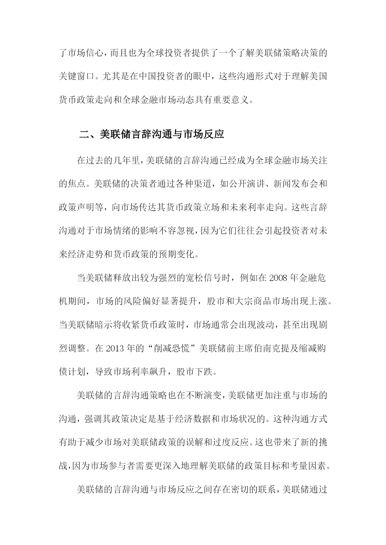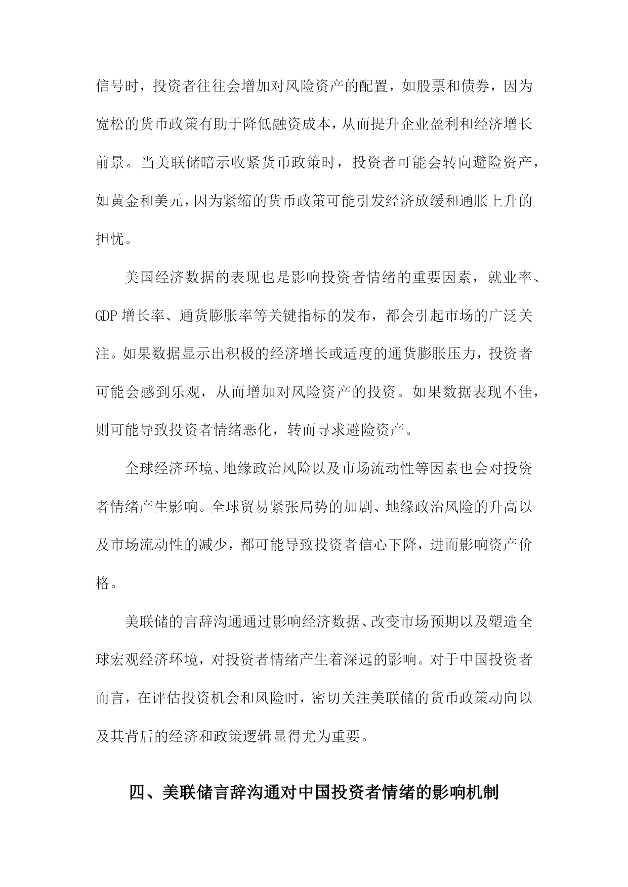 美联储言辞沟通与中国投资者情绪目录一、美联储言辞沟通概述......................................21.1美联储定义与职责.....................................31.2美联储言辞沟通的主要形式.............................4二、美联储言辞沟通与市场反应................................52.1利率决策与市场反应...................................62.2经济预测与市场反应...................................62.3未来政策走向与市场反应...............................7三、中国投资者情绪分析......................................83.1投资者情绪的定义与度量...............................93.2影响投资者情绪的主要因素............................10四、美联储言辞沟通对中国投资者情绪的影响机制...............114.1宏观经济因素........................................124.2政策因素............................................134.3市场因素............................................14五、美联储言辞沟通对中国投资者情绪的实证研究...............155.1文献综述............................................165.2实证模型构建与分析..................................17六、结论与建议.............................................186.1研究结论............................................196.2对未来研究的建议....................................20一、美联储言辞沟通概述自2000年以来,美联储的言辞沟通在引导市场和经济方面发挥了重要作用。通过定期发布货币政策报告、新闻发布会和政策声明,美联储向公众传达其对经济状况、通货膨胀和就业市场的看法。这些言辞沟通对于投资者信心和预期产生了显著影响。在新冠疫情期间,美联储采取了前所未有的宽松政策来支持经济,包括降低利率和实施量化宽松计划。美联储的言辞沟通变得更加积极和透明,以安抚市场并增强其行动的合理性。利率决策:美联储通过调整联邦基金利率的目标范围来实施货币政策。公开市场委员会(FOMC)会根据经济状况和通胀压力来制定适当的利率水平。量化宽松政策:为了刺激经济增长和稳定金融市场,美联储购买了大量国债和其他金融资产。这些量化宽松政策对市场流动性和长期利率产生了影响。经济预测:美联储会发布季度经济预测,包括对未来几年GDP增长率、失业率和通货膨胀率的预测。这些预测有助于市场了解美联储对未来经济走势的看法。金融稳定:美联储还会关注金融市场的稳定性,特别是在股市波动或债务水平过高的情况下。在这种情况下,美联储可能会采取适当措施来维护金融稳定。美联储的言辞沟通对其货币政策实施和金融市场稳定具有重要意义。投资者应密切关注美联储的言论,以便更好地了解其政策动向和市场预期。1.1美联储定义与职责美联储(FederalReserveSystem,简称Fed)是美国的中央银行,负责制定和执行货币政策,维护金融市场的稳定。美联储的主要职责包括:制定和执行货币政策,管理美国的货币供应;维护金融市场的稳定,防范金融风险;监督金融机构的合规性和稳健经营;以及在全球金融危机等重大事件发生时采取紧急措施,维护全球金融稳定。美联储成立于1913年,由12个地区性的联邦储备银行组成。纽约联邦储备银行是最大的一个,也是美联储的总部所在地。美联储的决策机构包括7位联邦储备委员(即FOMC成员),他们负责制定货币政策并对市场进行监管。美联储还设有其他部门,如董事会、审计委员会、法律顾问办公室等,共同协助主席和其他高级官员履行职责。作为美国的中央银行,美联储在制定货币政策时需要充分考虑国内外的经济形势和金融市场状况。为了实现这一目标,美联储与其他国家的中央银行、国际组织以及研究机构保持密切合作与沟通。美联储还会关注全球经济动态,以便及时调整货币政策和应对潜在风险。1.2美联储言辞