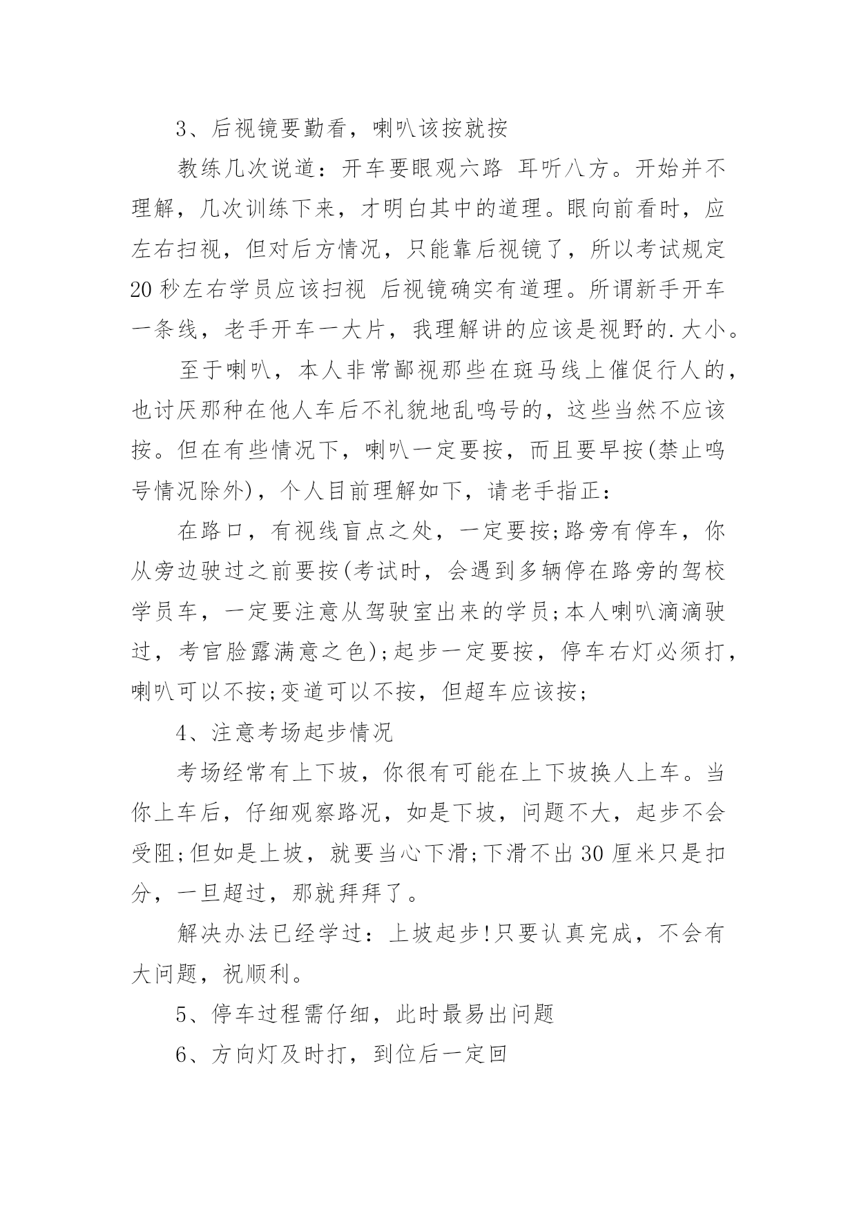 科目三考试秘笈归纳科目三考试秘笈归纳学员们考大路考时的心理很矛盾,因为考大路考意味着马上就可以拿到驾照了,可是大路考的考察点多,也不是容易通过的,以下是网友总结出的6点路考心得,心血之谈,祝您考试顺利。1、安全意识第一,注意控制速度不少人认为速度开的快是技术熟练的表现,可以给考官一个好印象,所以一味加档提速;哪知这正是考官最不放心之处。学员考试,考官要负安全责任,一个新手开高速,哪个考官不是胆战心惊,出了事怎么办?所以档可以加到45档,但速度必须控制在40以下,这个速度考试已经足够了。一旦速度向50迈进,考官就快要叫你下车了!学习驾驶技术,安全永远是第一,十次事故九次快,这是血的教训,必须记住了。2、过路口车掉头,1挡速度最把握在考场,过路口和车掉头都有可能碰上。掉头必须1档,过路口可用1或2档。由于路口情况复杂,随时可能停车,如果2档进入遇事停车,忘记换1档启动将会熄火,这时我们新手会更加手忙脚乱。稳妥的办法是,用1档进入路口,待过大半后,路况允许再提为2档,加速离开。本人考试时过了两个红绿灯,此法甚灵,顺顺当当。3、后视镜要勤看,喇叭该按就按教练几次说道:开车要眼观六路耳听八方。开始并不理解,几次训练下来,才明白其中的道理。眼向前看时,应左右扫视,但对后方情况,只能靠后视镜了,所以考试规定20秒左右学员应该扫视后视镜确实有道理。所谓新手开车一条线,老手开车一大片,我理解讲的应该是视野的.大小。至于喇叭,本人非常鄙视那些在斑马线上催促行人的,也讨厌那种在他人车后不礼貌地乱鸣号的,这些当然不应该按。但在有些情况下,喇叭一定要按,而且要早按(禁止鸣号情况除外),个人目前理解如下,请老手指正:在路口,有视线盲点之处,一定要按;路旁有停车,你从旁边驶过之前要按(考试时,会遇到多辆停在路旁的驾校学员车,一定要注意从驾驶室出来的学员;本人喇叭滴滴驶过,考官脸露满意之色);起步一定要按,停车右灯必须打,喇叭可以不按;变道可以不按,但超车应该按;4、注意考场起步情况考场经常有上下坡,你很有可能在上下坡换人上车。当你上车后,仔细观察路况,如是下坡,问题不大,起步不会受阻;但如是上坡,就要当心下滑;下滑不出30厘米只是扣分,一旦超过,那就拜拜了。解决办法已经学过:上坡起步!只要认真完成,不会有大问题,祝顺利。5、停车过程需仔细,此时最易出问题6、方向灯及时打,到位后一定回左右指示灯,我们行车时的交流手势,表达一定要清清楚楚。行车起步必须启动左灯,如果忘记,当然枪毙;但是上道后,你记得回灯吗?灯还在抵达抵达的响,很辛苦,你听到了吗。停车和向右并道,右灯及时打,这点很关键。结束语:只要您按照平时练习那样去考试,报以平常心的心态,就一定能顺利通过考试。以上6点心得希望大家能够认真的去看看,最后准您考试顺利。