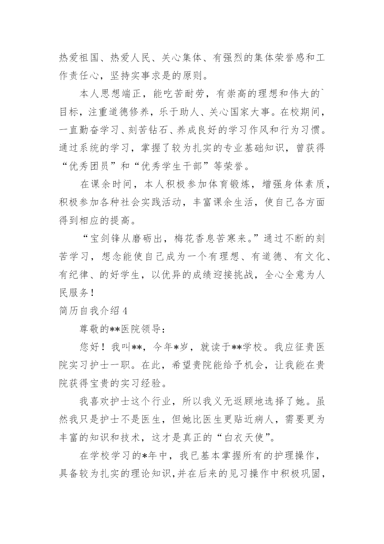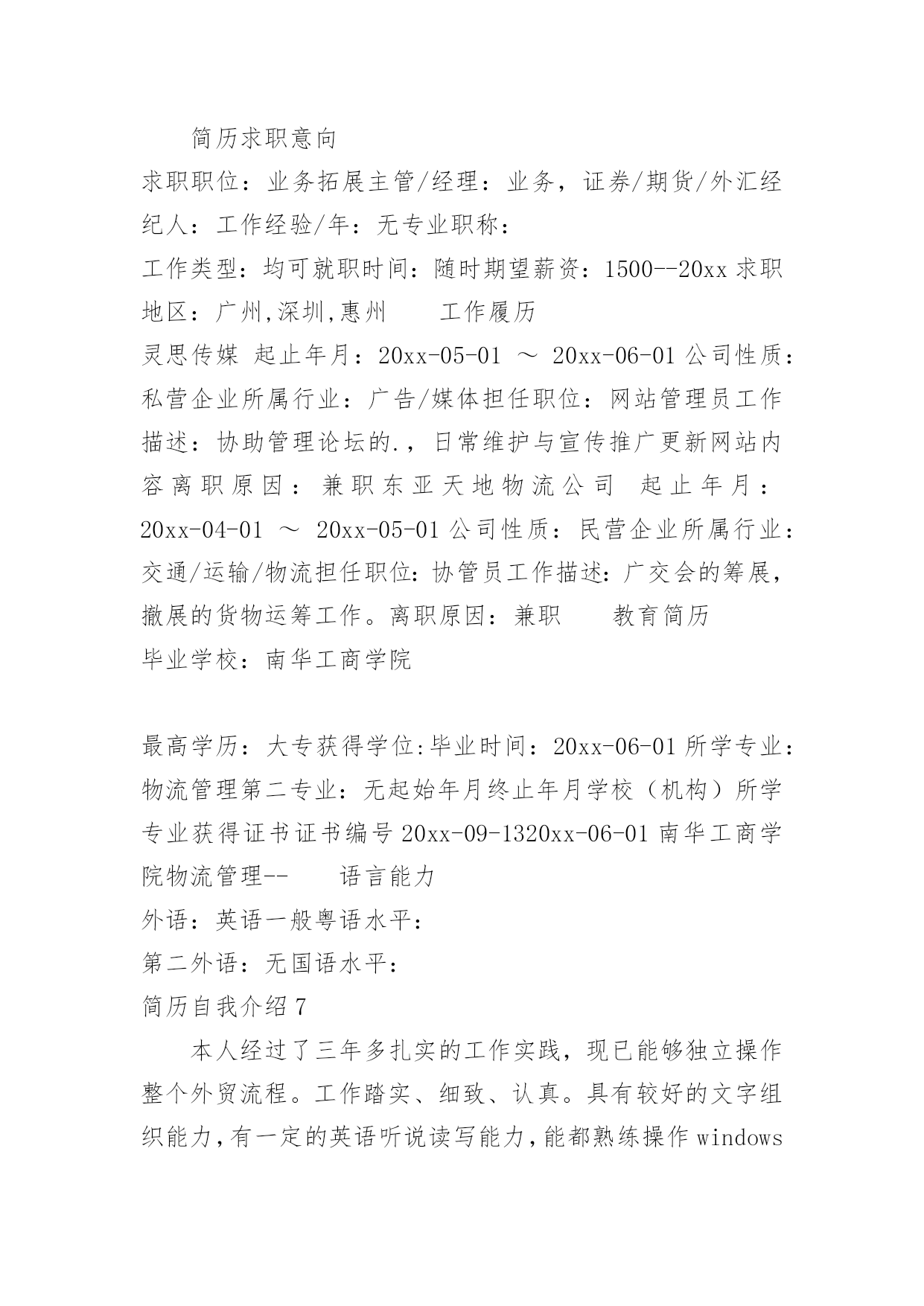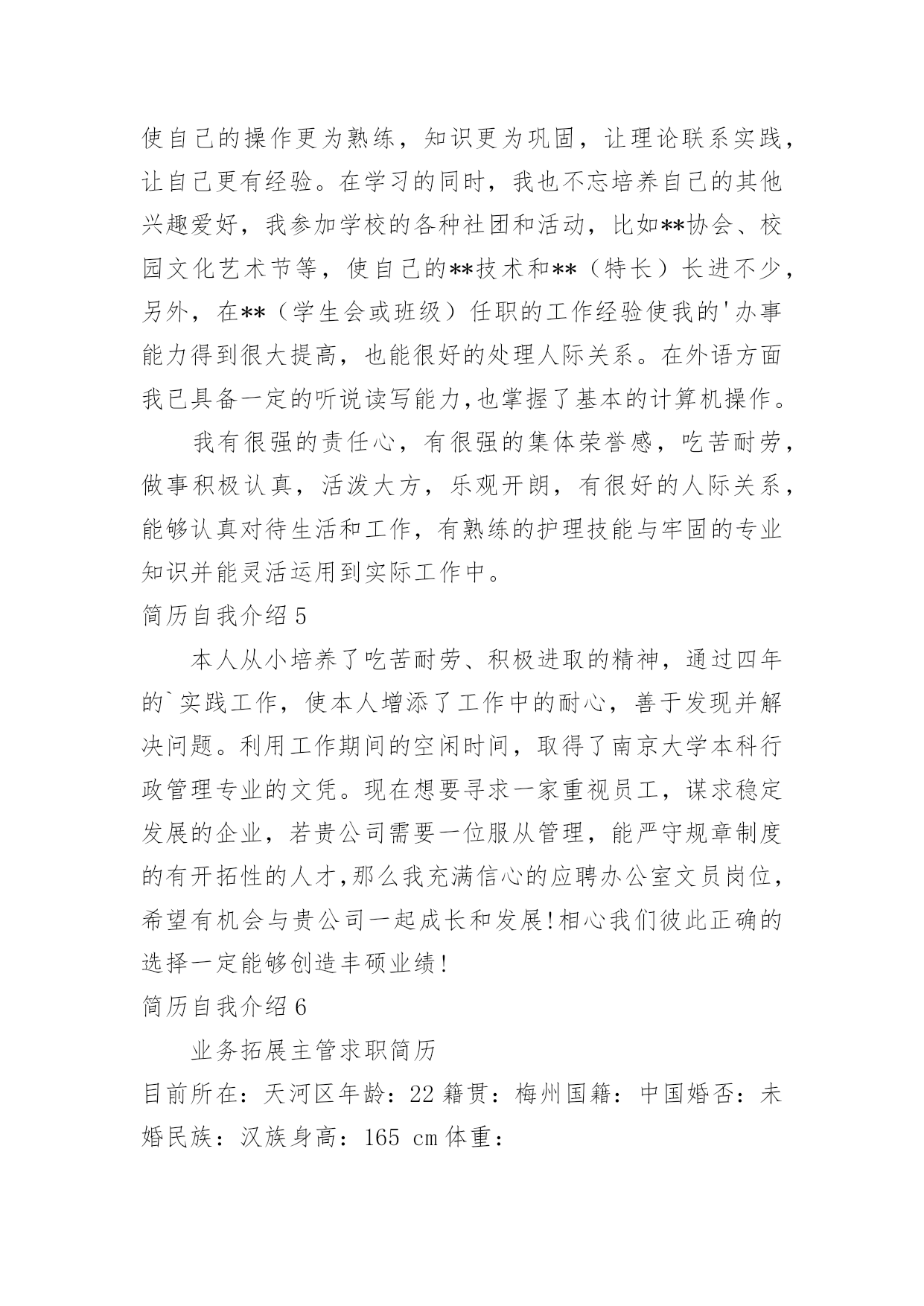 简历自我介绍简历自我介绍(汇编15篇)日子如同白驹过隙,不经意间,新一轮的招聘又朝我们走来,这时候可别把简历给忘了哦。你知道简历要如何写吗?下面是小编整理的简历自我介绍,欢迎大家借鉴与参考,希望对大家有所帮助。简历自我介绍1我性格热情开朗,待人友好,为人诚实谦虚。工作勤奋,认真负责,能吃苦耐劳,尽职尽责,有耐心。具有亲和力,平易近人,善于与人沟通,也许今天的'我没什么值得推荐的荣誉,但是我有一颗简单的心,做好了面对困难的准备,期望您的机会和慧眼,相信我下次在做自我介绍时,会给您一个惊喜。简历自我介绍2本人政治思想素质好,乐于助人,尊老爱幼关心集体,以集体利益为重,有较强的工作能力个性活泼、开朗,为人诚实可靠,对工作充满热情,责任心强,能理论联系实际,熟练进行各种临床技能操作;能自己独立值班,完成各项医疗文件书写。简历自我介绍3本人自大学四年以来,一直遵守学校的各项规章制度,热爱祖国、热爱人民、关心集体、有强烈的集体荣誉感和工作责任心,坚持实事求是的原则。本人思想端正,能吃苦耐劳,有崇高的理想和伟大的`目标,注重道德修养,乐于助人、关心国家大事。在校期间,一直勤奋学习、刻苦钻石、养成良好的学习作风和行为习惯。通过系统的学习,掌握了较为扎实的专业基础知识,曾获得“优秀团员”和“优秀学生干部”等荣誉。在课余时间,本人积极参加体育锻炼,增强身体素质,积极参加各种社会实践活动,丰富课余生活,使自己各方面得到相应的提高。“宝剑锋从磨砺出,梅花香息苦寒来。”通过不断的刻苦学习,想念能使自己成为一个有理想、有道德、有文化、有纪律、的好学生,以优异的成绩迎接挑战,全心全意为人民服务!简历自我介绍4尊敬的**医院领导:您好!我叫**,今年*岁,就读于**学校。我应征贵医院实习护士一职。在此,希望贵院能给予机会,让我能在贵院获得宝贵的实习经验。我喜欢护士这个行业,所以我义无返顾地选择了她。虽然我只是护士不是医生,但她比医生更贴近病人,需要更为丰富的知识和技术,这才是真正的“白衣天使”。在学校学习的*年中,我已基本掌握所有的护理操作,具备较为扎实的理论知识,并在后来的见习操作中积极巩固,使自己的操作更为熟练,知识更为巩固,让理论联系实践,让自己更有经验。在学习的同时,我也不忘培养自己的其他兴趣爱好,我参加学校的各种社团和活动,比如**协会、校园文化艺术节等,使自己的**技术和**(特长)长进不少,另外,在**(学生会或班级)任职的工作经验使我的'办事能力得到很大提高,也能很好的处理人际关系。在外语方面我已具备一定的听说读写能力,也掌握了基本的计算机操作。我有很强的责任心,有很强的集体荣誉感,吃苦耐劳,做事积极认真,活泼大方,乐观开朗,有很好的人际关系,能够认真对待生活和工作,有熟练的护理技能与牢固的专业知识并能灵活运用到实际工作中。简历自我介绍5本人从小培养了吃苦耐劳、积极进取的精神,通过四年的`实践工作,使本人增添了工作中的耐心,善于发现并解决问题。利用工作期间的空闲时间,取得了南京大学本科行政管理专业的文凭。现在想要寻求一家重视员工,谋求稳定发展的企业,若贵公司需要一位服从管理,能严守规章制度的有开拓性的人才,那么我充满信心的应聘办公室文员岗位,希望有机会与贵公司一起成长和发展!相心我们彼此正确的选择一定能够创造丰硕业绩!简历自我介绍6业务拓展主管求职简历目前所在:天河区年龄:22籍贯:梅州国籍:中国婚否:未婚民族:汉族身高:165cm体重:简历求职意向求职职位:业务拓展主管/经理:业务,证券/期货/外汇经纪人:工作经验/年:无专业职称:工作类型:均可就职时间:随时期望薪资:1500--20xx求职地区:广州,深圳,惠州工作履历灵思传媒起止年月:20xx-05-01~20xx-06-01公司性质:私营企业所属行业:广告/媒体担任职位:网站管理员工作描述:协助管理论坛的.,日常维护与宣传推广更新网站内容离职原因:兼职东亚天地物流公司起止年月:20xx-04-01~20xx-05-01公司性质:民营企业所属行业:交通/运输/物流担任职位:协管员工作描述:广交会的筹展,撤展的货物运筹工作。离职原因:兼职教育简历毕业学校:南华工商学院最高学历:大专获得学位:毕业时间:20xx-06-01所学专业:物流管理第二专业:无起始年月终止年月学校(机构)所学专业获得证书证书编号20xx-09-1320xx-06-01南华工商学院物流管理--语言能力外语:英语一般粤语水平:第二外语:无国语水平:简历自我介绍7本人经过了三年多扎实的工作实践,现已能够独立操作整个外贸流程。工作踏实、细致、认真。具有较好的文字组织能力,有一定的英语听说读写能力,能都熟练操作windows平台上的个类应用软件(如photoshop、word20xx、excel20xx),动手能力较强。