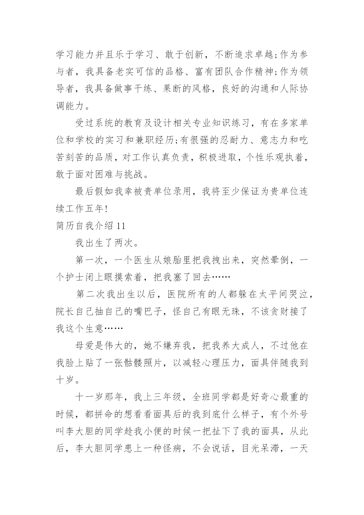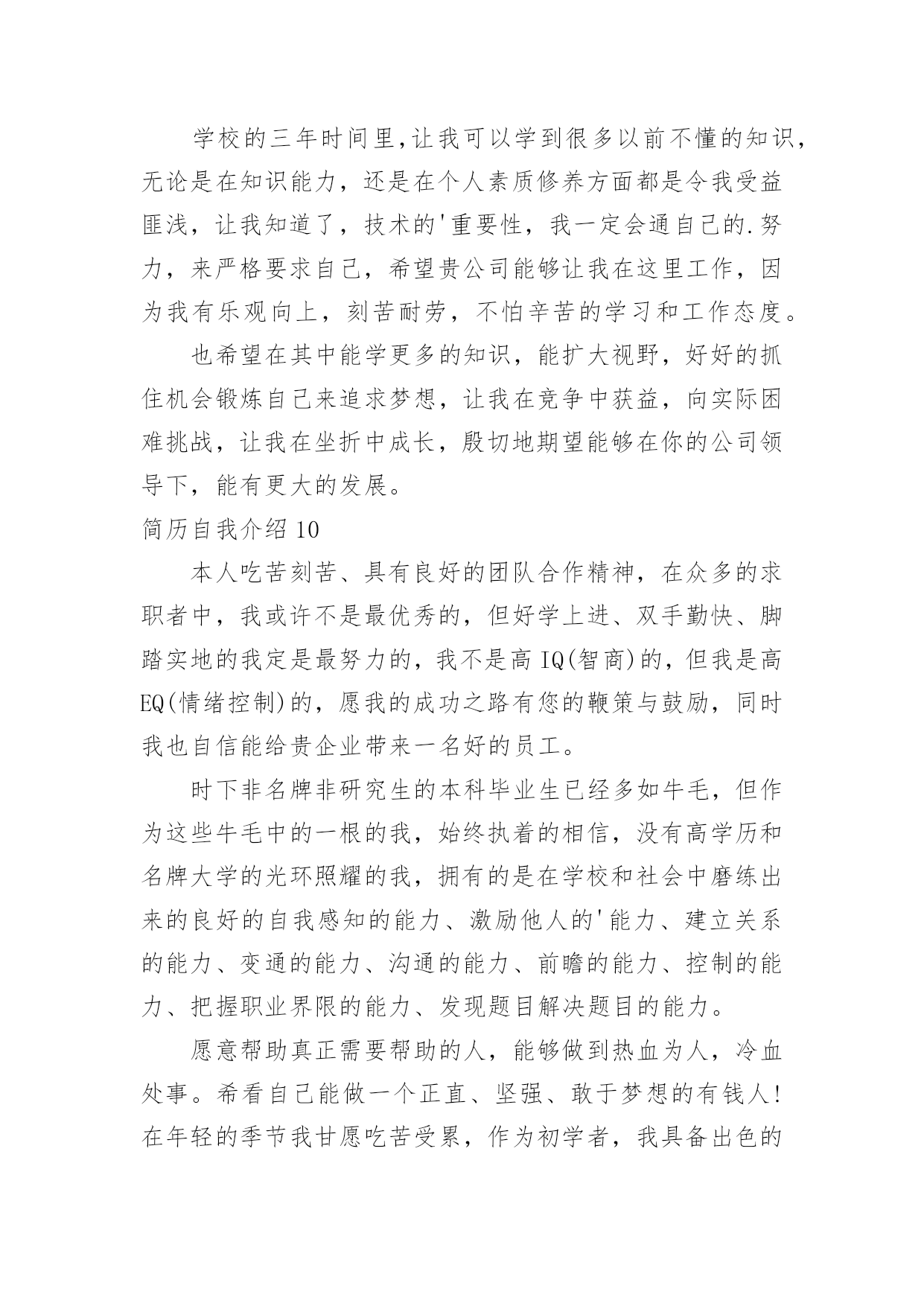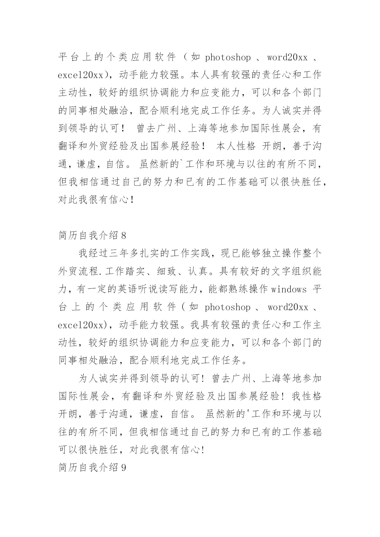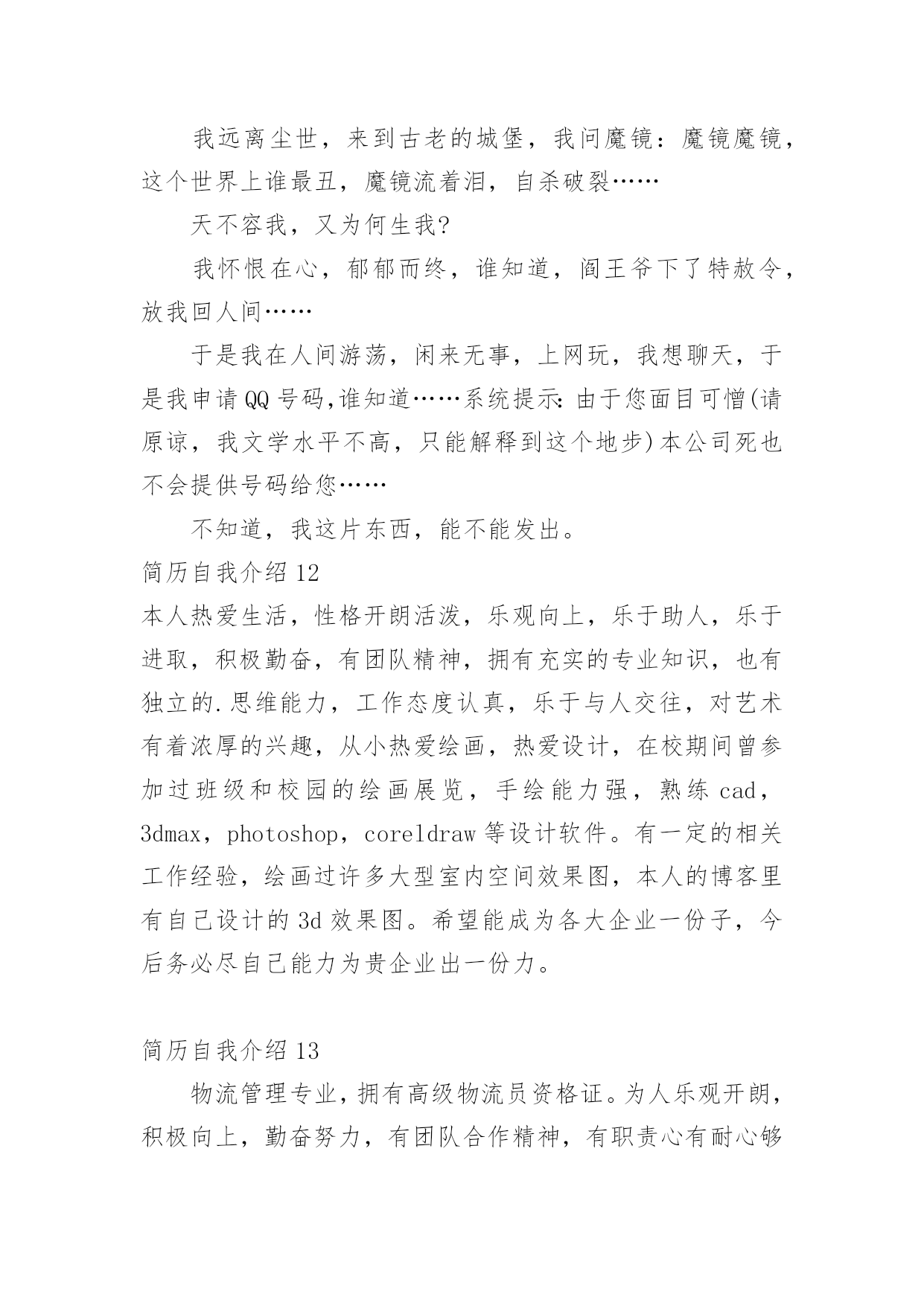 简历自我介绍简历自我介绍(汇编15篇)日子如同白驹过隙,不经意间,新一轮的招聘又朝我们走来,这时候可别把简历给忘了哦。你知道简历要如何写吗?下面是小编整理的简历自我介绍,欢迎大家借鉴与参考,希望对大家有所帮助。简历自我介绍1我性格热情开朗,待人友好,为人诚实谦虚。工作勤奋,认真负责,能吃苦耐劳,尽职尽责,有耐心。具有亲和力,平易近人,善于与人沟通,也许今天的'我没什么值得推荐的荣誉,但是我有一颗简单的心,做好了面对困难的准备,期望您的机会和慧眼,相信我下次在做自我介绍时,会给您一个惊喜。简历自我介绍2本人政治思想素质好,乐于助人,尊老爱幼关心集体,以集体利益为重,有较强的工作能力个性活泼、开朗,为人诚实可靠,对工作充满热情,责任心强,能理论联系实际,熟练进行各种临床技能操作;能自己独立值班,完成各项医疗文件书写。简历自我介绍3本人自大学四年以来,一直遵守学校的各项规章制度,热爱祖国、热爱人民、关心集体、有强烈的集体荣誉感和工作责任心,坚持实事求是的原则。本人思想端正,能吃苦耐劳,有崇高的理想和伟大的`目标,注重道德修养,乐于助人、关心国家大事。在校期间,一直勤奋学习、刻苦钻石、养成良好的学习作风和行为习惯。通过系统的学习,掌握了较为扎实的专业基础知识,曾获得“优秀团员”和“优秀学生干部”等荣誉。在课余时间,本人积极参加体育锻炼,增强身体素质,积极参加各种社会实践活动,丰富课余生活,使自己各方面得到相应的提高。“宝剑锋从磨砺出,梅花香息苦寒来。”通过不断的刻苦学习,想念能使自己成为一个有理想、有道德、有文化、有纪律、的好学生,以优异的成绩迎接挑战,全心全意为人民服务!简历自我介绍4尊敬的**医院领导:您好!我叫**,今年*岁,就读于**学校。我应征贵医院实习护士一职。在此,希望贵院能给予机会,让我能在贵院获得宝贵的实习经验。我喜欢护士这个行业,所以我义无返顾地选择了她。虽然我只是护士不是医生,但她比医生更贴近病人,需要更为丰富的知识和技术,这才是真正的“白衣天使”。在学校学习的*年中,我已基本掌握所有的护理操作,具备较为扎实的理论知识,并在后来的见习操作中积极巩固,使自己的操作更为熟练,知识更为巩固,让理论联系实践,让自己更有经验。在学习的同时,我也不忘培养自己的其他兴趣爱好,我参加学校的各种社团和活动,比如**协会、校园文化艺术节等,使自己的**技术和**(特长)长进不少,另外,在**(学生会或班级)任职的工作经验使我的'办事能力得到很大提高,也能很好的处理人际关系。在外语方面我已具备一定的听说读写能力,也掌握了基本的计算机操作。我有很强的责任心,有很强的集体荣誉感,吃苦耐劳,做事积极认真,活泼大方,乐观开朗,有很好的人际关系,能够认真对待生活和工作,有熟练的护理技能与牢固的专业知识并能灵活运用到实际工作中。简历自我介绍5本人从小培养了吃苦耐劳、积极进取的精神,通过四年的`实践工作,使本人增添了工作中的耐心,善于发现并解决问题。利用工作期间的空闲时间,取得了南京大学本科行政管理专业的文凭。现在想要寻求一家重视员工,谋求稳定发展的企业,若贵公司需要一位服从管理,能严守规章制度的有开拓性的人才,那么我充满信心的应聘办公室文员岗位,希望有机会与贵公司一起成长和发展!相心我们彼此正确的选择一定能够创造丰硕业绩!简历自我介绍6业务拓展主管求职简历目前所在:天河区年龄:22籍贯:梅州国籍:中国婚否:未婚民族:汉族身高:165cm体重:简历求职意向求职职位:业务拓展主管/经理:业务,证券/期货/外汇经纪人:工作经验/年:无专业职称:工作类型:均可就职时间:随时期望薪资:1500--20xx求职地区:广州,深圳,惠州工作履历灵思传媒起止年月:20xx-05-01~20xx-06-01公司性质:私营企业所属行业:广告/媒体担任职位:网站管理员工作描述:协助管理论坛的.,日常维护与宣传推广更新网站内容离职原因:兼职东亚天地物流公司起止年月:20xx-04-01~20xx-05-01公司性质:民营企业所属行业:交通/运输/物流担任职位:协管员工作描述:广交会的筹展,撤展的货物运筹工作。离职原因:兼职教育简历毕业学校:南华工商学院最高学历:大专获得学位:毕业时间:20xx-06-01所学专业:物流管理第二专业:无起始年月终止年月学校(机构)所学专业获得证书证书编号20xx-09-1320xx-06-01南华工商学院物流管理--语言能力外语:英语一般粤语水平:第二外语:无国语水平:简历自我介绍7本人经过了三年多扎实的工作实践,现已能够独立操作整个外贸流程。工作踏实、细致、认真。具有较好的文字组织能力,有一定的英语听说读写能力,能都熟练操作windows平台上的个类应用软件(如photoshop、word20xx、excel20xx),动手能力较强。