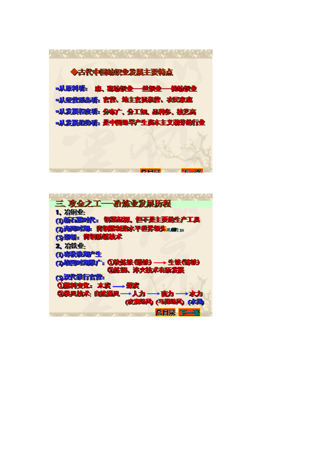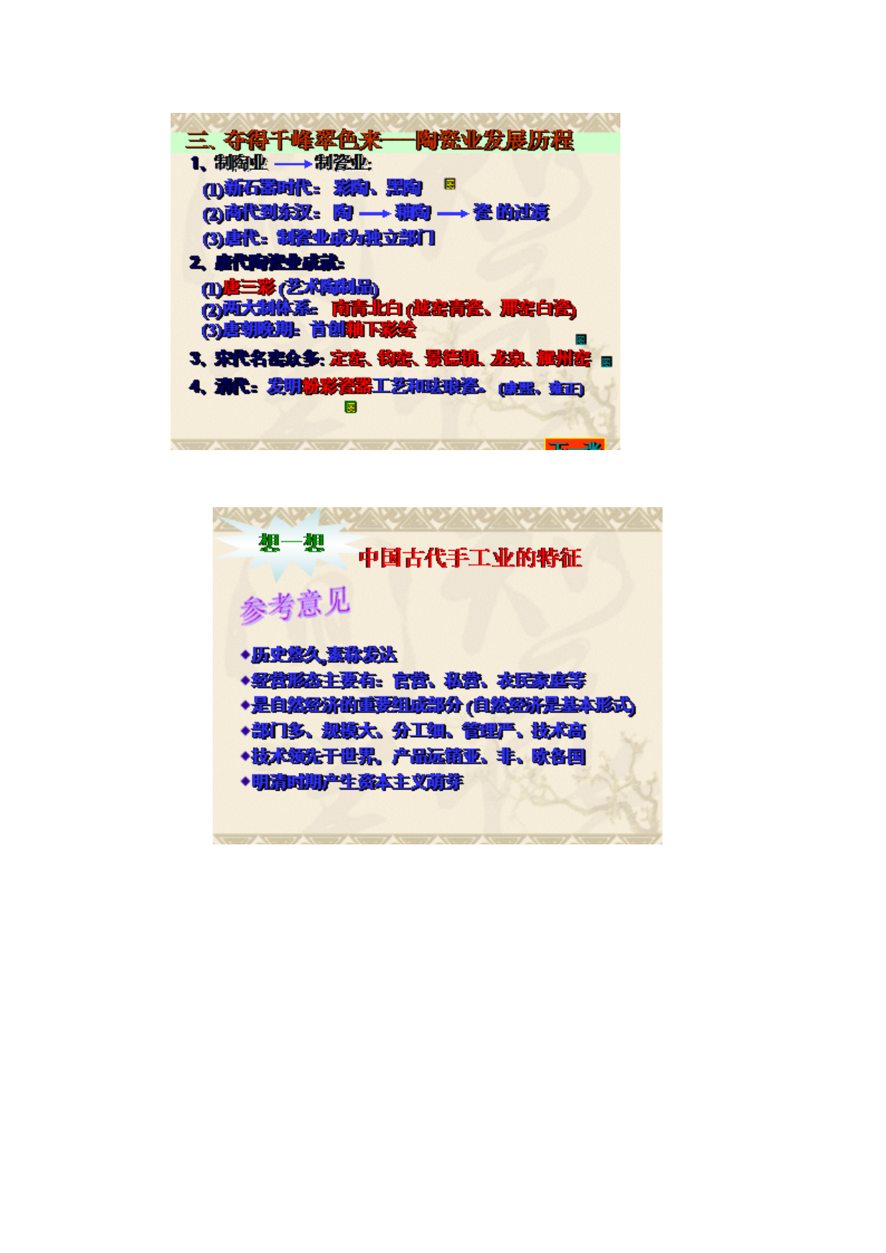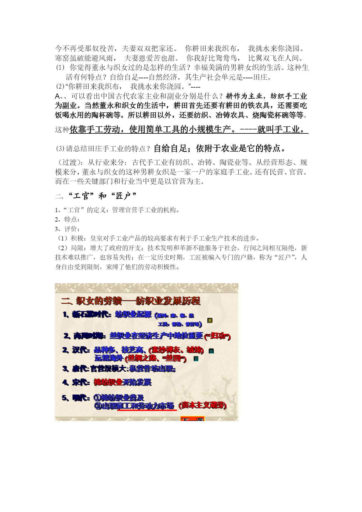 古代中国的手工业经济教学目标:1.知识与能力目标:了解古代纺织业、冶金业和陶瓷业发展的概况;了解瓷都景德镇;理解古代中国手工业发展的特征。通过了解中国古代手工业发展概况和理解其发展特征,学会掌握概括历史事物发展过程的方法。学会运用各种资料,包括文字资料、地图、历史图片和文物实物照片来分析和认识历史现象和事物。2.过程与方法目标:(1)、在创设合理的情境的前提下,让学生进行小组合作探究,掌握中国古代纺织业、冶金业、陶瓷业发展演变的历程。3.情感态度与价值观目标:通过学习认识手工业经济是中国古代经济的重要组成部分。通过学习手工业领先于世界的史实,激发民族自尊心和自豪感。教学重点难点:教学重点:掌握中国古代手工业发展的基本史实。学会文物鉴定的基本方法。教学难点:理解中国古代手工业发展的基本特征。学习本专题时,应注意联系当时中国的政治状况,注意它们之间的相互作用;同时注意比较当时世界的经济发展状况。注意运用辩证的观点来分析历史问题,既要看到古代中国经济的辉煌成就,又要看到其中蕴含的消极因素,汲取历史的教训。四、教学设计导入:中国的英文是“China”,就是指的瓷器之国,中国自古以来闻名于世的除了瓷器还有我们的丝绸,我们也被称为丝绸之国,而陶瓷和丝织是属于我国的农业经济吗?它们不是农业经济,但它们的发展与农业经济的发展有一定的关系,今天就让我们一起来了解中国古代经济结构中的另一个重要组成部分——手工业经济。讲授新课:\(创设情境)材料:出示《天仙配》树上的鸟儿成双对,绿水青山带笑颜。随手摘下花一朵,我与娘子带发间。从今不再受那奴役苦,夫妻双双把家还。你耕田来我织布,我挑水来你浇园。寒窑虽破能避风雨,夫妻恩爱苦也甜。你我好比鸳鸯鸟,比翼双飞在人间。你觉得董永与织女过的是怎样的生活?幸福美满的男耕女织的生活。这种生活有何特点?自给自足----自然经济。其生产社会单元是----田庄。“你耕田来我织布,我挑水来你浇园。”----A、、可以看出中国古代农家主业和副业分别是什么?耕作为主业,纺织手工业为副业。当然董永和织女的生活中,耕田首先还要有耕田的铁农具,还需要吃饭喝水用的陶杯碗等。所以耕田以外,还要纺织、冶铸农具、烧陶瓷杯碗等等。这种依靠手工劳动,使用简单工具的小规模生产。----就叫手工业。请总结田庄手工业的特点?自给自足;依附于农业是它的特点。(过渡):从行业来分:古代手工业有纺织、冶铸、陶瓷业等。从经营形态、规模来分,董永与织女的这种男耕女织是一家一户的家庭手工业。还有民营、官营。而在一些关键部门和行业当中更是以官营为主。“工官”和“匠户”1、“工官”的定义:管理官营手工业的机构。2、特点:3、评价:(1)积极:皇室对手工业产品的较高要求有利于手工业生产技术的进步。(2)局限:增大了政府的开支;技术发明和革新不能服务于社会,行间之间相互隔绝,新技术难以推广,也容易失传;在一定历史时期,工匠被编入专门的户籍,称为“匠户”,人身自由受到限制,束缚了他们的劳动积极性。